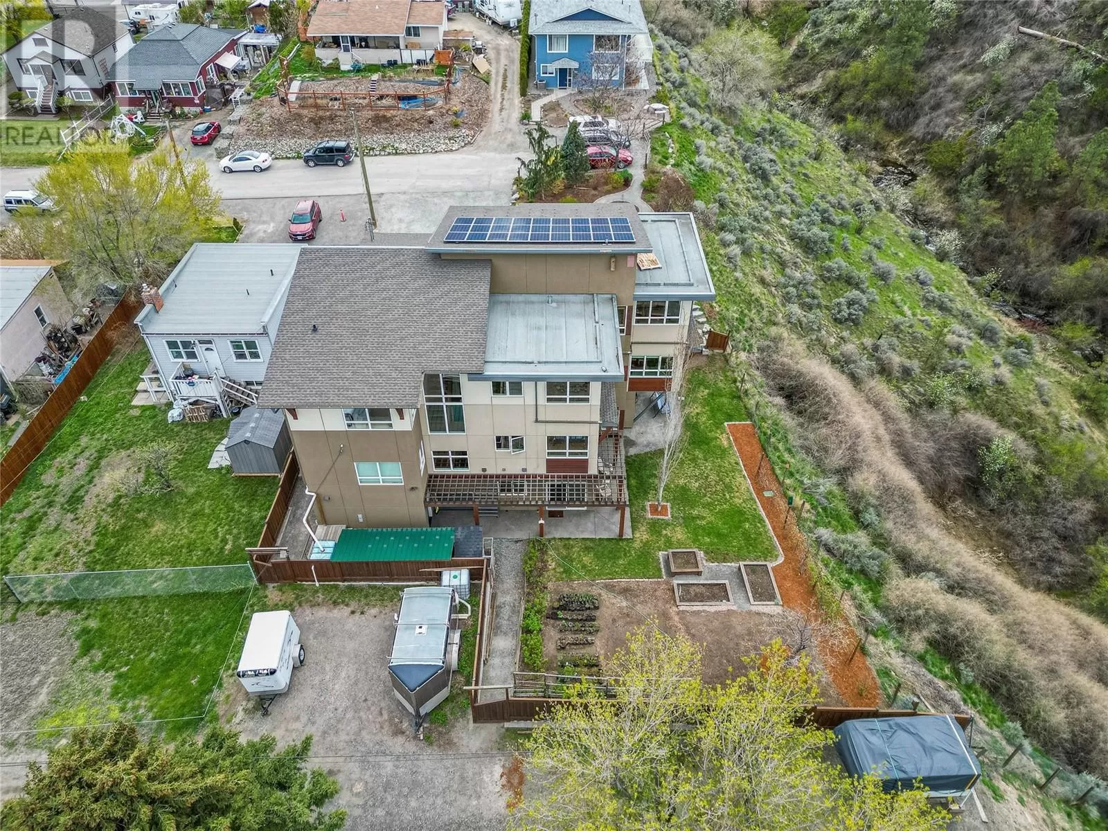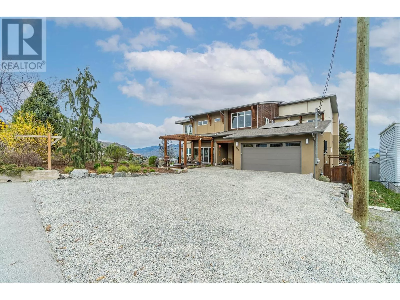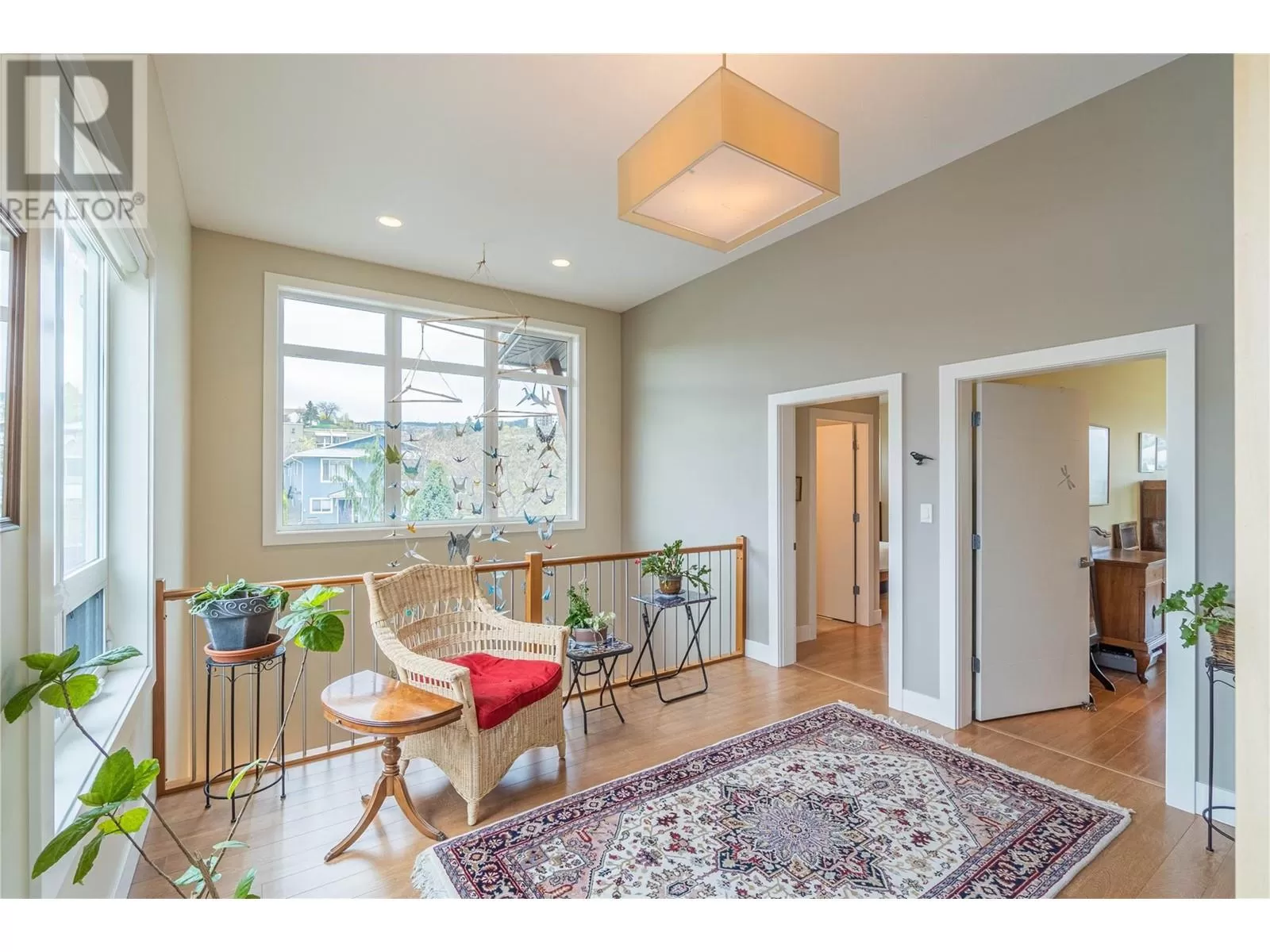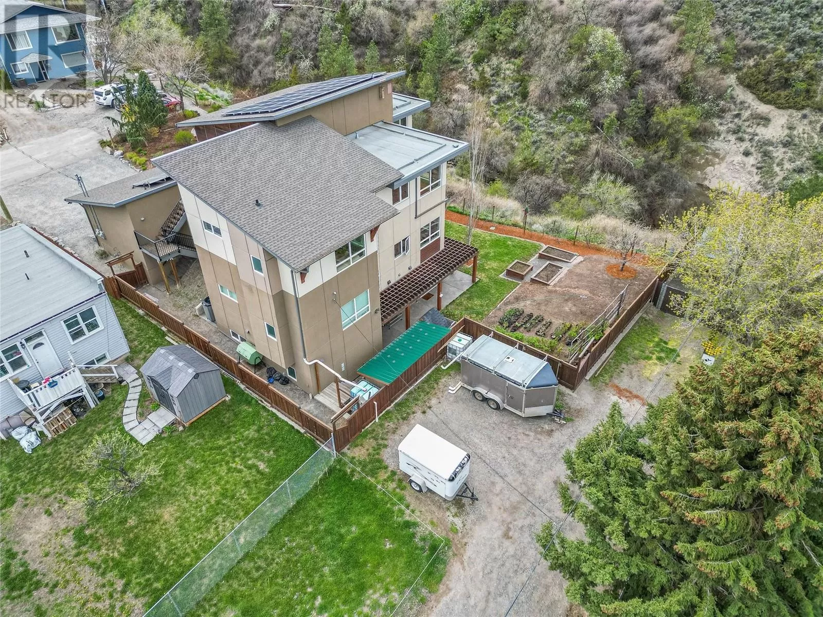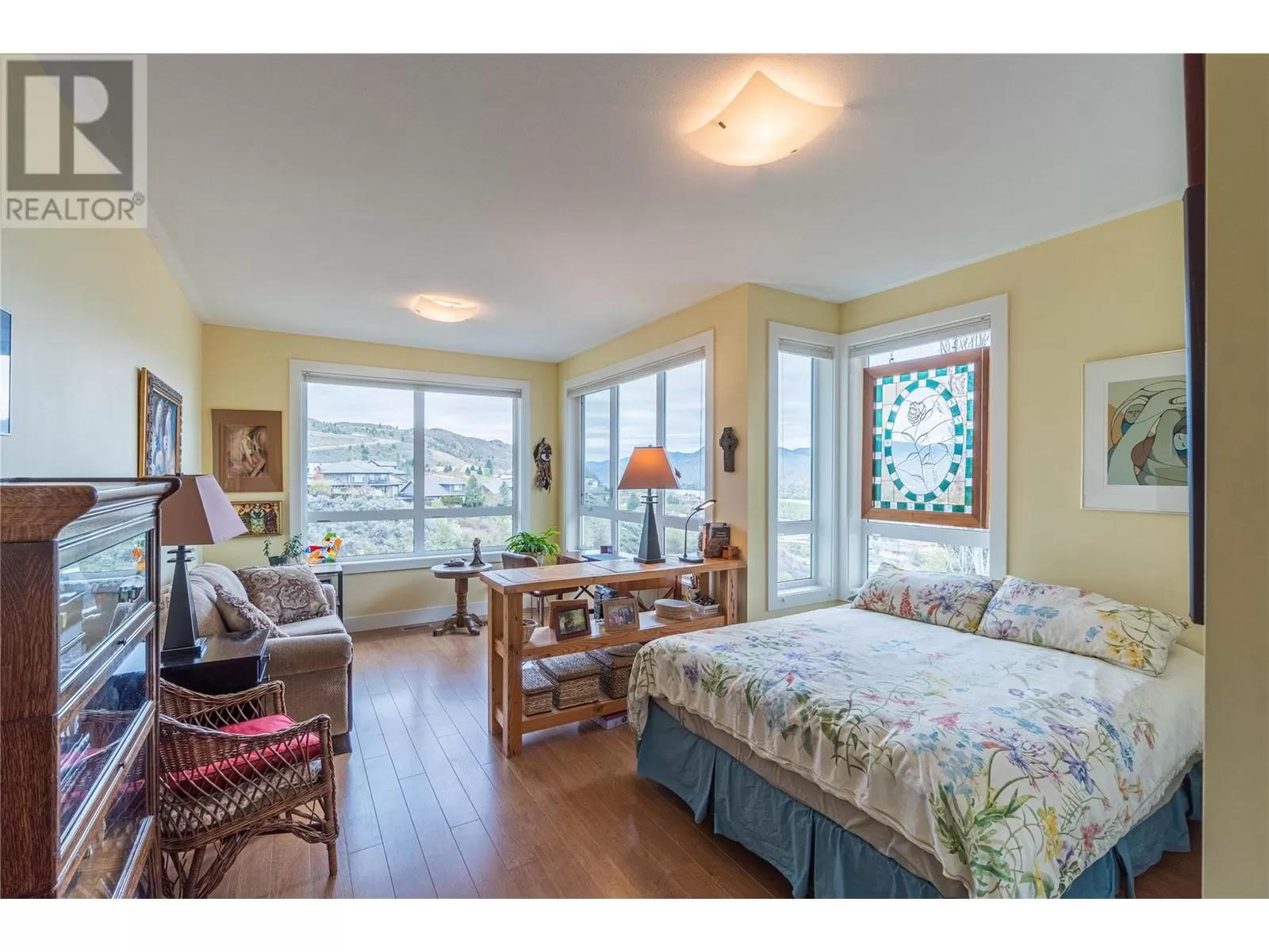 ONE OF A KIND! This is the perfect home for the large family or group living Main floor boasts a breathtaking open plan with huge windows to capture the stunning views. The large island kitchen boasts 2 dishwashers & stainless appliances plus a large walk in pantry for great storage. Wall of cabinets with clever microwave cabinet built in. The spacious living and dining room are great for the largest gatherings with panoramic views from every window. 2 large bedrooms with 4pc ensuites on the main plus 2pc guest bath and office area with outer door. Central shaft for future elevator provides great storage on each level till elevator is desired. Upper floor features 4 more deluxe bedrooms each with a 4pc ensuite and large closet. Upper laundry room, plus a dramatic library that overlooks the vaulted ceiling with feature origami crane mobile. Outer door to relaxation deck and external staircase. Basement level enjoys access to the fenced yard & gardens with UG sprinklers for easy care. 2 more bedrooms down with shared 4pc bath, large rec room and laundry room. This area designed for future suite if desired. Utility room has components for the solar heat recovery system, Central Air, HRV system and extra storage plus featured climate controlled cold room pantry. Property comes with 9 open parking spaces plus double garage. (id:27476)