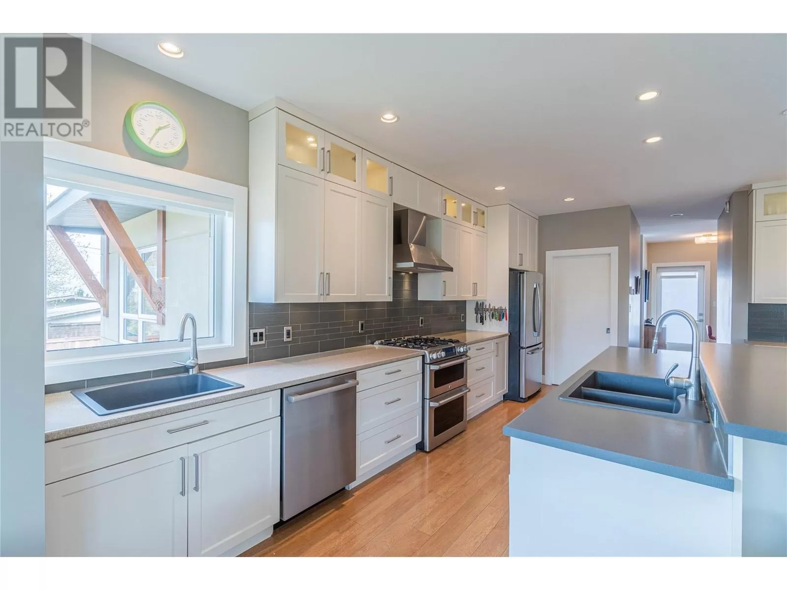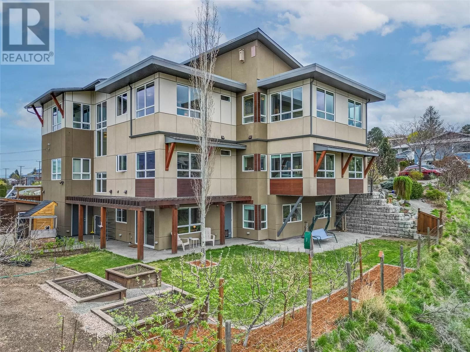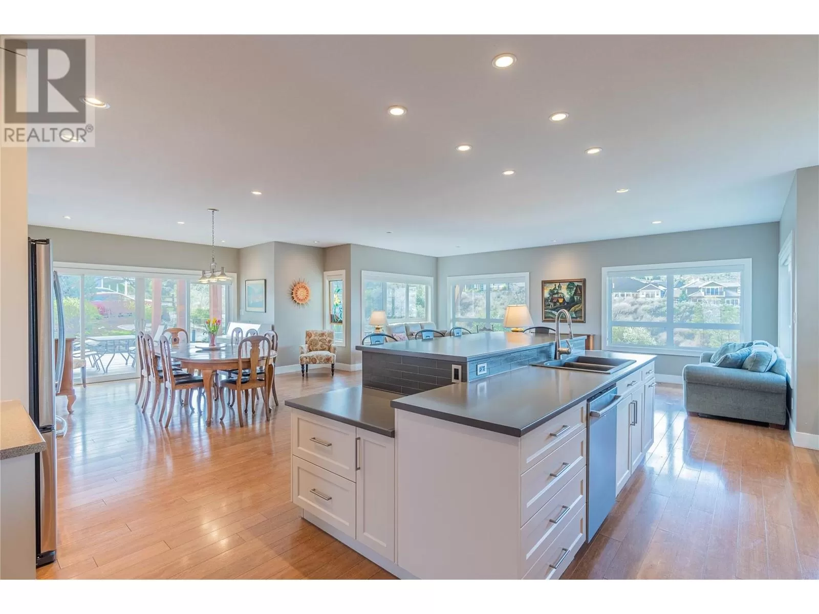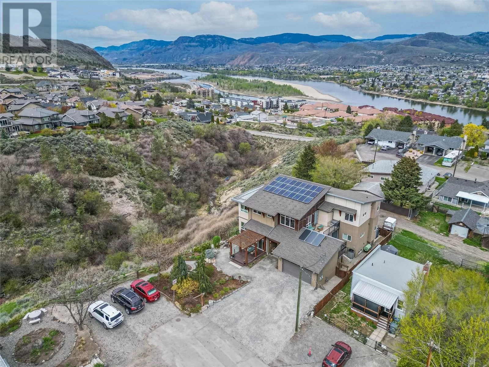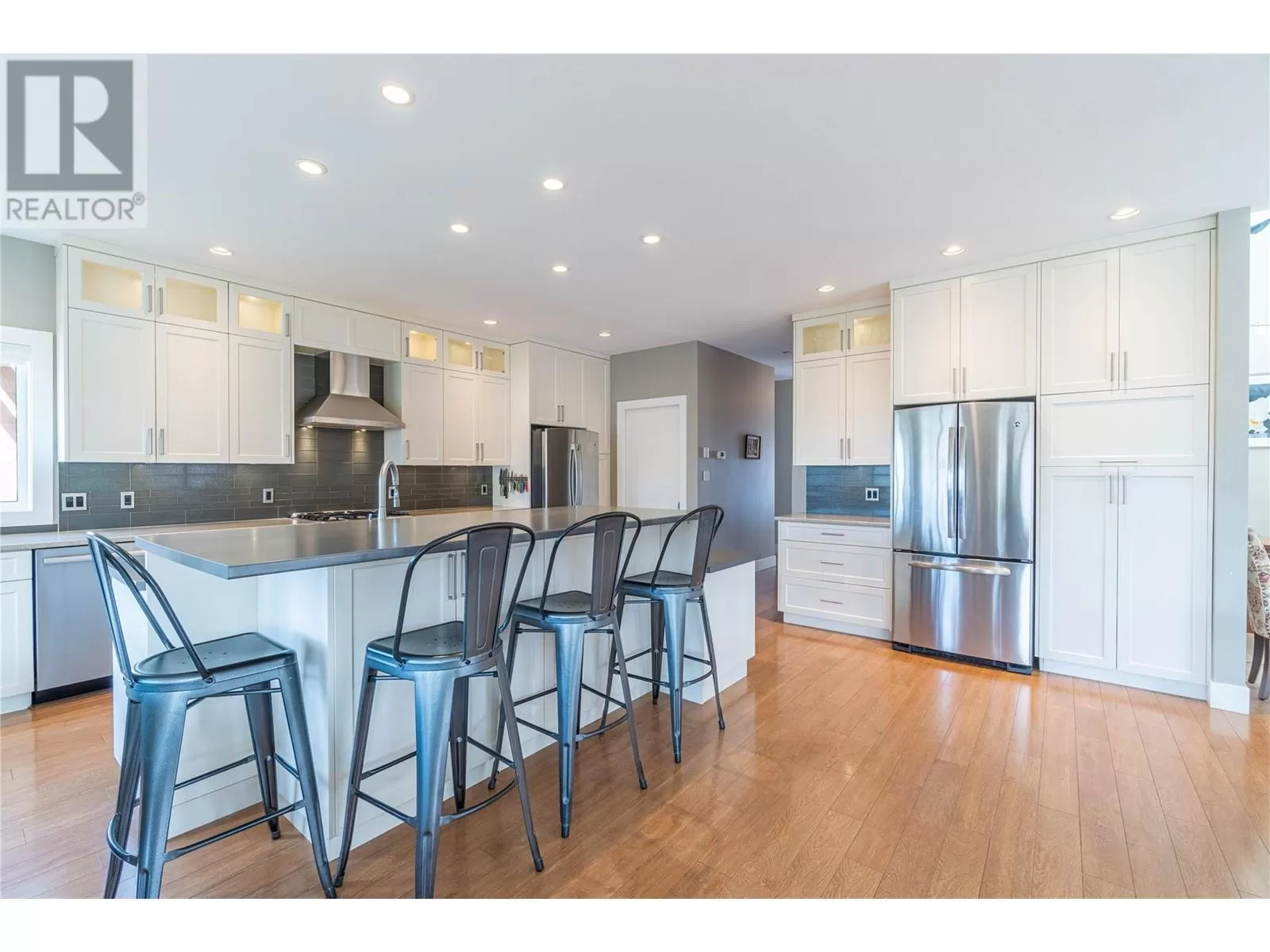 ONE OF A KIND! This is the perfect home for the large family or group living Main floor boasts a breathtaking open plan with huge windows to capture the stunning views. The large island kitchen boasts 2 dishwashers & stainless appliances plus a large walk in pantry for great storage. Wall of cabinets with clever microwave cabinet built in. The spacious living and dining room are great for the largest gatherings with panoramic views from every window. 2 large bedrooms with 4pc ensuites on the main plus 2pc guest bath and office area with outer door. Central shaft for future elevator provides great storage on each level till elevator is desired. Upper floor features 4 more deluxe bedrooms each with a 4pc ensuite and large closet. Upper laundry room, plus a dramatic library that overlooks the vaulted ceiling with feature origami crane mobile. Outer door to relaxation deck and external staircase. Basement level enjoys access to the fenced yard & gardens with UG sprinklers for easy care. 2 more bedrooms down with shared 4pc bath, large rec room and laundry room. This area designed for future suite if desired. Utility room has components for the solar heat recovery system, Central Air, HRV system and extra storage plus featured climate controlled cold room pantry. Property comes with 9 open parking spaces plus double garage. (id:27476)