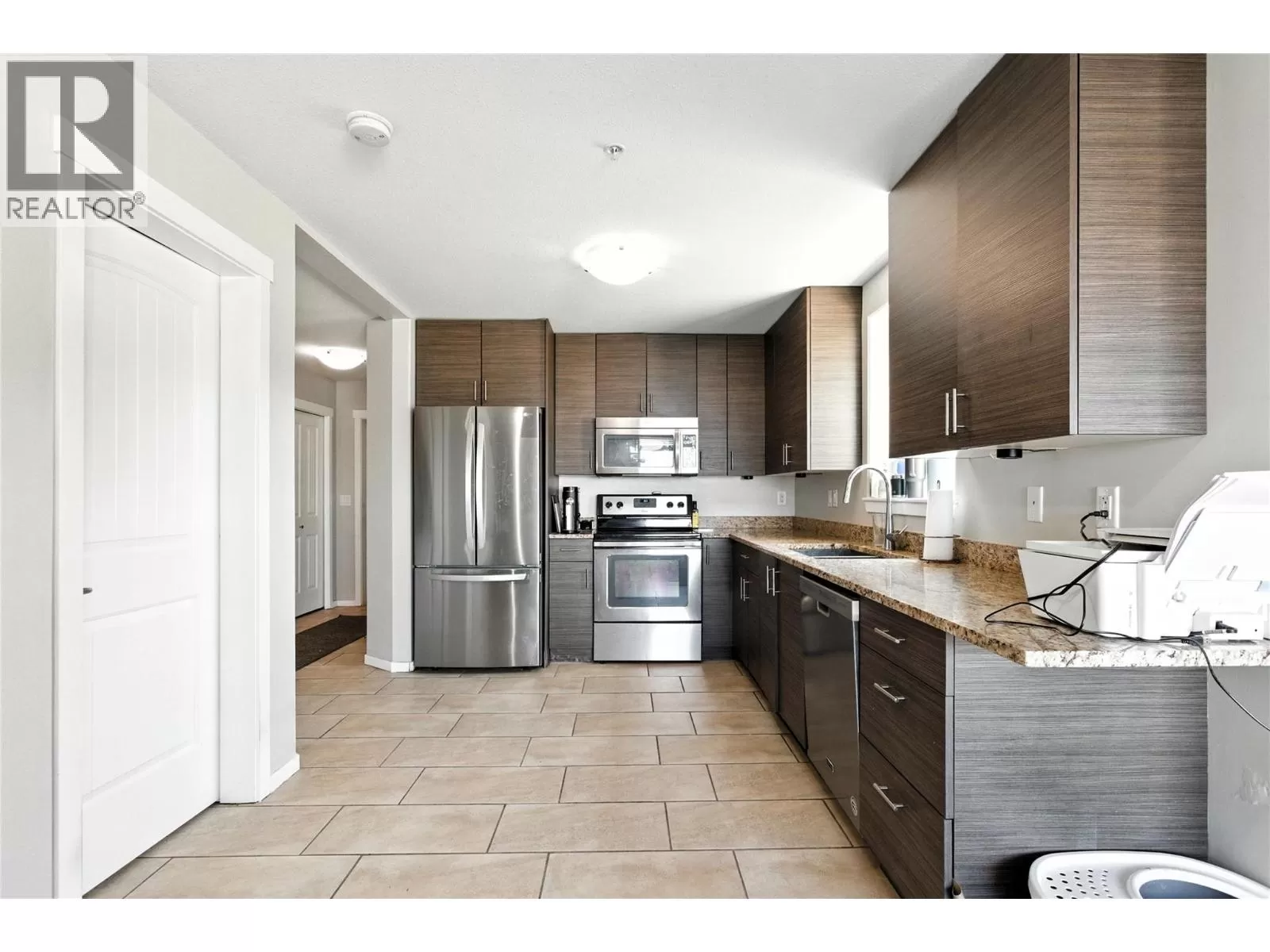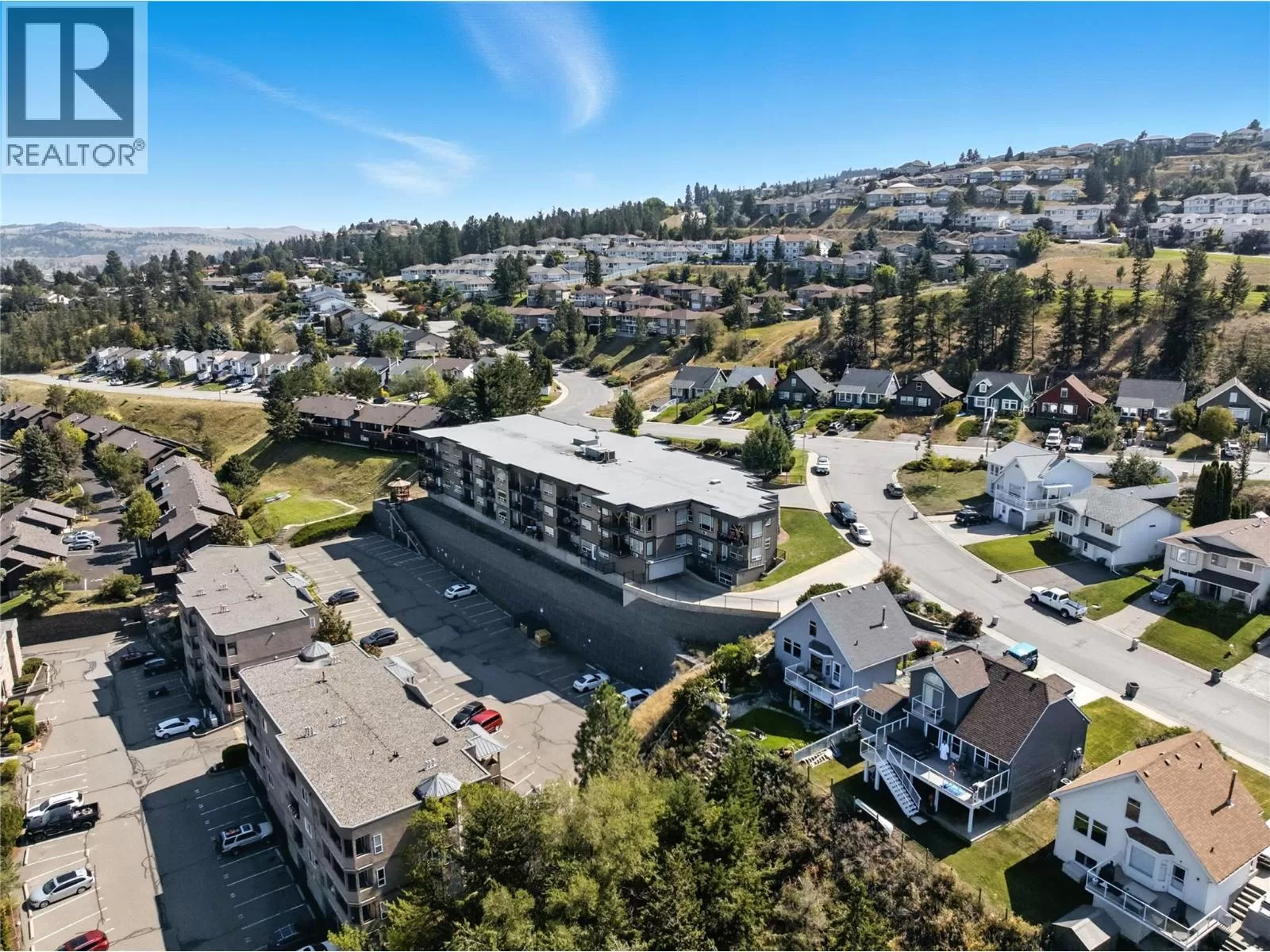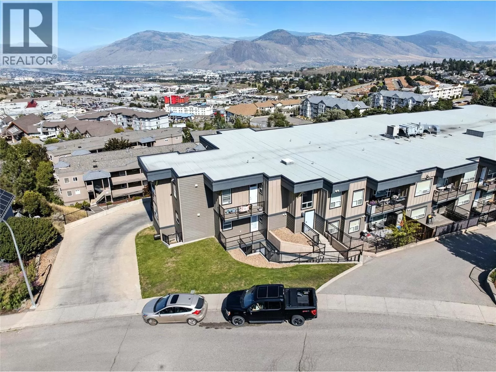 Welcome to this rare and ultra-convenient one-bedroom condo at Harrison Place in the heart of Aberdeen. This thoughtfully upgraded home is the only unit in the building with its own private front entrance and direct access to the parkade just steps away. Inside, enjoy a bright and modern living space with porcelain tile flooring throughout, quartz countertops, soft-close cabinetry, wall unit A/C, and a premium stainless steel appliance package. A full-size washer and dryer add to the convenience. Relax on the spacious covered patio with city views. The unit includes two parking stalls and a storage locker. Harrison Place offers excellent amenities, including a fitness room, bike storage, and a landscaped outdoor pergola area. Pets are welcome (one of the few strata buildings in Kamloops that welcomes large dogs!) and there are no rental restrictions, making this a versatile choice for first-time buyers, students, or investors. Close to shopping, restaurants, and transit, this home offers a low-maintenance lifestyle in a prime Aberdeen location. (id:27476)