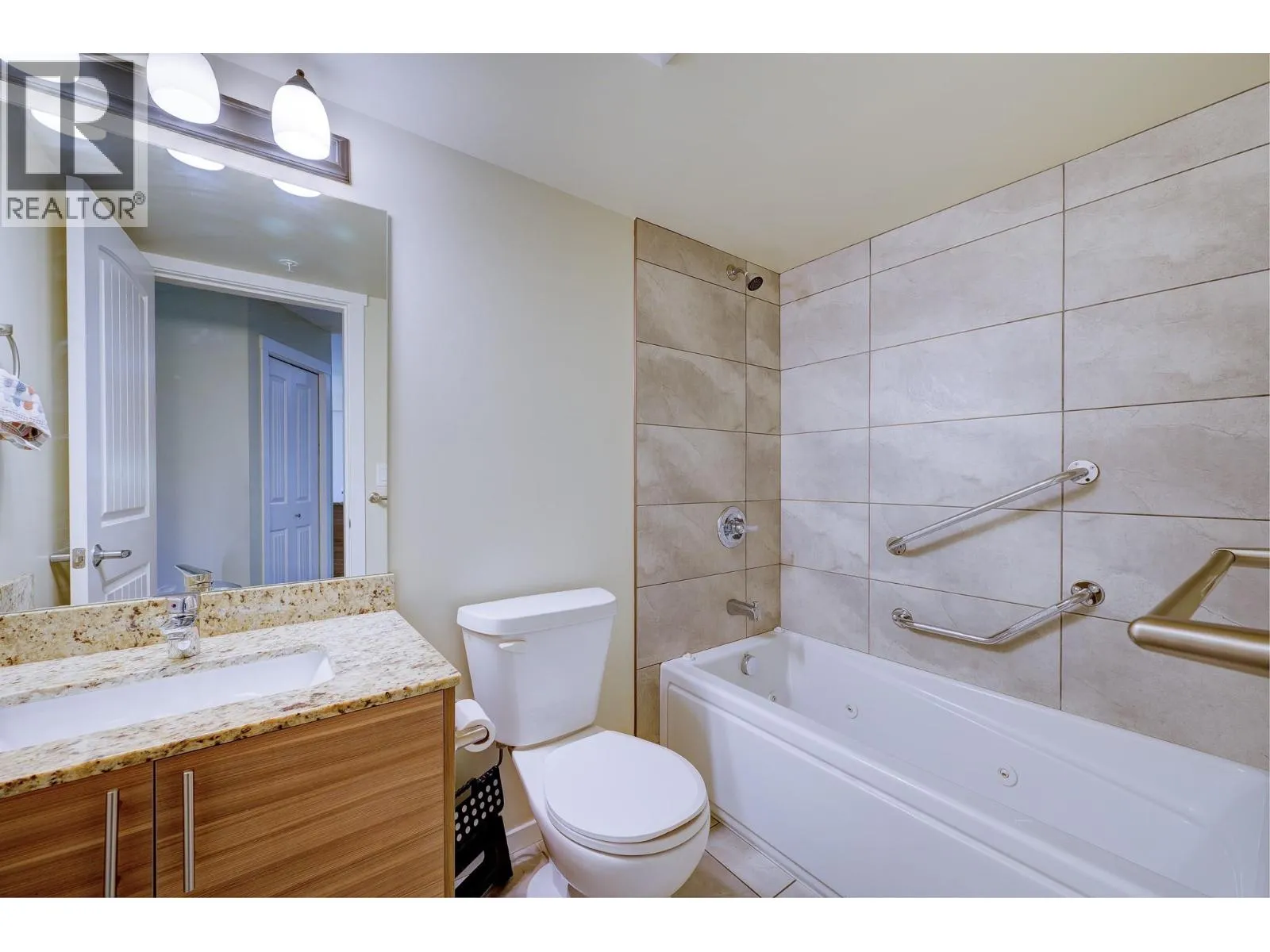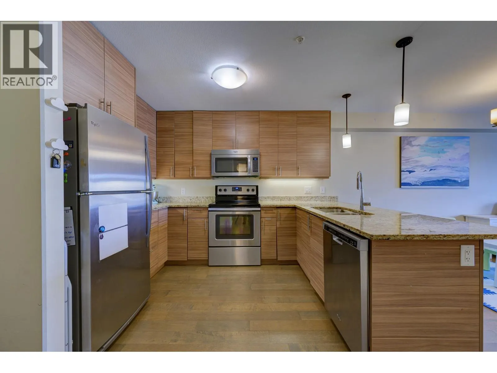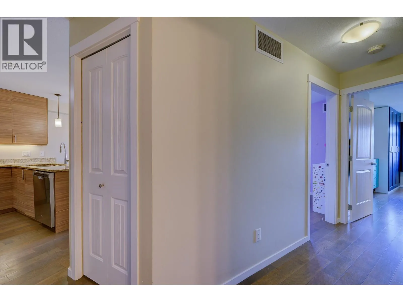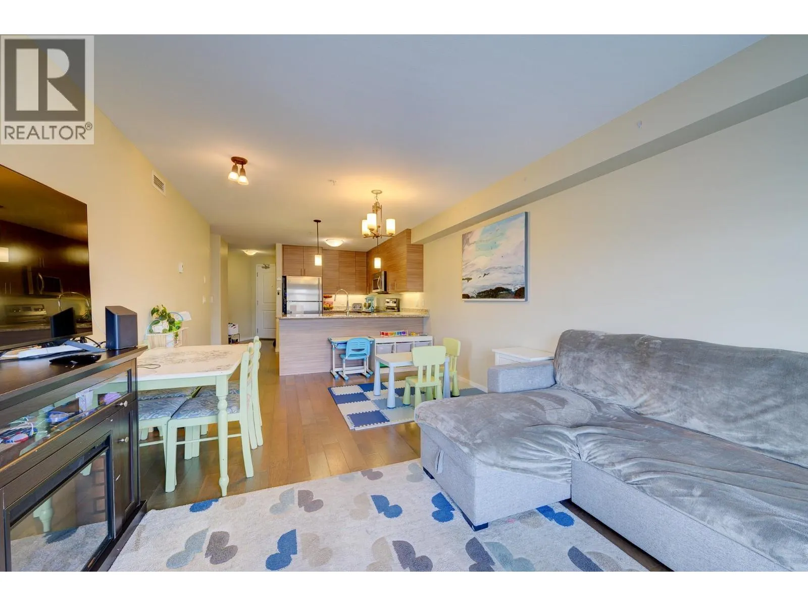 Lovely east facing Library Square 2 bedroom, 2 bathroom condo featuring an open floor plan and spacious deck. This unit includes hardwood flooring throughout. The main living space has an open floor plan with a U shaped kitchen that has a lot of storage and stone counters. The living and dining room space have a large picture window for natural light and there is access to the patio. There is a main bathroom that is 4 pieces and the primary bedroom features an ensuite with walk in shower. This unit has it';s own laundry room, 1 secure underground parking stall (stall 92) and one storage locker (locker 246). Other amenities in this building include a community room with large patio for gatherings and celebrations and secure bike storage in the parking garage. This unit is steps to local shopping and transportation. Unit is priced for a quick sale. (id:27476)