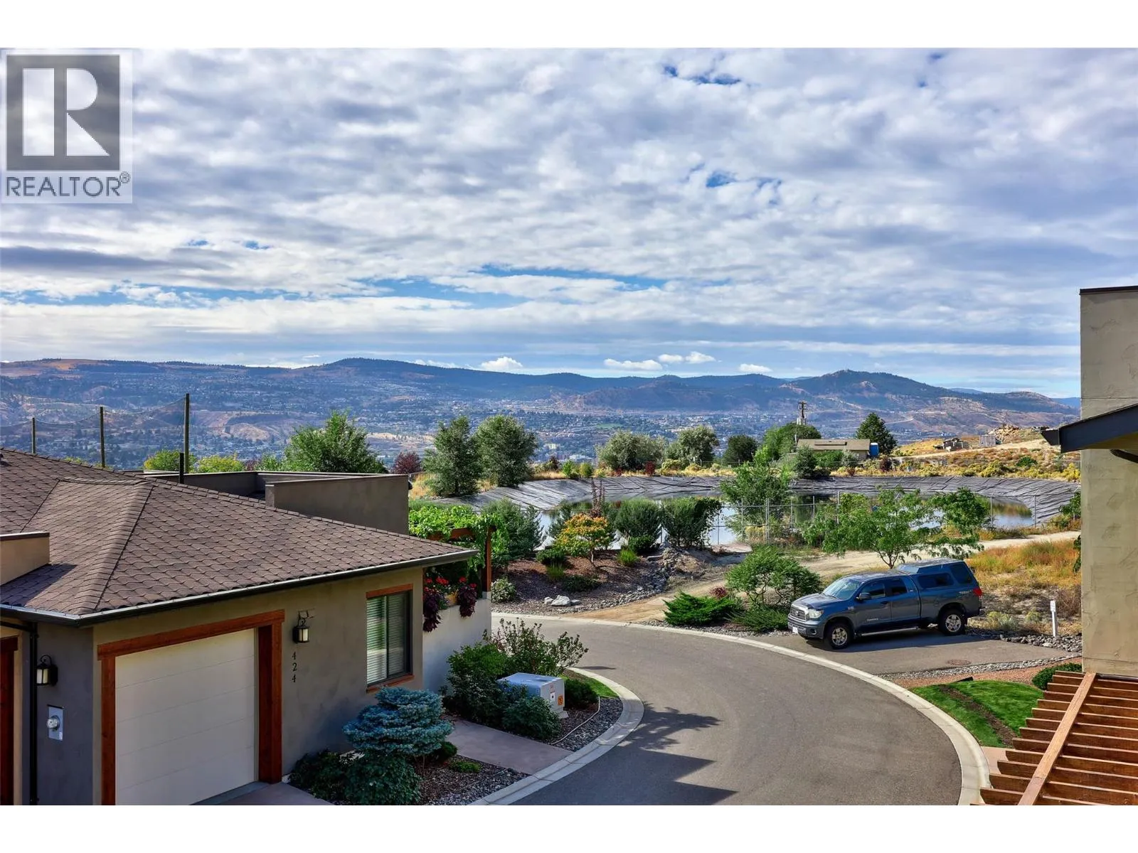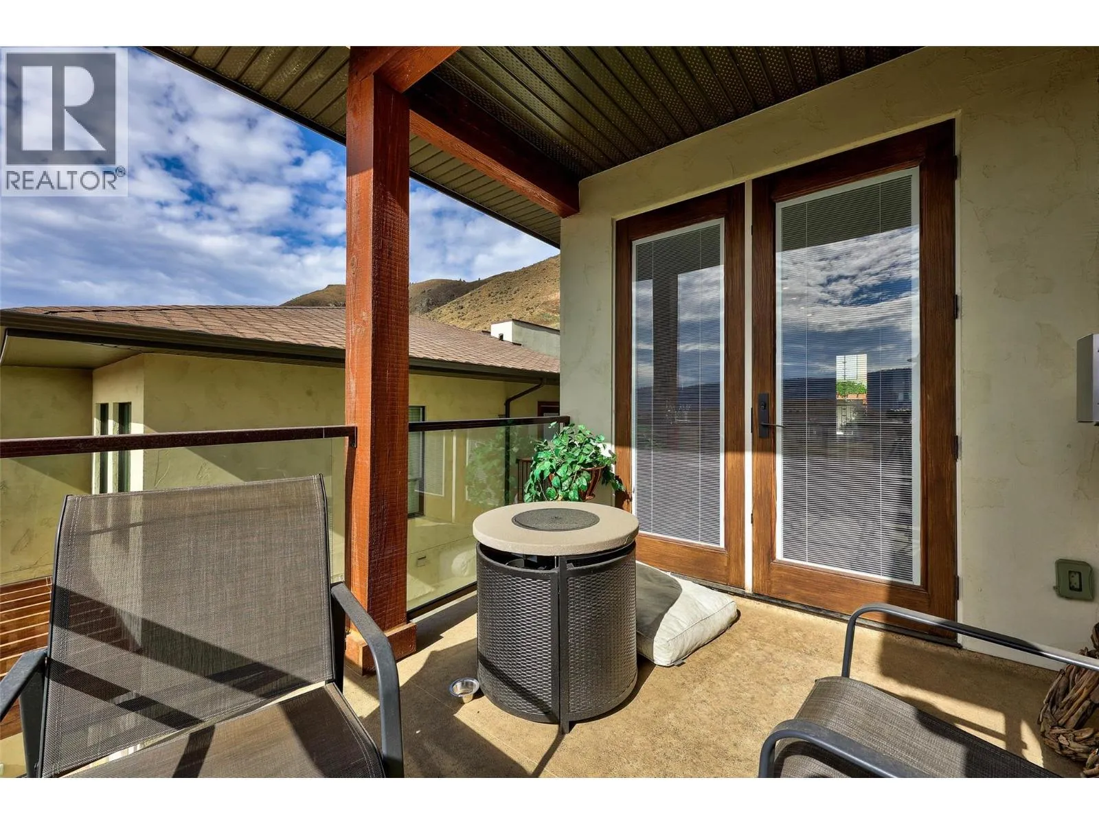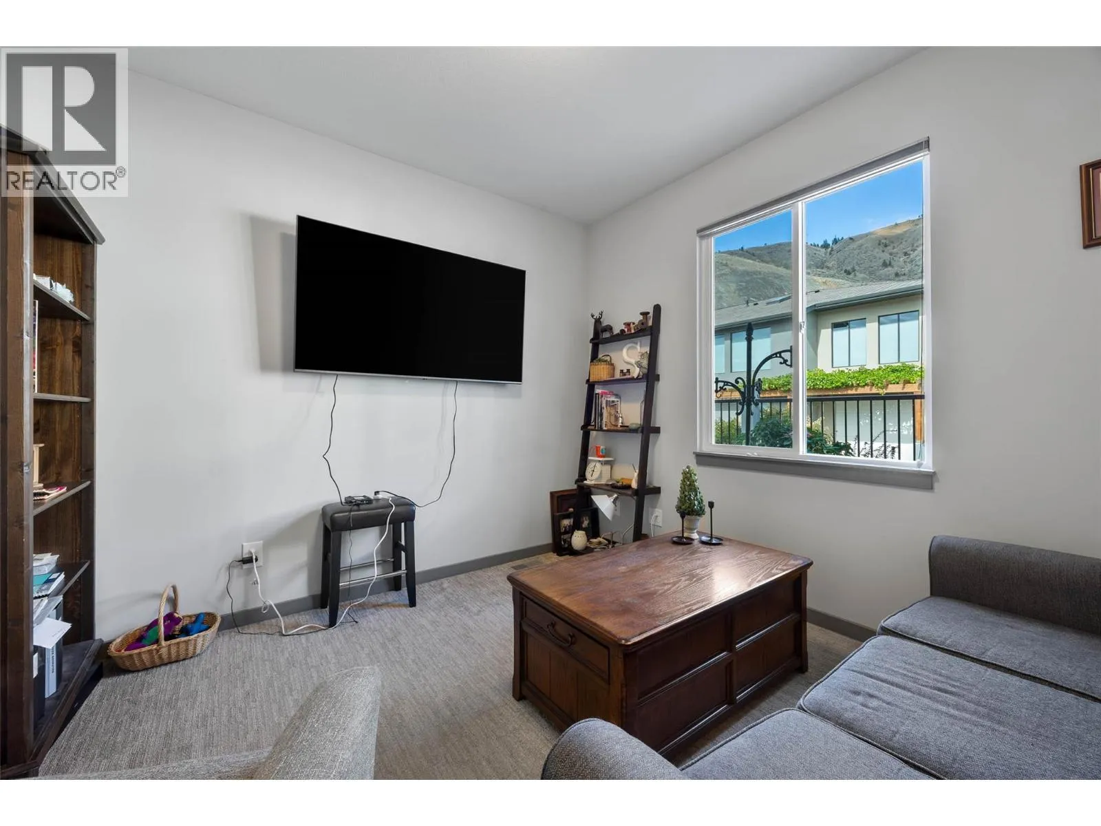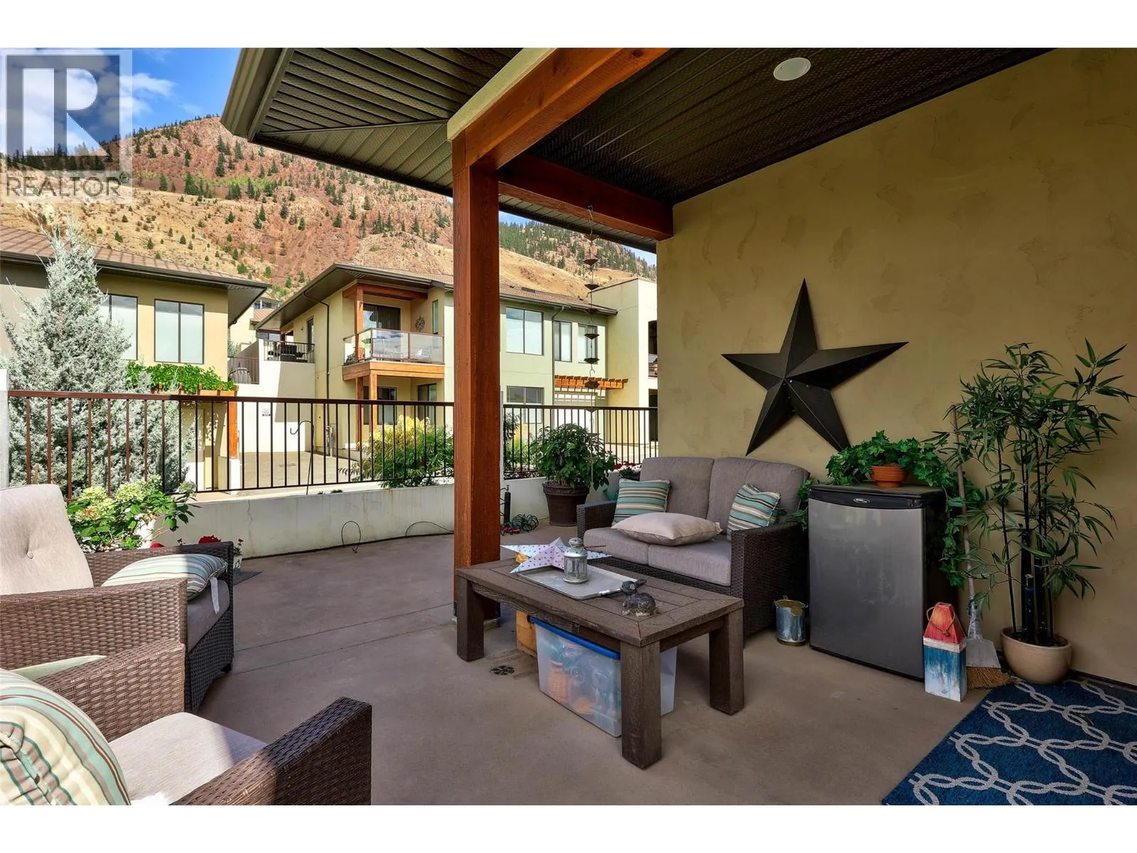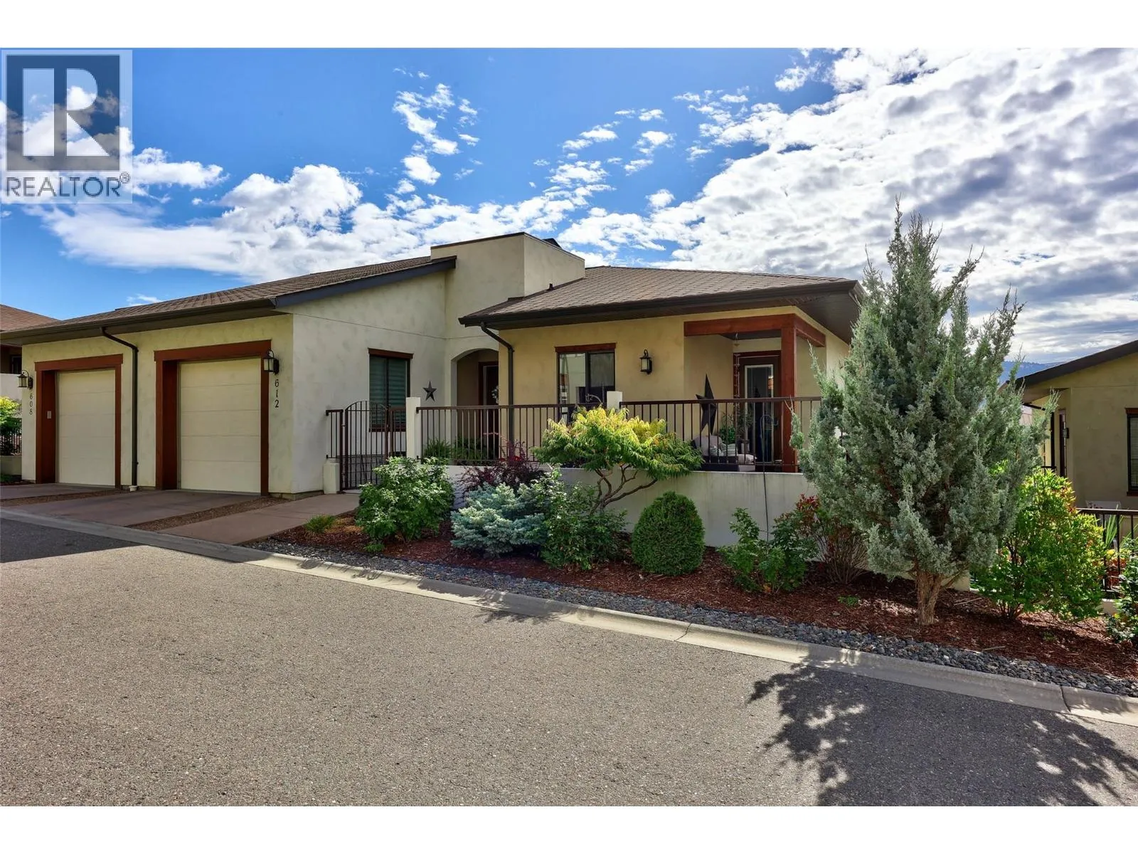Welcome to Belmonte Gardens, a highly desirable Tuscan-inspired community in Sun Rivers. This level-entry, south-facing townhouse is filled with natural light and offers an open-concept design that seamlessly connects the kitchen, dining, and living areas, perfect for entertaining or everyday living. The kitchen features custom wood cabinetry with built-in lighting, quartz countertops, an island with extended seating, a gas stove, and a pantry with custom shelving. The spacious primary suite includes a skylit ensuite with double vanity, heated floors, and a walk-in closet with the convenience of in-suite laundry. A versatile den/office and powder room complete the main floor. Enjoy two outdoor spaces on this level: a covered deck with sweeping city and mountain views, and a private gated courtyard at the front. The lower level offers a second bedroom, large rec room, 3-piece bathroom, oversized storage, access to a second single garage, and a third outdoor patio area. Additional highlights include geothermal heating, central A/C, heated bathroom floors, two separate garages (ideal for his & hers, extra storage, or a golf cart), gas BBQ hook up and proximity to visitor parking. Just minutes from downtown Kamloops, championship golf, dining, and walking trails. An excellent fit for professionals, downsizers, families, or snowbirds. (id:27476)
