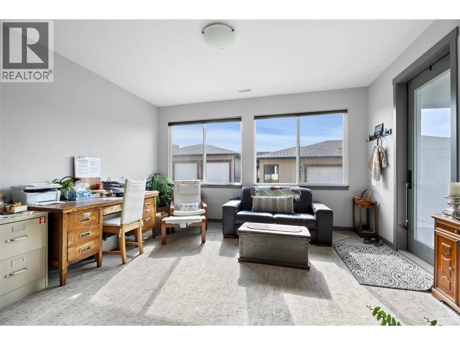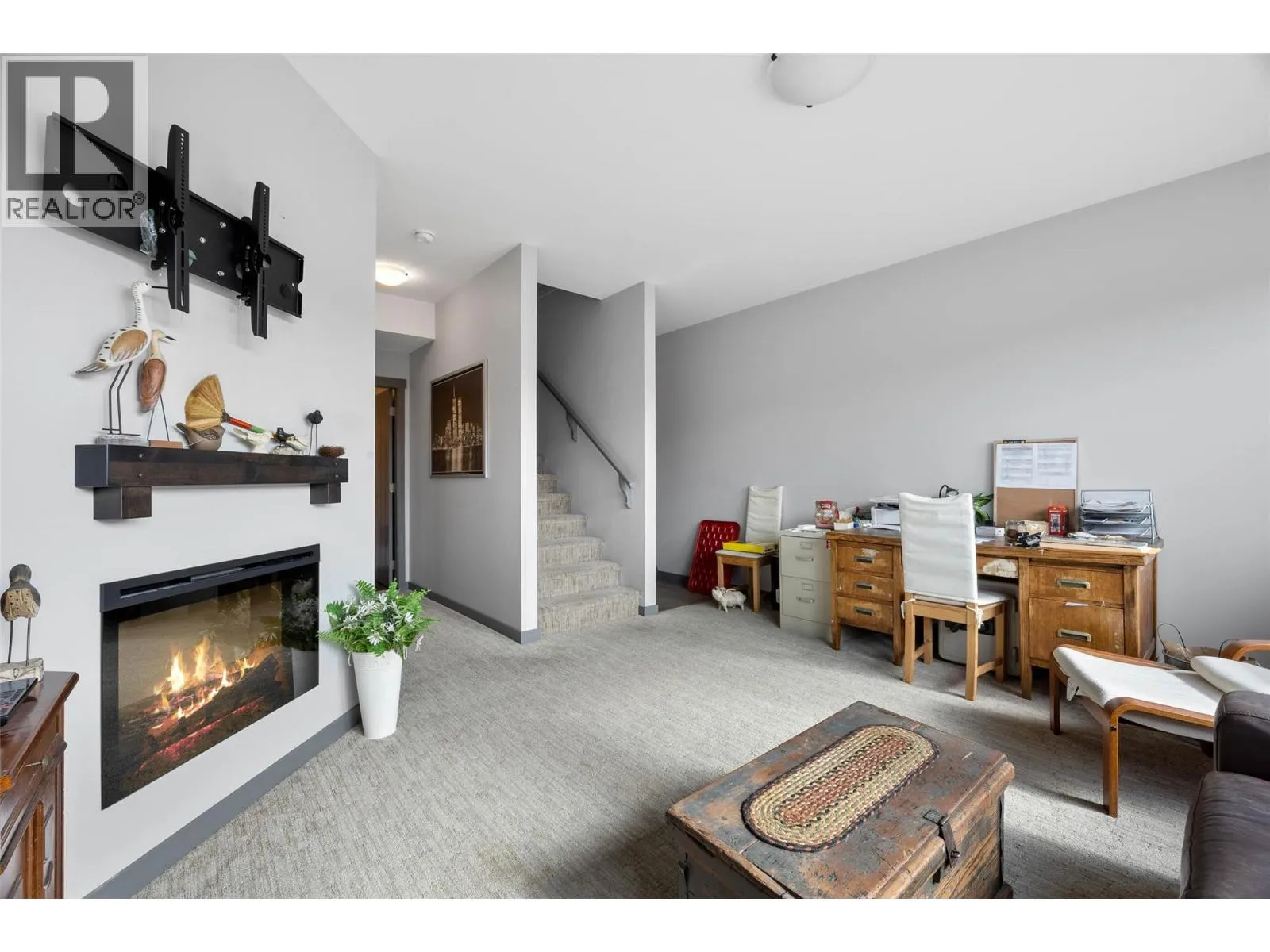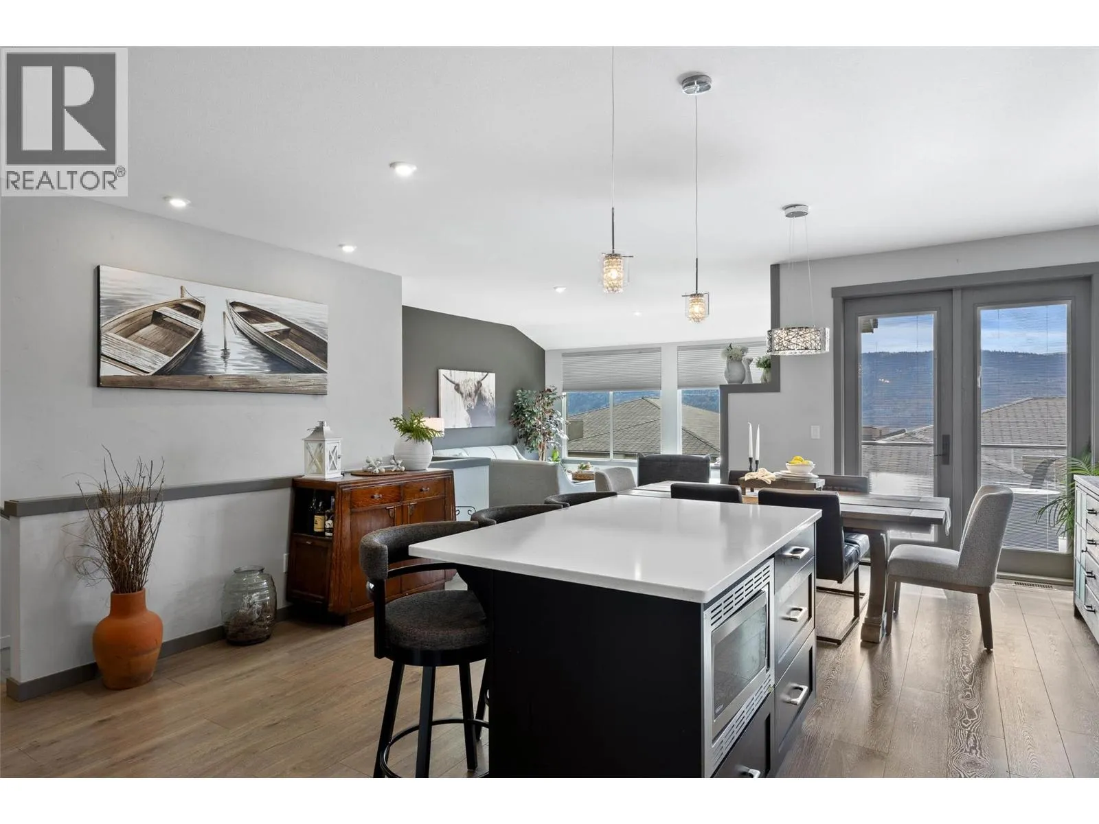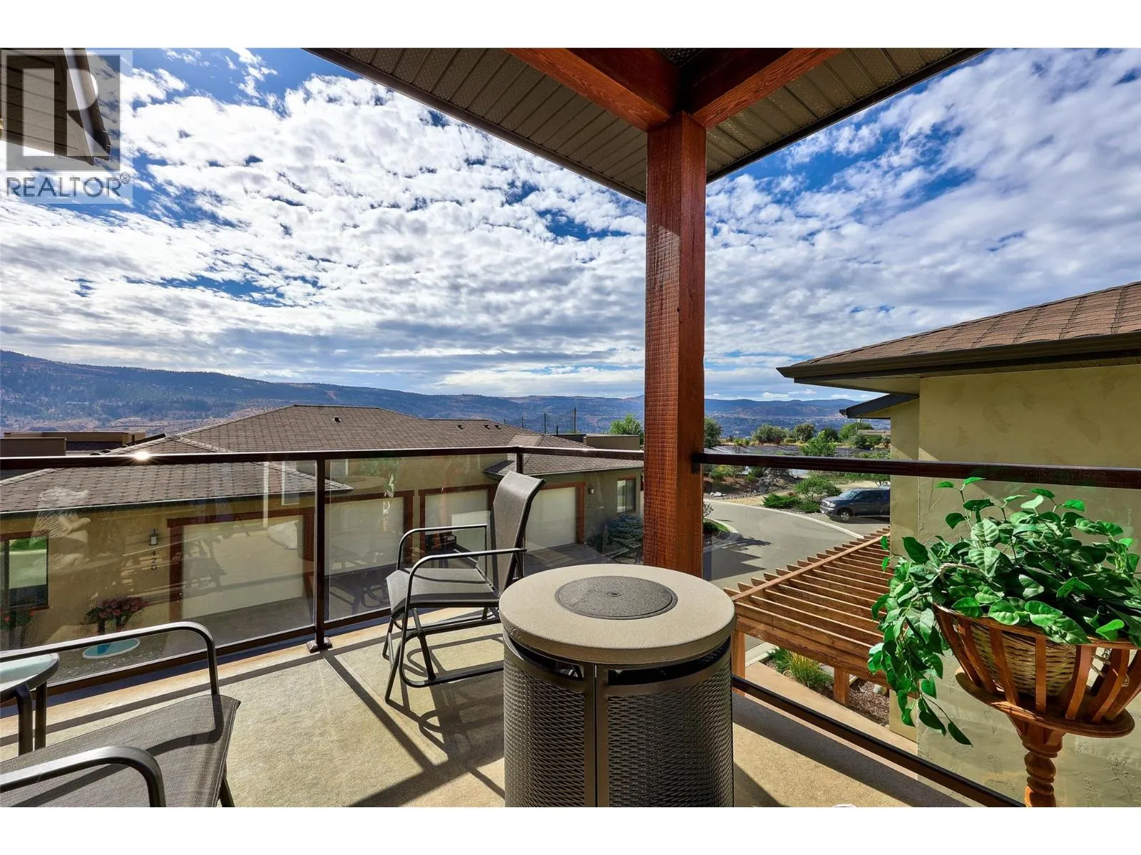 Welcome to Belmonte Gardens, a highly desirable Tuscan-inspired community in Sun Rivers. This level-entry, south-facing townhouse is filled with natural light and offers an open-concept design that seamlessly connects the kitchen, dining, and living areas, perfect for entertaining or everyday living. The kitchen features custom wood cabinetry with built-in lighting, quartz countertops, an island with extended seating, a gas stove, and a pantry with custom shelving. The spacious primary suite includes a skylit ensuite with double vanity, heated floors, and a walk-in closet with the convenience of in-suite laundry. A versatile den/office and powder room complete the main floor. Enjoy two outdoor spaces on this level: a covered deck with sweeping city and mountain views, and a private gated courtyard at the front. The lower level offers a second bedroom, large rec room, 3-piece bathroom, oversized storage, access to a second single garage, and a third outdoor patio area. Additional highlights include geothermal heating, central A/C, heated bathroom floors, two separate garages (ideal for his & hers, extra storage, or a golf cart), gas BBQ hook up and proximity to visitor parking. Just minutes from downtown Kamloops, championship golf, dining, and walking trails. An excellent fit for professionals, downsizers, families, or snowbirds. (id:27476)