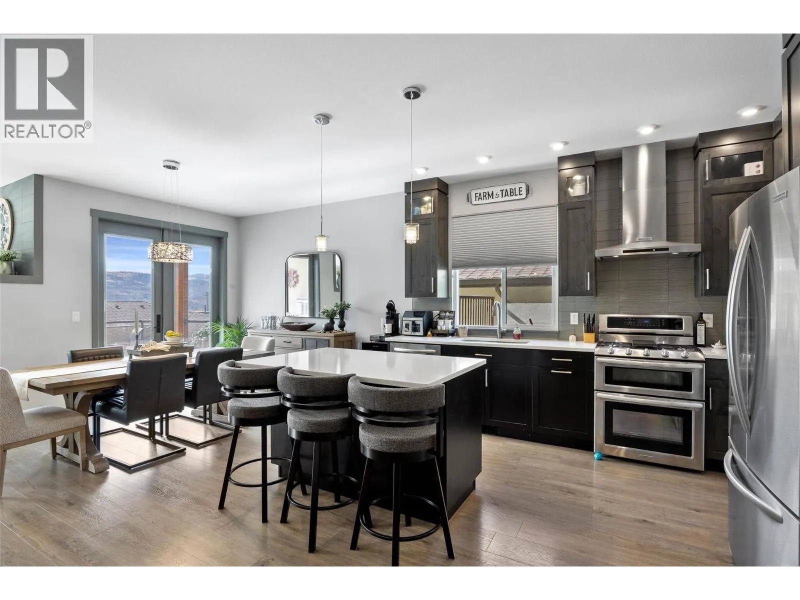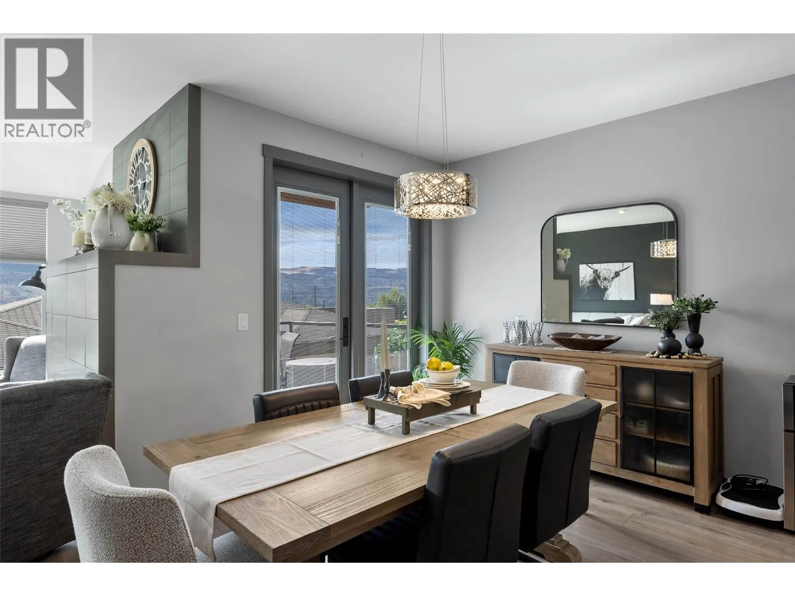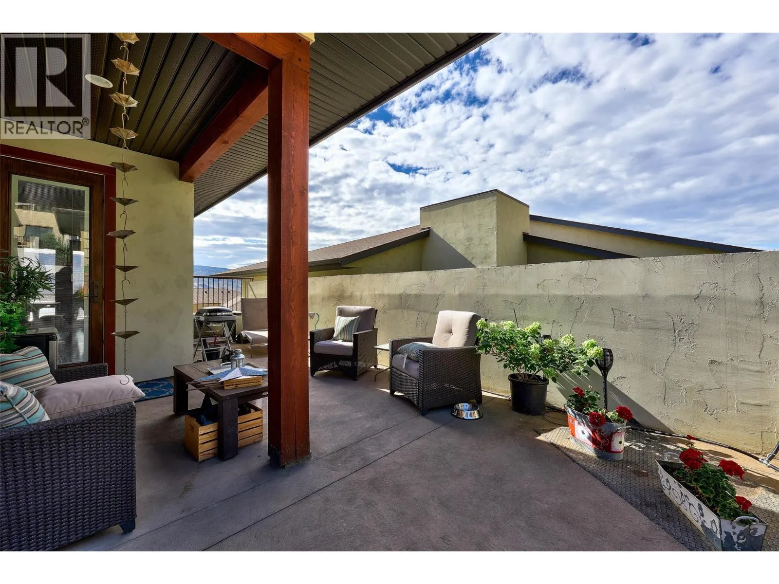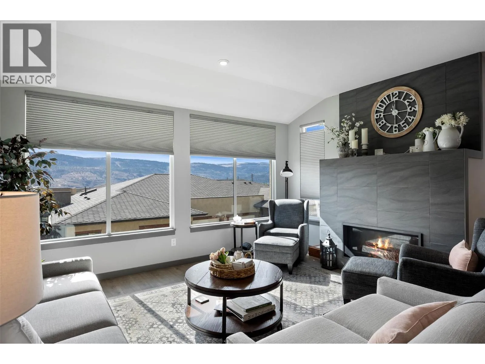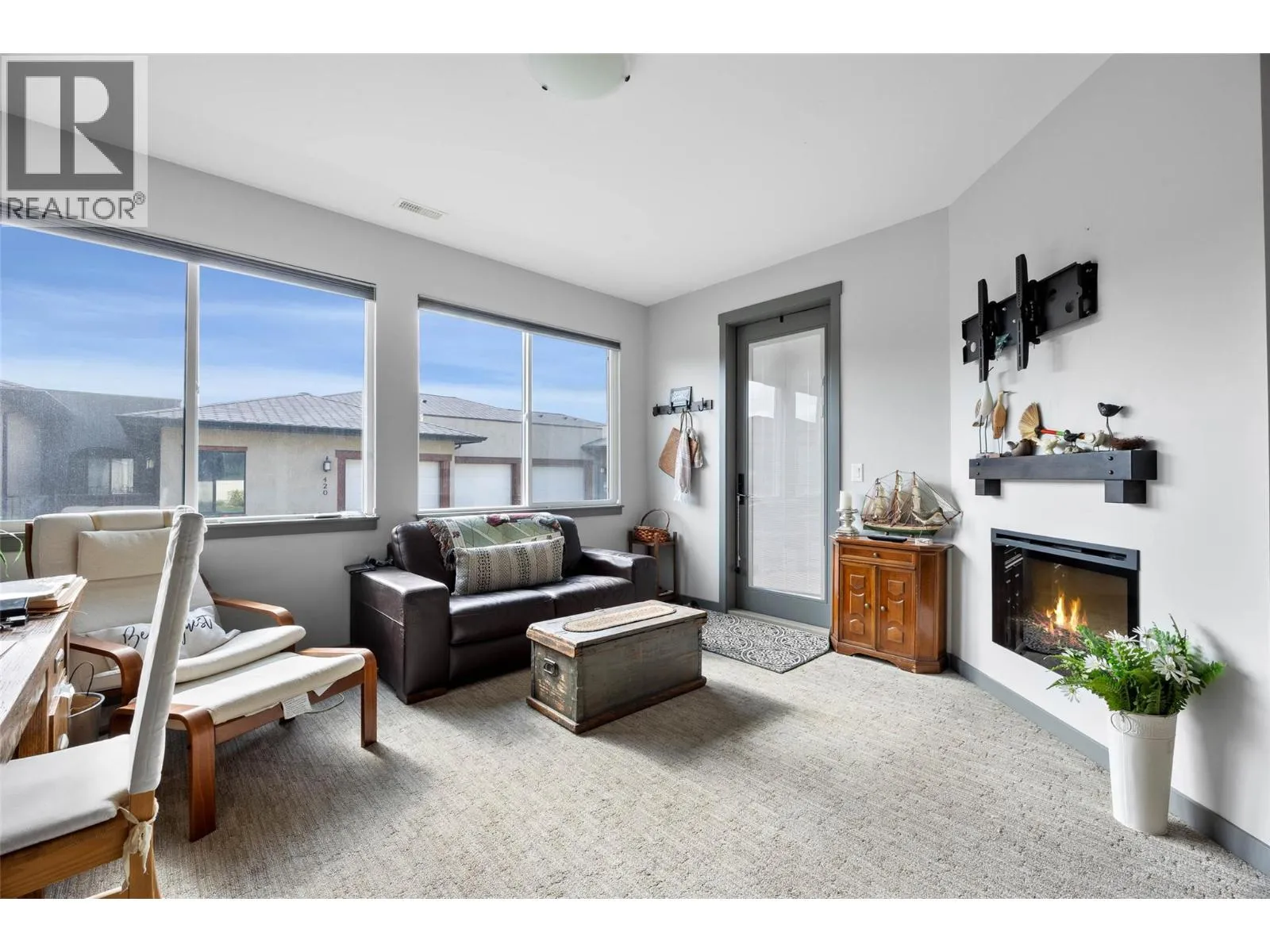 Welcome to Belmonte Gardens, a highly desirable Tuscan-inspired community in Sun Rivers. This level-entry, south-facing townhouse is filled with natural light and offers an open-concept design that seamlessly connects the kitchen, dining, and living areas, perfect for entertaining or everyday living. The kitchen features custom wood cabinetry with built-in lighting, quartz countertops, an island with extended seating, a gas stove, and a pantry with custom shelving. The spacious primary suite includes a skylit ensuite with double vanity, heated floors, and a walk-in closet with the convenience of in-suite laundry. A versatile den/office and powder room complete the main floor. Enjoy two outdoor spaces on this level: a covered deck with sweeping city and mountain views, and a private gated courtyard at the front. The lower level offers a second bedroom, large rec room, 3-piece bathroom, oversized storage, access to a second single garage, and a third outdoor patio area. Additional highlights include geothermal heating, central A/C, heated bathroom floors, two separate garages (ideal for his & hers, extra storage, or a golf cart), gas BBQ hook up and proximity to visitor parking. Just minutes from downtown Kamloops, championship golf, dining, and walking trails. An excellent fit for professionals, downsizers, families, or snowbirds. (id:27476)