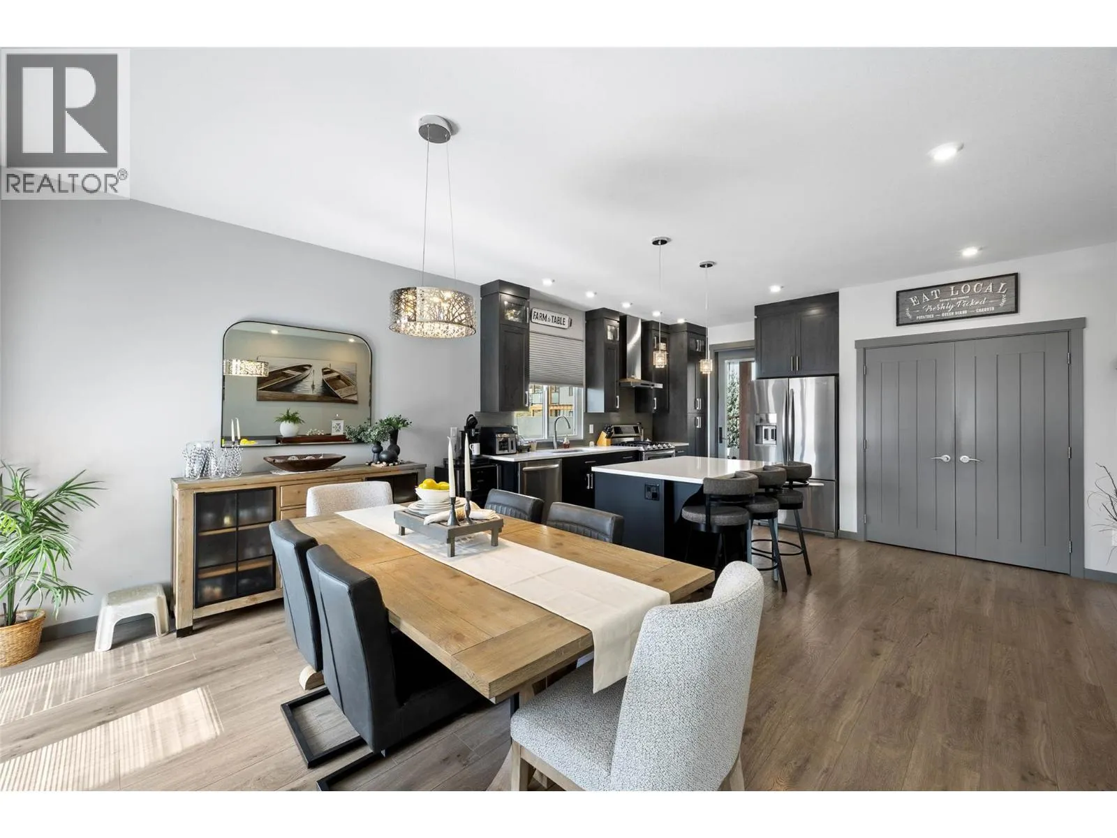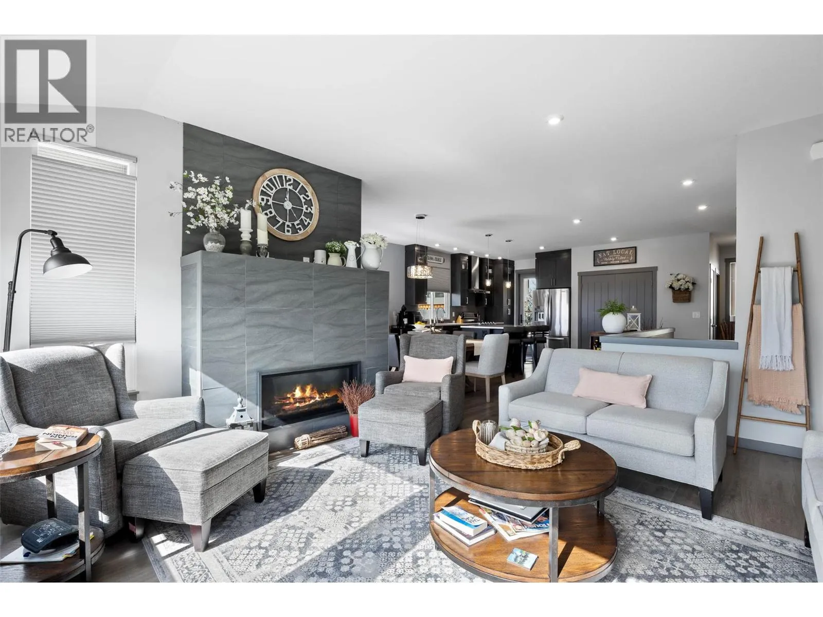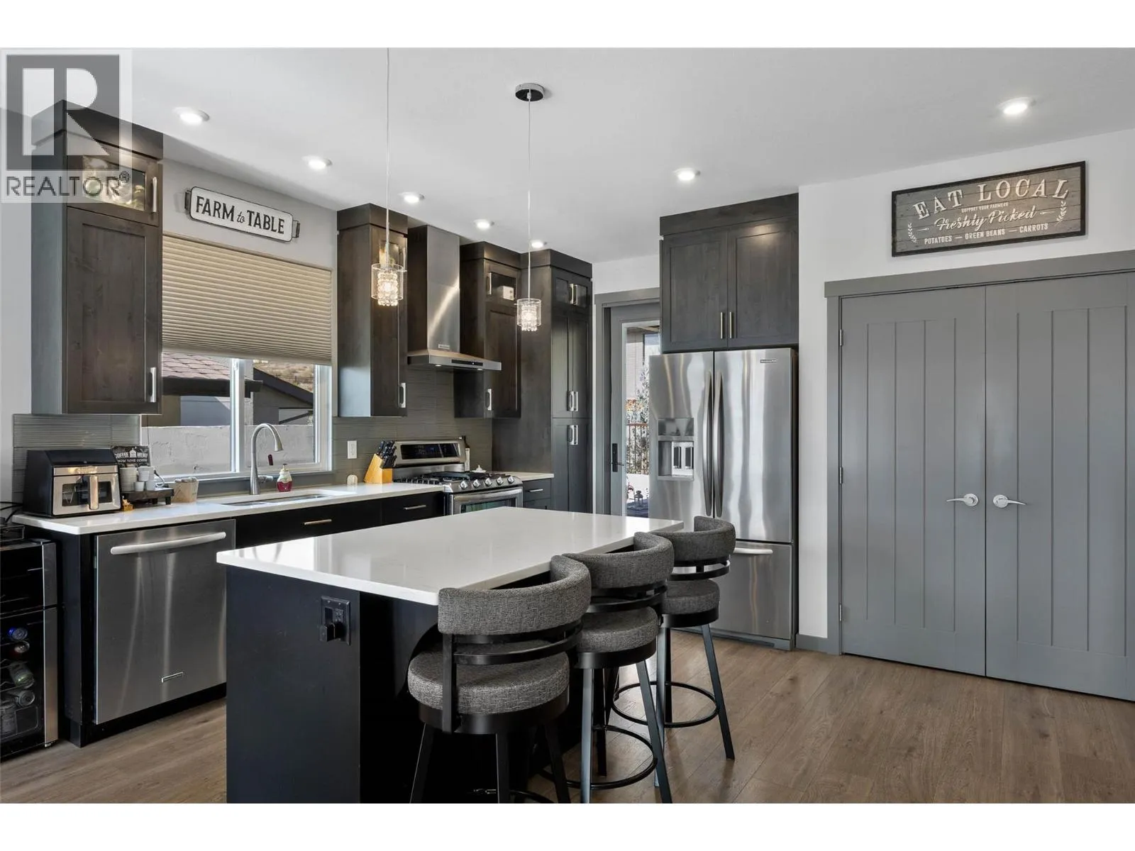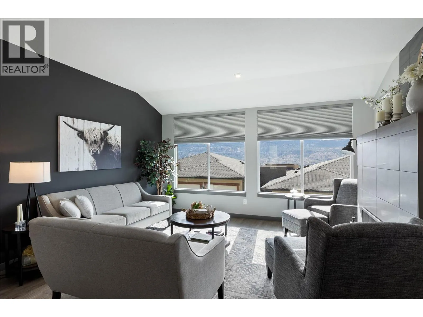 Welcome to Belmonte Gardens, a highly desirable Tuscan-inspired community in Sun Rivers. This level-entry, south-facing townhouse is filled with natural light and offers an open-concept design that seamlessly connects the kitchen, dining, and living areas, perfect for entertaining or everyday living. The kitchen features custom wood cabinetry with built-in lighting, quartz countertops, an island with extended seating, a gas stove, and a pantry with custom shelving. The spacious primary suite includes a skylit ensuite with double vanity, heated floors, and a walk-in closet with the convenience of in-suite laundry. A versatile den/office and powder room complete the main floor. Enjoy two outdoor spaces on this level: a covered deck with sweeping city and mountain views, and a private gated courtyard at the front. The lower level offers a second bedroom, large rec room, 3-piece bathroom, oversized storage, access to a second single garage, and a third outdoor patio area. Additional highlights include geothermal heating, central A/C, heated bathroom floors, two separate garages (ideal for his & hers, extra storage, or a golf cart), gas BBQ hook up and proximity to visitor parking. Just minutes from downtown Kamloops, championship golf, dining, and walking trails. An excellent fit for professionals, downsizers, families, or snowbirds. (id:27476)
