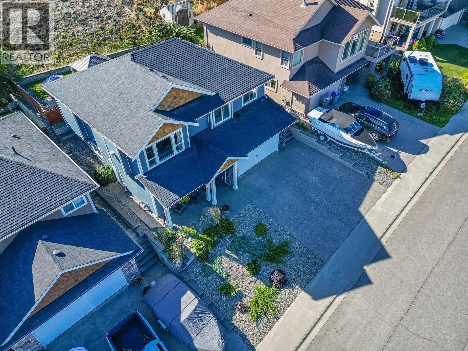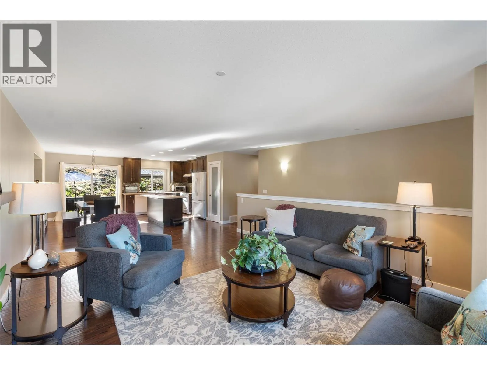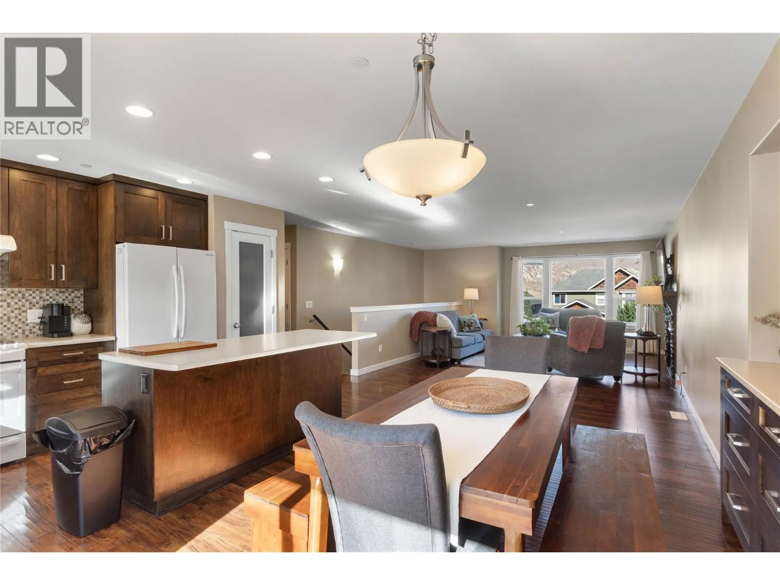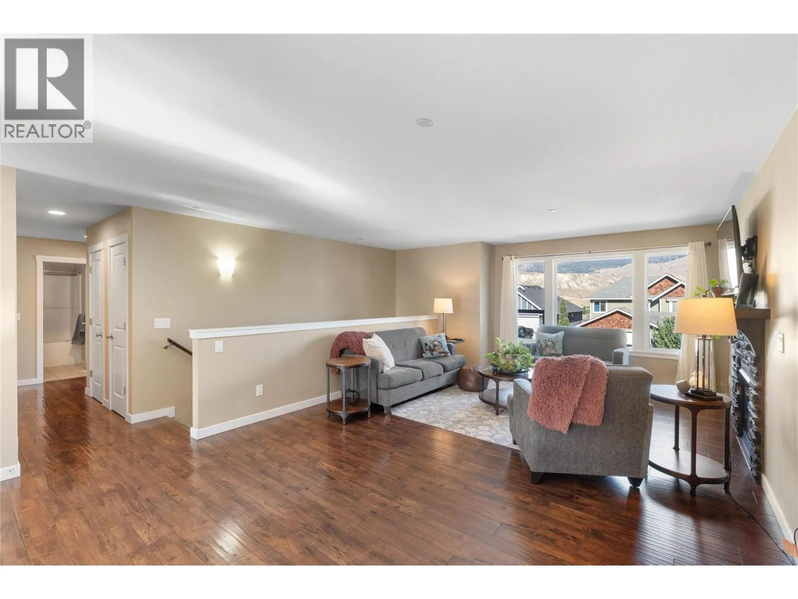 Beautiful family home with great street appeal, xeriscaped front yard & generous 3 car wide driveway for your RV or boat with easy care manual UG sprinklers for the front plantings. Welcoming foyer with front bedroom/office and access to the oversized, heated double garage with tandem bay for a 3rd vehicle or workshop. Upper level features engineered hardwood floors, open concept living with island kitchen with appliances included & lots of cabinets for storage. Spacious living room has gas fireplace & stunning river and mountain vineyard views. Dining area with built-in buffet opens to a private fenced yard with negotiable gazebo â perfect for kids & pets. Three bedrooms up including a spacious primary with 4pc ensuite, double sinks & large shower. Entry level offers a bright bachelor in-law suite with Murphy bed, private entrance & full kitchen with all appliances and full bath â ideal mortgage helper or guest space. New hot water tank, in-house sprinkler system, well maintained & serviced furnace & A/C. Backs onto greenspace with trails & close to neighborhood park â the perfect home for a growing family! (id:27476)