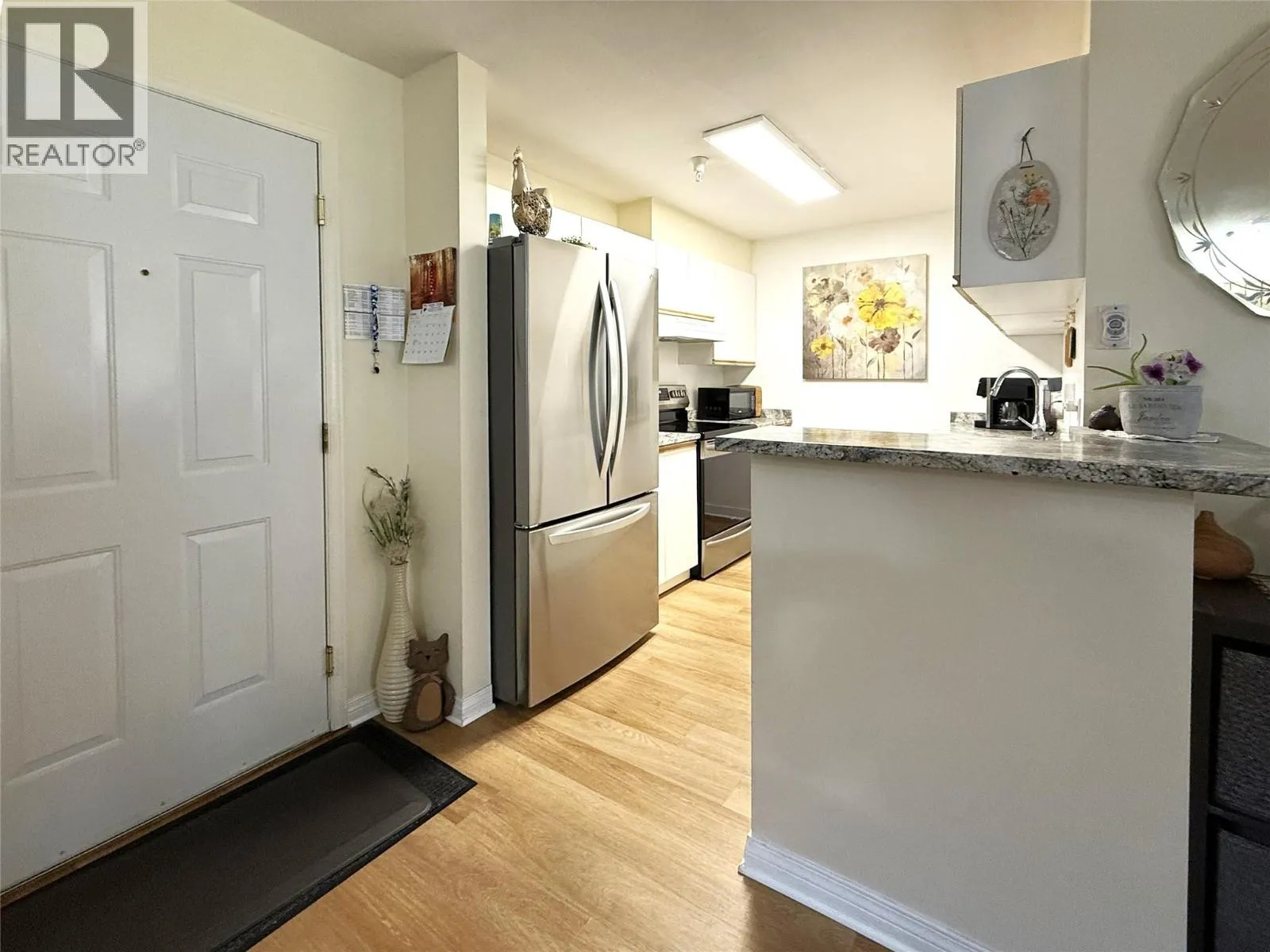 Bright & Comfortable 55+ Living at Manor House. Great opportunity to own in the highly desired, centrally located Manor House. This 55+ community offers comfort, convenience, and a welcoming atmosphere. This updated, 2-bedroom, 2-bath unit is move-in ready with end of November possession. Enjoy the benefits of a main floor location, perfect for easy access and relaxing on your covered private deck surrounded by trees. Inside, youâll find easy-care laminate flooring, an updated bathroom with a large walk-in shower., plus a spacious open-plan living and dining area. The bright kitchen comes with new counters with wider bar for entertaining. Added conveniences include a wall A/C unit, in-suite laundry with stacking washer & dryer, and extra storage. Manor House also offers a community recreation room for social gatherings with neighbours. Parking available by strata waitlist. (id:27476)