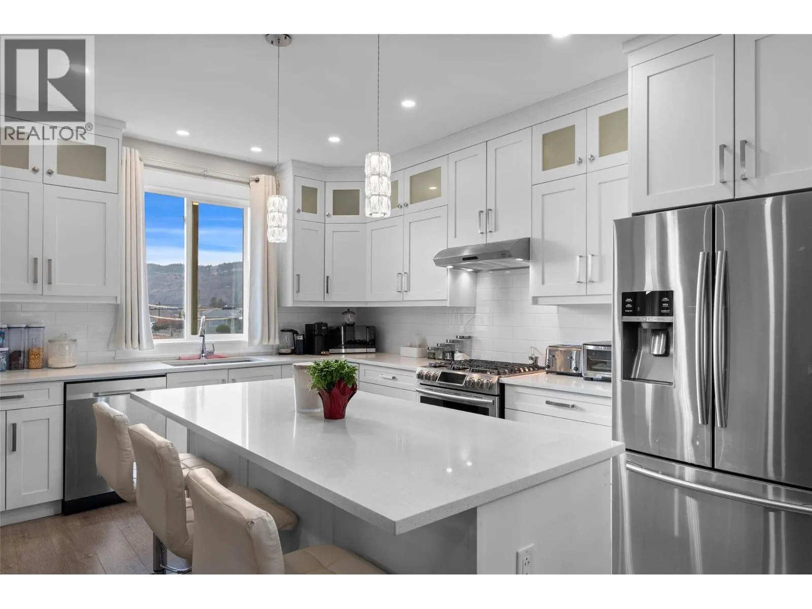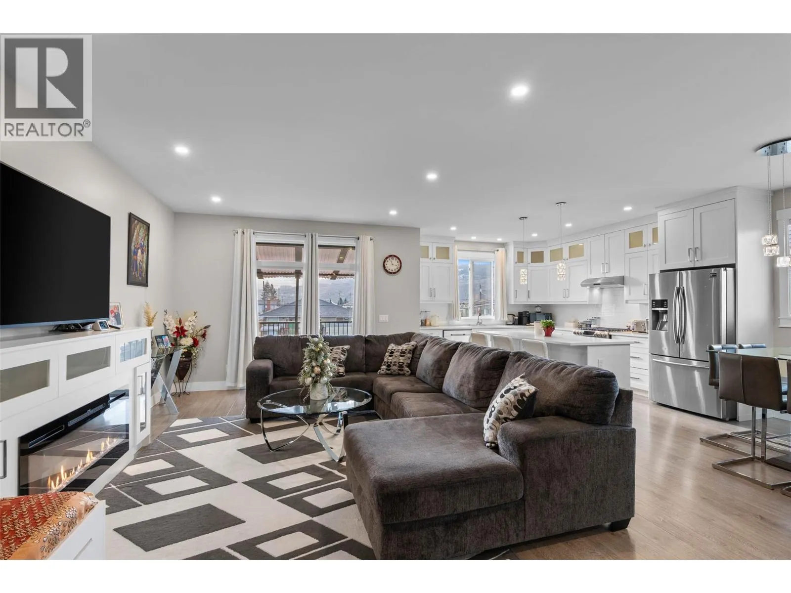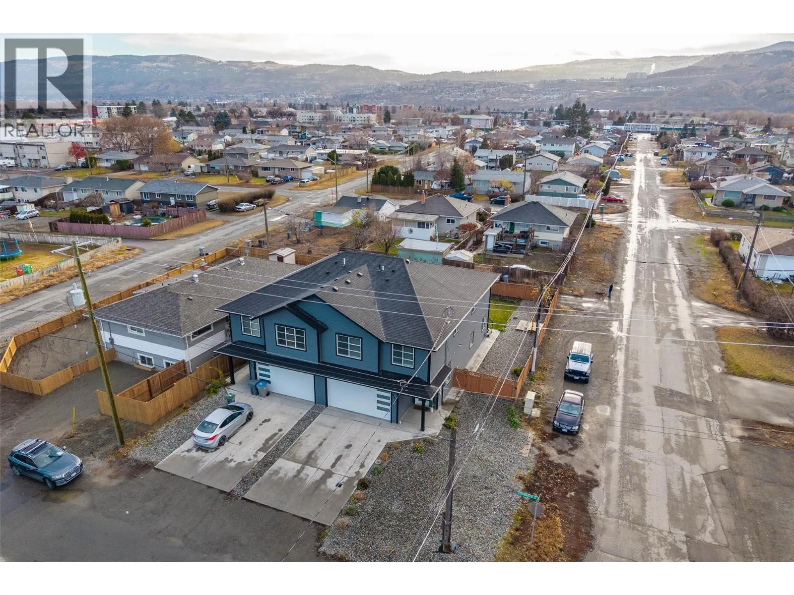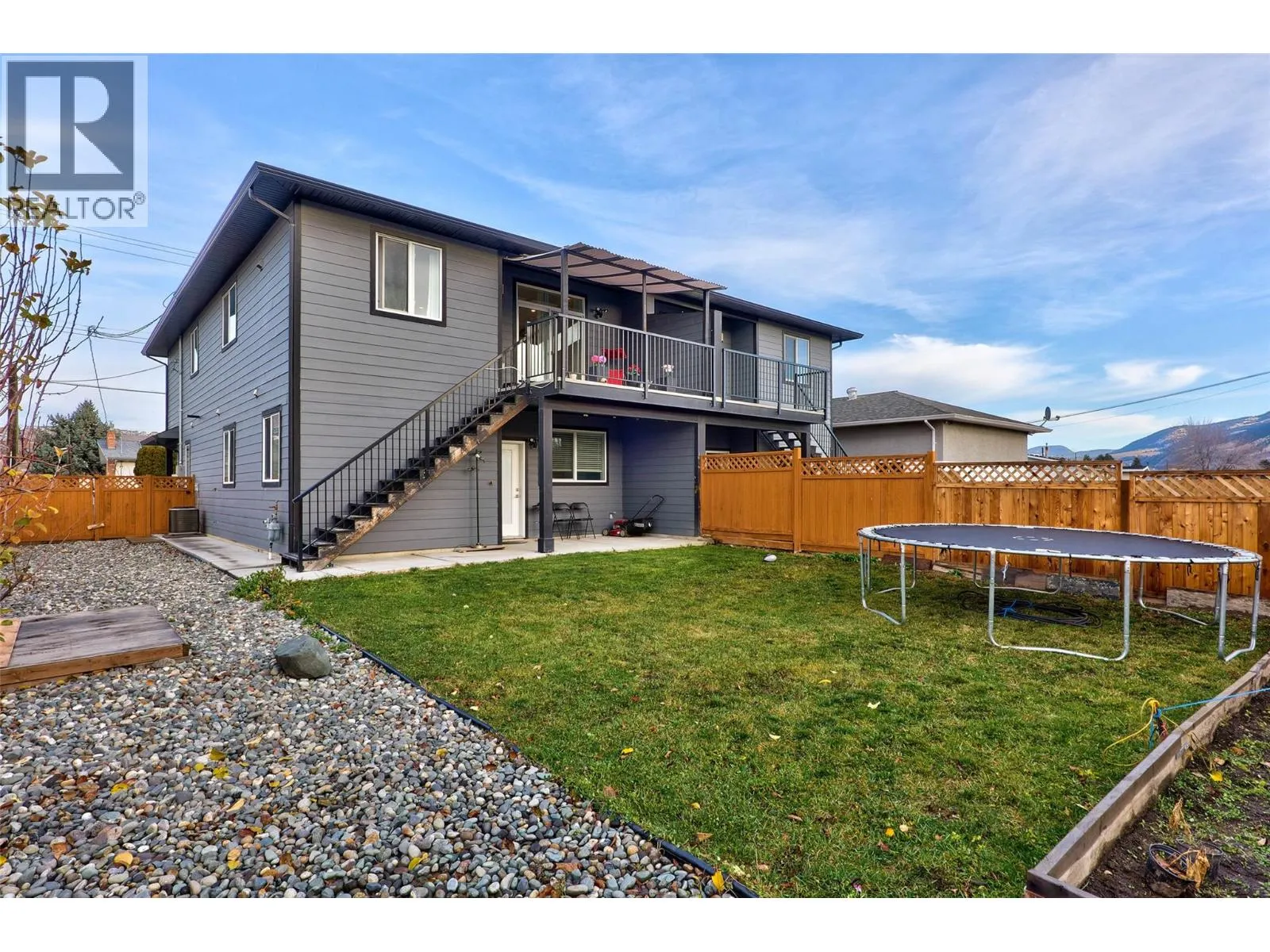 Welcome to this beautifully finished half duplex situated on a good size flat lot allowing plenty of room for the whole family and includes a two bedroom one bathroom in law suite. Located in the desirable North Shore neighborhood, this home offers a spacious, open-concept layout with high ceilings and modern high-end finishes throughout. The main level features a high-end kitchen complete with island, quartz countertops, white cabinetry and stainless steel appliances. Directly off of the kitchen & living room, step out onto the balcony overlooking the backyard and city views of Kamloops. Outdoor stairs conveniently lead to the fully fenced backyard perfect for kids & pets. Down the hall, you will find 3 bedrooms including the primary suite that features a walk-in closet and 4 piece ensuite, an additional bathroom and stylish, contemporary tones. The fully finished basement includes the laundry room, den and one bedroom, one bathroom in law suite with separate entrance. Double car garage, alley access to the yard to store your toys. Outside, enjoy a fully fenced and landscaped backyard, plus RV parking in the front. A great opportunity for families or investors alike -- Don't miss your chance to make this home yours! (id:27476)
