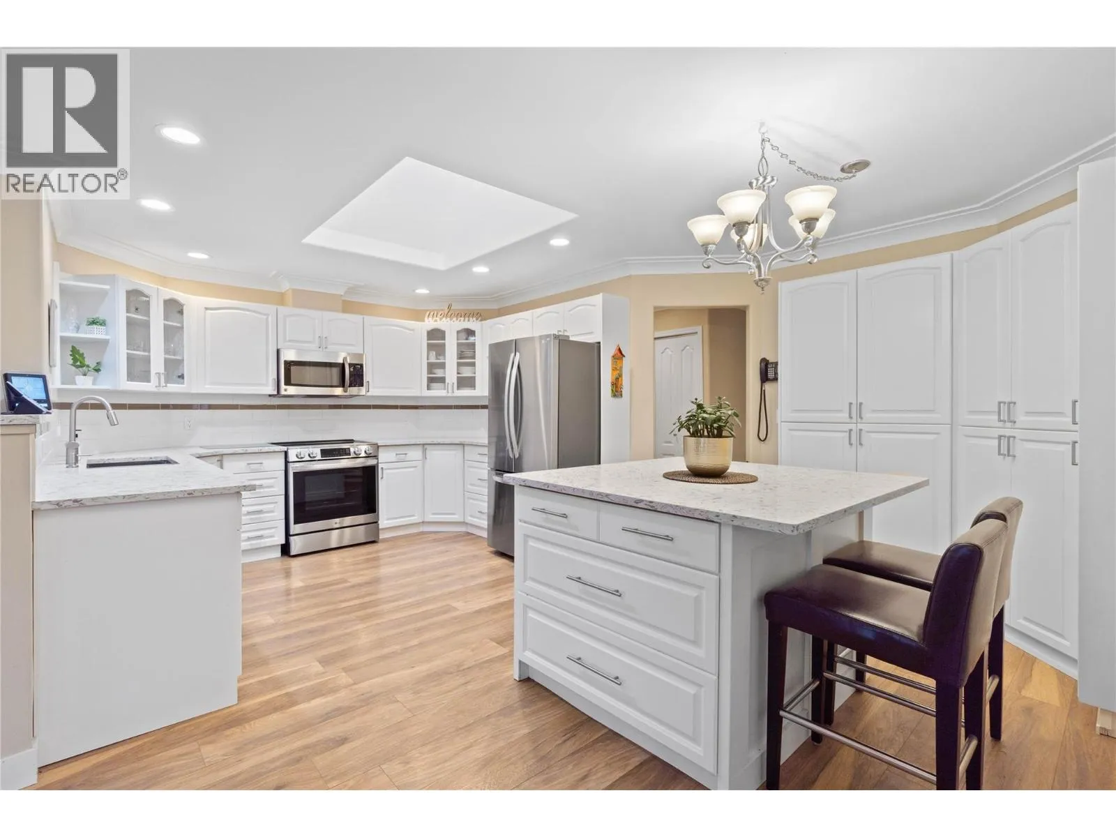 Welcome to this elegant, rancher with full daylight basementâperfect for families needing extra space or a valuable mortgage-helper suite. Step inside to a warm foyer leading to an inviting formal living room with a graceful bow window and a sophisticated dining room ideal for hosting family gatherings. The bright island kitchen impresses with updated cabinetry, generous counter space, newer stainless steel appliances, and a skylight that floods the space with natural light. The adjoining family room flows seamlessly onto the wraparound deck, complete with gas hookup for BBQs and overlooking a private 1/3-acre fenced yard that backs on parkland. Kids, pets, gardeningâthereâs space for it all, plus underground sprinklers to make life easier. The main includes three comfortable bedrooms, convenient main-floor laundry with new washer & dryer, and direct access to the double garage. Downstairs is a 2-bedroom in-law suite, ideal for aging parents, adult children, or rental income. The suite features an oak kitchen with plenty of storage, newer 4-piece bathroom with soaker tub, cozy living room with gas fireplace, and walk-out access to the covered patio and yard. Also on the lower level: a generous workshop/storage space, home office/den, and a home gymâroom for every hobby and lifestyle. With updates to the furnace, hot water tank, roof, and central air, this home blends comfort and function. Home is priced below assessment to compensate for Poly-B with copper joints. (id:27476)