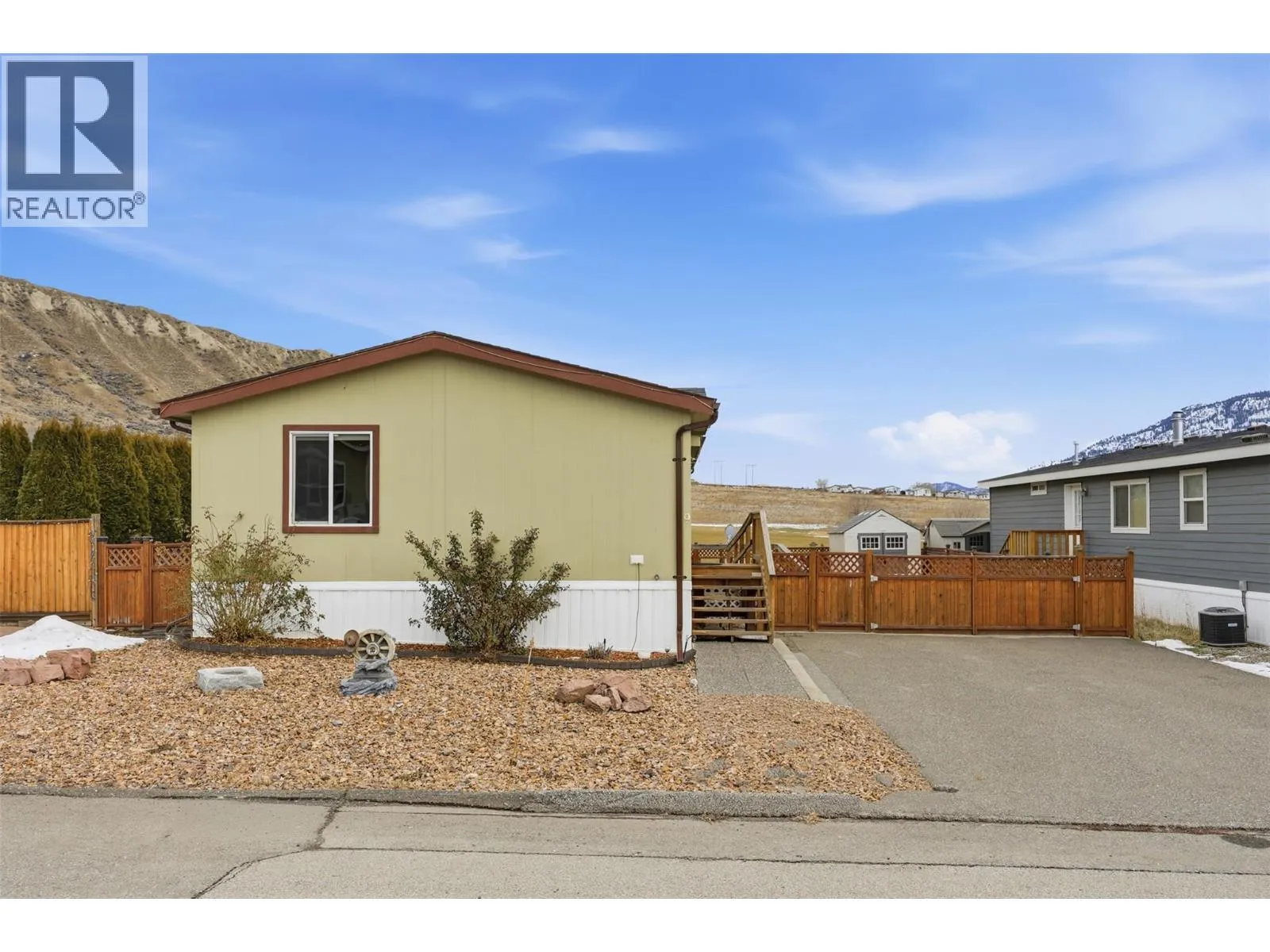 This 3 Bedroom & 2 Bathroom home features 1,056 sq ft of living space, an open-concept & bright floor plan with vaulted ceilings, boasting a spacious kitchen w/pantry, gas range and SS appliances, a dining area and a living room with large windows. Located in South Bend Estates just 8 minutes from Downtown Kamloops and 15 minutes from Thompson Rivers University. The layout is ideal with the 2 secondary bedrooms & 1 bathroom at one end of the home with the primary bedroom and a 4pc ensuite being at the other end. This home is equipped with a ramp for anyone needing mobility / wheelchair access! Enjoy beautiful views in every direction, a fenced yard with raised garden boxes and a private patio space - perfect for entertaining and or for a future hot-tub! Other features include a new hot water tank (2025), 2 large sheds, central air-conditioning, Hardie Board siding, good storage throughout the home and plenty of parking with RV & Boat parking available in the complex. Truly a must-see! Perfect for anyone downsizing, first-time buyers, or a family looking for a great home with a good sized yard. Low pad rent of $450 per month, includes water, septic and garbage. Dogs and cats are allowed - see bylaws! (id:27476)