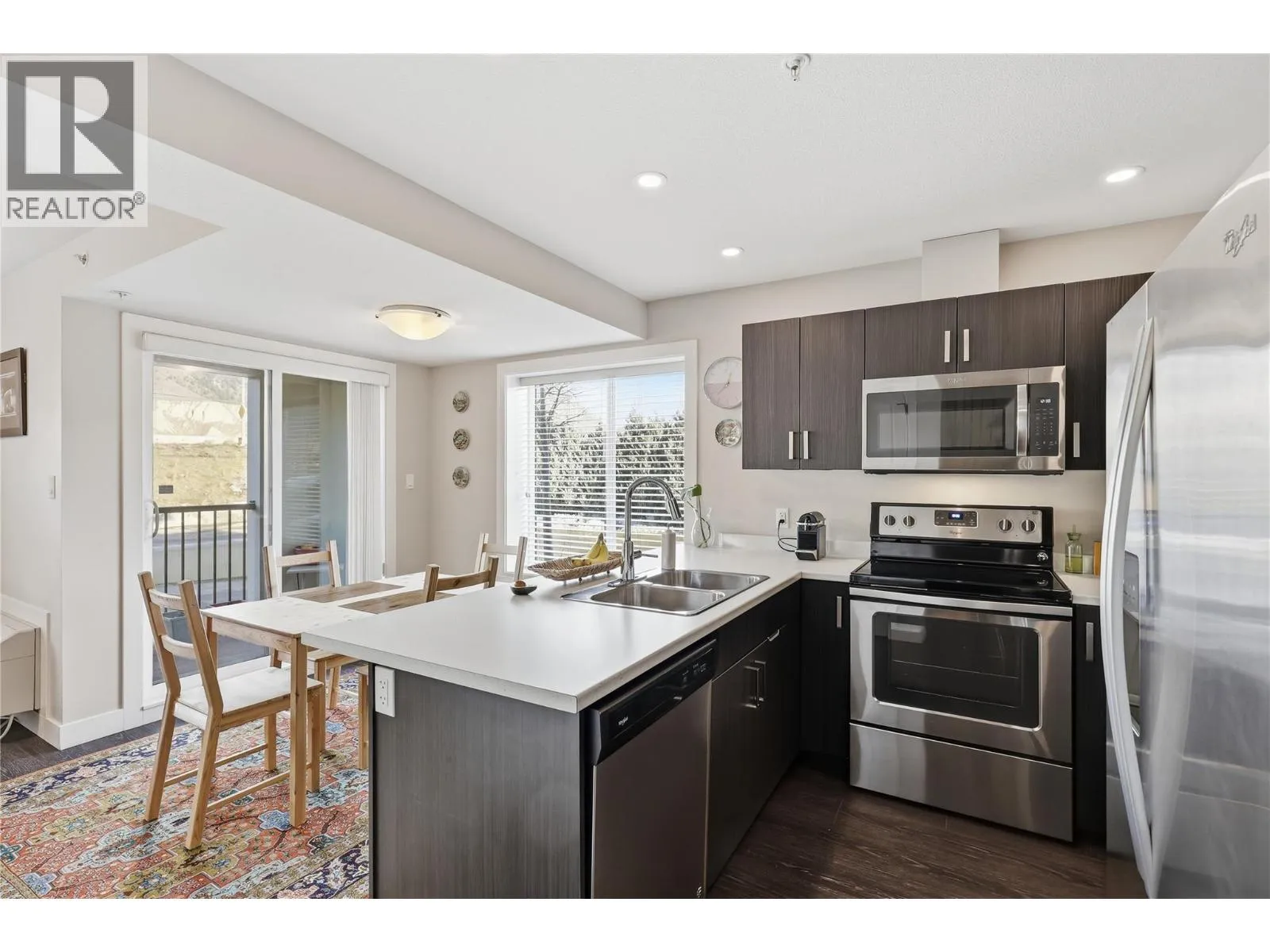 Unique 2 Level Corner Unit Condo with an open concept floor plan and main floor entry is New to the market. Built in 2017 with over 1,000 sqft across 2 levels. The Upper level has 2 oversized bedrooms each have large walk-in closets, a den, and a full 4-piece bathroom with linen closet. Main Floor Living with in Unit laundry that is tucked away in its own dedicated room for added quiet and convenience, a 2-piece bath, and deep under-stairs storage enhance the thoughtful layout. The kitchen boasts stainless steel appliances, plenty of storage, an eat-up bar, and opens to a dining area with direct access to a private patio ideal for relaxing or entertaining. The home has been meticulously maintained, is move-in-ready and offers a perfect blend of space and convenience. Featuring an extra side window making the space bright and perfect for daily living. Extra features include a dedicated parking stall located right outside your door, offering quick access that is quiet and private. Enjoy secure building access, u/g parking, and on-site amenities including a recreation/gym area, grocery store, and shops. The complex is next to a gas station with quick access to the HWY and only 12 min to downtown. It is within walking distance to a pub, golf course, and close to hiking trails. Pets and rentals are allowed, making this an excellent option for owners or investors. Quick possession available! Are you ready to seize the opportunity to own this rare corner unit? Book your showing today! (id:27476)