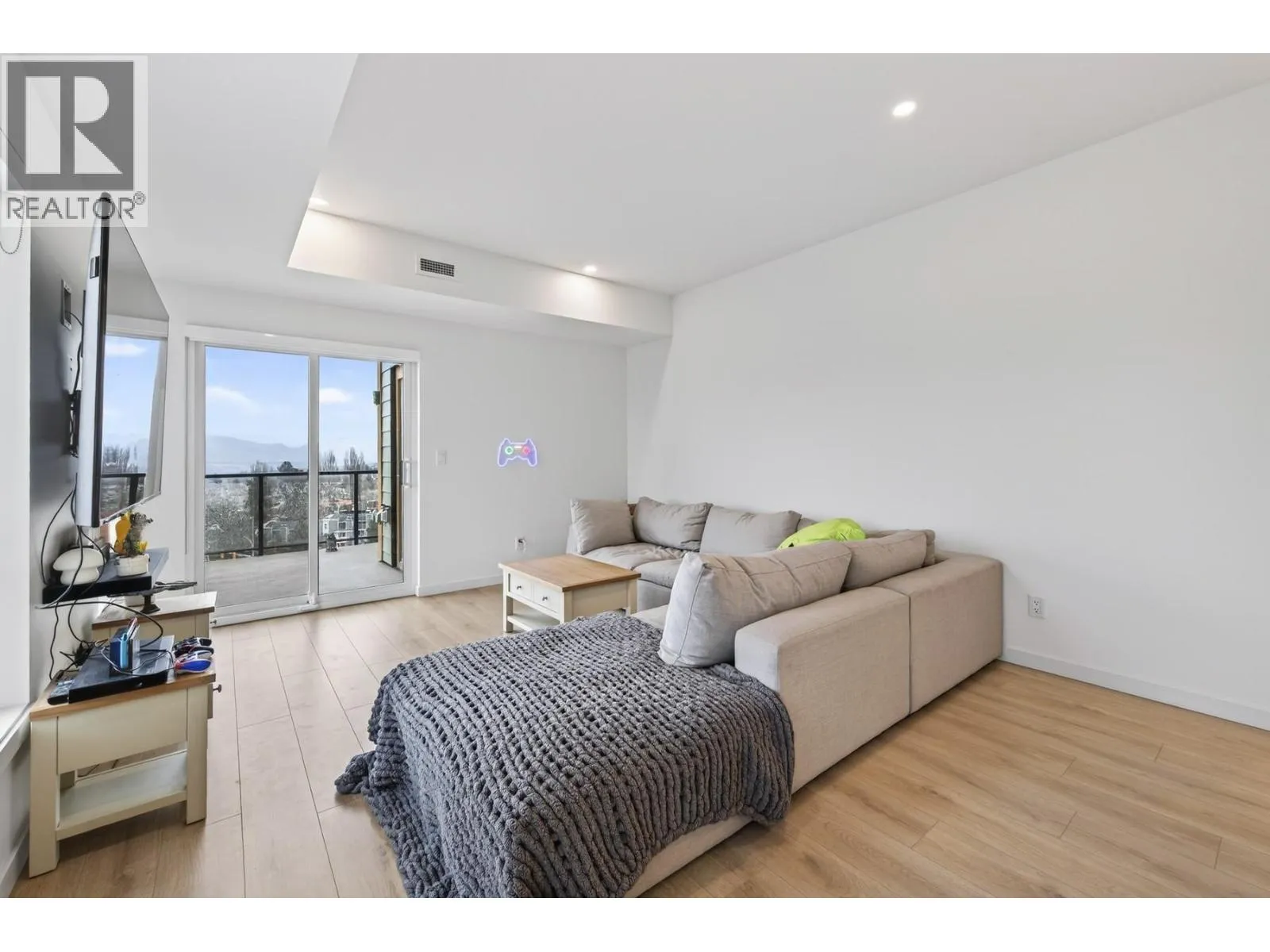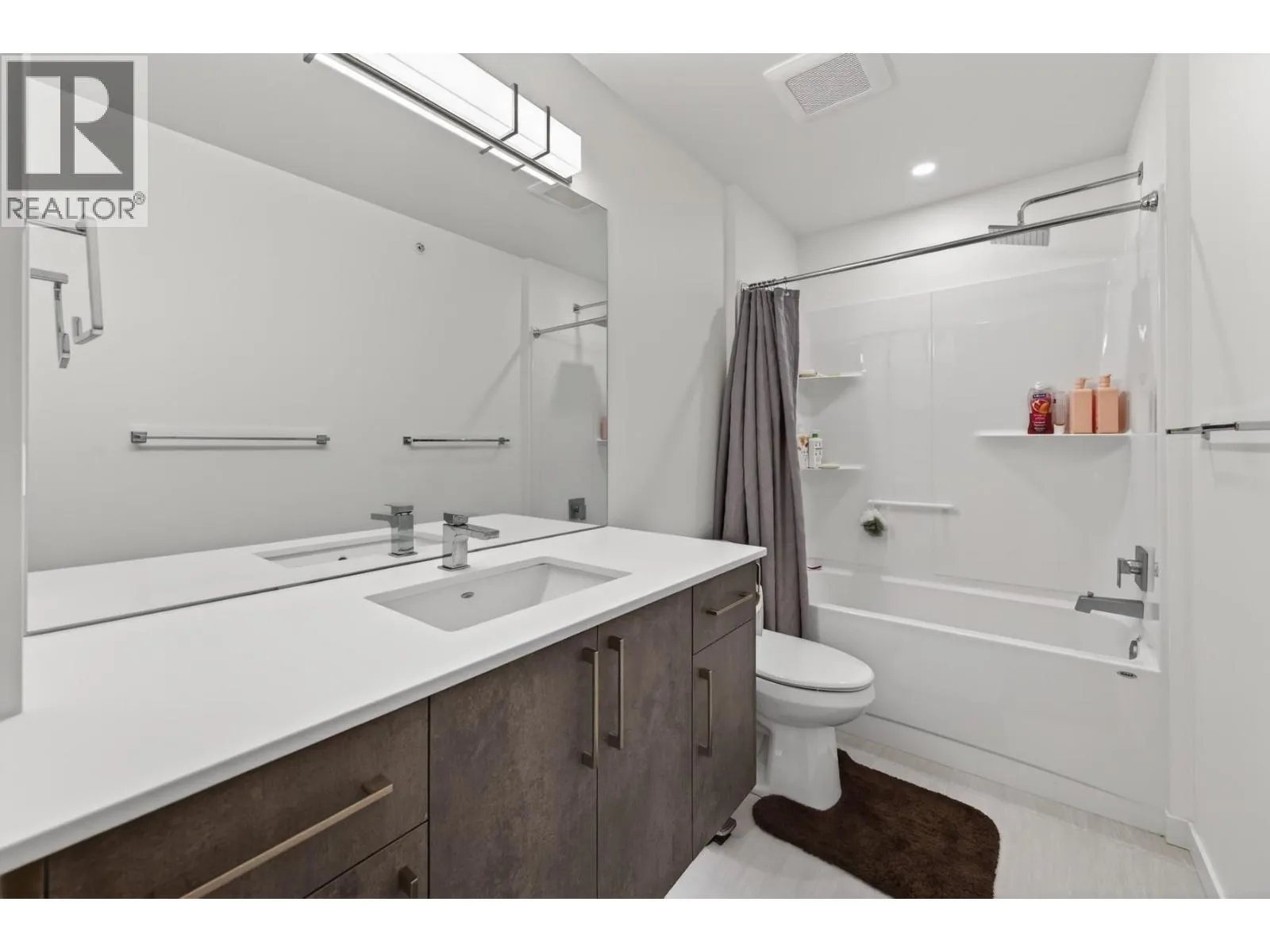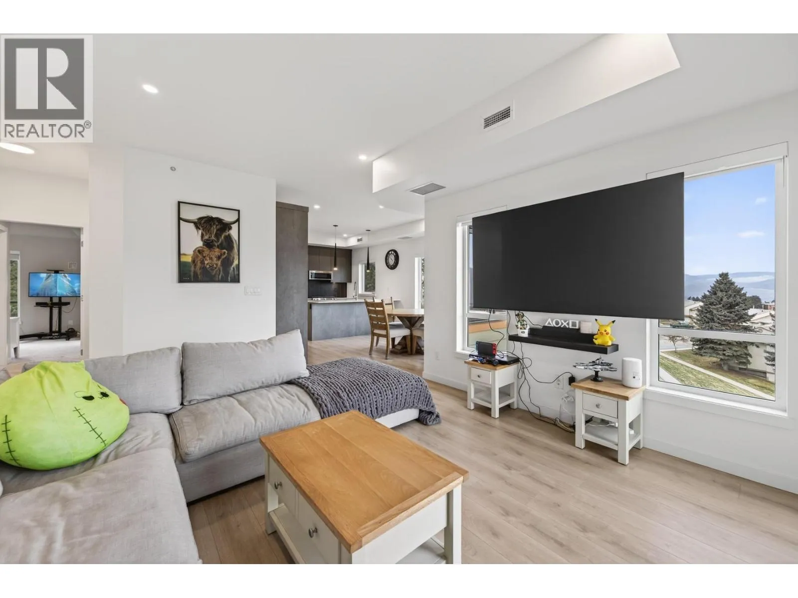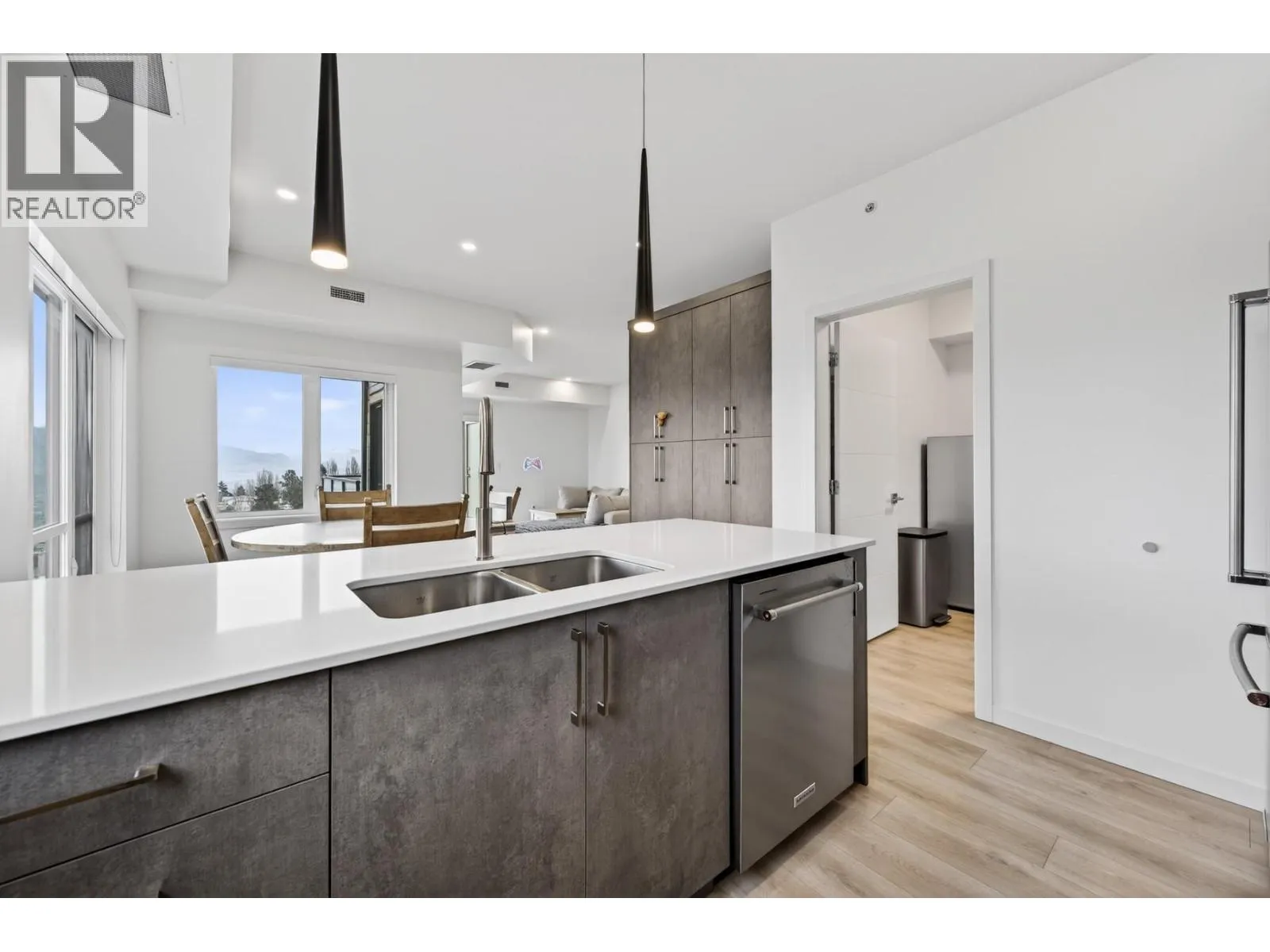 Located in the newest building within Summit Pointe, this top-floor corner unit offers spectacular sunsets and a peaceful outlook with plenty of natural light. Quality finishing throughout includes laminate flooring, window coverings, in-suite laundry, and a bright open-concept layout. The living room flows to a sundeck with glass railings, while the kitchen impresses with quartz countertops, under-cabinet lighting, and KitchenAid stainless steel appliances including a 5-burner gas range. The dining area is surrounded by windows, making the space feel airy and inviting. The primary bedroom features deck access overlooking the park-like setting behind the building, plus a 4pc ensuite with quartz counters and tiled flooring, and a large closet with custom shelving. A 2pc powder room and a second bedroom/den (no closet) complete the layout, ideal for a home office or guest space with views of the back green space. Stay comfortable year-round with a gas furnace and central A/C. Includes 1 underground parking stall (#48) and secure storage locker (#48). Summit Pointe amenities include a state-of-the-art gym, car wash, and welcoming foyer. This is a rare top-floor corner unit. Schedule your private viewing today. (id:27476)