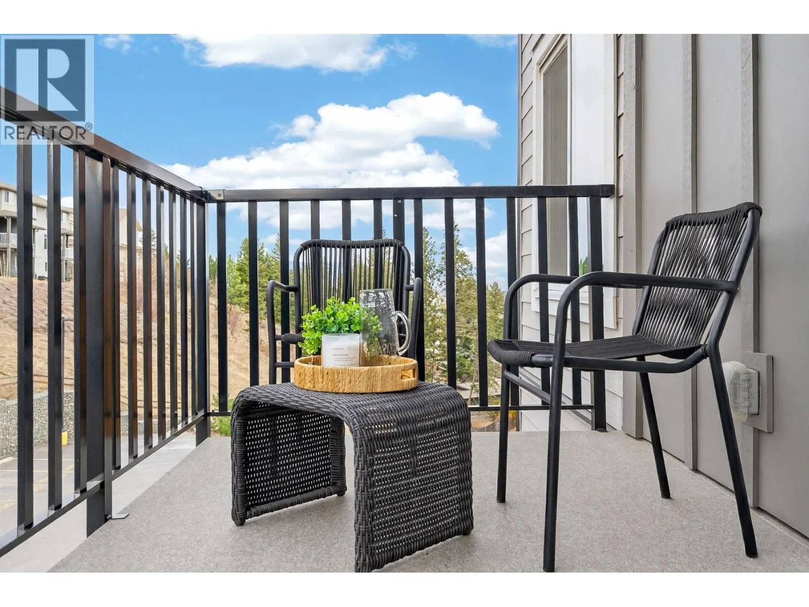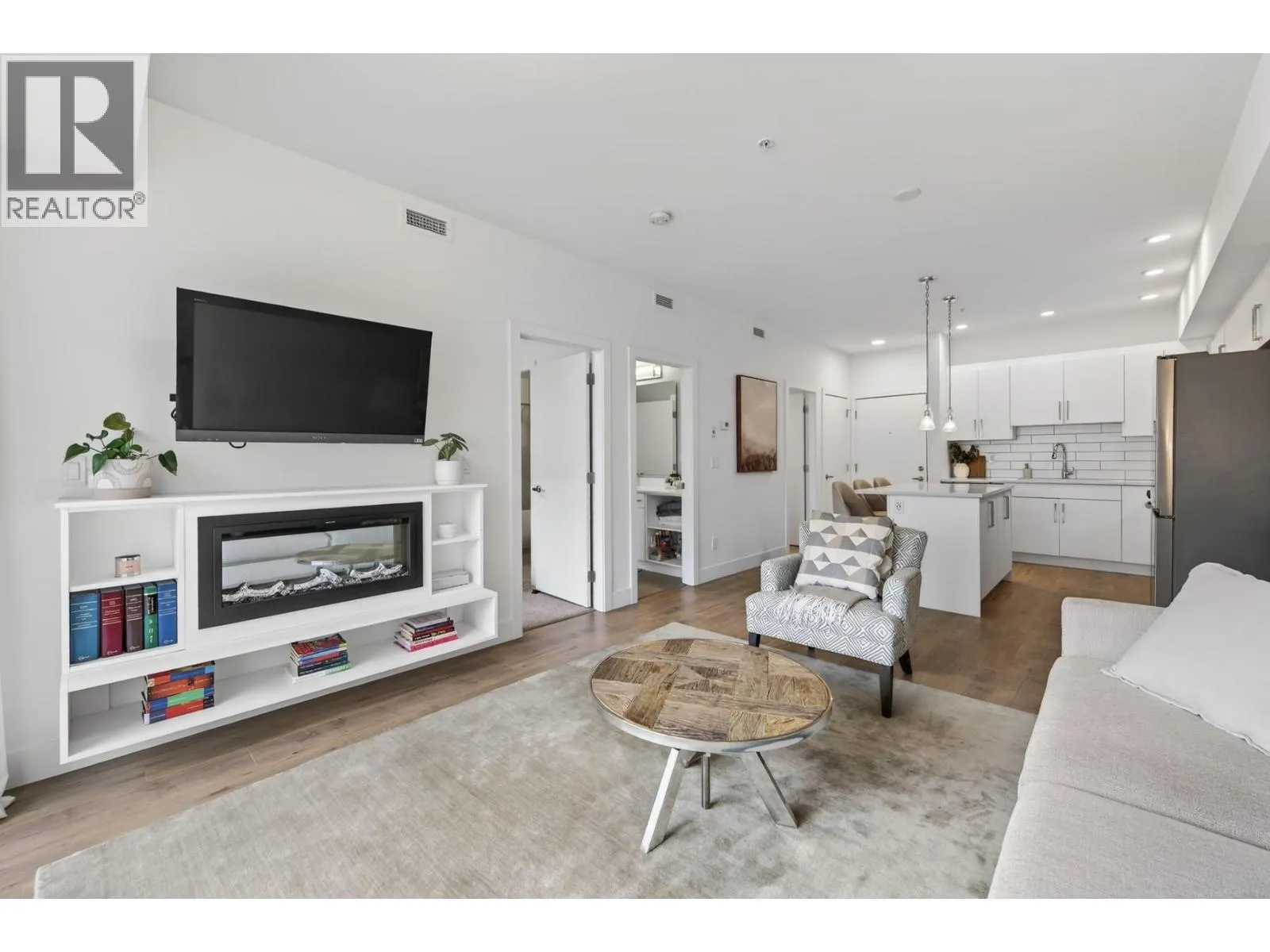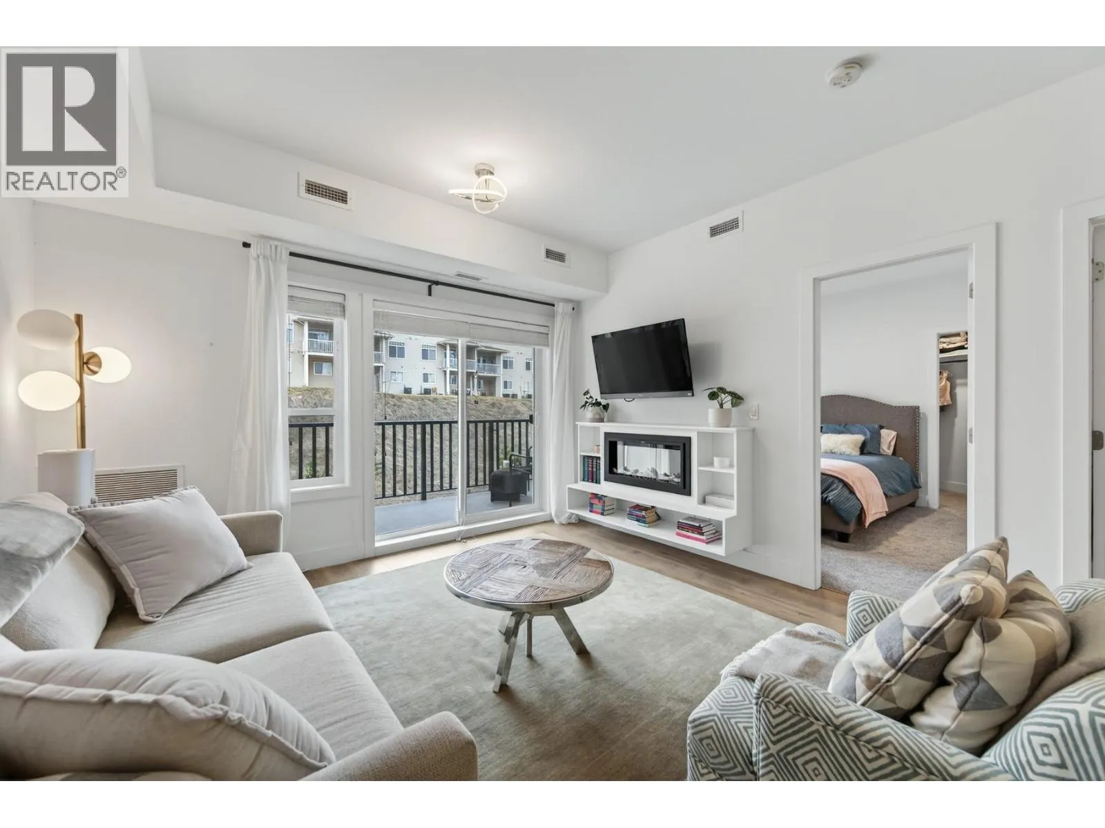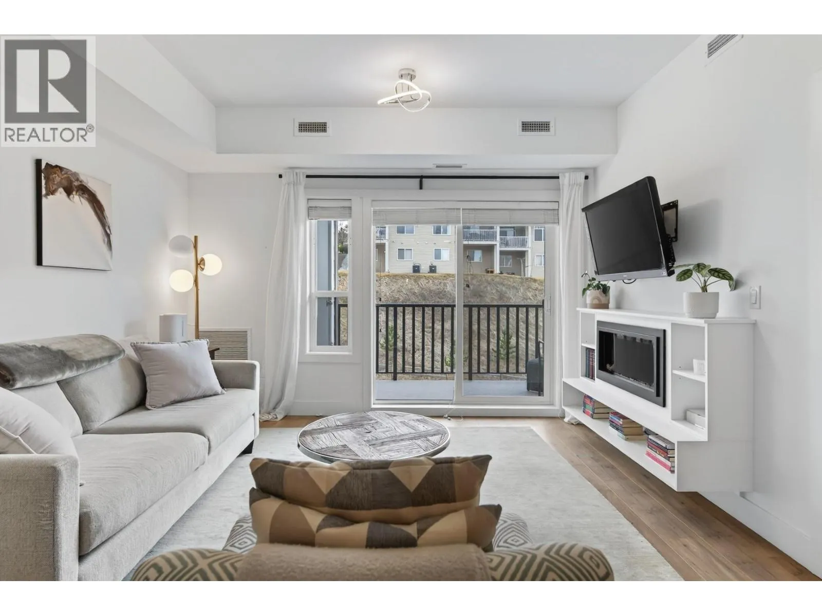 Immaculate 1 bedroom + den unit at The Rise in Sahali. Quietly located yet central to everything Kamloops has to offer, including minutes to TRU, Aberdeen Mall, restaurants, groceries, trails, and quick highway access. The modern kitchen features quartz countertops, a large island, sleek cabinetry, and stainless steel appliances including a gas stove. The open concept living area offers nine-foot ceilings and large sliding glass doors leading to the patio, bringing in perfect afternoon sunshine. Enjoy your outdoor space with a gas BBQ hookup and room for a couple of chairs or potted plants to create a cozy spot to relax. Comfort is key with central heating and A/C, ideal for Kamloops summers. The living room has built in shelving and an electric fireplace. The spacious bedroom includes a walk-in closet and convenient access to the bathroom, which features quartz counters, a generous vanity, and great storage. This unit also includes its own in-suite laundry and a versatile den that works perfectly as a home office, study space, or extra storage. Includes 1 secure underground parking stall and storage locker. Move-in ready with flexible completion available. An ideal low maintenance home for students, young professionals, first-time buyers, downsizers, or investors with a low strata fee of $239. (id:27476)