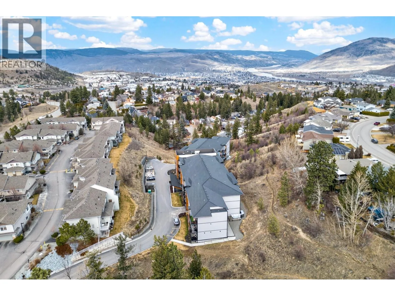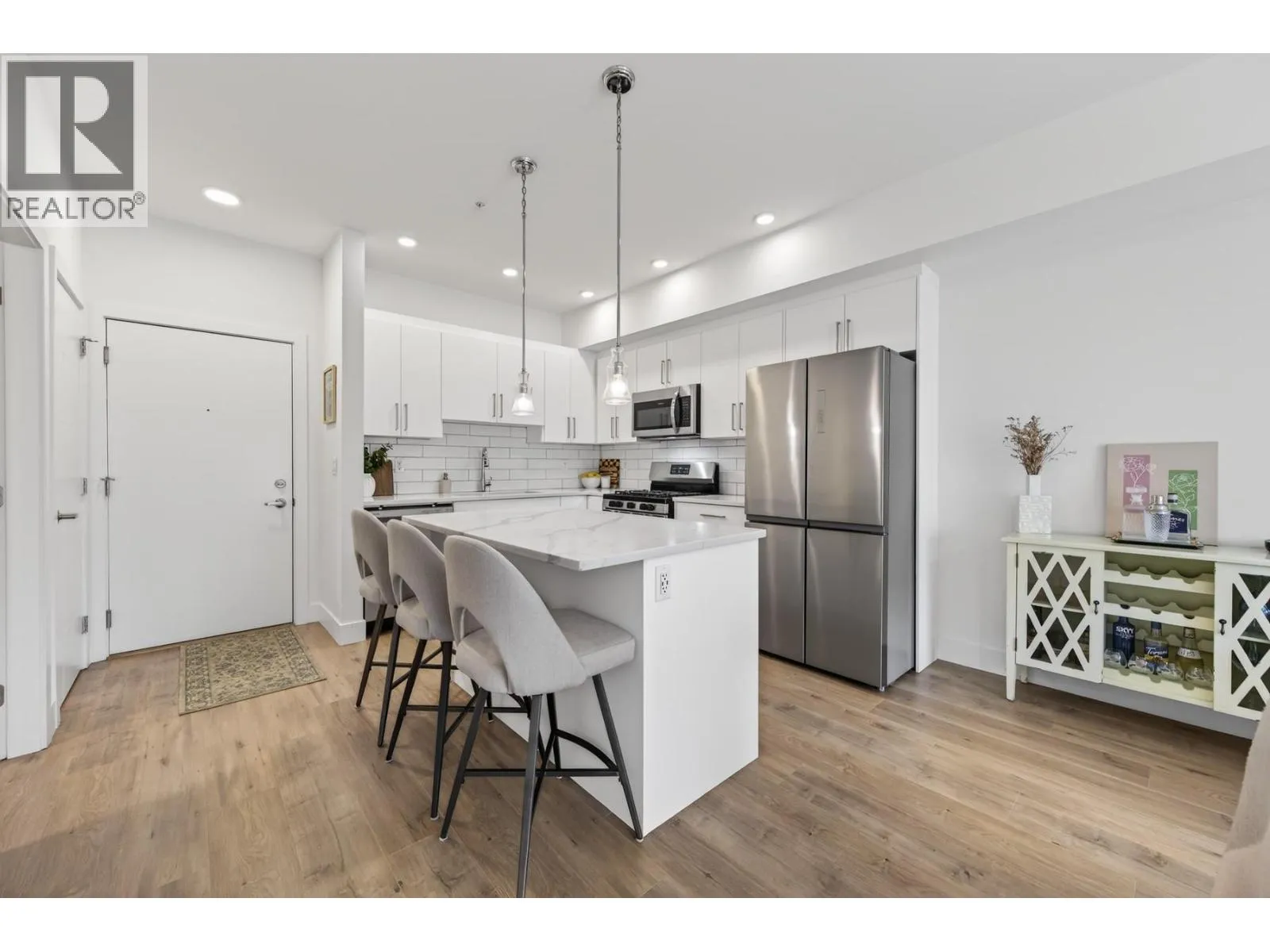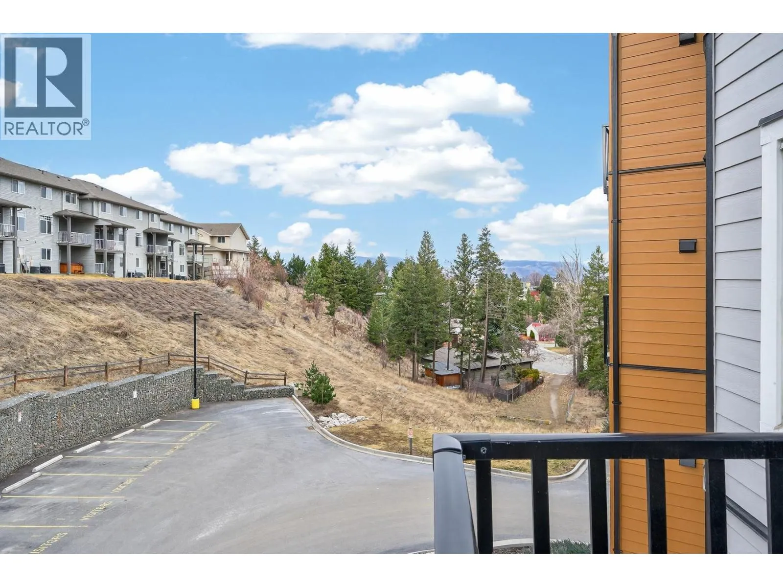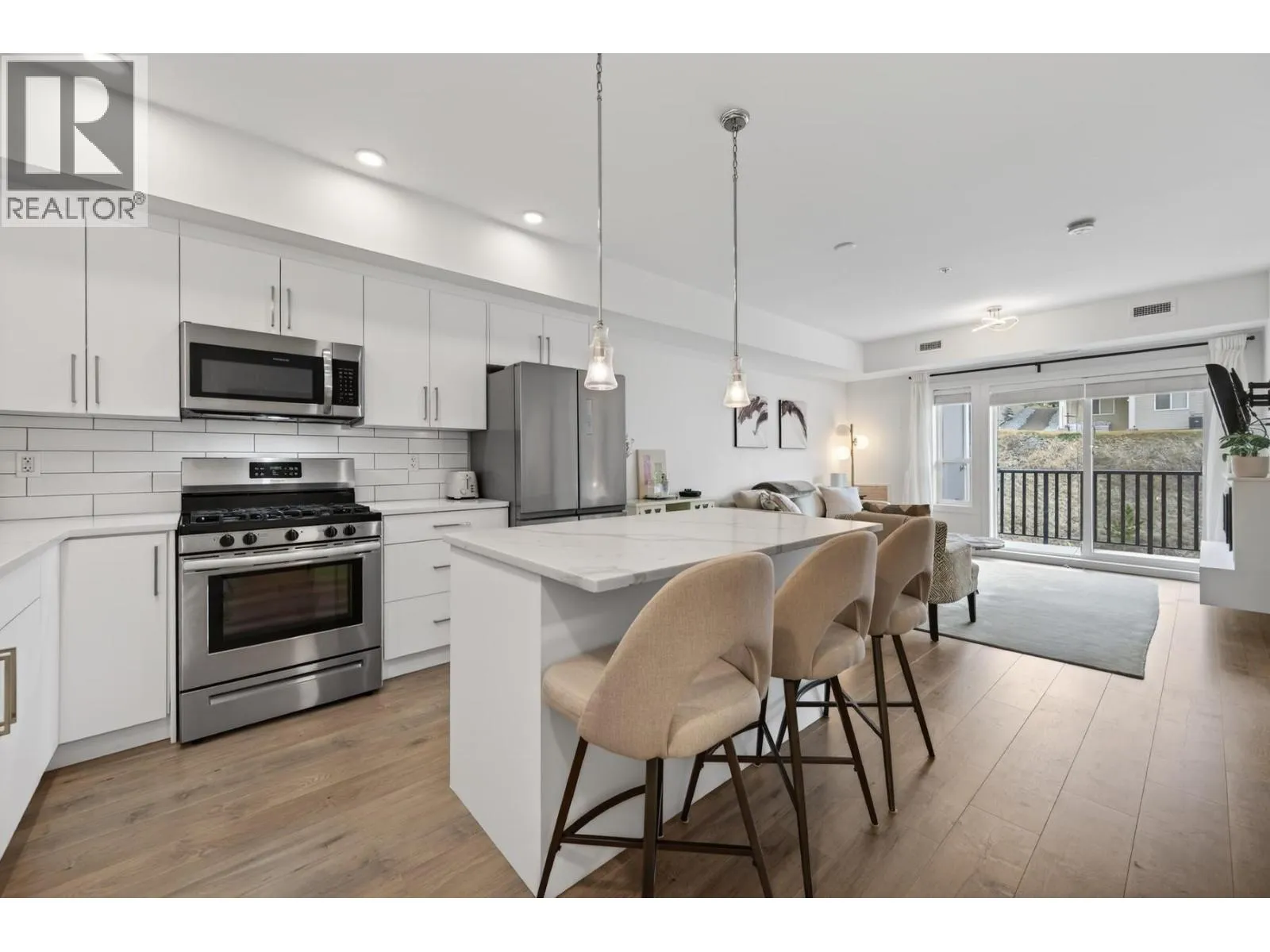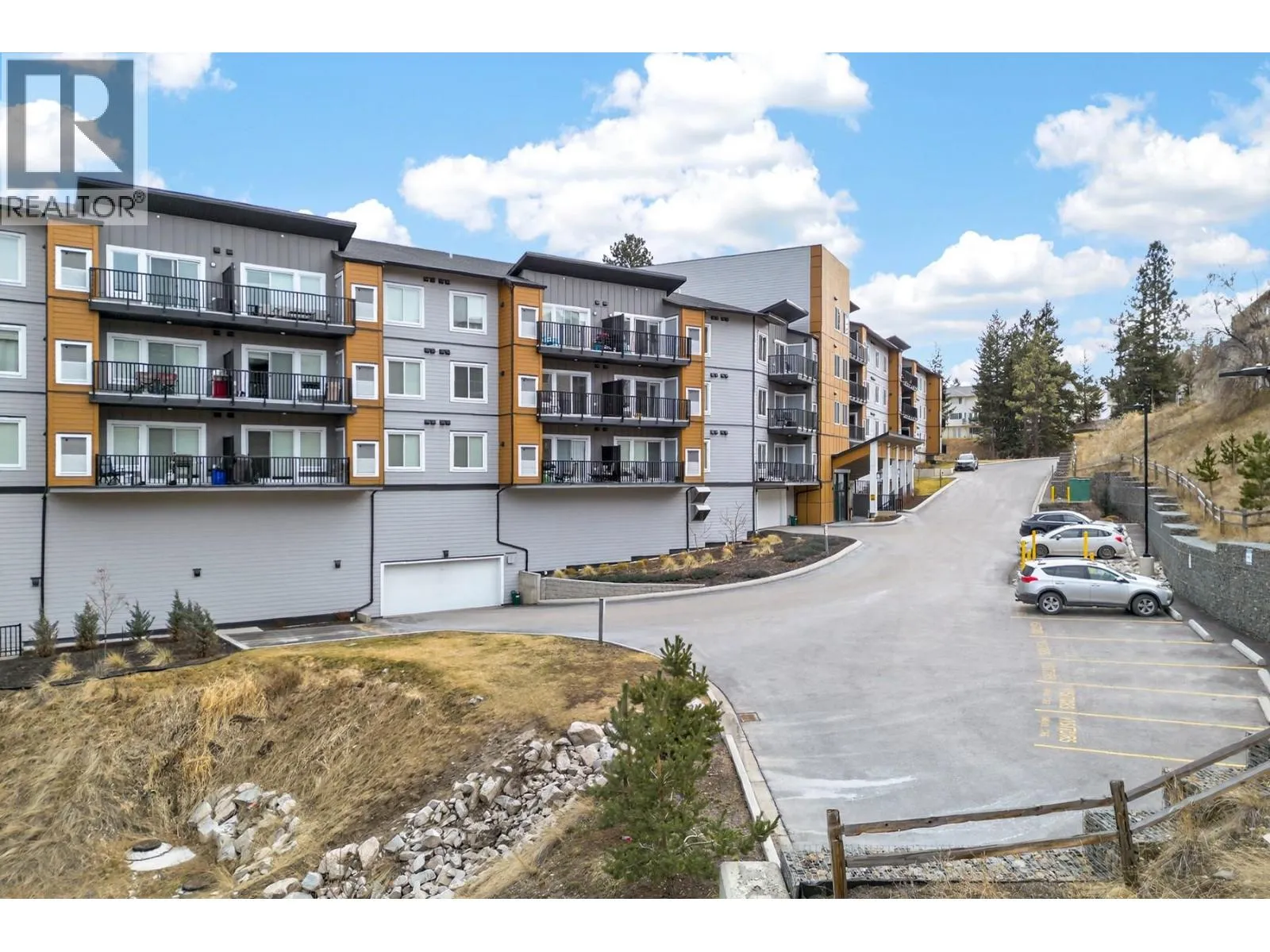 Immaculate 1 bedroom + den unit at The Rise in Sahali. Quietly located yet central to everything Kamloops has to offer, including minutes to TRU, Aberdeen Mall, restaurants, groceries, trails, and quick highway access. The modern kitchen features quartz countertops, a large island, sleek cabinetry, and stainless steel appliances including a gas stove. The open concept living area offers nine-foot ceilings and large sliding glass doors leading to the patio, bringing in perfect afternoon sunshine. Enjoy your outdoor space with a gas BBQ hookup and room for a couple of chairs or potted plants to create a cozy spot to relax. Comfort is key with central heating and A/C, ideal for Kamloops summers. The living room has built in shelving and an electric fireplace. The spacious bedroom includes a walk-in closet and convenient access to the bathroom, which features quartz counters, a generous vanity, and great storage. This unit also includes its own in-suite laundry and a versatile den that works perfectly as a home office, study space, or extra storage. Includes 1 secure underground parking stall and storage locker. Move-in ready with flexible completion available. An ideal low maintenance home for students, young professionals, first-time buyers, downsizers, or investors with a low strata fee of $239. (id:27476)