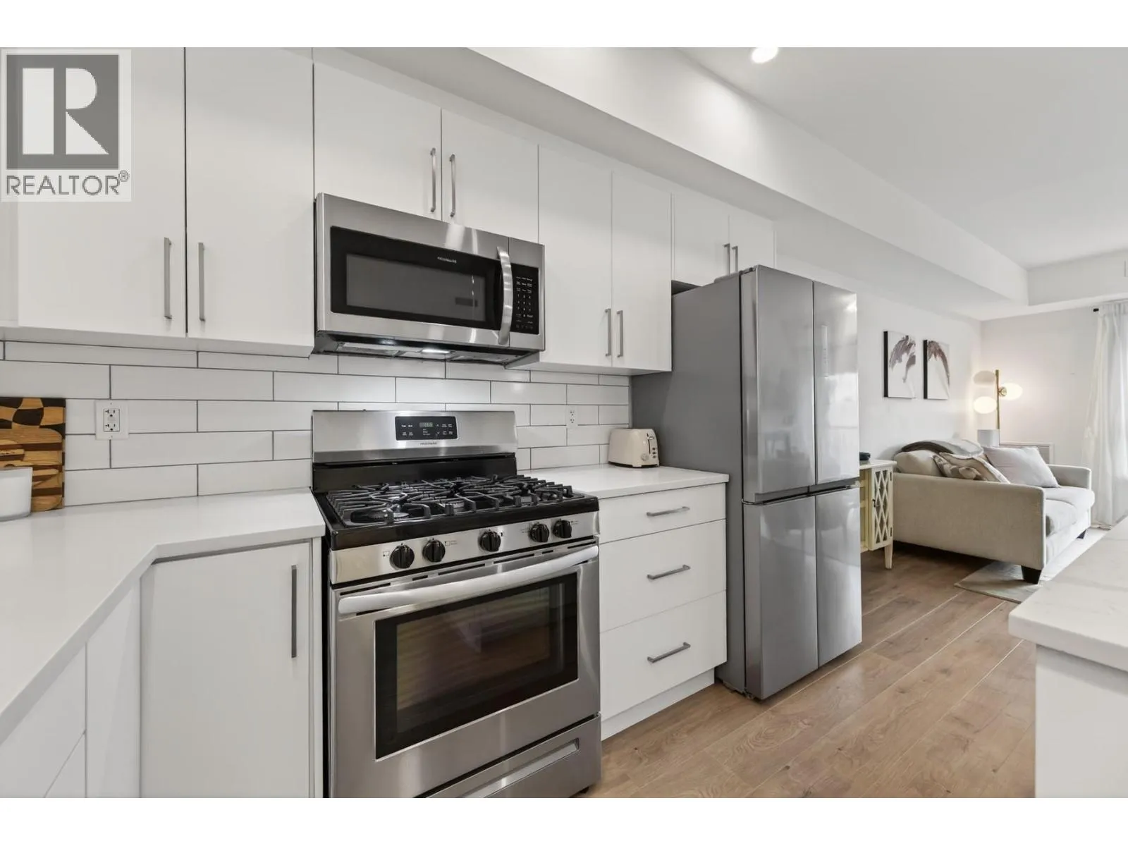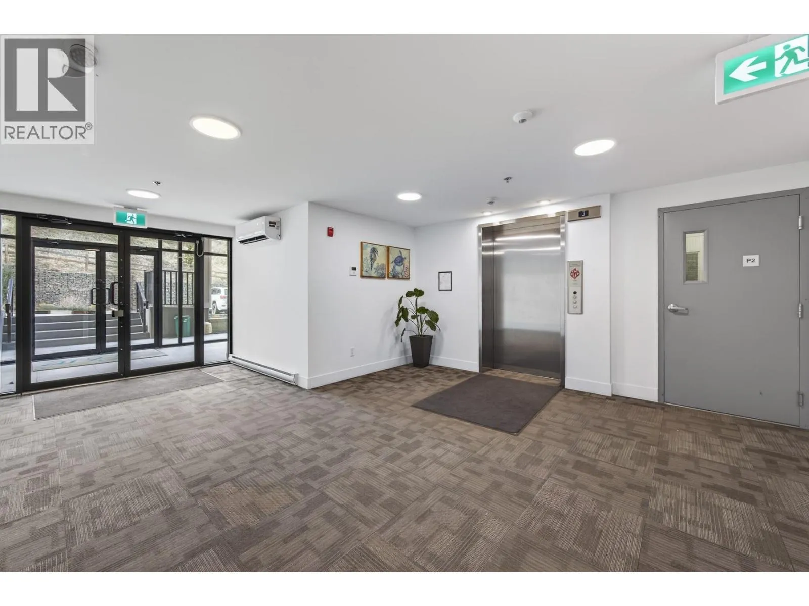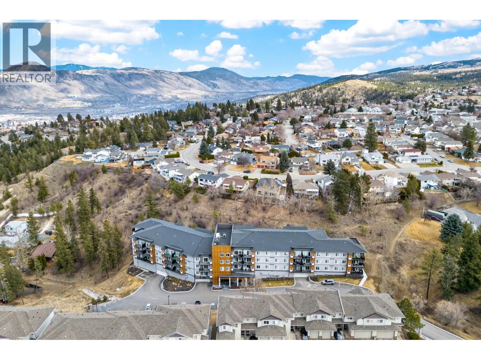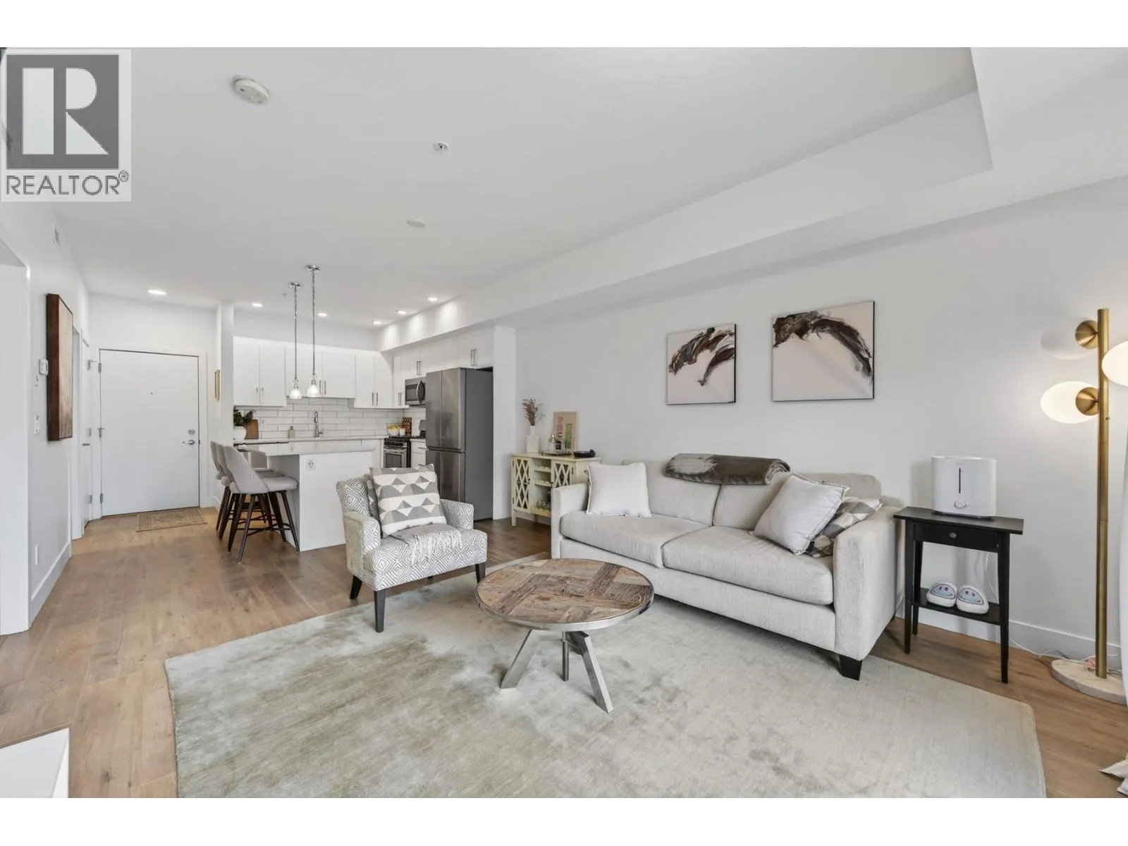 Immaculate 1 bedroom + den unit at The Rise in Sahali. Quietly located yet central to everything Kamloops has to offer, including minutes to TRU, Aberdeen Mall, restaurants, groceries, trails, and quick highway access. The modern kitchen features quartz countertops, a large island, sleek cabinetry, and stainless steel appliances including a gas stove. The open concept living area offers nine-foot ceilings and large sliding glass doors leading to the patio, bringing in perfect afternoon sunshine. Enjoy your outdoor space with a gas BBQ hookup and room for a couple of chairs or potted plants to create a cozy spot to relax. Comfort is key with central heating and A/C, ideal for Kamloops summers. The living room has built in shelving and an electric fireplace. The spacious bedroom includes a walk-in closet and convenient access to the bathroom, which features quartz counters, a generous vanity, and great storage. This unit also includes its own in-suite laundry and a versatile den that works perfectly as a home office, study space, or extra storage. Includes 1 secure underground parking stall and storage locker. Move-in ready with flexible completion available. An ideal low maintenance home for students, young professionals, first-time buyers, downsizers, or investors with a low strata fee of $239. (id:27476)