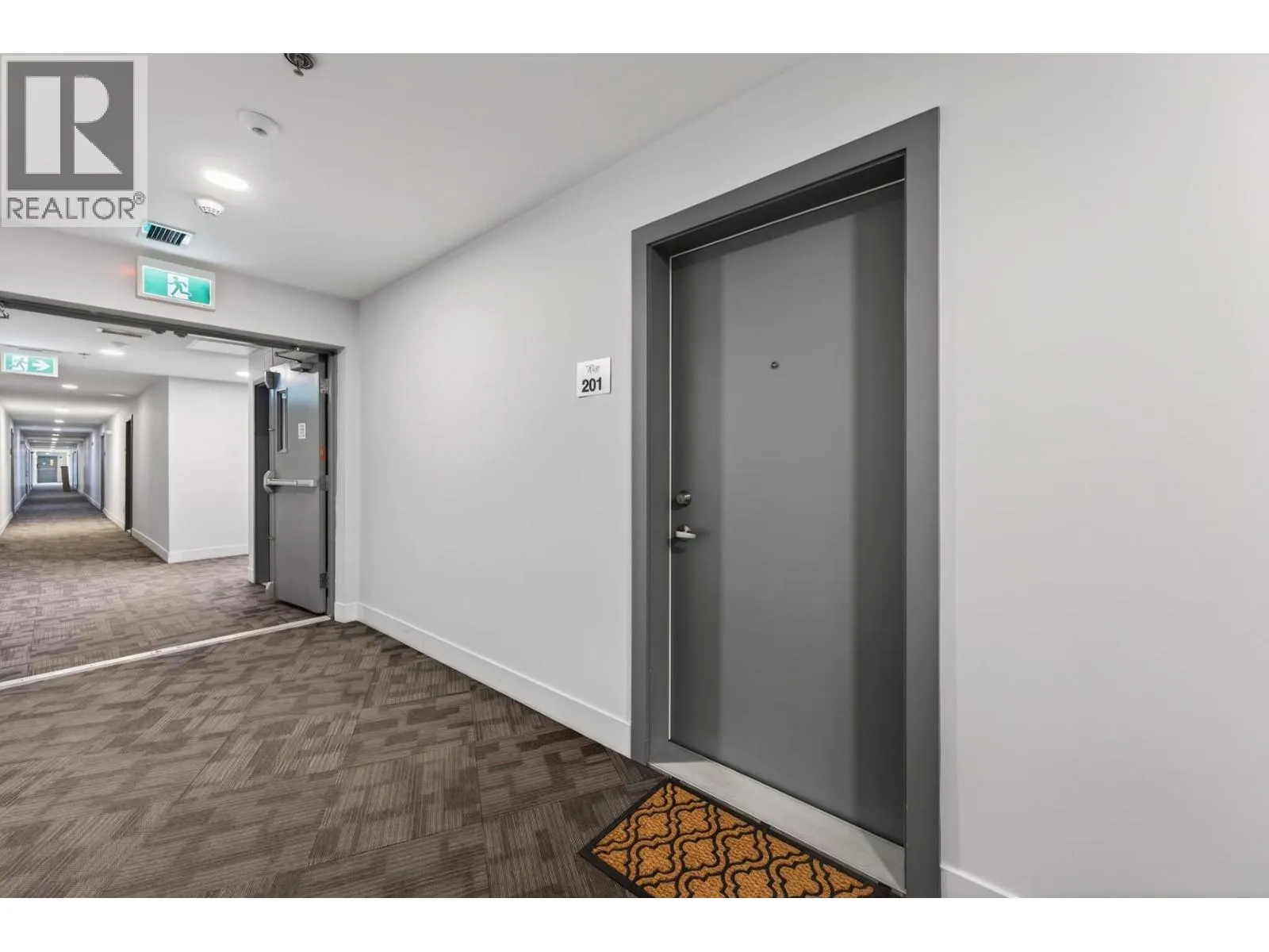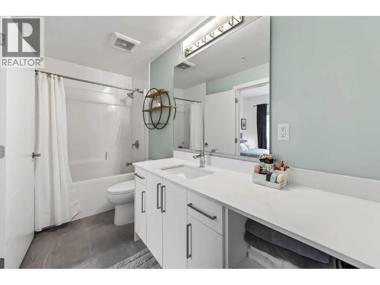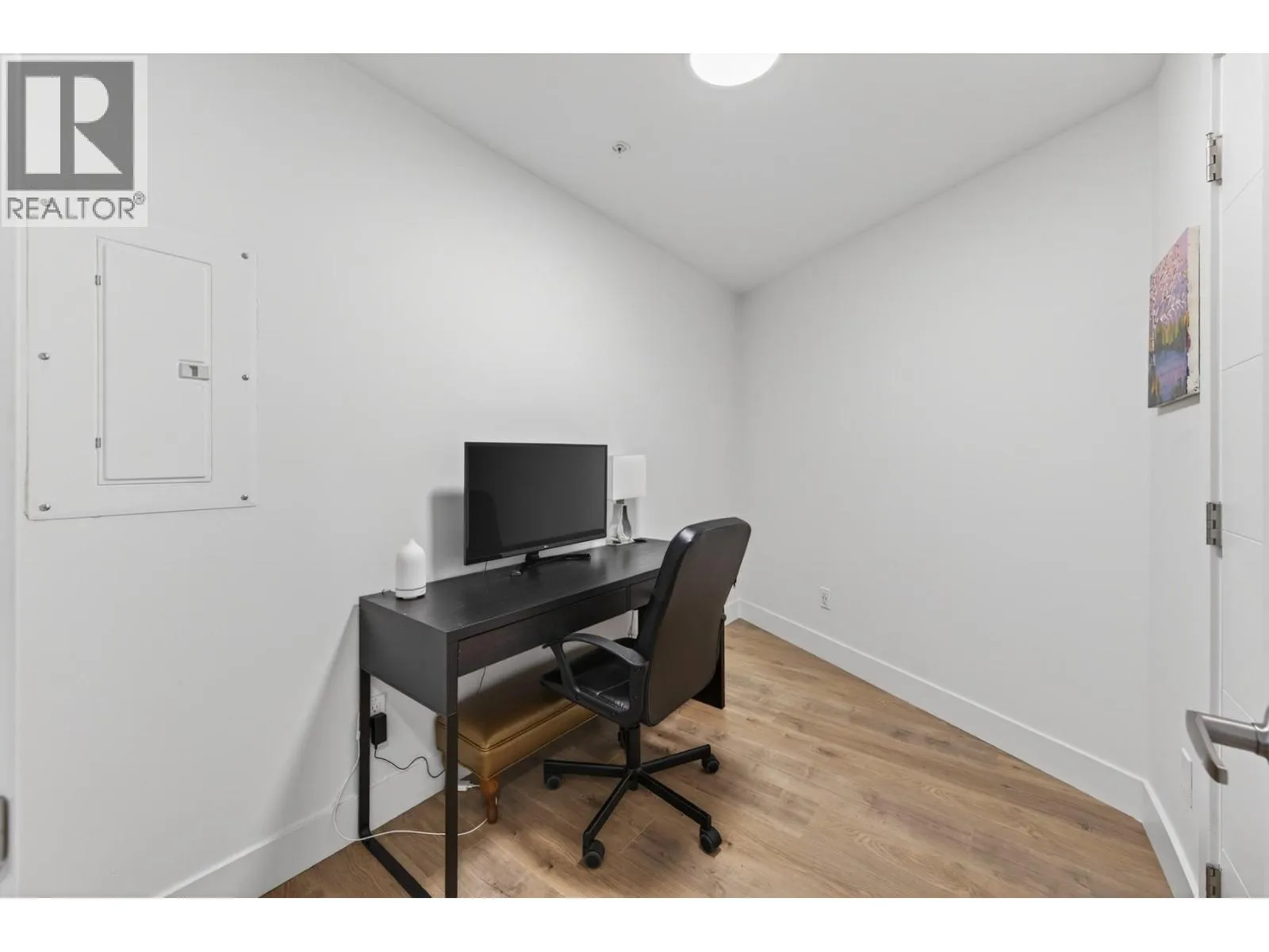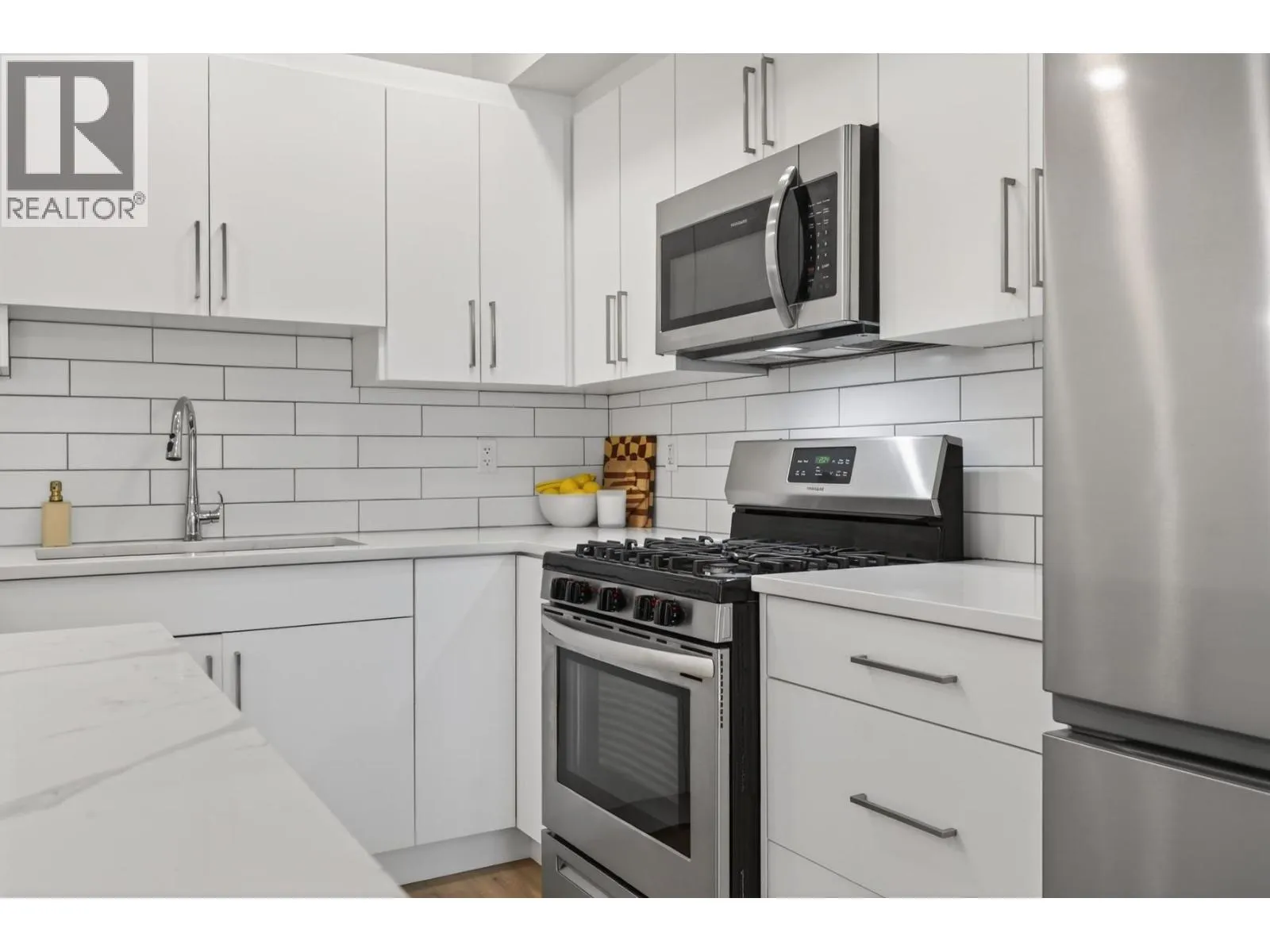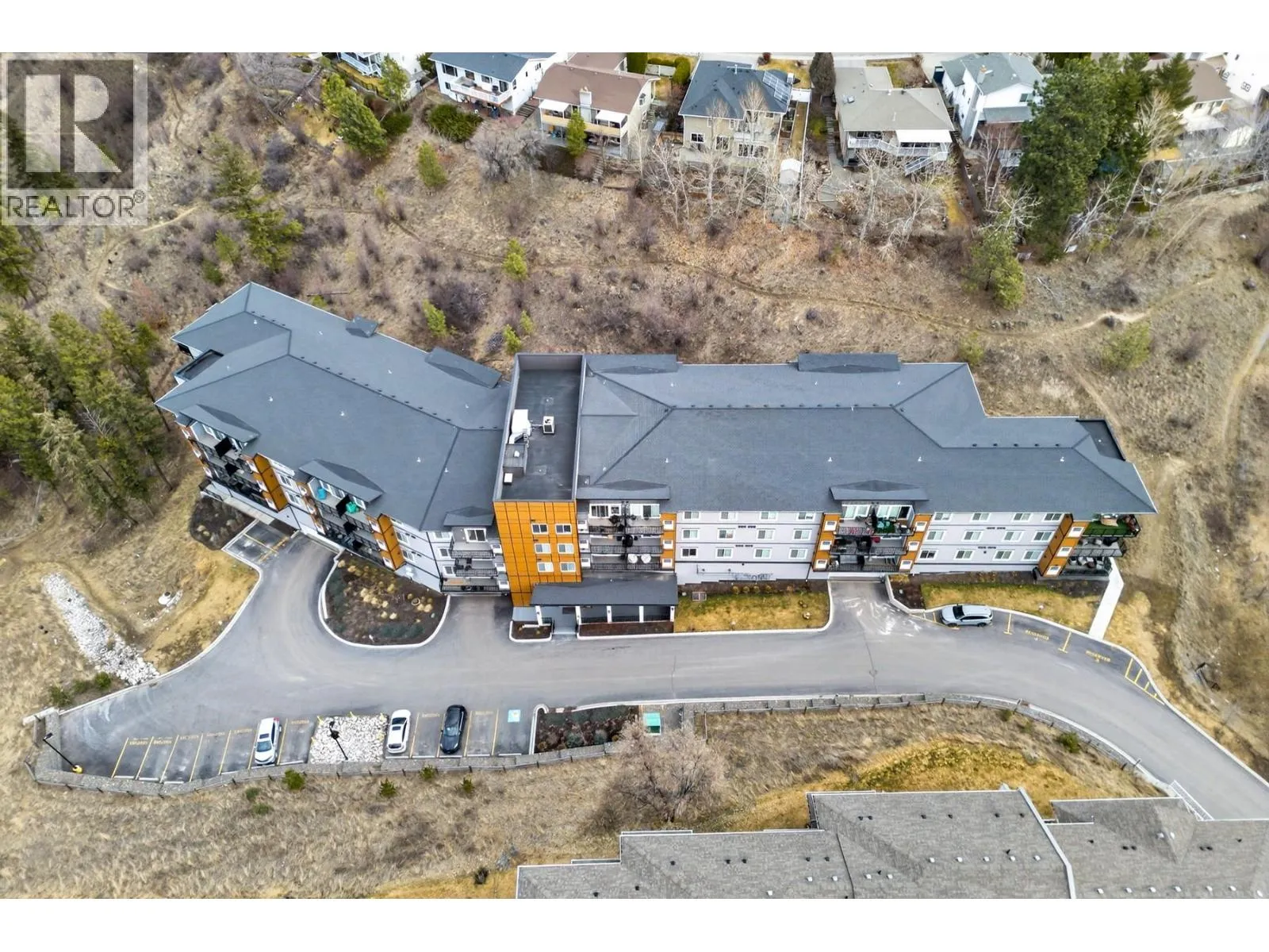Immaculate 1 bedroom + den unit at The Rise in Sahali. Quietly located yet central to everything Kamloops has to offer, including minutes to TRU, Aberdeen Mall, restaurants, groceries, trails, and quick highway access. The modern kitchen features quartz countertops, a large island, sleek cabinetry, and stainless steel appliances including a gas stove. The open concept living area offers nine-foot ceilings and large sliding glass doors leading to the patio, bringing in perfect afternoon sunshine. Enjoy your outdoor space with a gas BBQ hookup and room for a couple of chairs or potted plants to create a cozy spot to relax. Comfort is key with central heating and A/C, ideal for Kamloops summers. The living room has built in shelving and an electric fireplace. The spacious bedroom includes a walk-in closet and convenient access to the bathroom, which features quartz counters, a generous vanity, and great storage. This unit also includes its own in-suite laundry and a versatile den that works perfectly as a home office, study space, or extra storage. Includes 1 secure underground parking stall and storage locker. Move-in ready with flexible completion available. An ideal low maintenance home for students, young professionals, first-time buyers, downsizers, or investors with a low strata fee of $239. (id:27476)