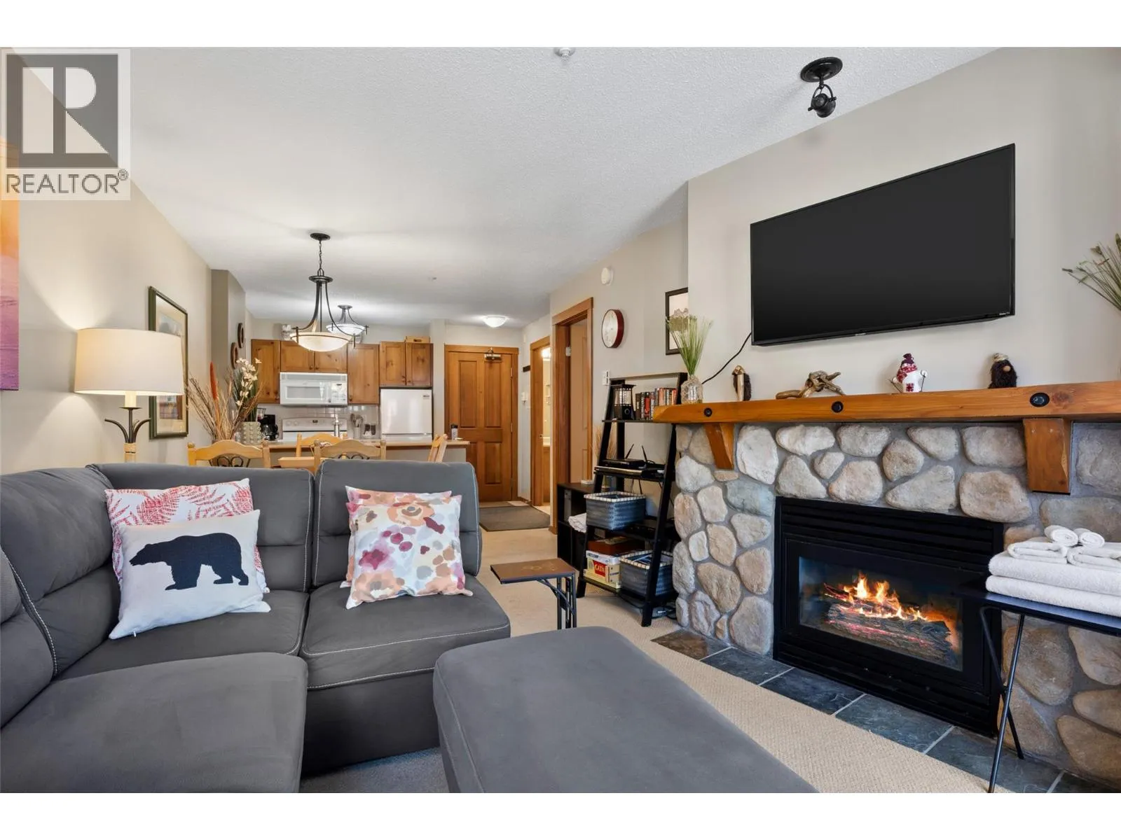 Wake up to panoramic mountain and village views and step onto the slopes within minutes at the sought-after Fireside Lodge in Sun Peaks Resort. This fully furnished second-floor retreat features a full kitchen, rock-faced gas fireplace, and private sundeck overlooking the village, making it just as inviting after a powder day as a summer evening on the bike trails. True ski-in/ski-out access, world-class mountain biking, and four seasons of resort activities make this a year-round escape. In-building amenities include a hot tub, ski/board and bike storage, a coffee shop, restaurant, elevator, and shared laundry, providing everything you need for extended stays in comfort. Just 10 minutes away, Heffley Lake adds boating, fishing, and hiking to your backyard. Unlimited owner use, short-term rental zoning, and the ability to self-manage offer outstanding investment flexibility, while heated underground parking and a turnkey furnished package make the transition to resort living effortless. GST applicable. (id:27476)