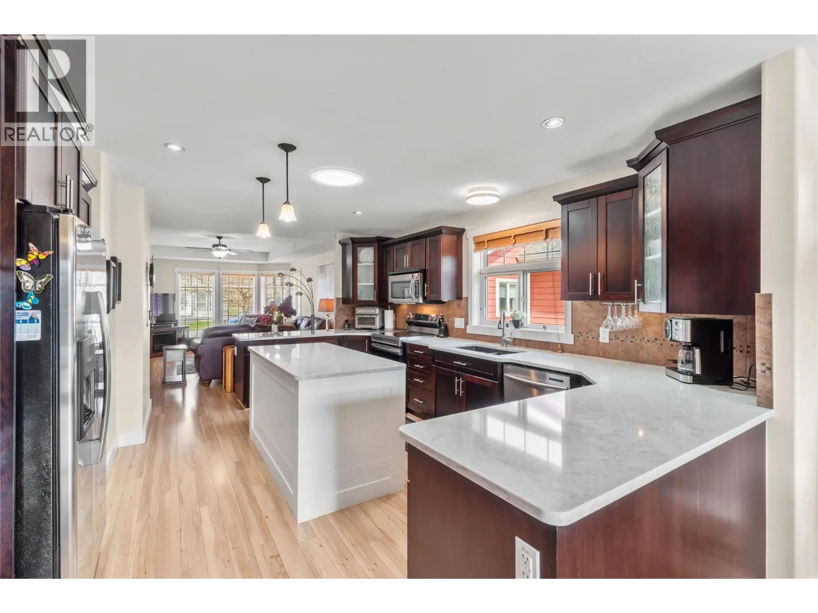 Live in one of Kamloops popular subdivisions minutes to all amenities. This immaculate level entry home has over 1350 sq.ft. on the main + full daylight walkout basement. Designed as the original show home with tons of upgrades and extras included. Bright open design with hardwood and tile floors and custom window coverings. Deluxe kitchen boasts spacious island and lots of pantry space. All appliances included plus brand new range. Adjoining elegant dining room opens with patio doors to the large, covered deck. Spacious primary bedroom has private 3-piece ensuite and W/I closet, patio doors open to private deck. Main floor laundry as mud room accesses the double carport. Home comes with convenient up or down laundry. Walk-out basement offers 2 bedrooms, full bath, storage, workshop (could be theatre room) + large rec room leading to patio and fully fenced, beautifully landscaped yard. HE furnace, new HW tank, heat pump, U/G sprinklers and shed. Low bareland strata fees $160 includes water/sewer/garbage. (id:27476)