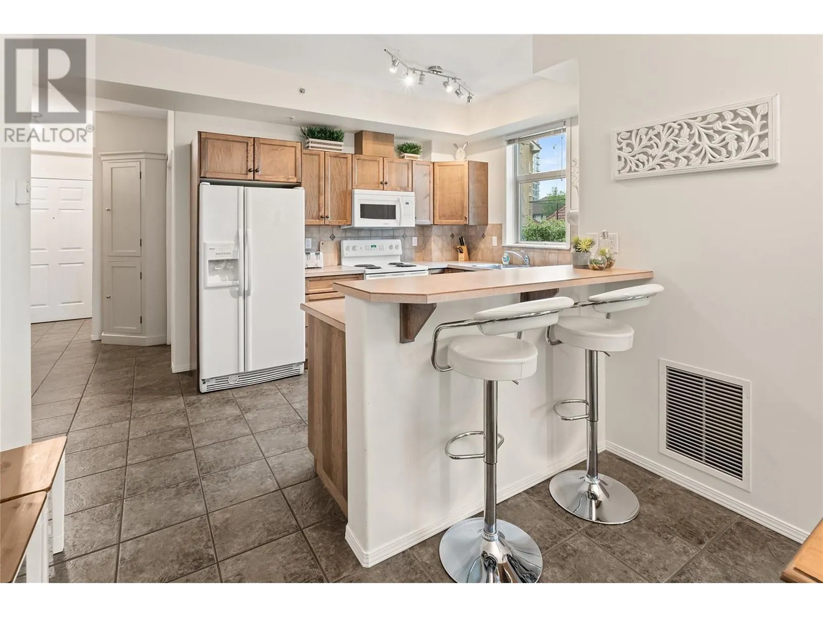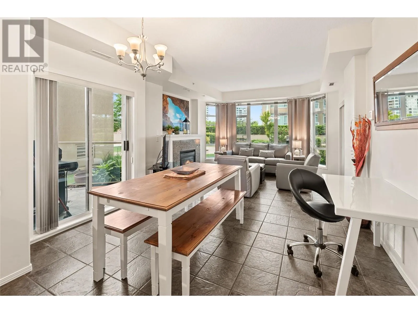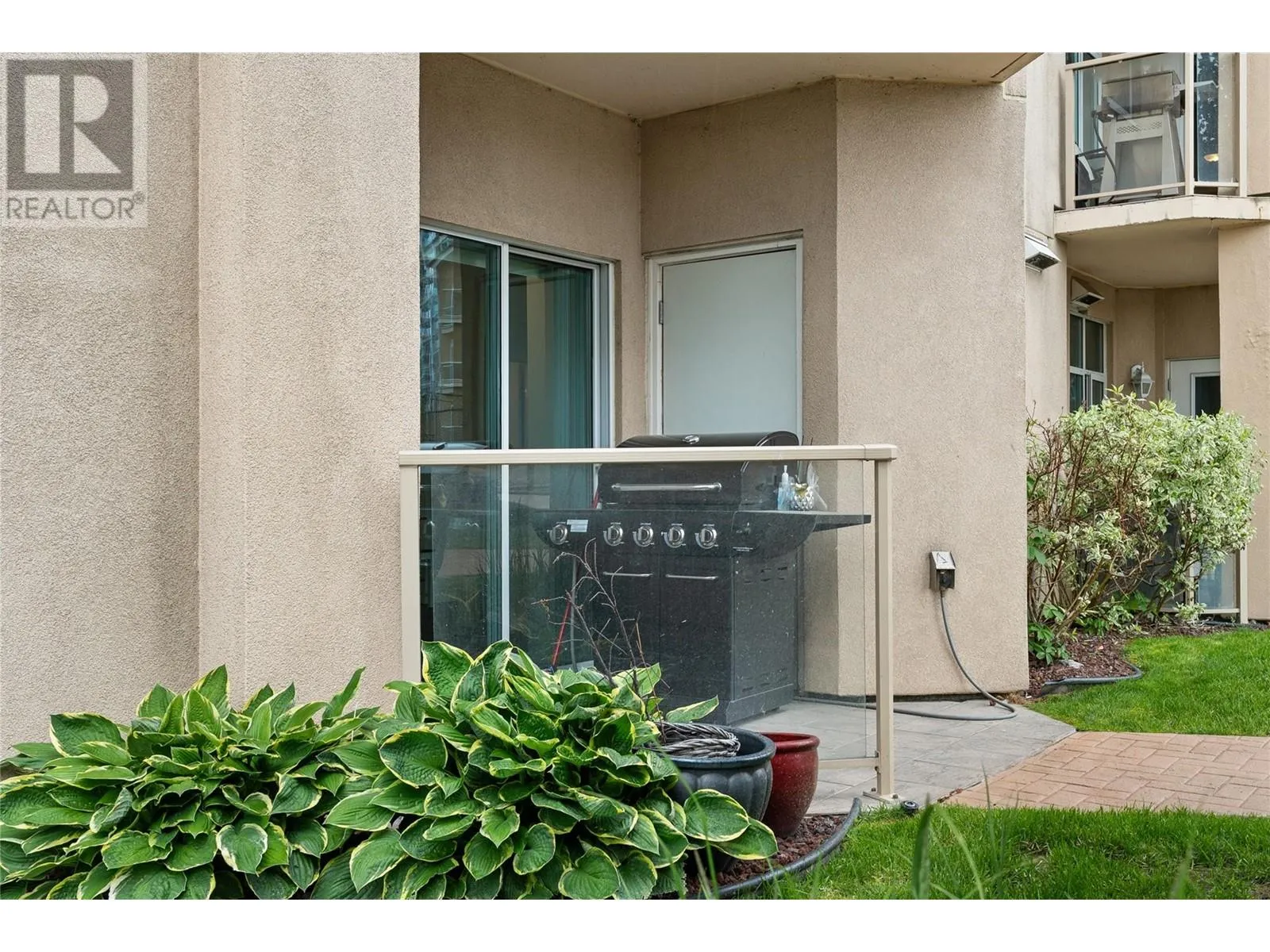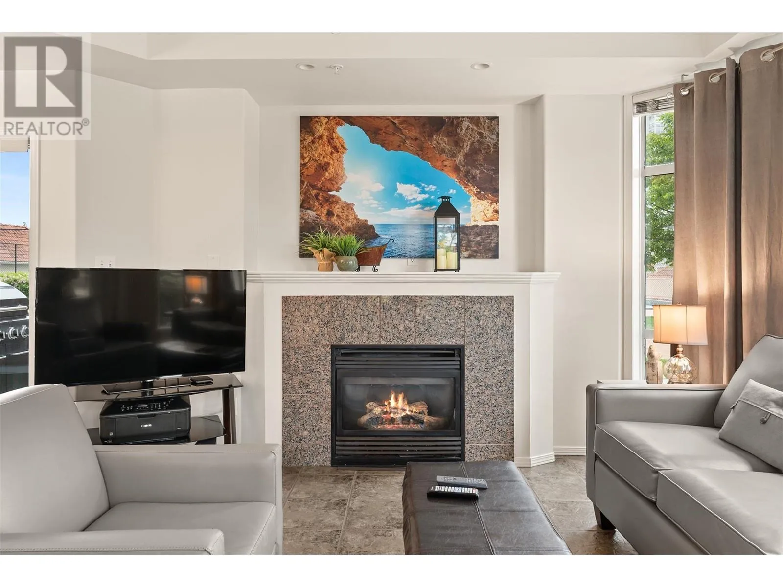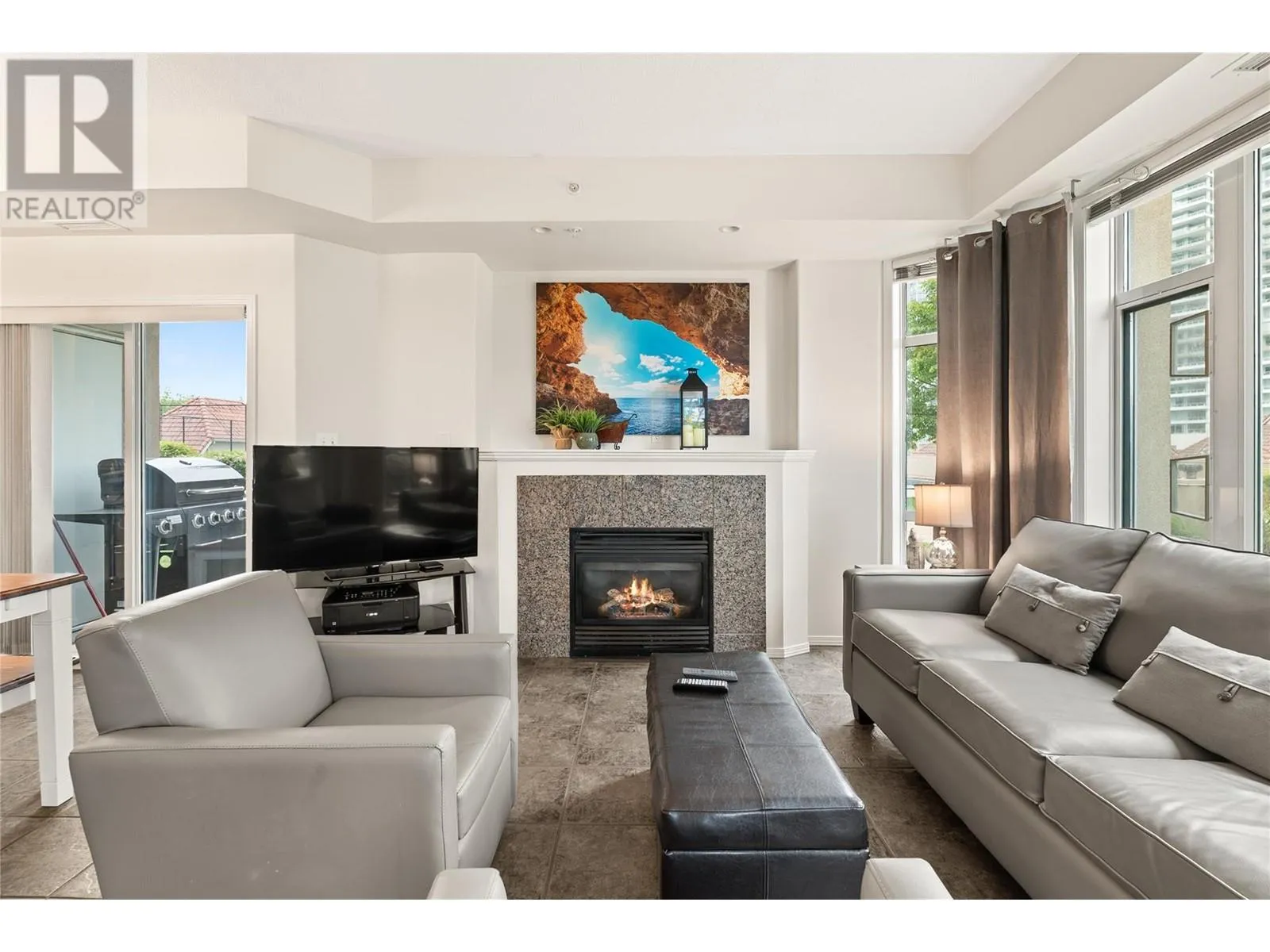 Downtown Waterfront large one bedroom plus den ( large enough for a bed) classy corner ground unit with two patios. Fully furnished and completely turn key including the bbq and outdoor table and chairs! , ready to move in. Walk into this spacious home with its beautiful bright open feeling and gas fireplace with the ability to walk out from your 2 patios onto the grass court yard or access the tennis court or pool.. Very private setting walking onto the grass back yard makes it feel like a house than a condo.. . Open plan with large windows and southern exposure makes for a very bright and cheery suite. Units features gas fireplace, Gas BBQ hookup, large kitchen kitchen bar area, and 3 tv's. Sunset Waterfront Resort features both indoor and out door pools, hot tubs, steam room, fitness center, tennis courts and boat slips. Walking distance to the beach, the restaurants. entertainment, and the beautiful downtown of Kelowna .. Must see !! (id:27476)