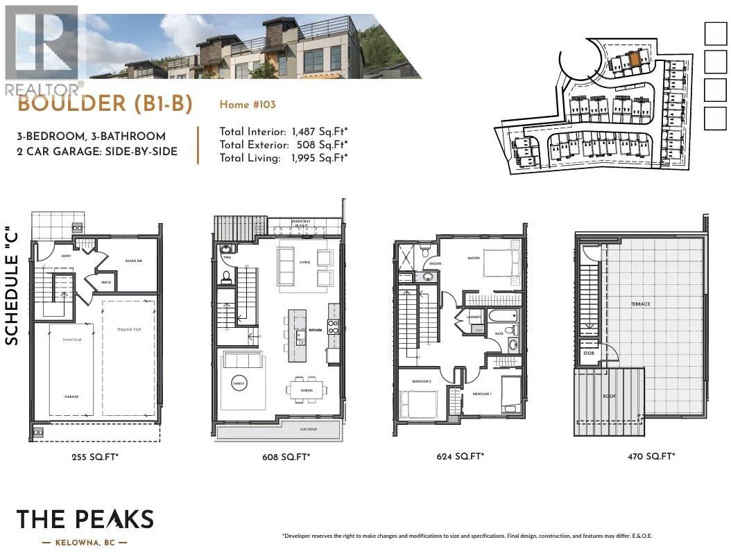 BRAND NEW, MOVE-IN NOW Townhomes at the Peaks in Glenmore. Home #103 is the lowest price remaining home available at the Peaks! #103 is a 3-Bed, 3-Bath townhome, at approx. 1,482 sqft with rooftop patio, double garage & spacious, timeless interiors. Features include vinyl plank flooring throughout the main level, energy-efficient double-glazed windows & roughed-in station. Main floor includes kitchen, dining, living & bonus family room. The kitchen features a large island, designer cabinets & quartz countertops. KitchenAid stainless steel appliances such as a dual fuel gas stove, counter depth refrigerator & dishwasher. The primary bed includes an ensuite with heated floors, large wall-mounted mirror, modern light bar, designer cabinets, tile flooring, glass shower stall, & quartz countertops. Two additional beds are upstairs with a bath & laundry room. Embrace the outdoors with your private 500+ sqft rooftop patio with sweeping city & valley views, as well as a fully fenced yard. Enjoy instant access to Knox Mountain walking & biking trails! Conveniently located 10 min drive away to the hub of Downtown Kelowna & 5 min drive to amenities. Property Transfer Tax Exempt-savings of $12,898. First time buyers, ask about the new GST rebate for additional savings of $37,245. Only a few 3 & 4 Bed rooftop patio townhomes left, starting from $744,900. Showhome open by appointment. Photos & virtual tour from a similar home. Visit thepeaksliving.ca or call 778-200-5634 for more info. (id:27476)