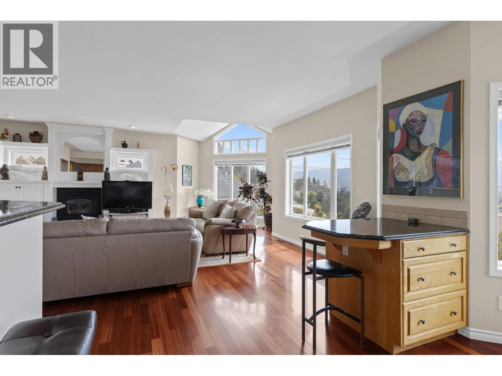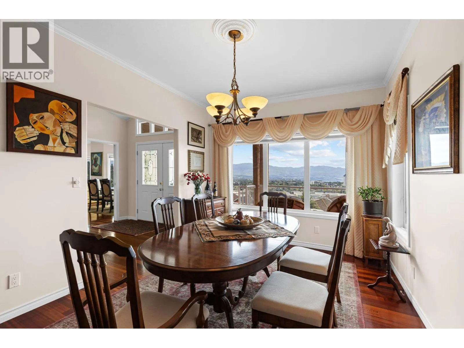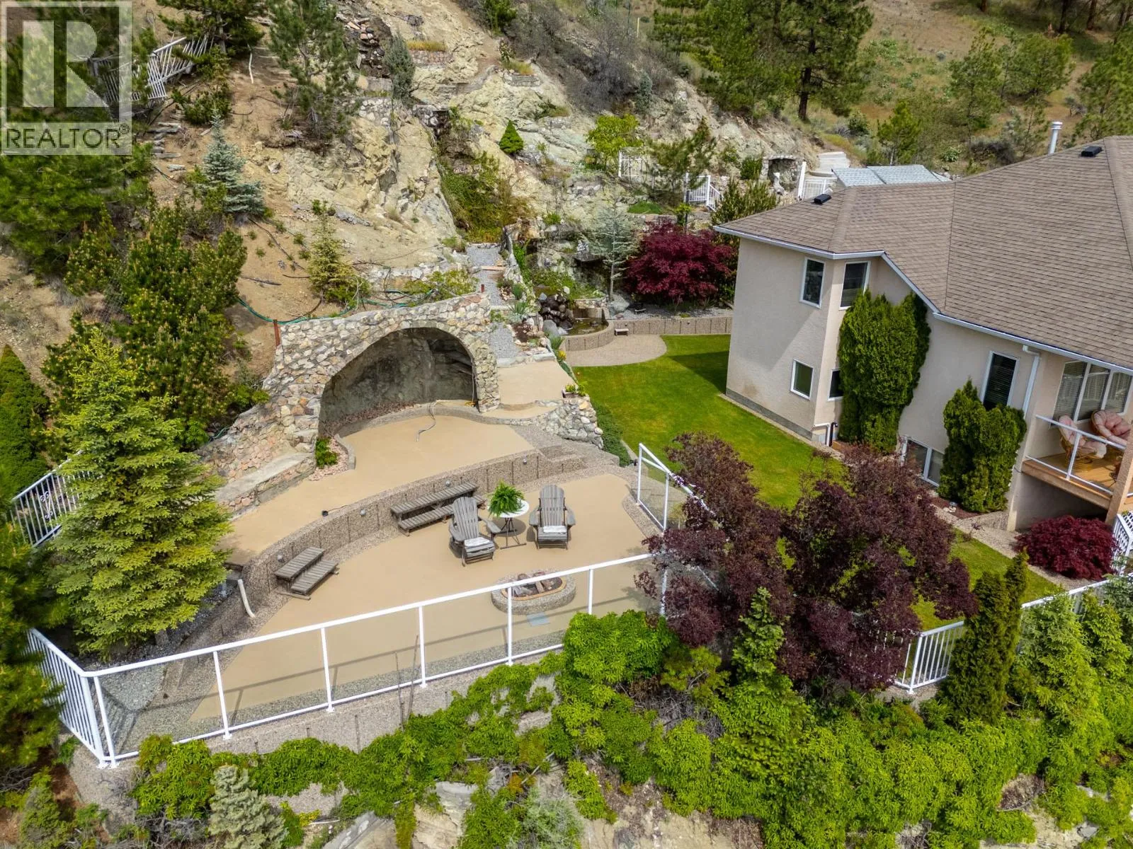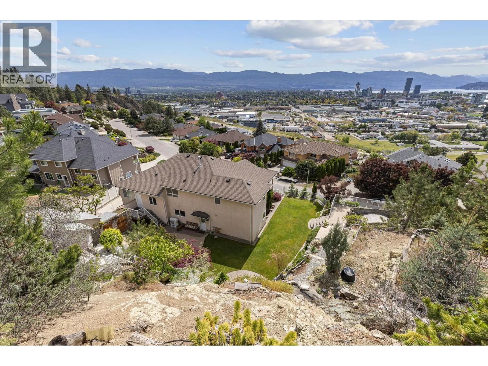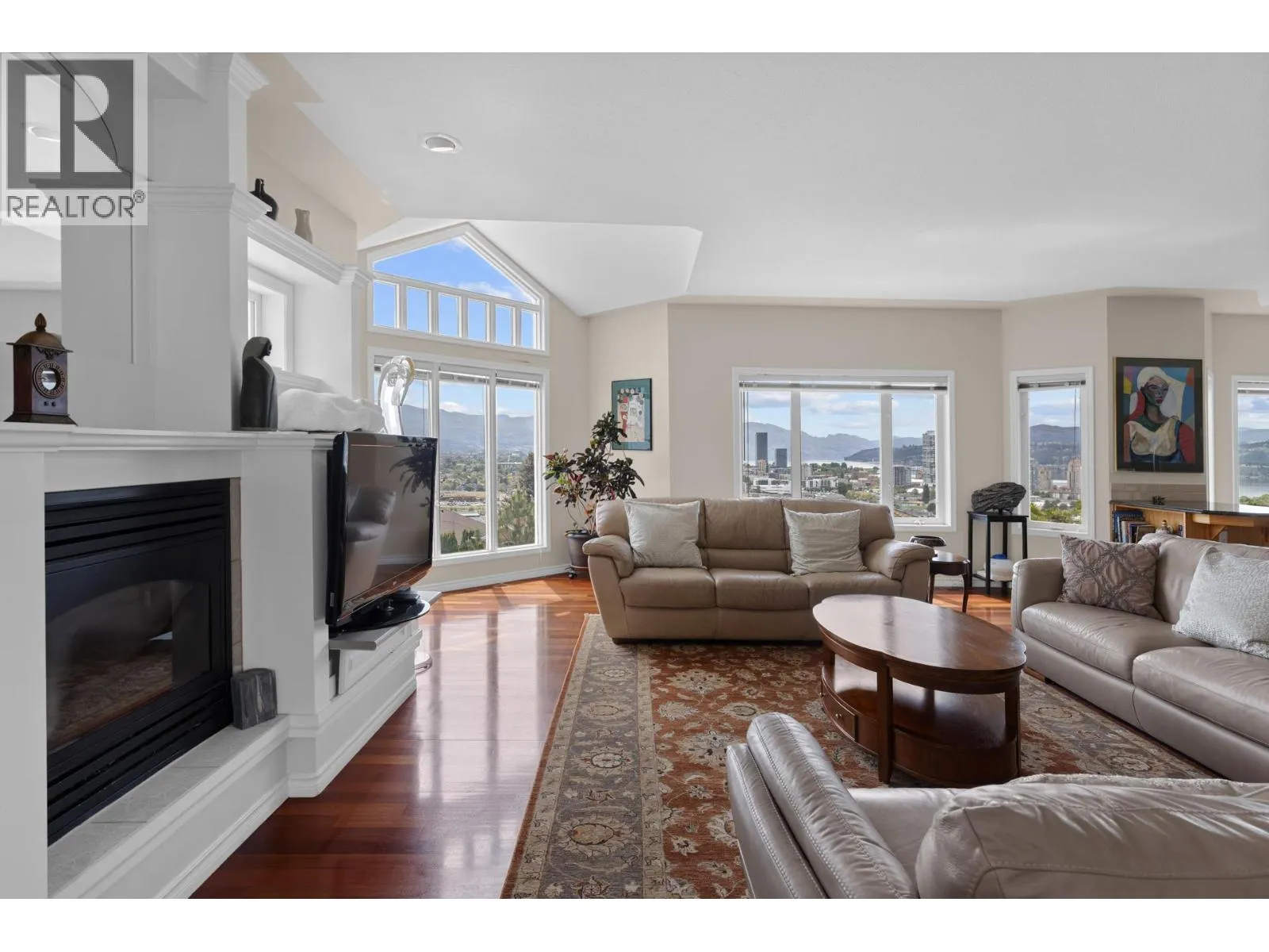 A Rare Gem on Mount Royal! Welcome to one the Cityâs most prestigious and centrally located neighbourhoods adjacent to Knox Mountain Park with 367 HA of natural beauty! Located minutes from downtown, yet worlds away with breathtaking panoramic views of the Kelowna skyline and Okanagan lake. This southwest-facing masterpiece offers ever-changing vistas through expansive windows and thoughtfully designed open-concept spaces. A unique front-to-back split layout spans four distinct levels, blending style and functionality throughout.The main level features a spacious great room, cozy dining nook, private office, enclosed den, and a formal dining areaâperfect for both entertaining and everyday living. Upstairs, retreat to the luxurious primary suite, complete with a five-piece ensuite. The lower levels offer versatile living with two additional bedrooms and a full bath, while the walk-out guest suite includes two more bedrooms, a generous family room, and a kitchenetteâideal for visitors or extended family. Step outside to a private, park-like oasis on .88 acres, with beautifully landscaped pathways and artistic rock walls leading to a secluded observation deck with natural gas firepit and an area pre-wired for a hot tub. The rear yard features a custom built 50ft waterfall - bringing both visual and audible beauty to this natural paradise. Extensive storage in crawl space. Experience the ultimate in privacy, comfort, and natural beautyâthis is Mount Royal living at its finest. (id:27476)