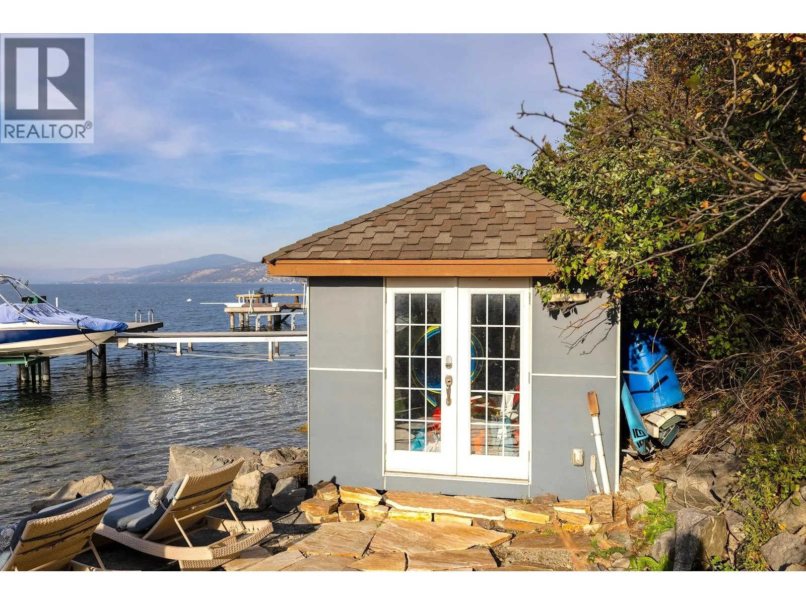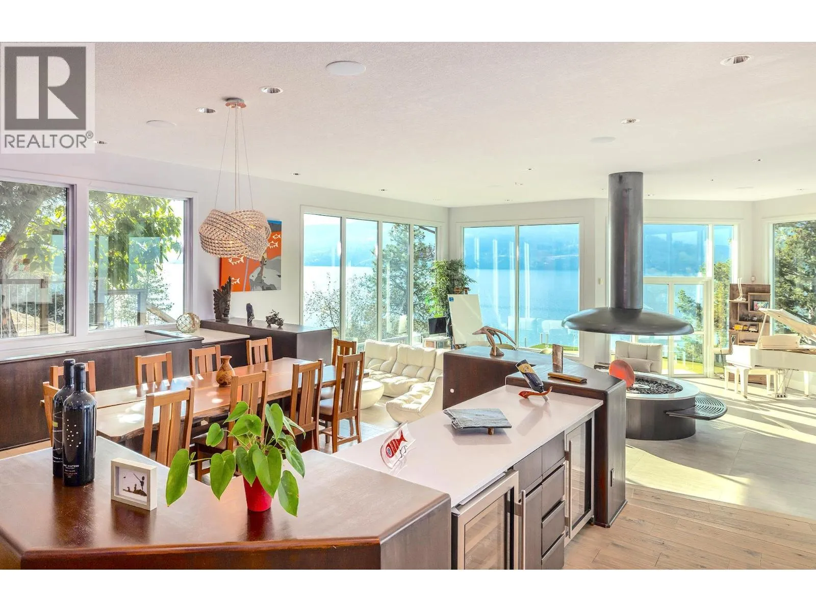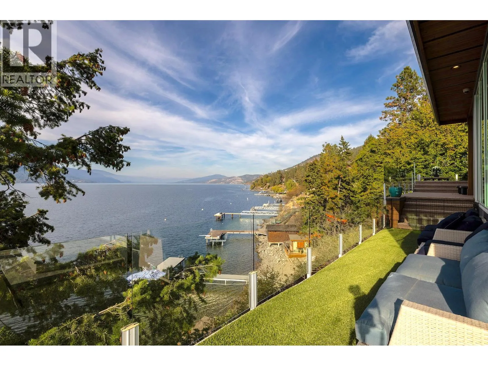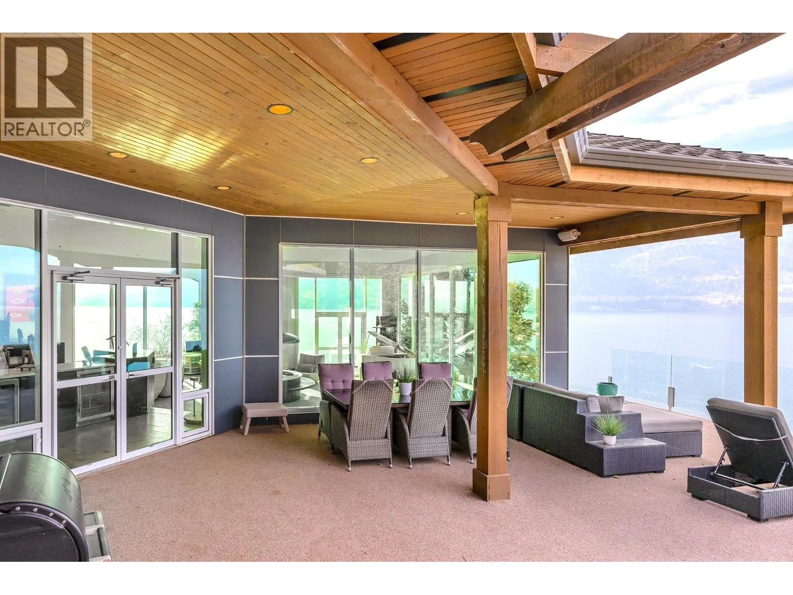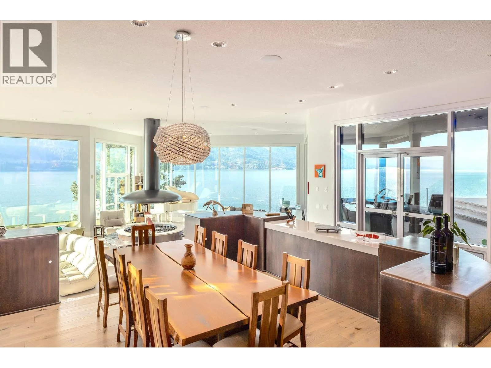 A Seamless Blend of Architecture and Nature with Panoramic Lake Views Perfectly integrated into the landscape, this stunning lakeside home captures the essence of Okanagan livingâideal as a summer escape or year-round retreat. With two spacious levels, approx. 2,000 sq. ft. of patio space, and a private wharf, it's built for lakeside enjoyment. Inside, a sun-filled, modern interior features floor-to-ceiling windows that frame breathtaking views. The chefâs kitchen boasts an illuminated live-edge island, Wolf appliances, a wine fridge, and Dacor wine station. A unique circular open fire pit anchors the living room, while the expansive wraparound patio offers glass railings, multiple lounging areas, and a mini putting green. The lower level includes four bedrooms, a luxurious primary suite with 6-piece en suite, a gym, home theatre, office, and patio with hot tub. At the waterâs edge, an aluminum dock includes a boat lift and dual Sea-Doo lift. The four-car tandem garage includes an extra-tall bay for RV or boat storage. A separate two-bedroom in-law suite, connected via hallway, offers excellent privacy. Located in McKinley Landing, just minutes from Kelowna International Airport, UBCO, Okanagan Golf Club, and downtown Kelowna. (id:27476)