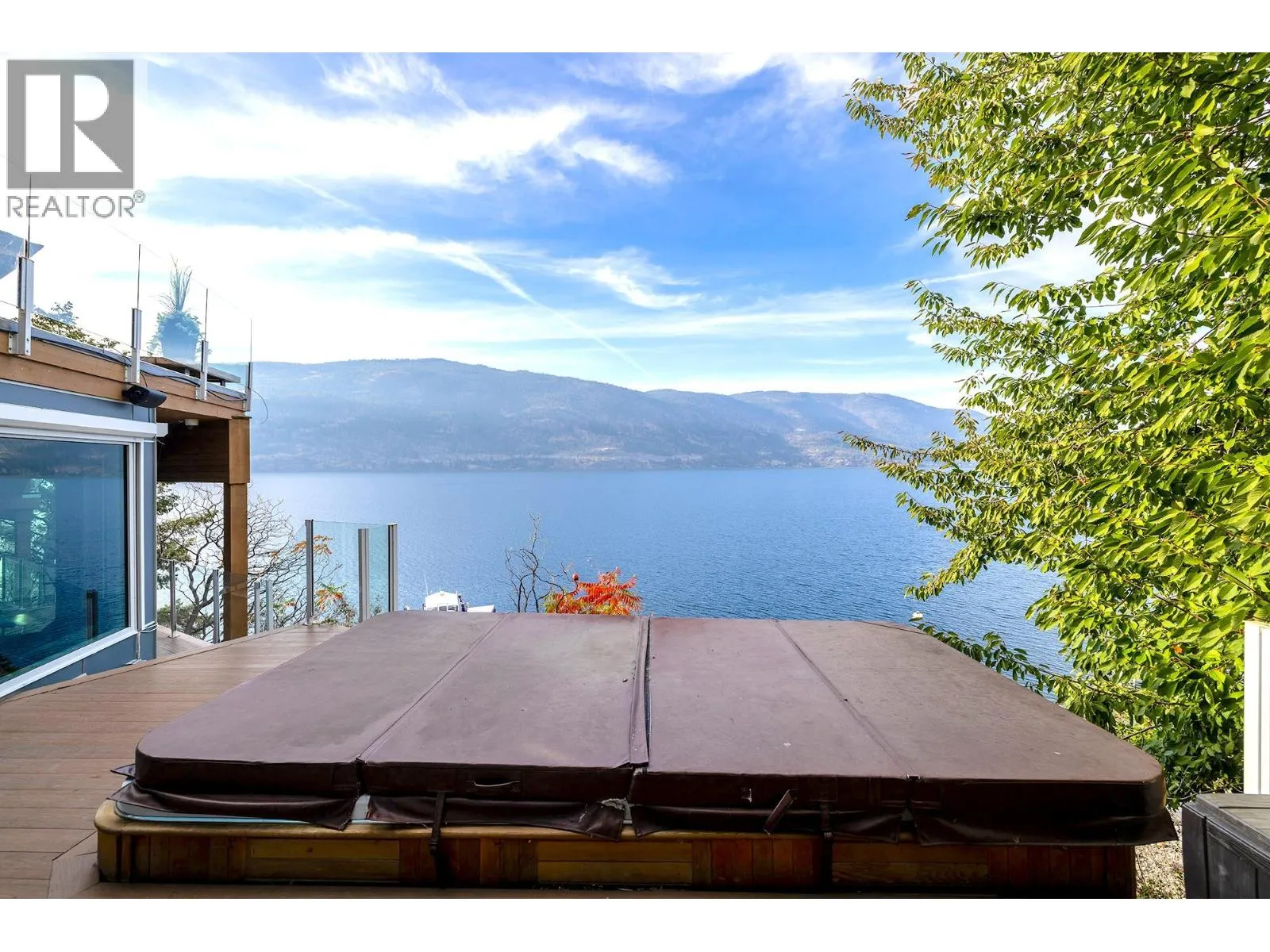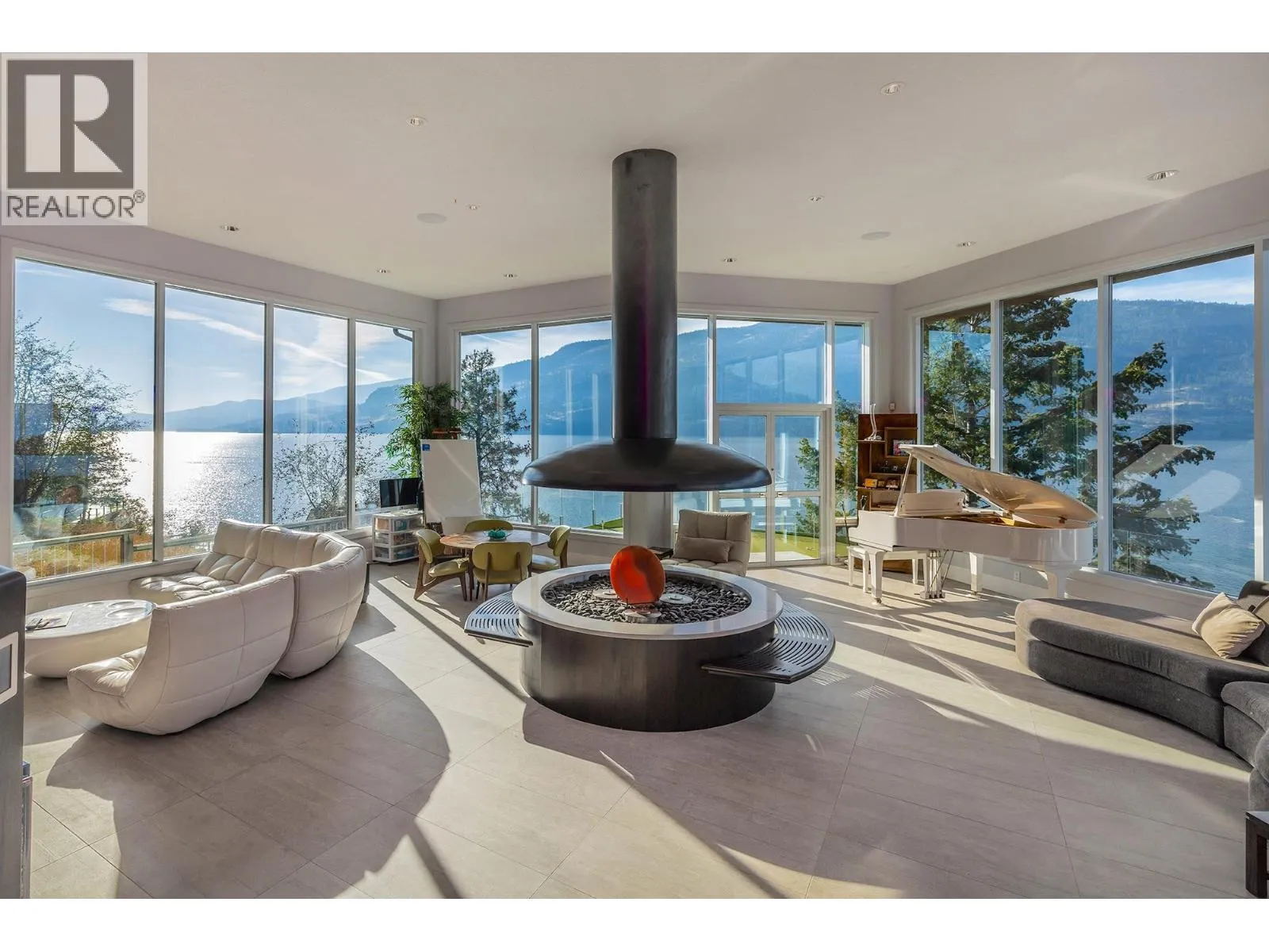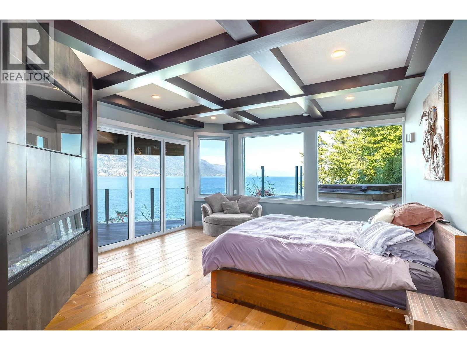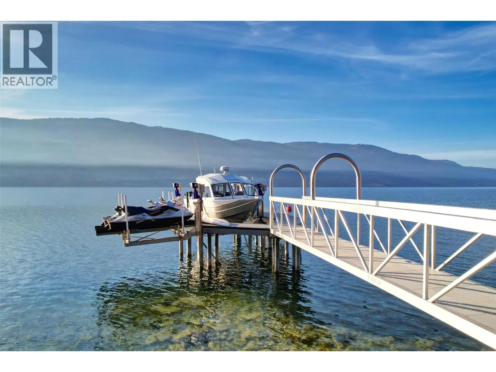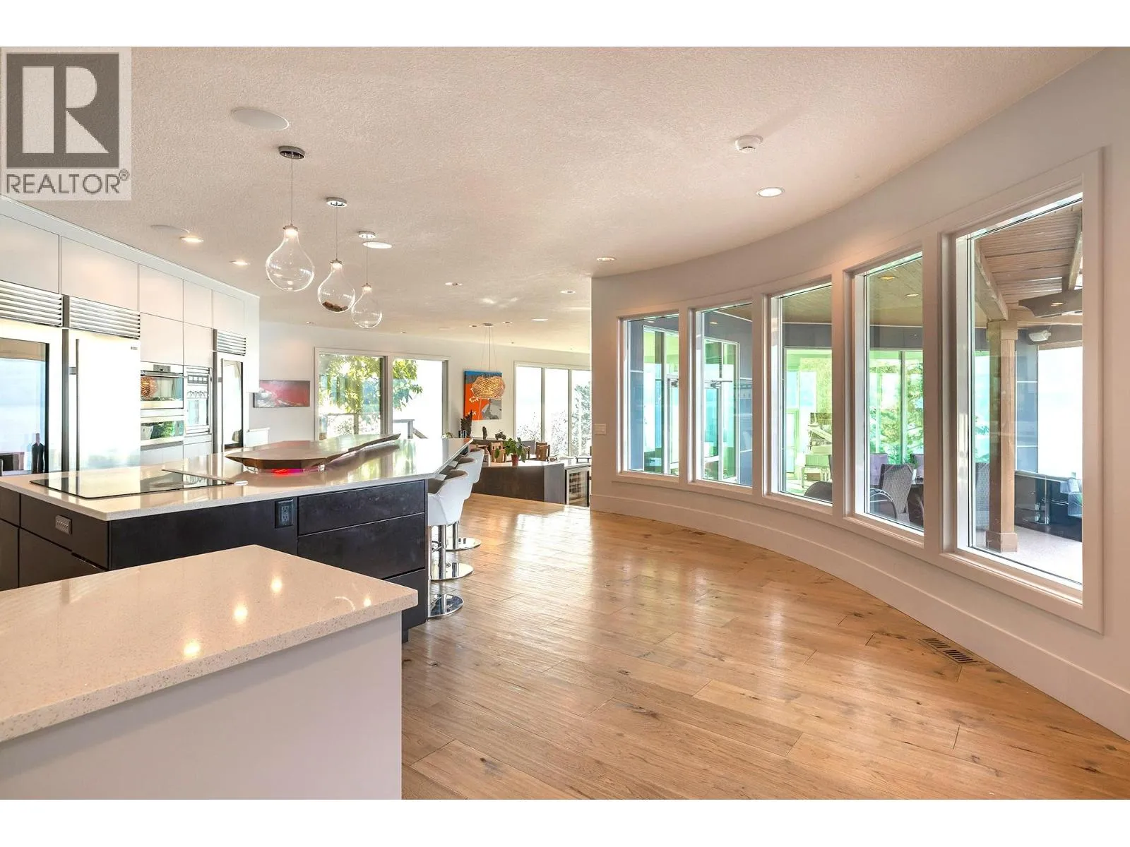 A Seamless Blend of Architecture and Nature with Panoramic Lake Views Perfectly integrated into the landscape, this stunning lakeside home captures the essence of Okanagan livingâideal as a summer escape or year-round retreat. With two spacious levels, approx. 2,000 sq. ft. of patio space, and a private wharf, it's built for lakeside enjoyment. Inside, a sun-filled, modern interior features floor-to-ceiling windows that frame breathtaking views. The chefâs kitchen boasts an illuminated live-edge island, Wolf appliances, a wine fridge, and Dacor wine station. A unique circular open fire pit anchors the living room, while the expansive wraparound patio offers glass railings, multiple lounging areas, and a mini putting green. The lower level includes four bedrooms, a luxurious primary suite with 6-piece en suite, a gym, home theatre, office, and patio with hot tub. At the waterâs edge, an aluminum dock includes a boat lift and dual Sea-Doo lift. The four-car tandem garage includes an extra-tall bay for RV or boat storage. A separate two-bedroom in-law suite, connected via hallway, offers excellent privacy. Located in McKinley Landing, just minutes from Kelowna International Airport, UBCO, Okanagan Golf Club, and downtown Kelowna. (id:27476)