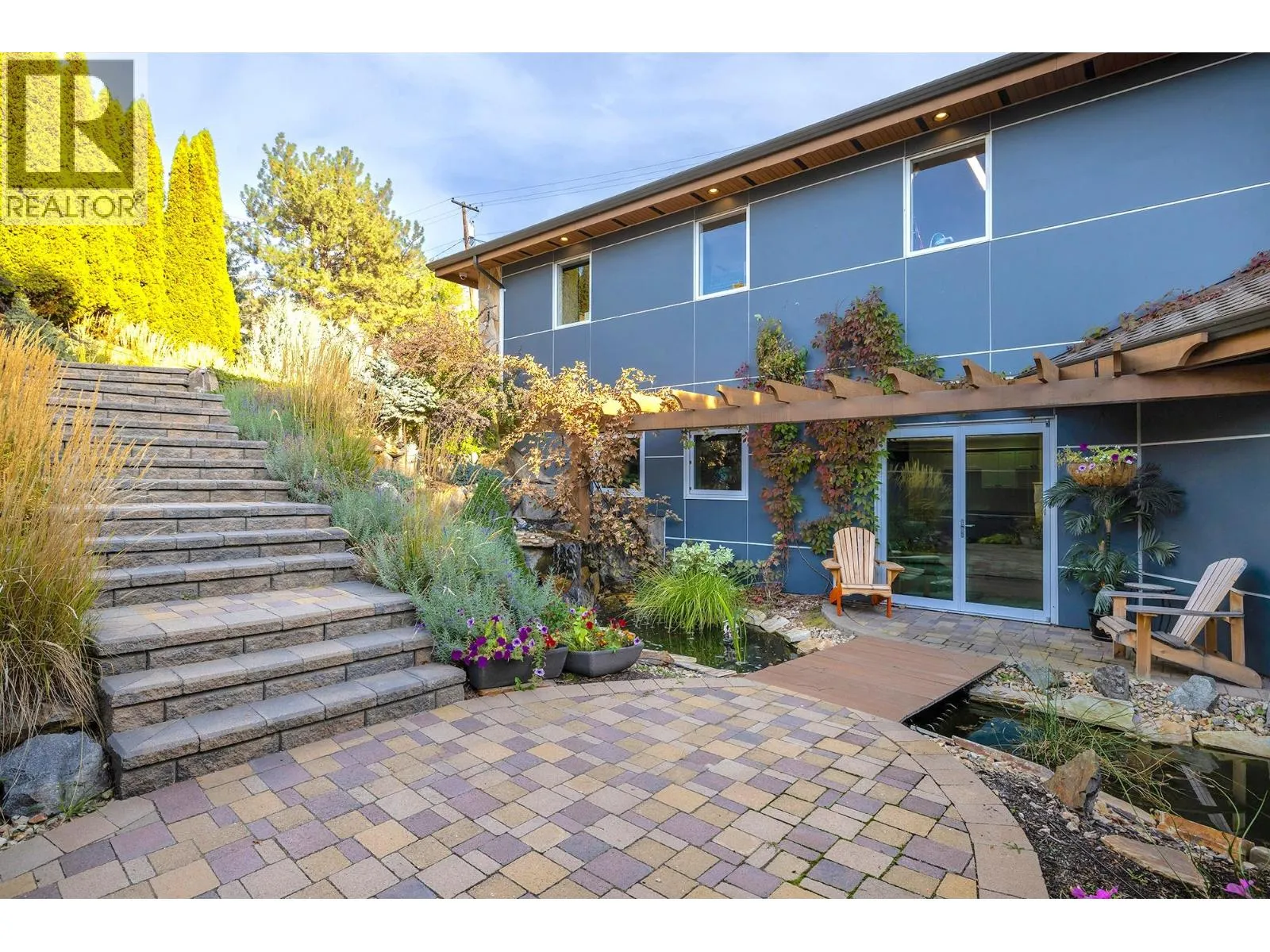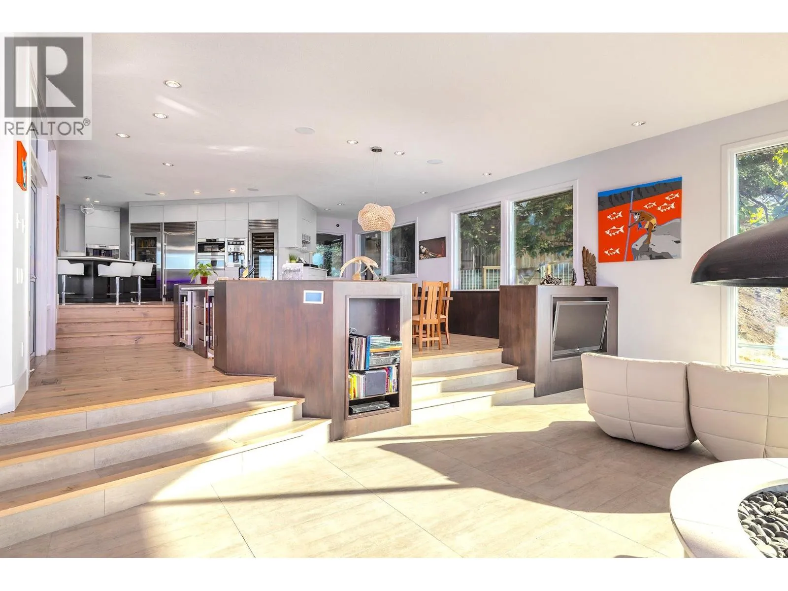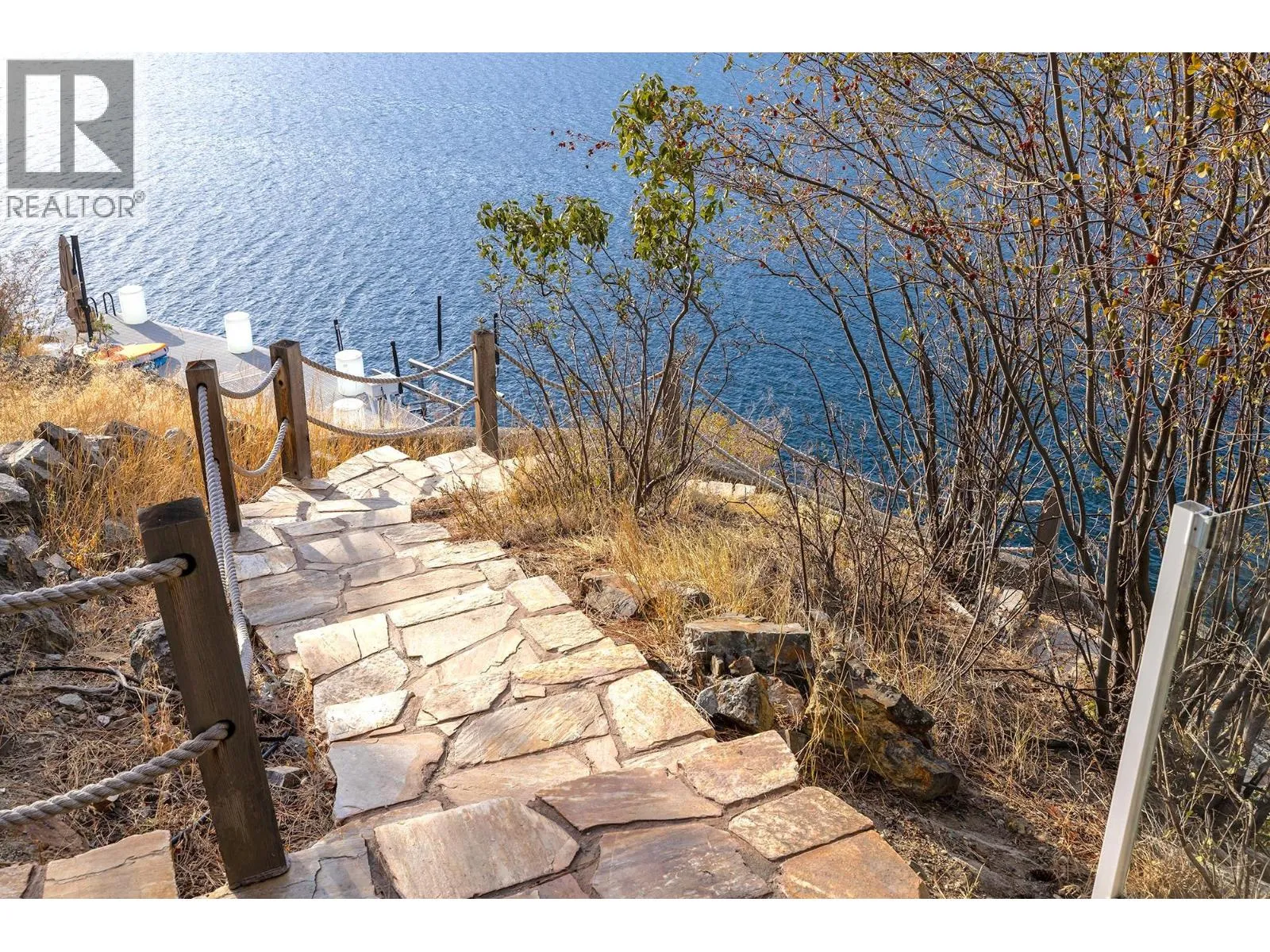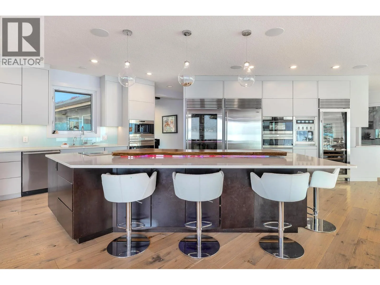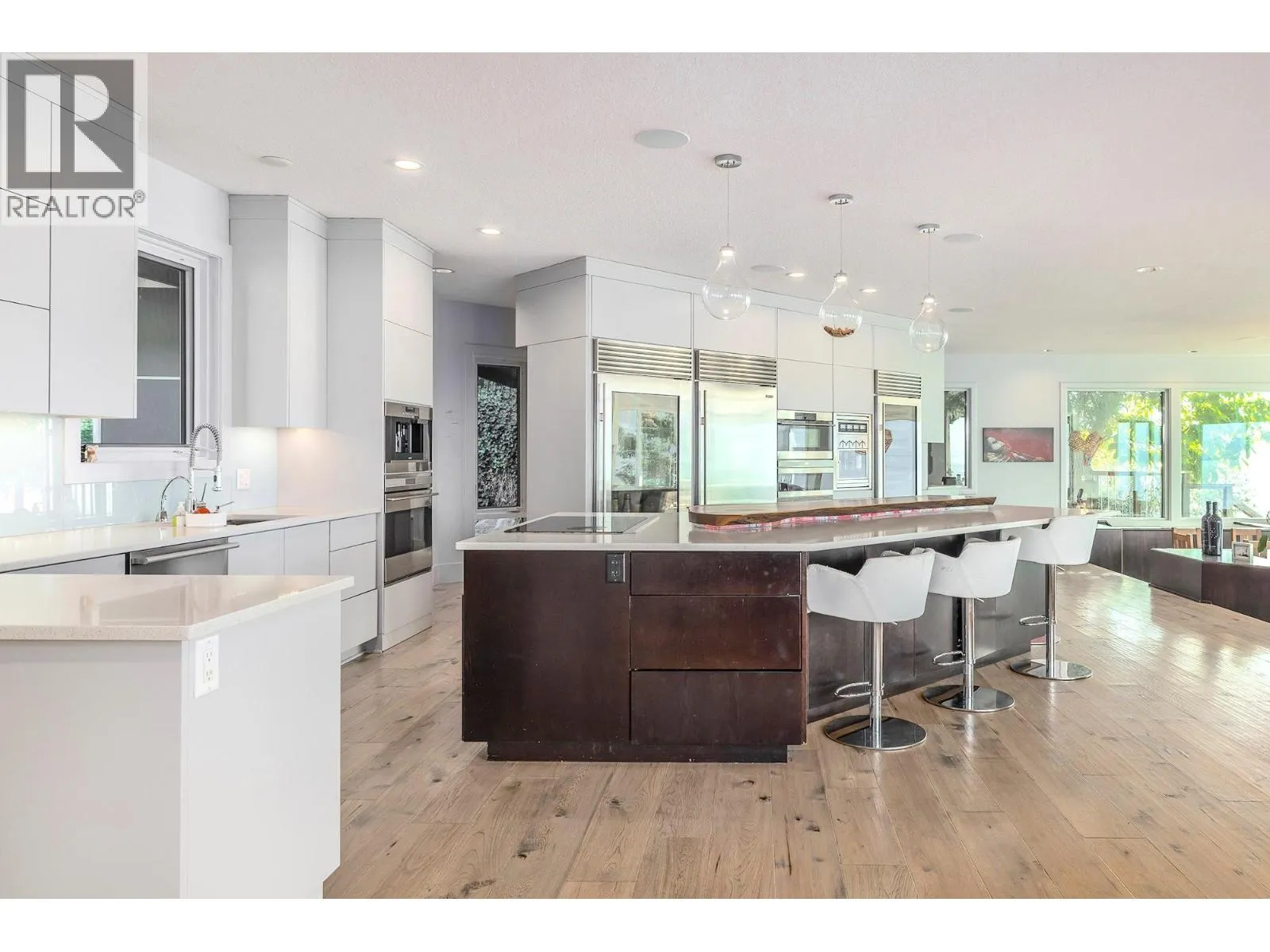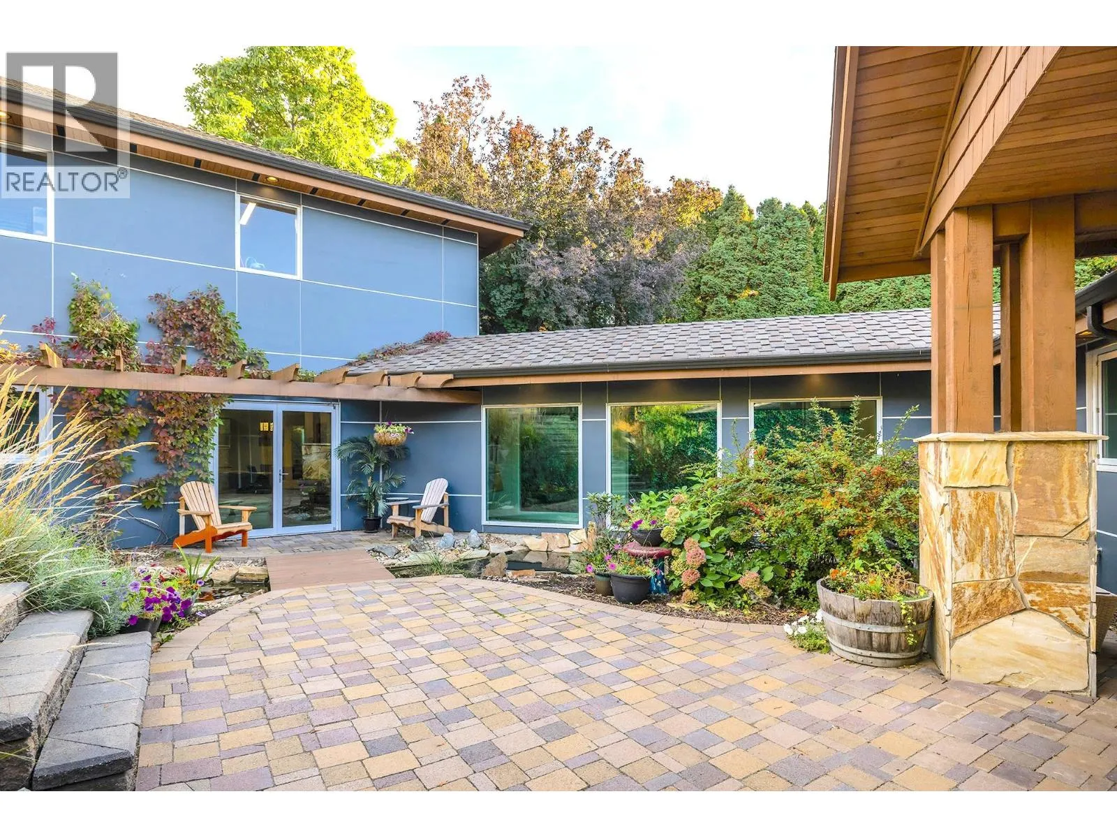 A Seamless Blend of Architecture and Nature with Panoramic Lake Views Perfectly integrated into the landscape, this stunning lakeside home captures the essence of Okanagan livingâideal as a summer escape or year-round retreat. With two spacious levels, approx. 2,000 sq. ft. of patio space, and a private wharf, it's built for lakeside enjoyment. Inside, a sun-filled, modern interior features floor-to-ceiling windows that frame breathtaking views. The chefâs kitchen boasts an illuminated live-edge island, Wolf appliances, a wine fridge, and Dacor wine station. A unique circular open fire pit anchors the living room, while the expansive wraparound patio offers glass railings, multiple lounging areas, and a mini putting green. The lower level includes four bedrooms, a luxurious primary suite with 6-piece en suite, a gym, home theatre, office, and patio with hot tub. At the waterâs edge, an aluminum dock includes a boat lift and dual Sea-Doo lift. The four-car tandem garage includes an extra-tall bay for RV or boat storage. A separate two-bedroom in-law suite, connected via hallway, offers excellent privacy. Located in McKinley Landing, just minutes from Kelowna International Airport, UBCO, Okanagan Golf Club, and downtown Kelowna. (id:27476)