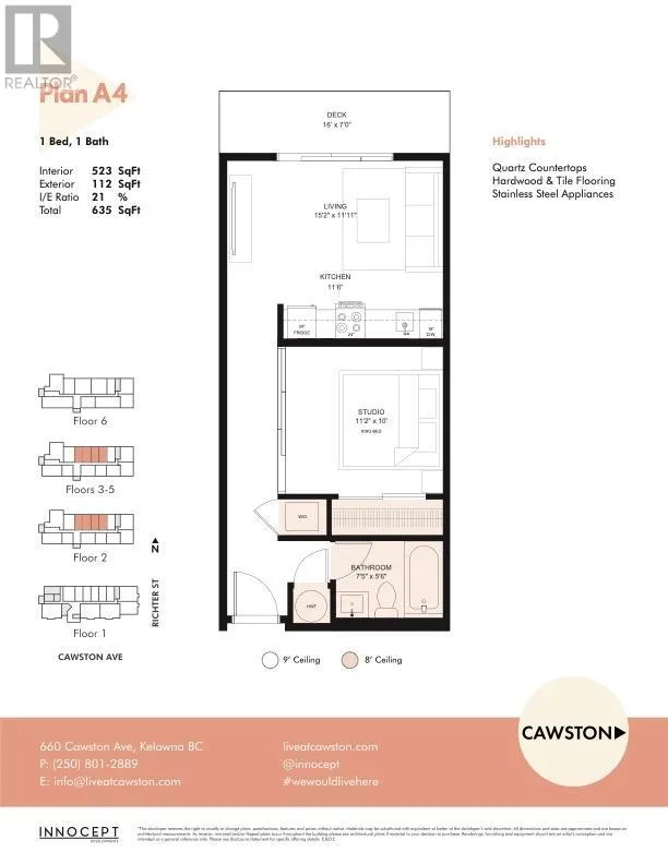 Welcome to Cawston! #410 is a beautiful well laid out 1bdrm; one of the most sought after plans in the building. Cawston is an 82 unit artfully designed development in the heart of downtown Kelowna offering appealing and convenient places to call home. The building was designed to be harmonious with the local community with consciously selected sustainable building materials & high-quality finishings. Located on the fourth floor facing north overlooking Knoxx Mountain and the city of Kelowna #410 offers a quiet and private dwelling. Bike to the Boardwalk, meet friends for happy hour, or go for a swim in the lake after a hike â all within minutes of your doorstep. (id:27476)