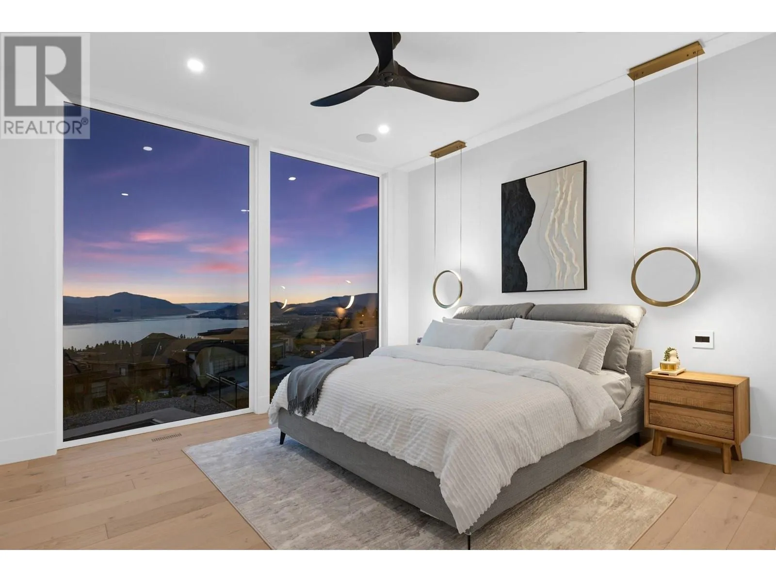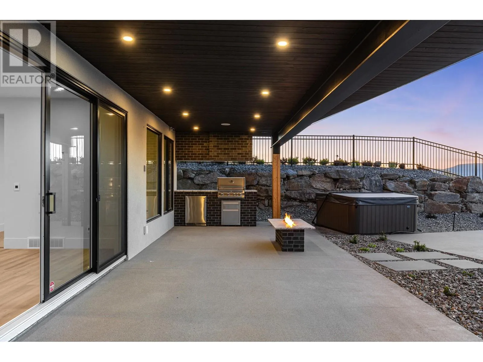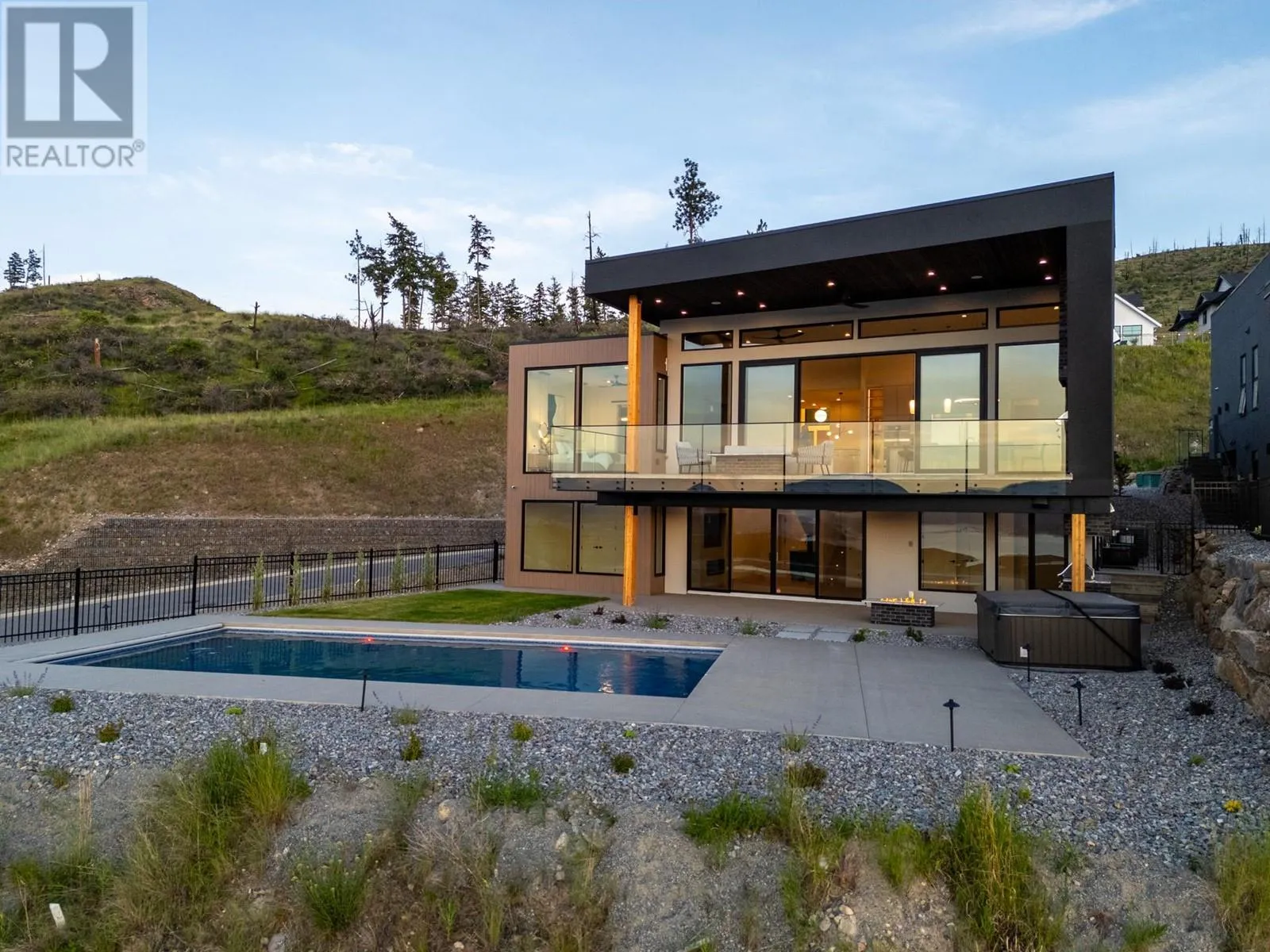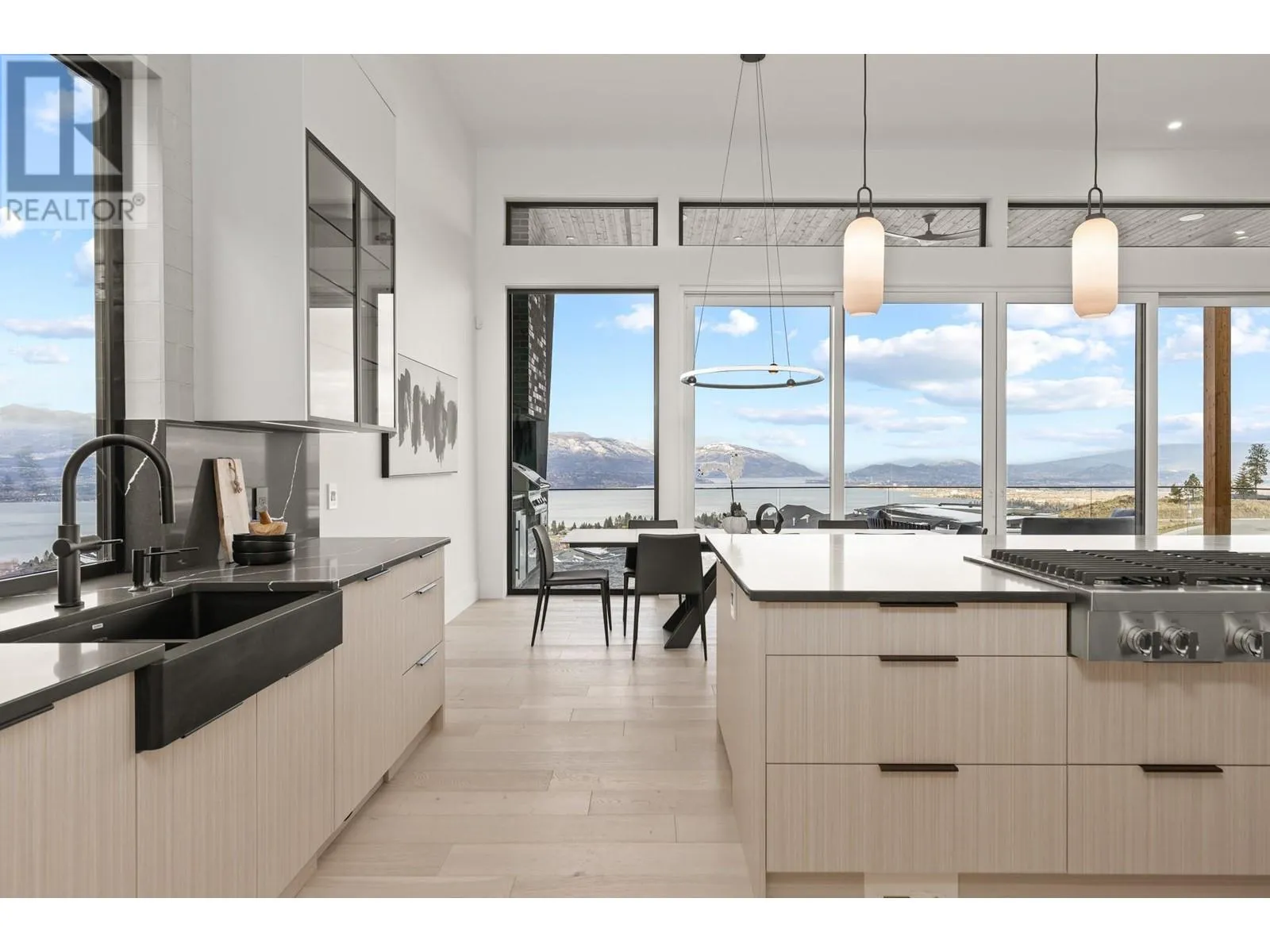 Experience modern Okanagan luxury in this brand-new custom-built walkout rancher, designed to impress with striking architecture, high-end finishings, and breathtaking lake, sunset, and city views. This home seamlessly blends contemporary elegance with functional design, delivering an unmatched indoor-outdoor lifestyle. The open-concept main level is highlighted by floor-to-ceiling sliding doors that expand to a spacious covered patio, complete with built-in BBQ, fire table, and panoramic views. The chefâs kitchen is a showstopper with premium Jennair appliances including a 6-burner gas cooktop, built-in oven, full-size fridge/freezer, double dishwashers, and built-in coffee station. A walk-through pantry connects directly to the laundry room and heated garage for everyday convenience. The luxurious primary bedroom features spa-inspired ensuite with fluted freestanding tub, steam shower, and large walk-in closet. A private office and a designer guest powder room with preserved moss wall and onyx sink complete the main level. Downstairs is designed for entertaining, opening directly to your backyard oasis with 16x32 pool (with auto cover), hot tub, and a second built-in BBQ area. Inside, enjoy the wet bar, theater room, gym with sports flooring, and ample storage. The legal 1-bedroom suite (option for a 2nd bdrm) offers flexibility for guests or rental income. Oversized heated garage features epoxy floors, an 11-foot door for RV or boat access, and roughed-in A/C. (id:27476)