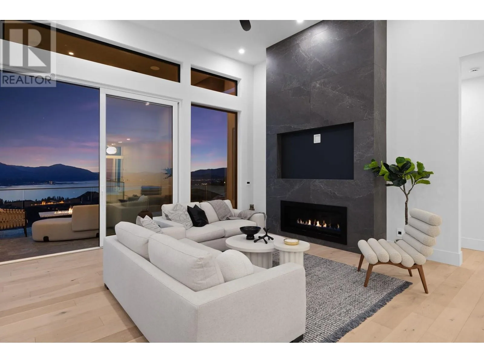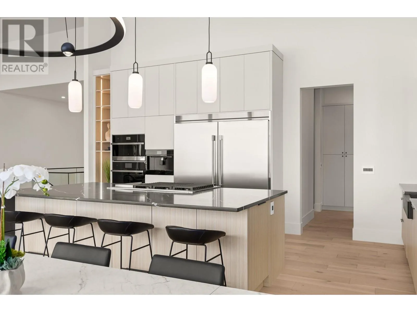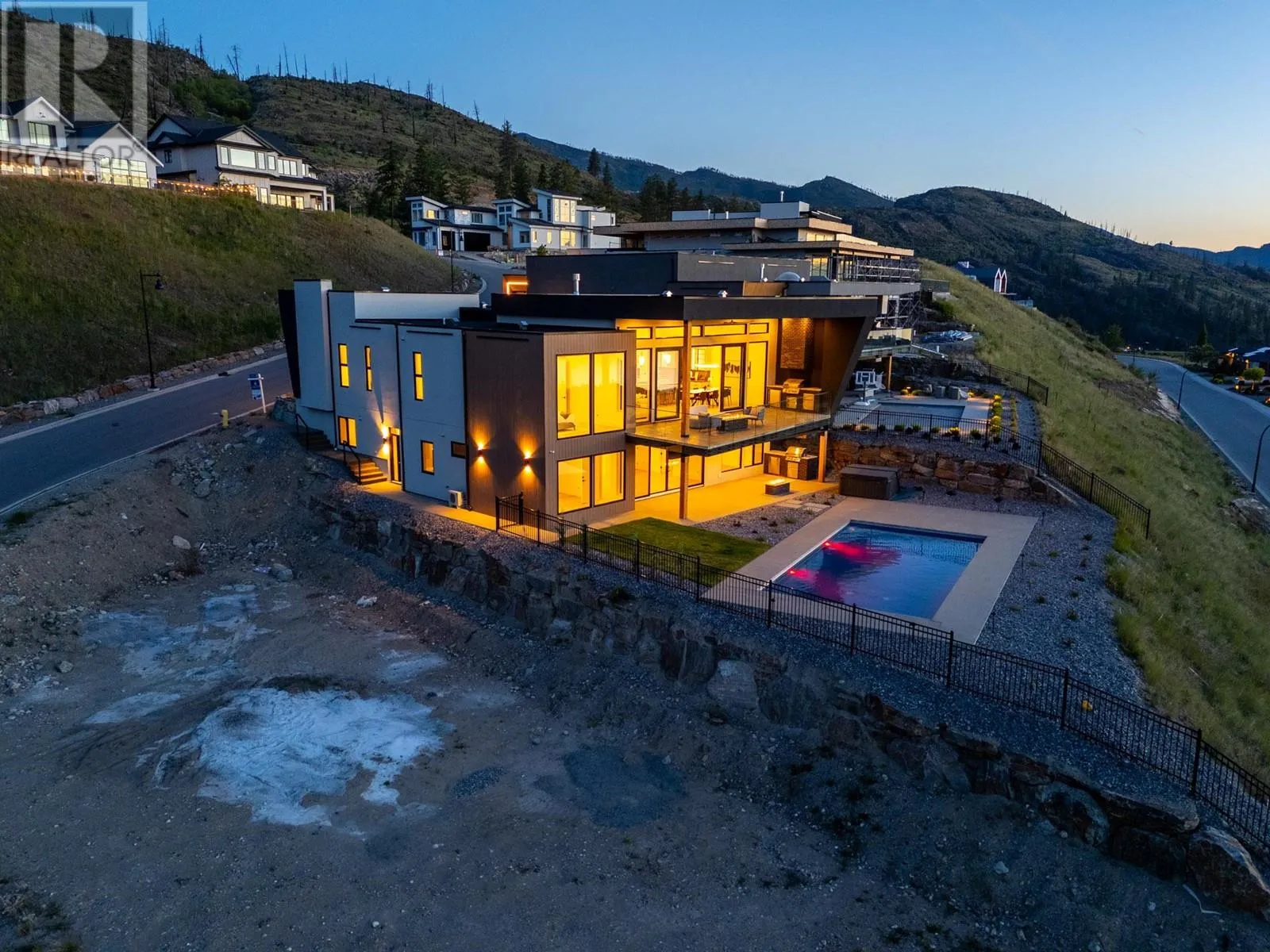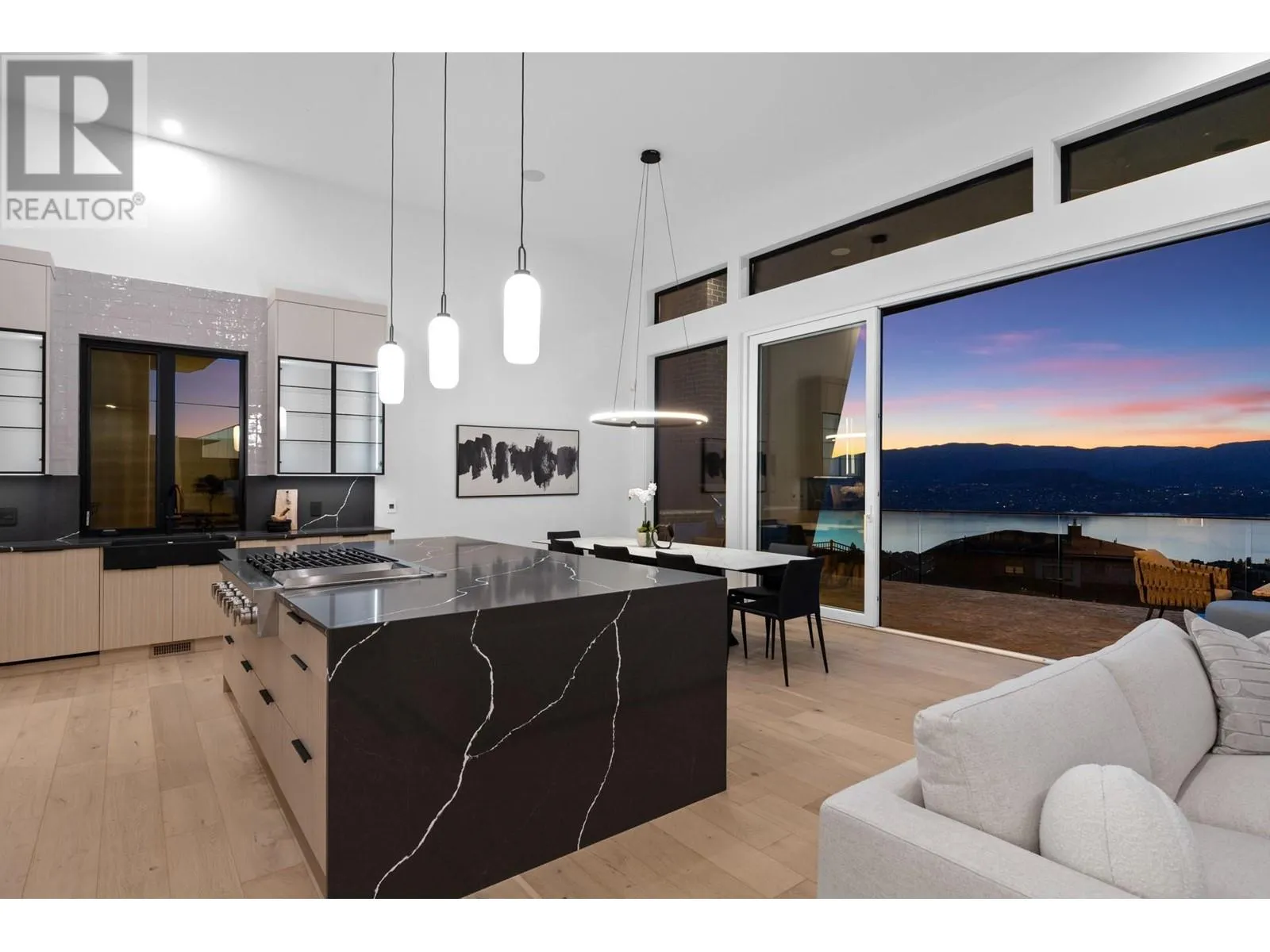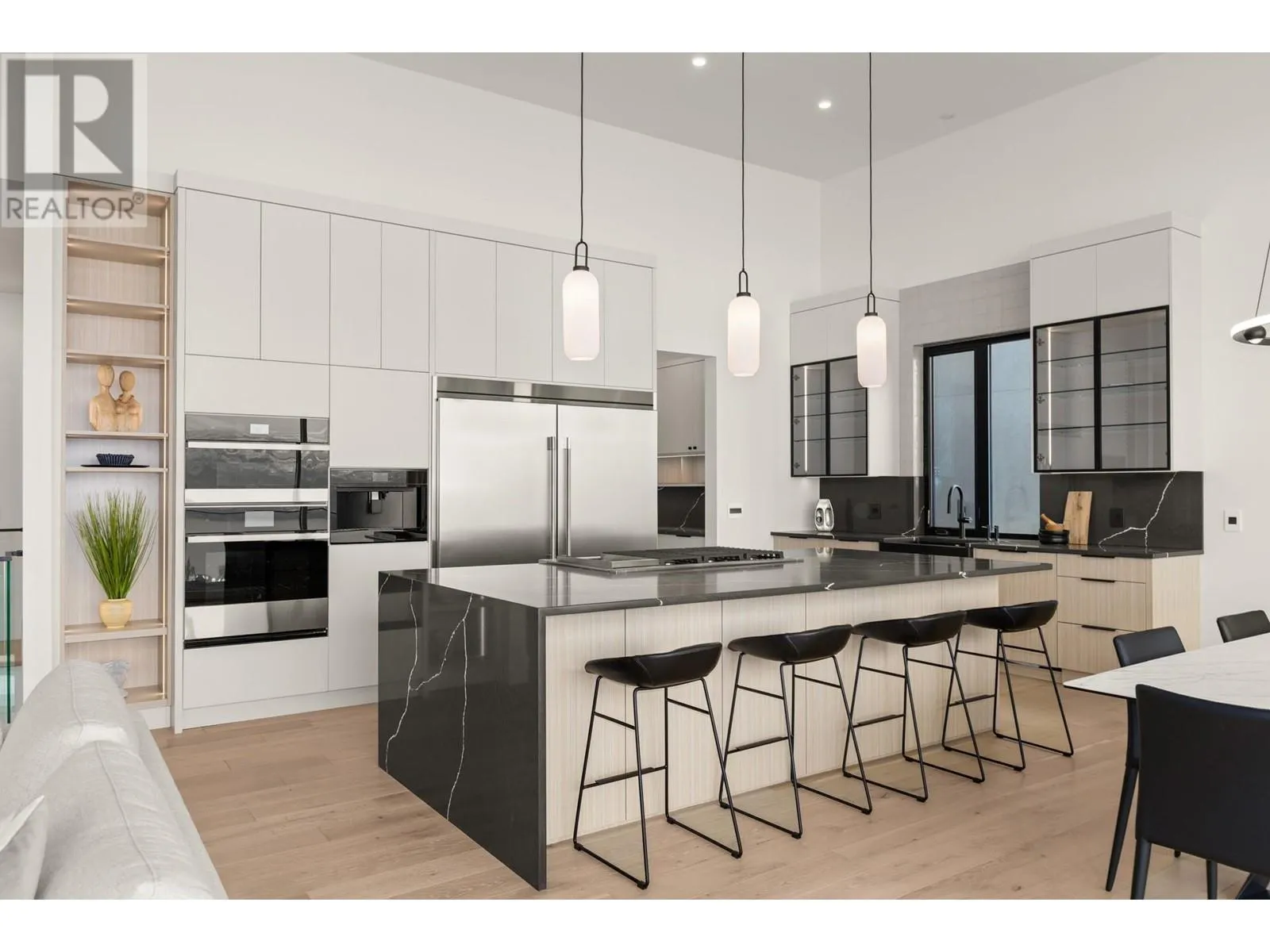 Experience modern Okanagan luxury in this brand-new custom-built walkout rancher, designed to impress with striking architecture, high-end finishings, and breathtaking lake, sunset, and city views. This home seamlessly blends contemporary elegance with functional design, delivering an unmatched indoor-outdoor lifestyle. The open-concept main level is highlighted by floor-to-ceiling sliding doors that expand to a spacious covered patio, complete with built-in BBQ, fire table, and panoramic views. The chefâs kitchen is a showstopper with premium Jennair appliances including a 6-burner gas cooktop, built-in oven, full-size fridge/freezer, double dishwashers, and built-in coffee station. A walk-through pantry connects directly to the laundry room and heated garage for everyday convenience. The luxurious primary bedroom features spa-inspired ensuite with fluted freestanding tub, steam shower, and large walk-in closet. A private office and a designer guest powder room with preserved moss wall and onyx sink complete the main level. Downstairs is designed for entertaining, opening directly to your backyard oasis with 16x32 pool (with auto cover), hot tub, and a second built-in BBQ area. Inside, enjoy the wet bar, theater room, gym with sports flooring, and ample storage. The legal 1-bedroom suite (option for a 2nd bdrm) offers flexibility for guests or rental income. Oversized heated garage features epoxy floors, an 11-foot door for RV or boat access, and roughed-in A/C. (id:27476)