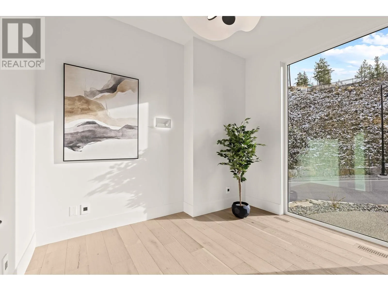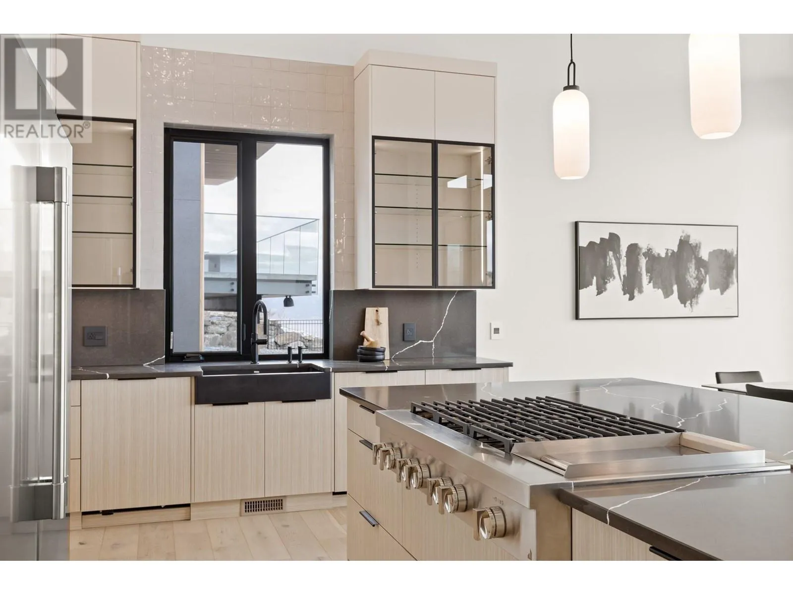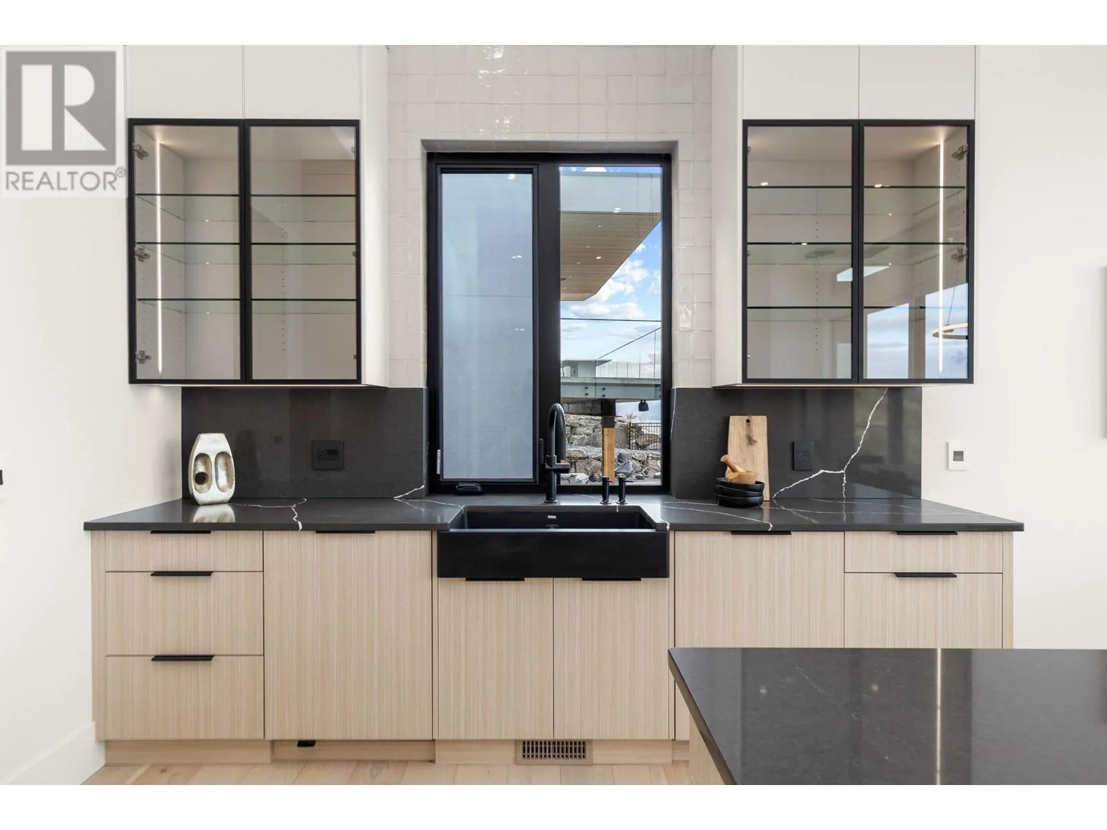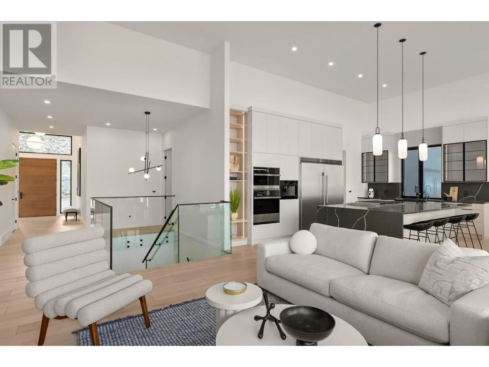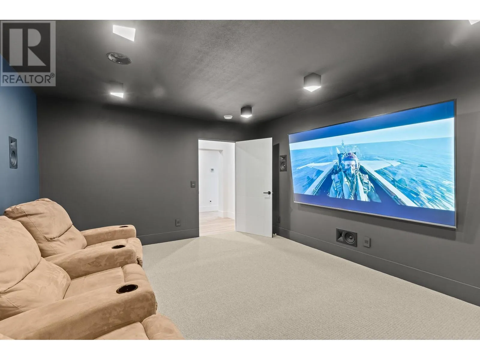 Experience modern Okanagan luxury in this brand-new custom-built walkout rancher, designed to impress with striking architecture, high-end finishings, and breathtaking lake, sunset, and city views. This home seamlessly blends contemporary elegance with functional design, delivering an unmatched indoor-outdoor lifestyle. The open-concept main level is highlighted by floor-to-ceiling sliding doors that expand to a spacious covered patio, complete with built-in BBQ, fire table, and panoramic views. The chefâs kitchen is a showstopper with premium Jennair appliances including a 6-burner gas cooktop, built-in oven, full-size fridge/freezer, double dishwashers, and built-in coffee station. A walk-through pantry connects directly to the laundry room and heated garage for everyday convenience. The luxurious primary bedroom features spa-inspired ensuite with fluted freestanding tub, steam shower, and large walk-in closet. A private office and a designer guest powder room with preserved moss wall and onyx sink complete the main level. Downstairs is designed for entertaining, opening directly to your backyard oasis with 16x32 pool (with auto cover), hot tub, and a second built-in BBQ area. Inside, enjoy the wet bar, theater room, gym with sports flooring, and ample storage. The legal 1-bedroom suite (option for a 2nd bdrm) offers flexibility for guests or rental income. Oversized heated garage features epoxy floors, an 11-foot door for RV or boat access, and roughed-in A/C. (id:27476)