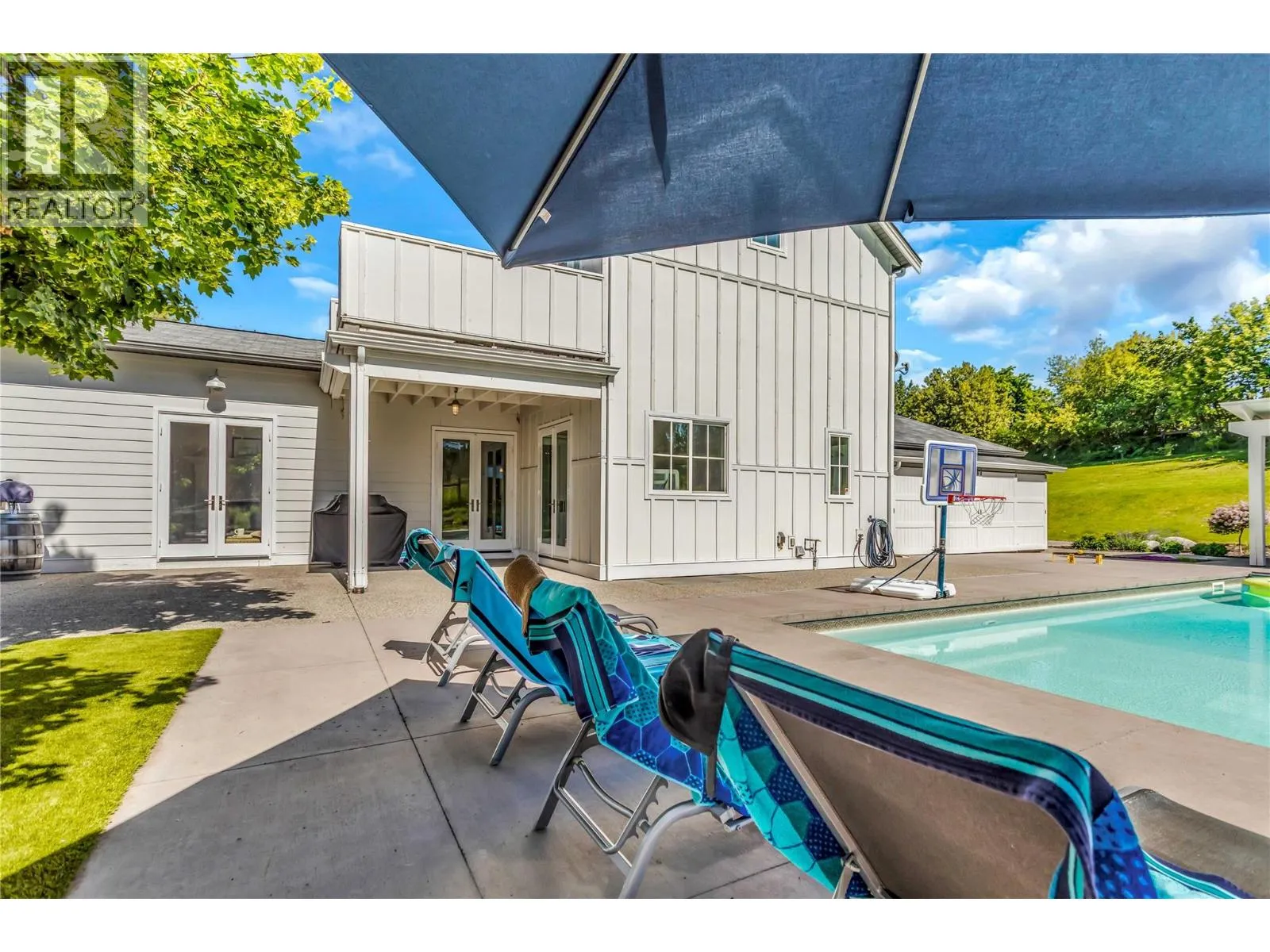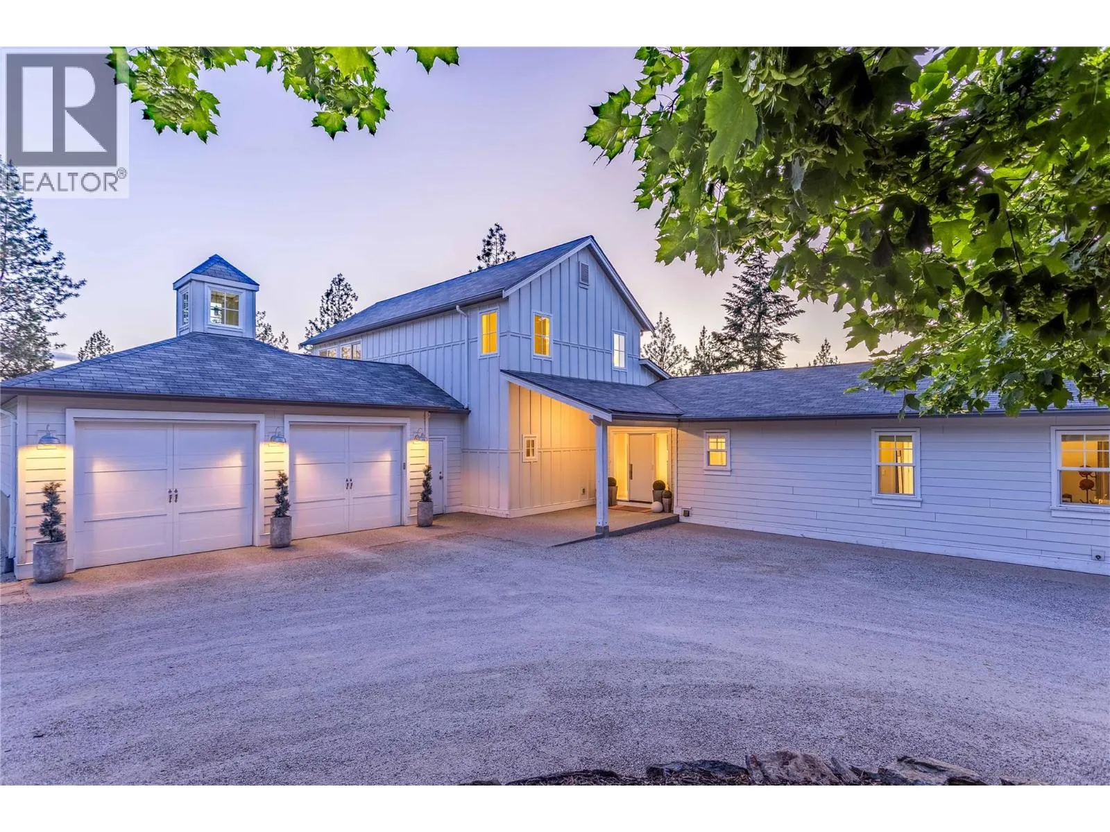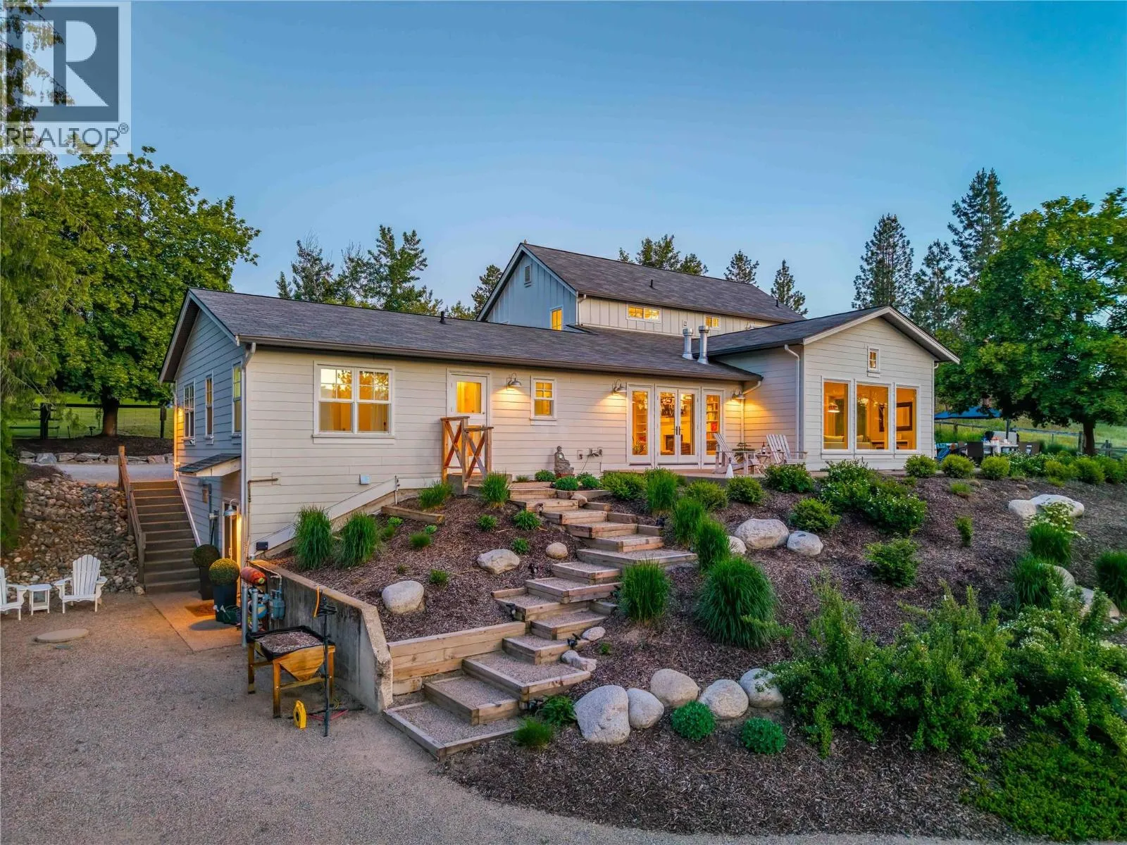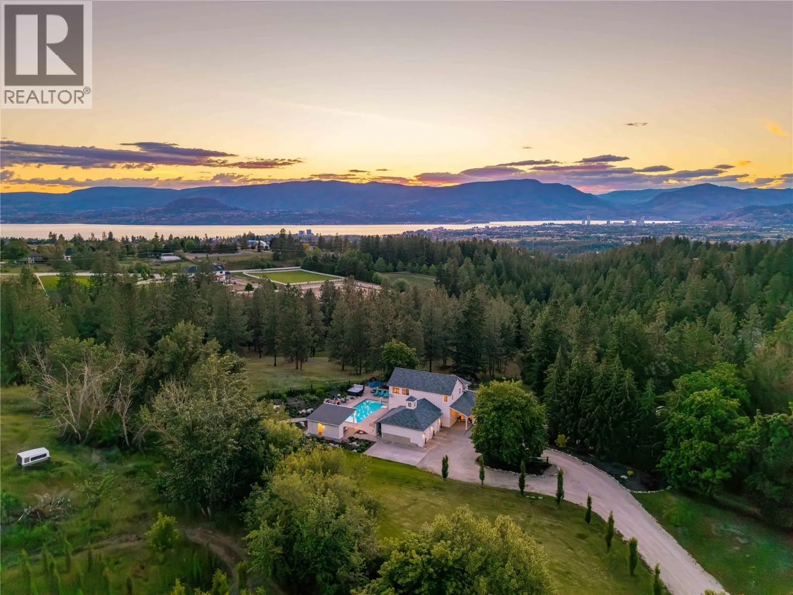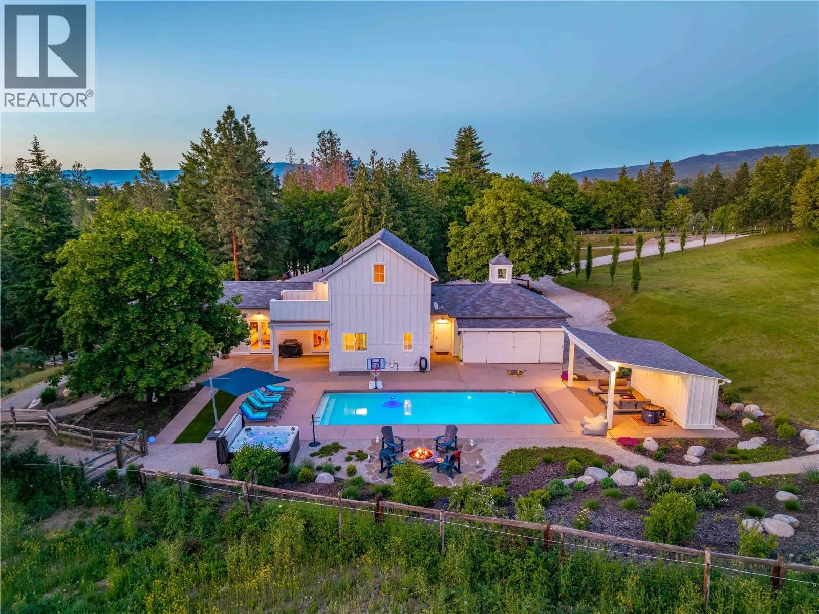 Welcome to your private sanctuary in Southeast Kelowna, where nature, thoughtful design, and everyday luxury come together on 4.25 acres of forested beauty. Mature trees surround this modern farmhouse, which offers 5600 sq ft of vibrant living space, perfect for quiet moments and lively gatherings. At the heart of the home, the kitchen features double islands, quartz counters, high-end appliances, and a spacious walk-in pantry, designed for creating special moments with family and friends. Vaulted dining and living areas with white-washed beams, a brick fireplace, and a sparkling crystal chandelier exude warmth and style. French doors open onto a wraparound patio, in-ground pool, and fire pit framed with lush landscaping, inviting you to relax and unwind in complete privacy. The main level offers two bedrooms with en-suite bathrooms, walk-in closets, a den, laundry, and a mudroom for convenience. Upstairs, the primary suite is a private retreat, complete with a spa-like ensuite, and a balcony overlooking the propertyâyour perfect spot for a morning coffee or evening wine. The lower level is built for connection and fun, featuring a second kitchen, multiple living areas, and two bedrooms. A heated double garage with front and rear access, plus basement entry, adds extra convenience. Tucked away in Southeast Kelowna, this home offers rare privacy and natural beauty. This is more than just a homeâitâs a lifestyle waiting for you to make it your own. (id:27476)