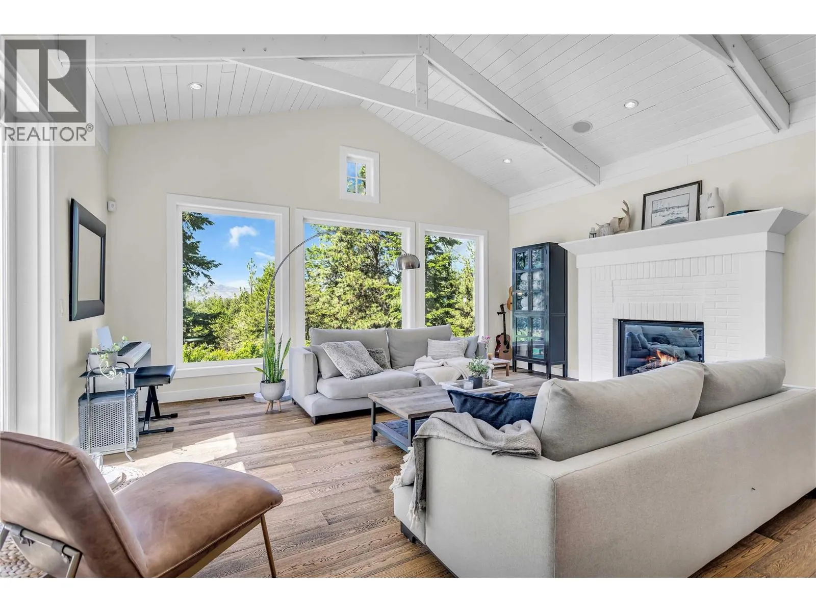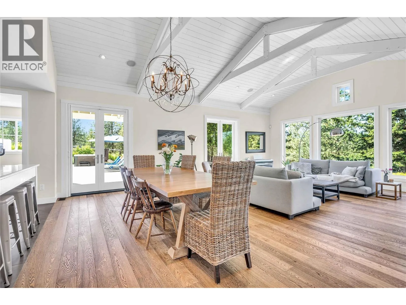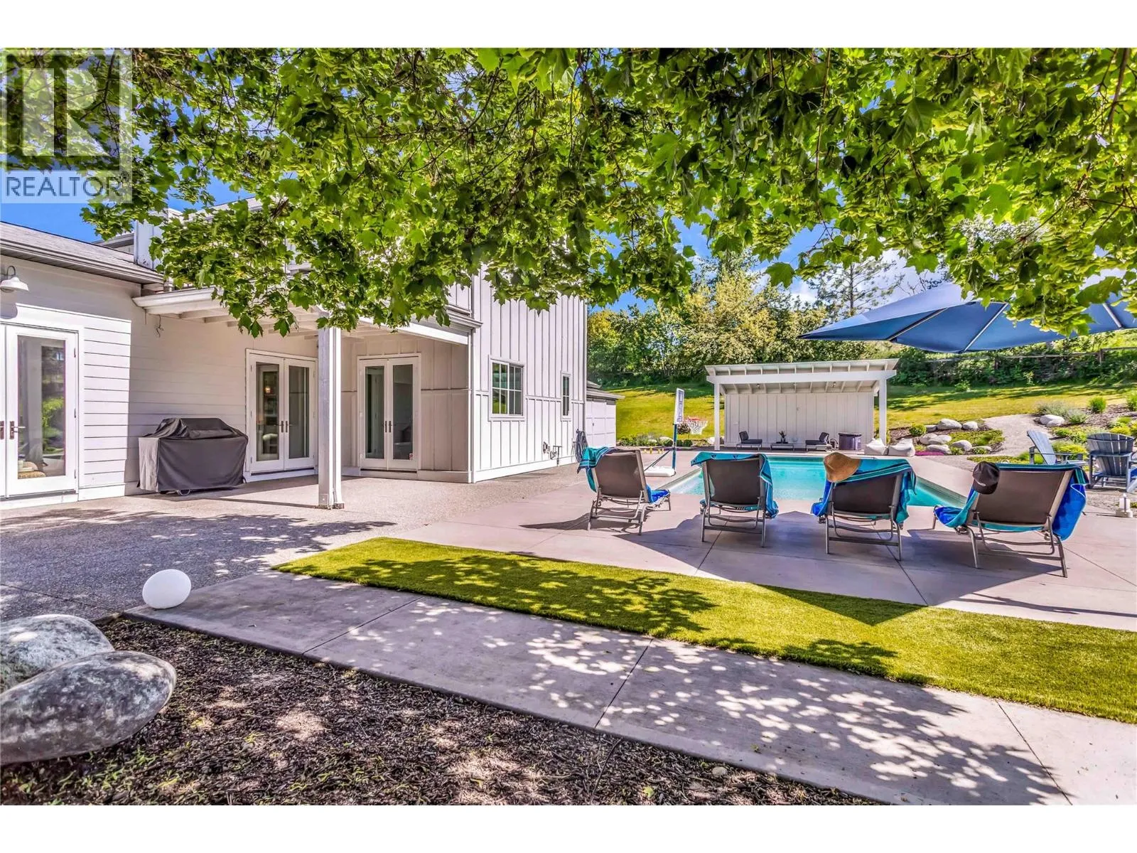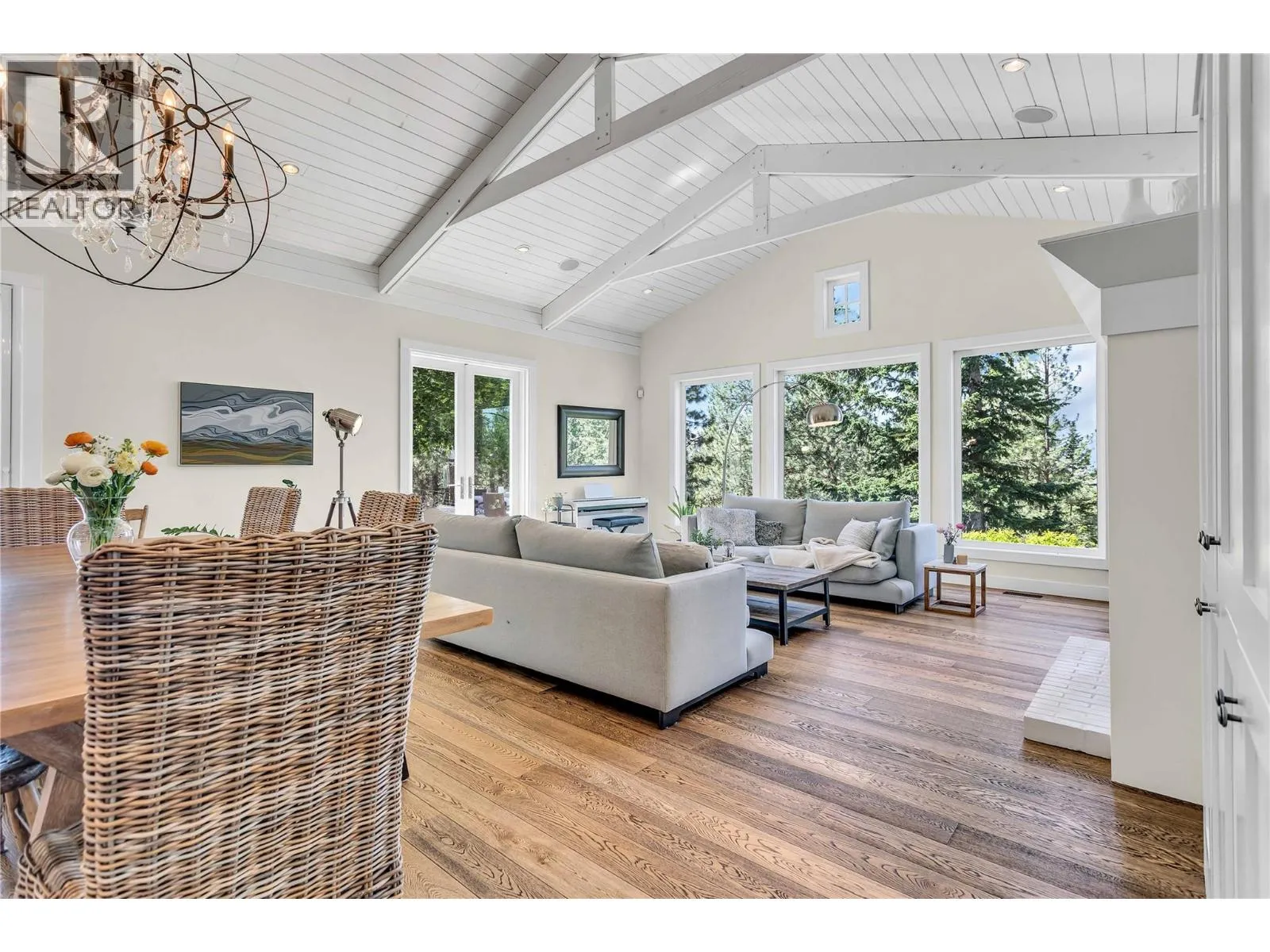 Welcome to your private sanctuary in Southeast Kelowna, where nature, thoughtful design, and everyday luxury come together on 4.25 acres of forested beauty. Mature trees surround this modern farmhouse, which offers 5600 sq ft of vibrant living space, perfect for quiet moments and lively gatherings. At the heart of the home, the kitchen features double islands, quartz counters, high-end appliances, and a spacious walk-in pantry, designed for creating special moments with family and friends. Vaulted dining and living areas with white-washed beams, a brick fireplace, and a sparkling crystal chandelier exude warmth and style. French doors open onto a wraparound patio, in-ground pool, and fire pit framed with lush landscaping, inviting you to relax and unwind in complete privacy. The main level offers two bedrooms with en-suite bathrooms, walk-in closets, a den, laundry, and a mudroom for convenience. Upstairs, the primary suite is a private retreat, complete with a spa-like ensuite, and a balcony overlooking the propertyâyour perfect spot for a morning coffee or evening wine. The lower level is built for connection and fun, featuring a second kitchen, multiple living areas, and two bedrooms. A heated double garage with front and rear access, plus basement entry, adds extra convenience. Tucked away in Southeast Kelowna, this home offers rare privacy and natural beauty. This is more than just a homeâitâs a lifestyle waiting for you to make it your own. (id:27476)