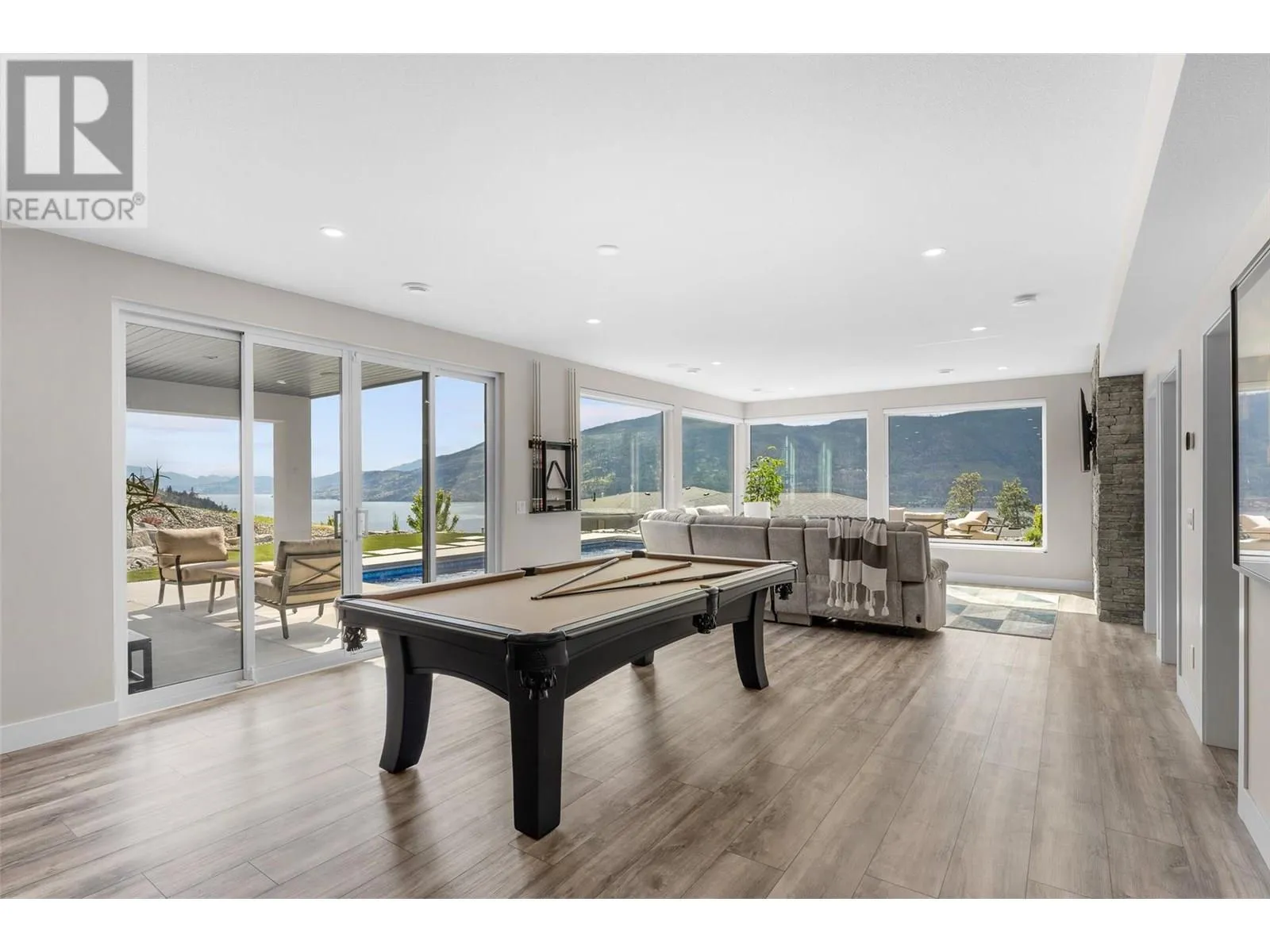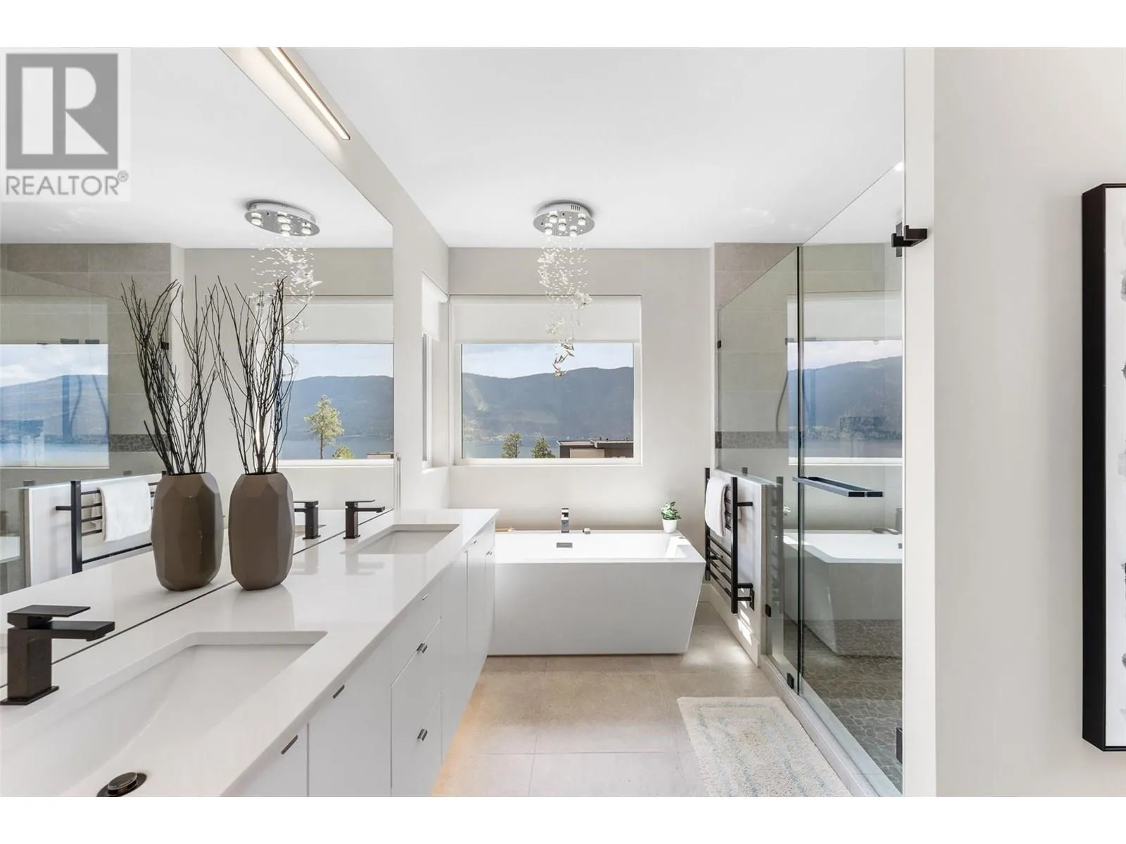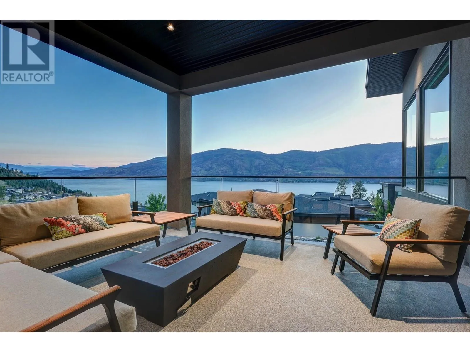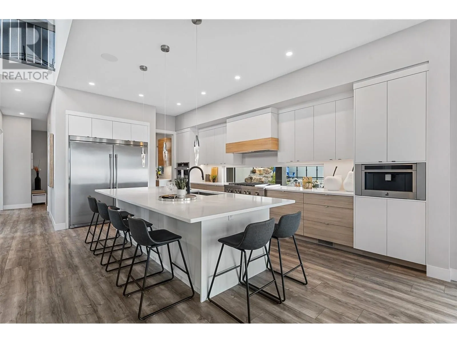 Gorgeous modern home in McKinley Beach where elevated Okanagan living meets thoughtful design & panoramic lake views. Situated on a rare 0.374-acre lot, this estate boasts a spacious family layout with resort-style amenities, expansive indoor-outdoor living, & a self-contained 2 bed/1 bath legal suite. The main level impresses with soaring ceilings, a chefâs kitchen featuring JennAir appliances, a massive island, & a seamless connection to the covered deckâperfect for al fresco dining. The luxurious primary suite enjoys sweeping lake &valley views, a spa-inspired ensuite, & a walk-through dressing room. A bright office, large pantry, powder room, & laundry complete this level. Downstairs, entertain in style with a rec room, wet bar with pass-through windows, wine cellar, & direct walkout access to the backyard oasis, featuring a heated saltwater pool, hot tub, & built-in firepit. Three additional beds & two baths offer flexibility. Upstairs, a versatile loft space is ideal for a home office or gym. The legal suite offers privacy & comfort with a separate deck, laundry, & private entrance. A highlight of this home is the 1300+ sq ft garage with cabinets, separate heat, & hard wired for network. Located minutes from the marina, airport, UBCO, wineries, & golf. Residents enjoy exclusive access to McKinleyâs amenity centre with gym, pool, hot tub, pickleball, & more. This is a rare opportunity to own one of the most versatile & beautifully appointed homes in McKinley Beach. (id:27476)