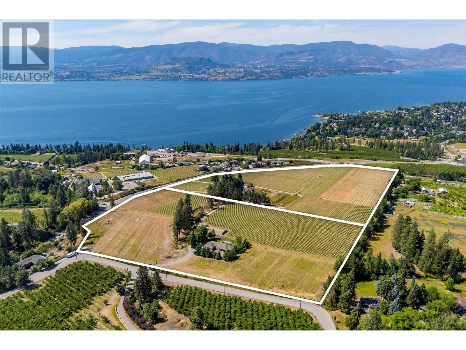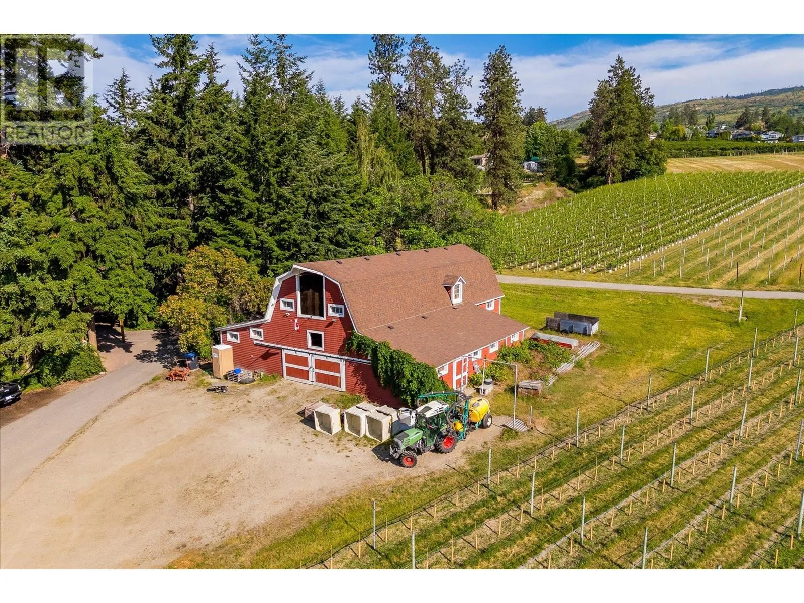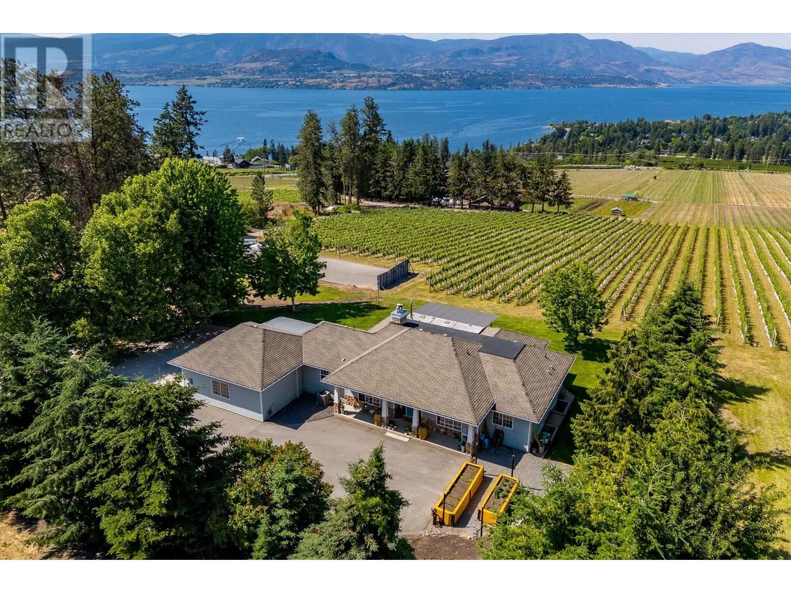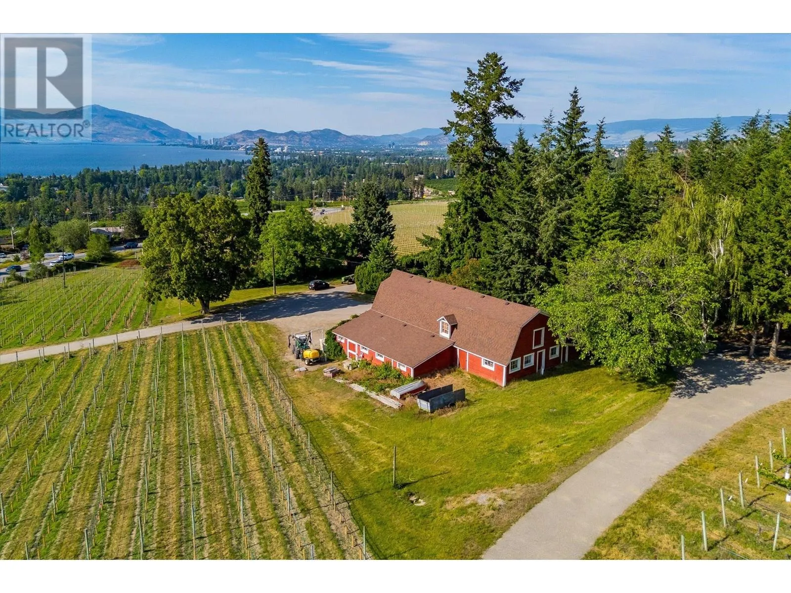 K & V Vineyards (4855 Chute Lake Rd. and 4895 Frost Rd.) is a 40-acre private estate located above Okanagan Lake, just minutes from downtown Kelowna. The property features a stunning European Craftsman residence with 7,442 SF of handcrafted living space, including 5 bedrooms, 6 bathrooms, and numerous custom details, all surrounding a spacious courtyard. An oversized garage and workshop are connected by a breezeway. The second residence is a 3,900 SF rancher with a covered backyard patio, perfect for enjoying sunset views and the natural beauty of the Okanagan. Additional structures include a renovated log cabin and a vintage red barn, adding character to the estate. The fully fenced and irrigated grounds sit on a gentle northwest-facing slope, with rows of vines aligned north-south for optimal sun exposure and mountain breezes, creating excellent growing conditions. The current plantings include 6 acres of Pinot Gris, 5 acres of Riesling, and 4 acres of Pinot Noir, established in May 2025, with plans for future plantings of Chardonnay and additional Pinot Noir. The estate is well-suited for managing and leasing to a reputable winery, offering a rare opportunity to enjoy luxurious living while operating an agricultural enterprise. (id:27476)