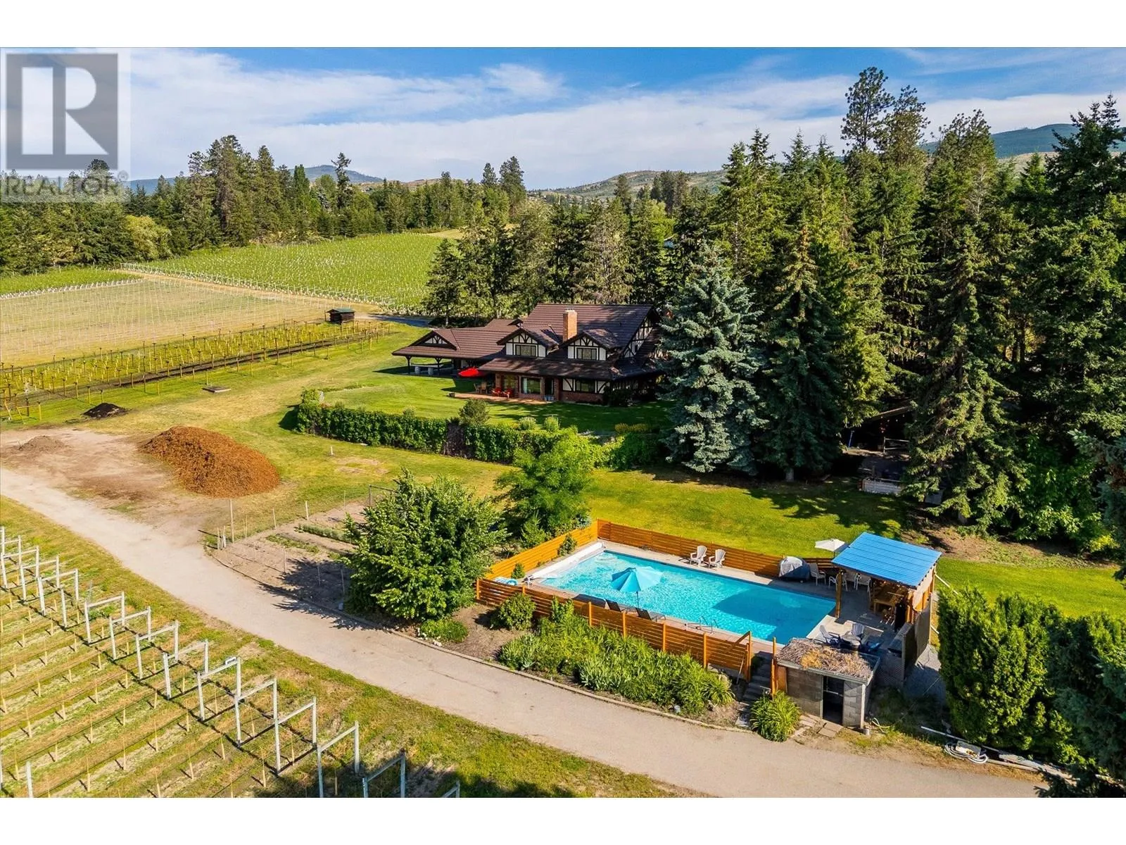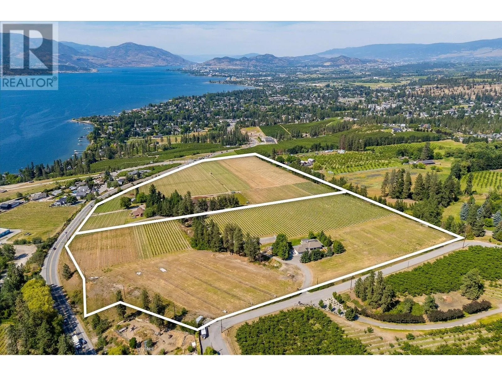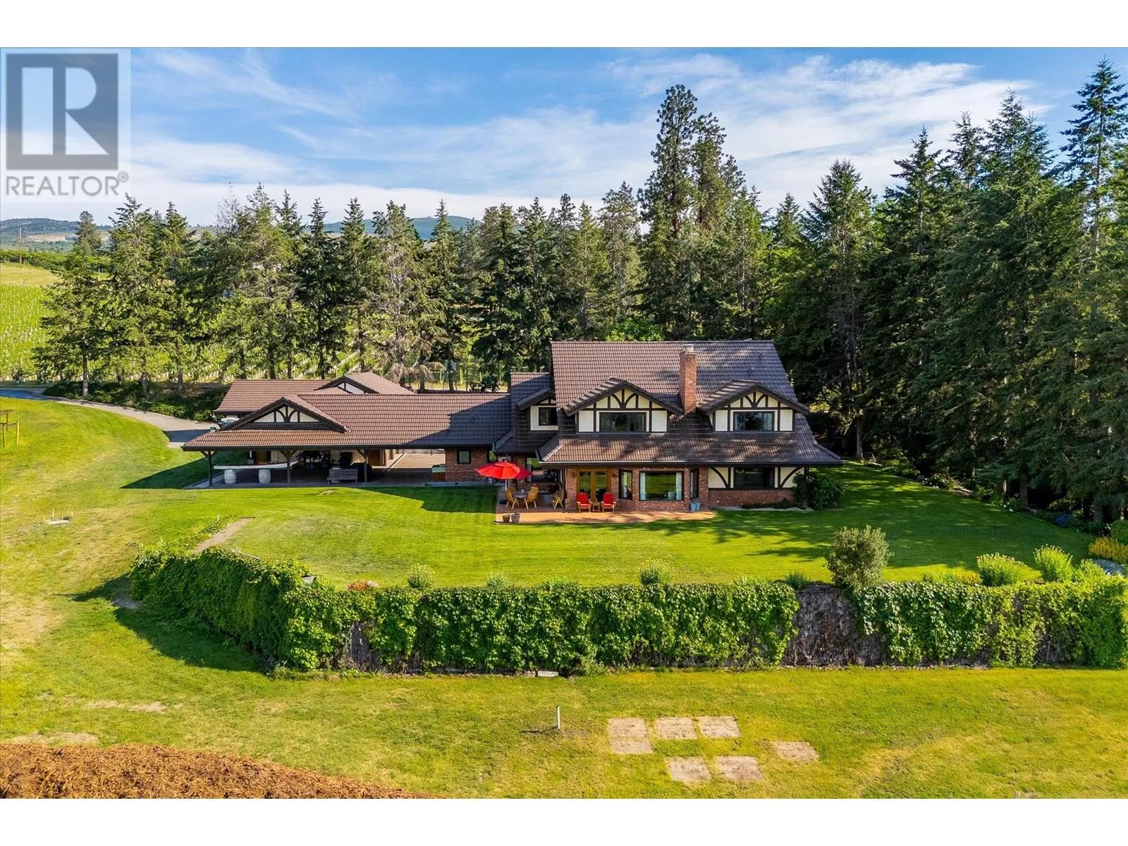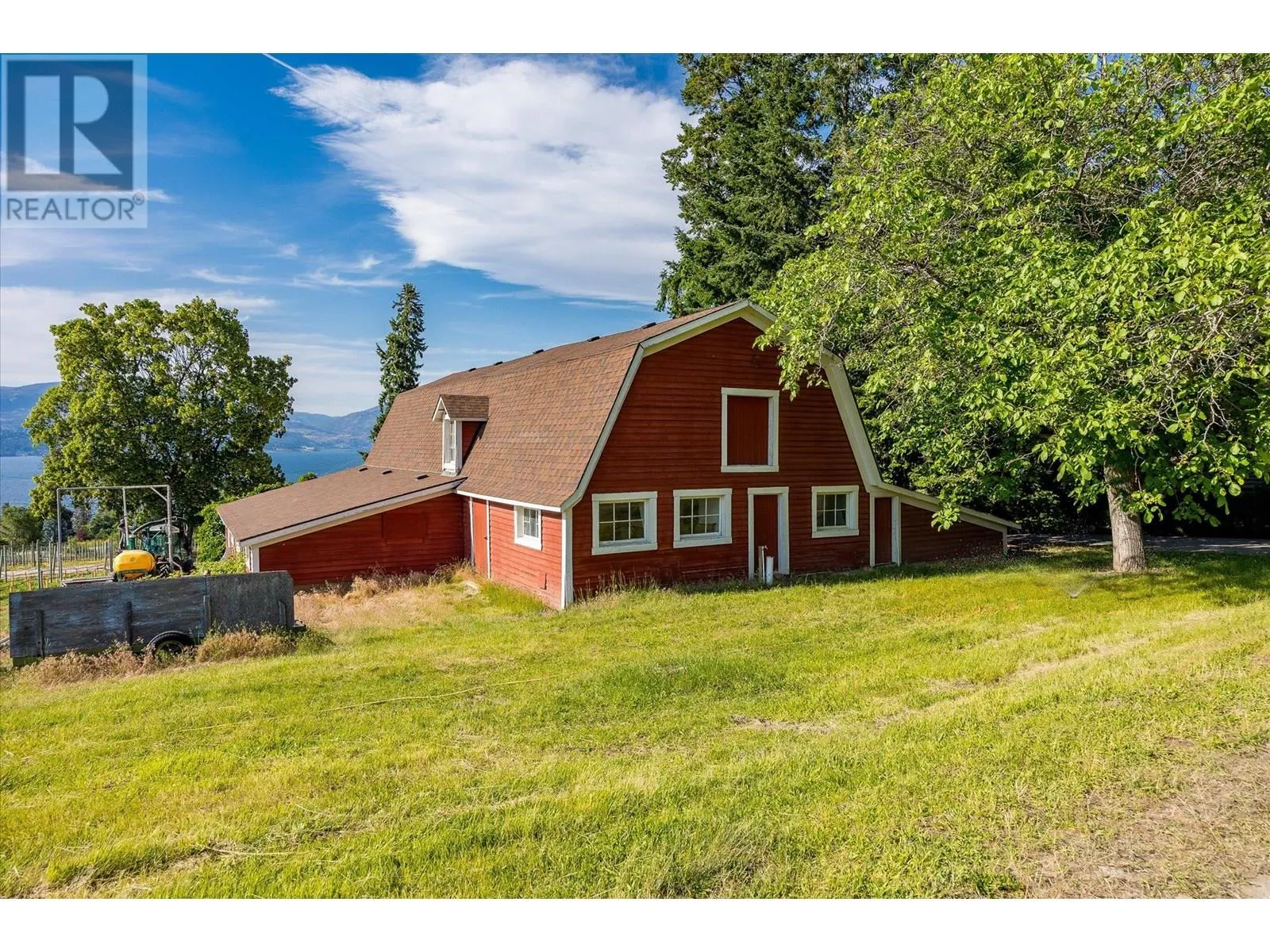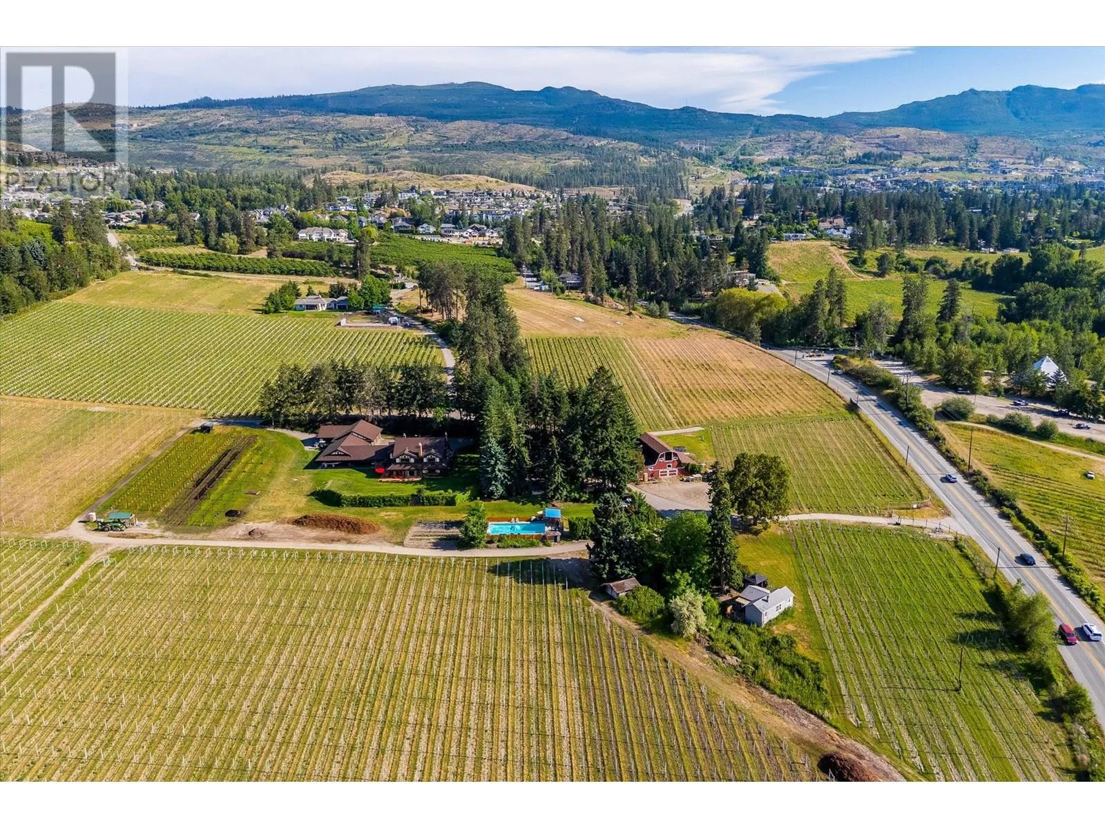 K & V Vineyards (4855 Chute Lake Rd. and 4895 Frost Rd.) is a 40-acre private estate located above Okanagan Lake, just minutes from downtown Kelowna. The property features a stunning European Craftsman residence with 7,442 SF of handcrafted living space, including 5 bedrooms, 6 bathrooms, and numerous custom details, all surrounding a spacious courtyard. An oversized garage and workshop are connected by a breezeway. The second residence is a 3,900 SF rancher with a covered backyard patio, perfect for enjoying sunset views and the natural beauty of the Okanagan. Additional structures include a renovated log cabin and a vintage red barn, adding character to the estate. The fully fenced and irrigated grounds sit on a gentle northwest-facing slope, with rows of vines aligned north-south for optimal sun exposure and mountain breezes, creating excellent growing conditions. The current plantings include 6 acres of Pinot Gris, 5 acres of Riesling, and 4 acres of Pinot Noir, established in May 2025, with plans for future plantings of Chardonnay and additional Pinot Noir. The estate is well-suited for managing and leasing to a reputable winery, offering a rare opportunity to enjoy luxurious living while operating an agricultural enterprise. (id:27476)