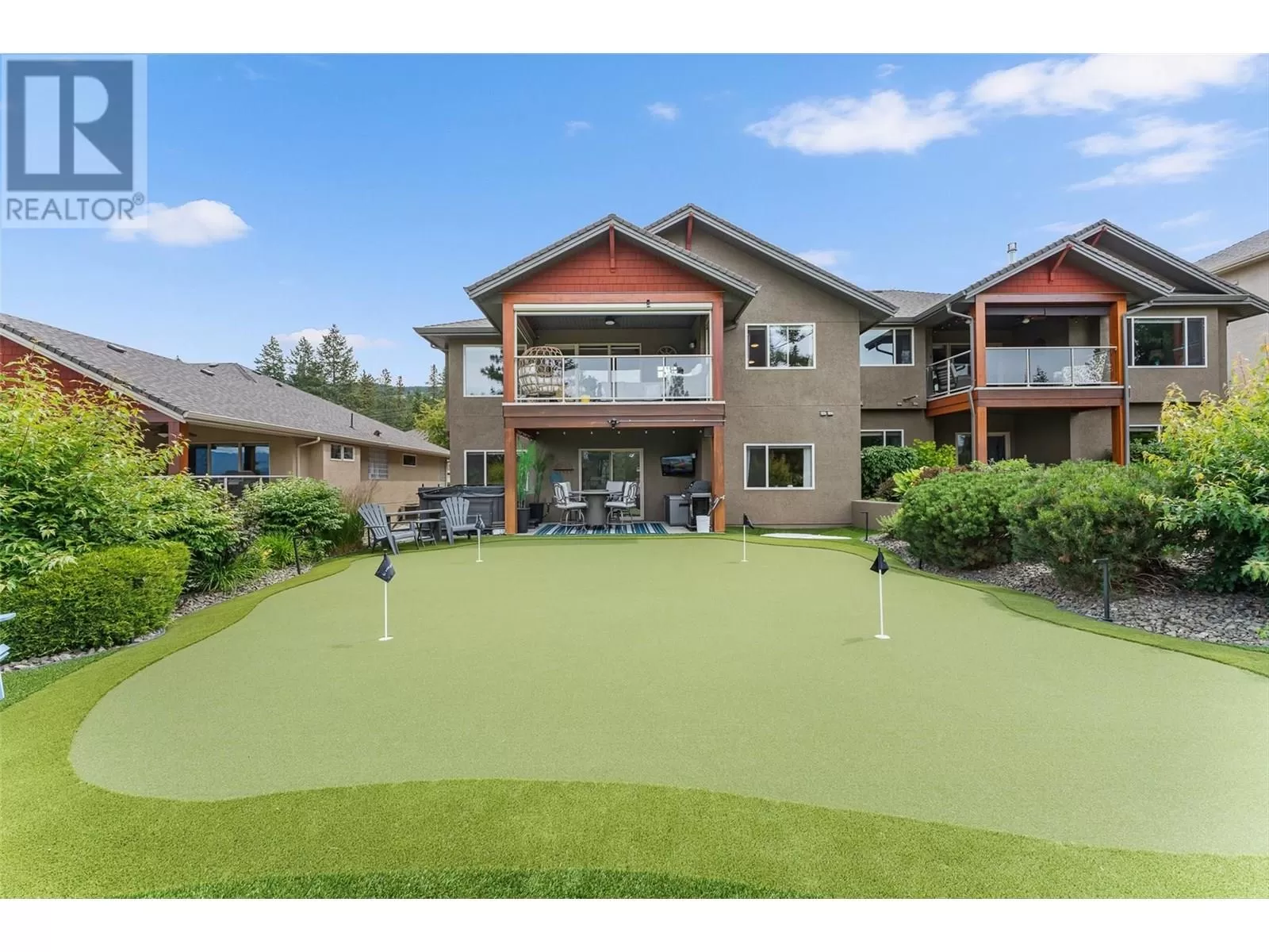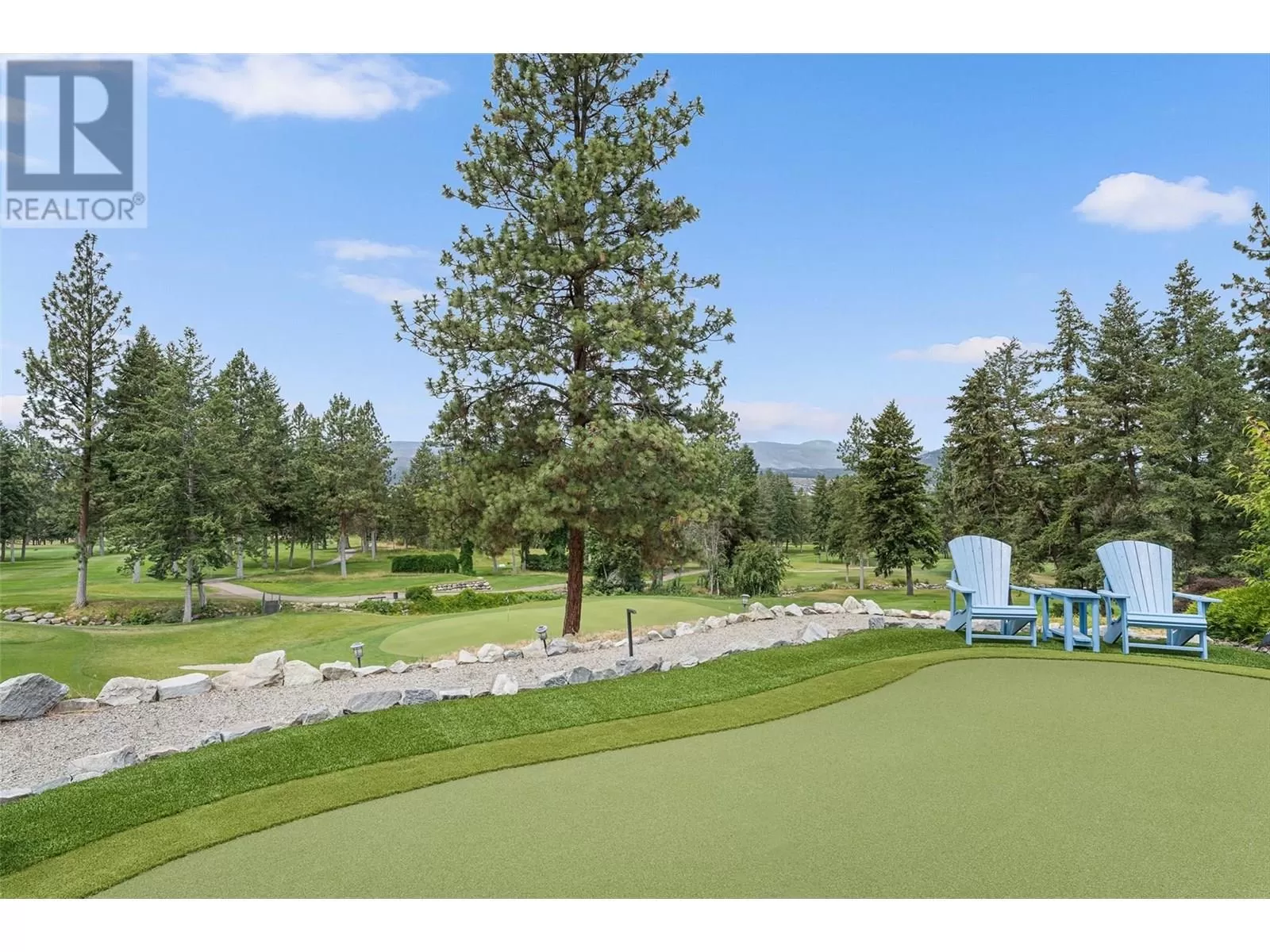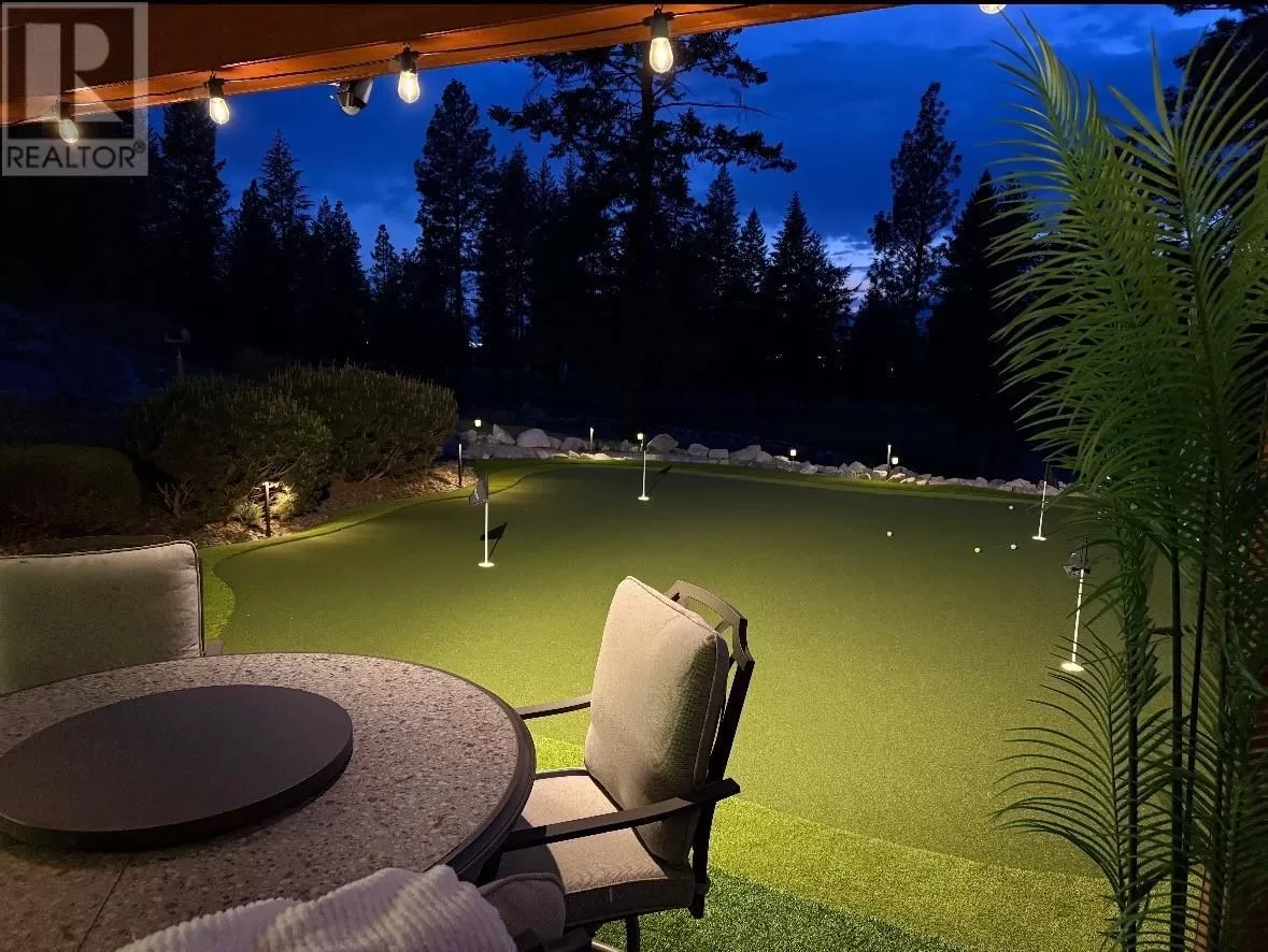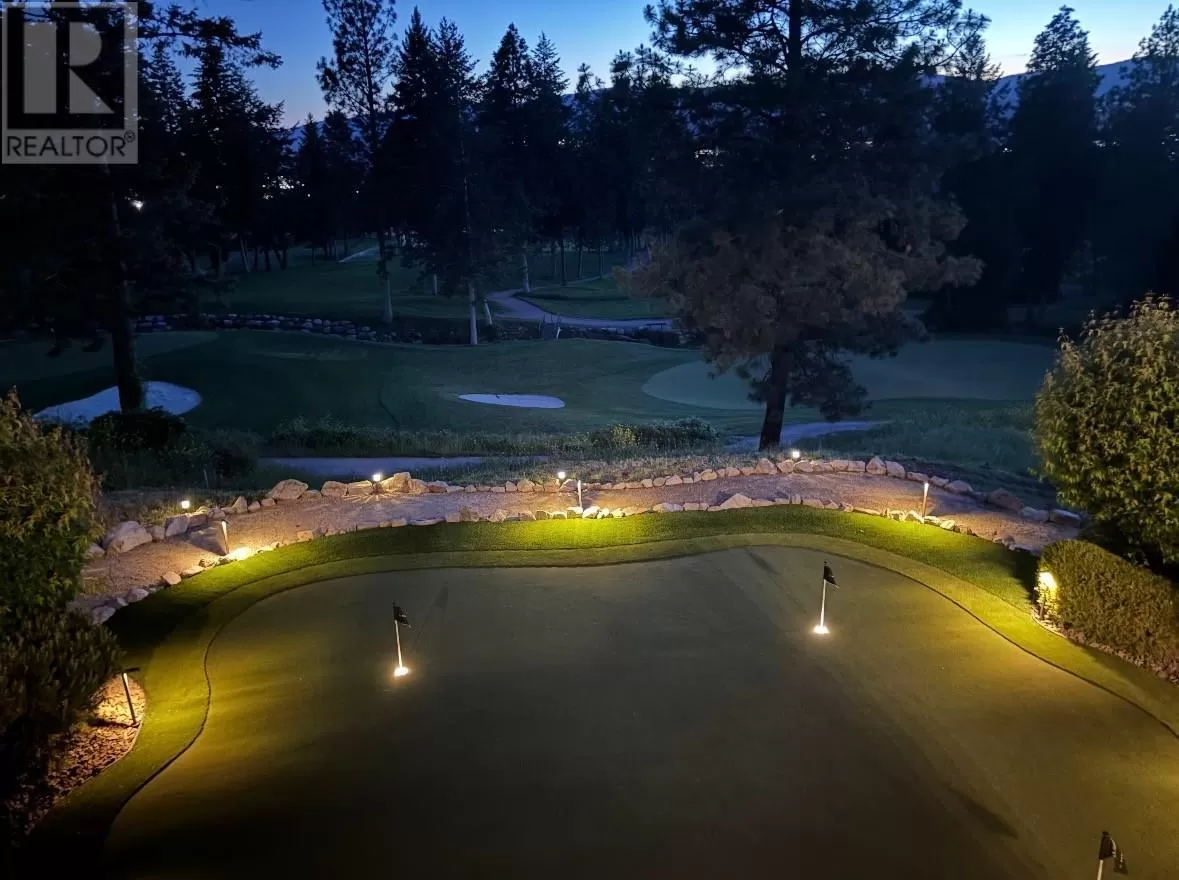 Stylishly updated and perfectly positioned on the 2nd and 13th green at Sunset Ranch, this golf-side villa offers the ideal blend of privacy, luxury, and low-maintenance living. Bathed in natural light, the main level showcases an open-concept layout with vaulted ceilings, warm toned hardwood floors, and a freshly updated kitchen with granite counters, stainless steel appliances, and soft blue cabinetry that adds a designer touch. Enjoy seamless indoor-outdoor living with a spacious dining area and covered balcony overlooking the lush greenway complete with electric privacy shades and tranquil golf course views. A custom-designed office by Taylor Living, elegant lighting upgrades, and a professionally installed putting green with ambient lighting. The main level includes a generous primary suite with walk-in closet and ensuite, while the lower level offers a large family room, guest bedrooms, and ample space for entertaining or extended family stays. Bonus opportunity: the neighbouring unit is also available an incredibly rare chance to purchase side-by-side homes for multi-generational living in one of Kelownaâs most scenic gated communities. (id:27476)