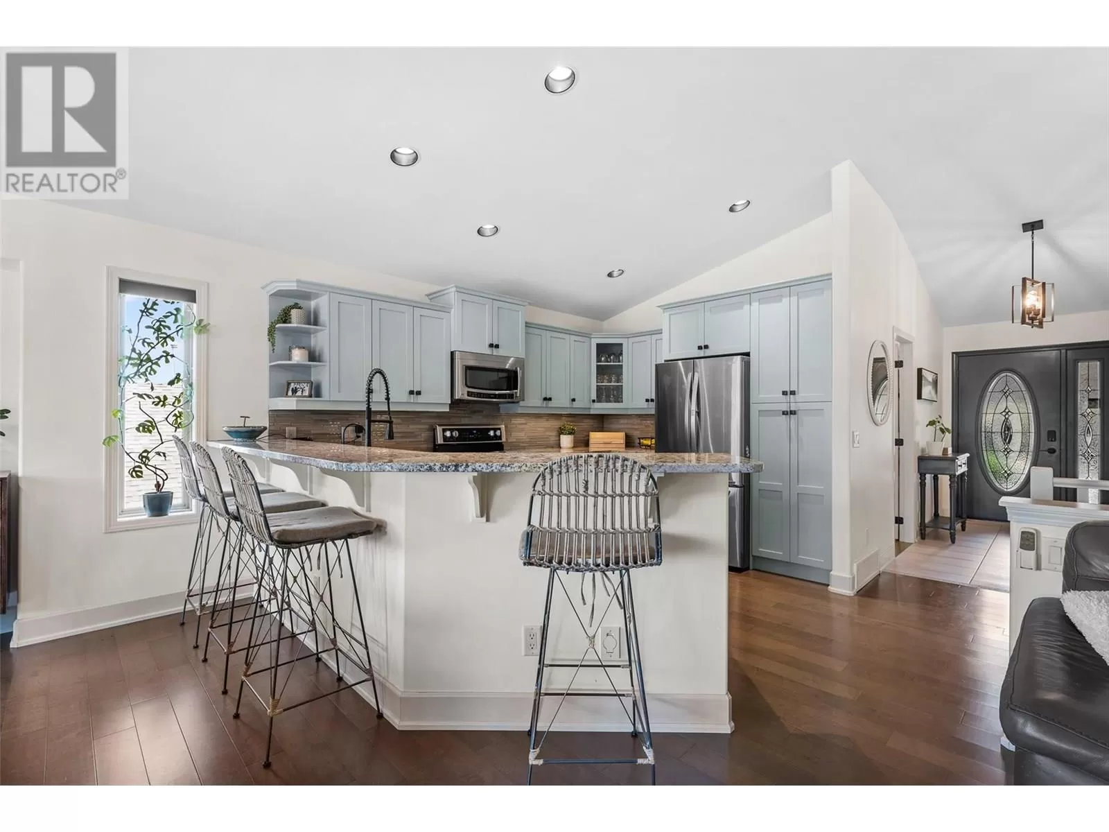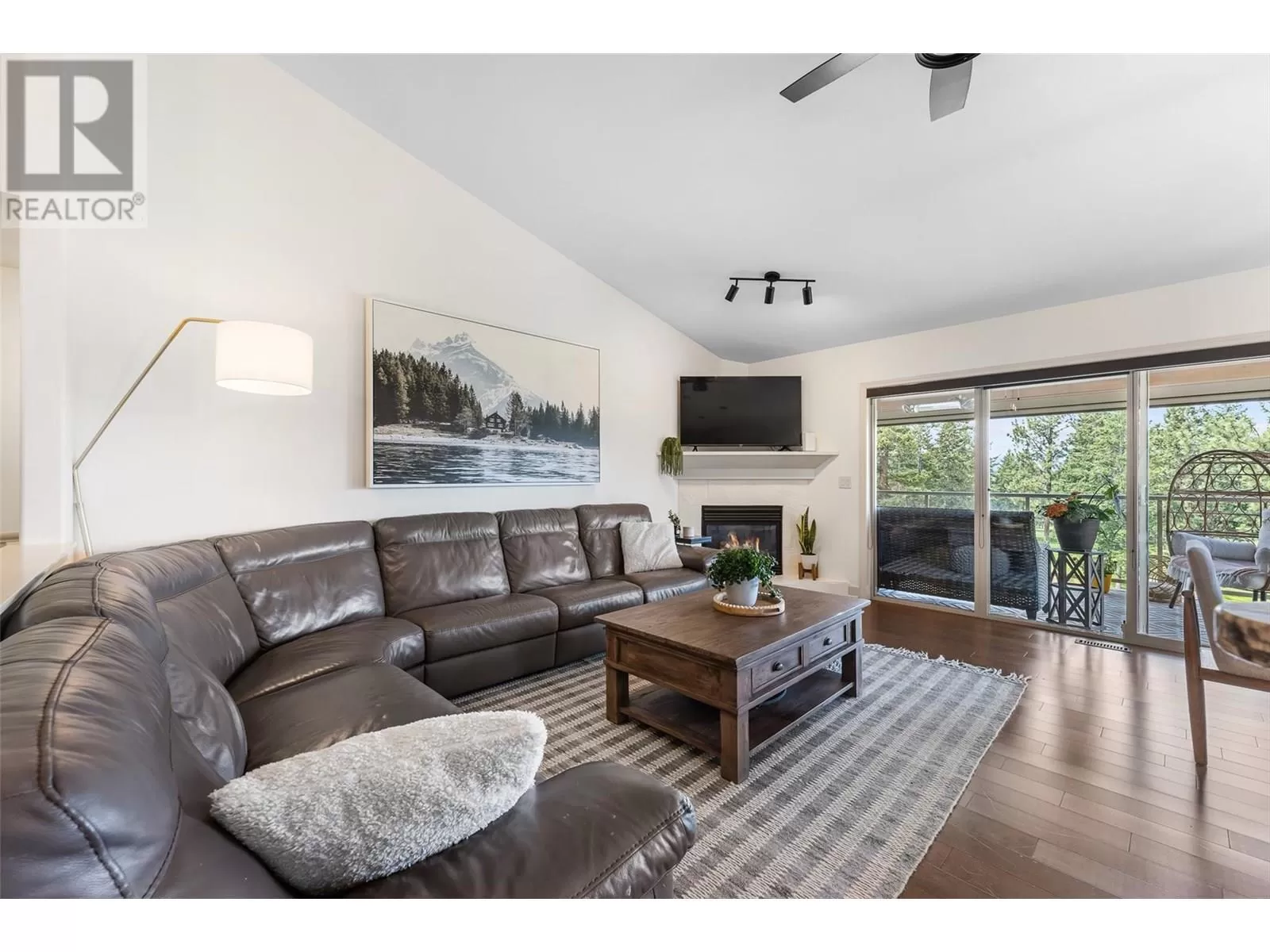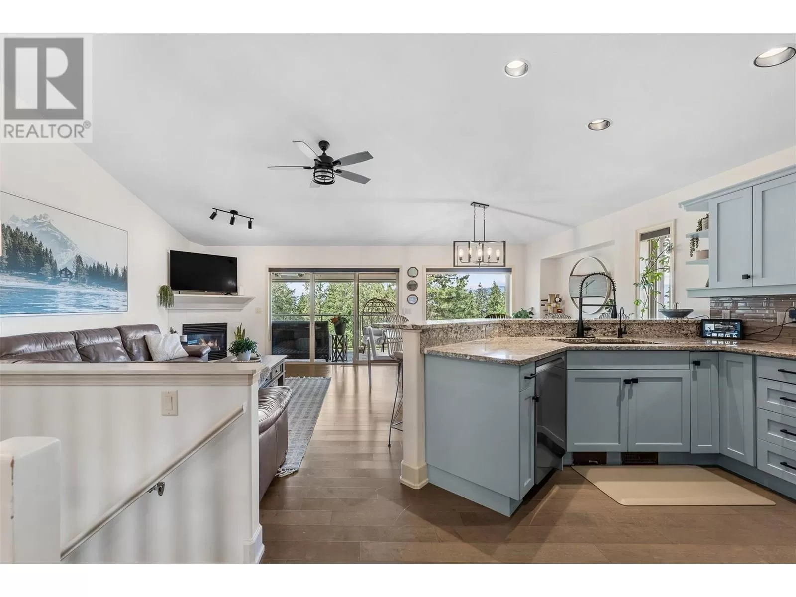 Stylishly updated and perfectly positioned on the 2nd and 13th green at Sunset Ranch, this golf-side villa offers the ideal blend of privacy, luxury, and low-maintenance living. Bathed in natural light, the main level showcases an open-concept layout with vaulted ceilings, warm toned hardwood floors, and a freshly updated kitchen with granite counters, stainless steel appliances, and soft blue cabinetry that adds a designer touch. Enjoy seamless indoor-outdoor living with a spacious dining area and covered balcony overlooking the lush greenway complete with electric privacy shades and tranquil golf course views. A custom-designed office by Taylor Living, elegant lighting upgrades, and a professionally installed putting green with ambient lighting. The main level includes a generous primary suite with walk-in closet and ensuite, while the lower level offers a large family room, guest bedrooms, and ample space for entertaining or extended family stays. Bonus opportunity: the neighbouring unit is also available an incredibly rare chance to purchase side-by-side homes for multi-generational living in one of Kelownaâs most scenic gated communities. (id:27476)