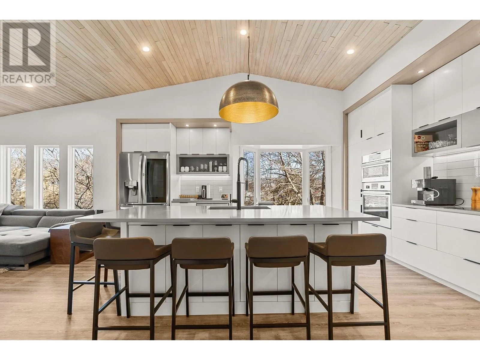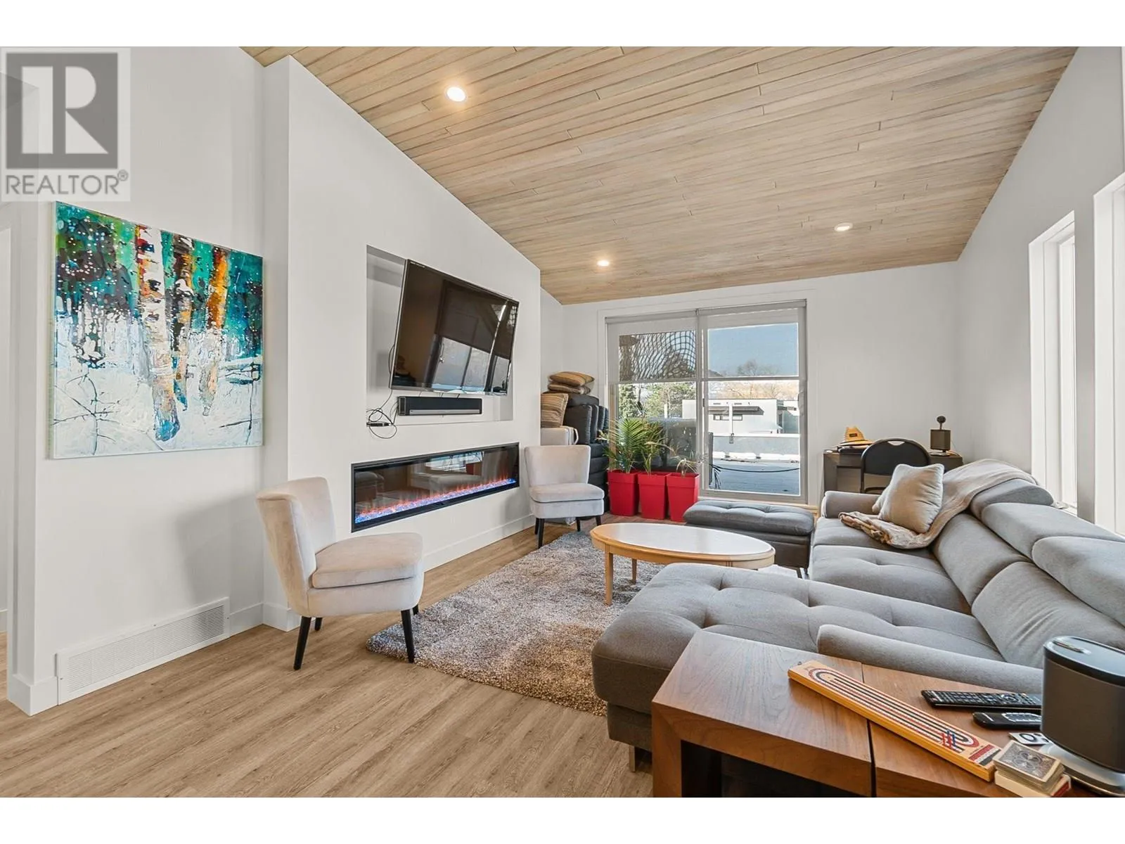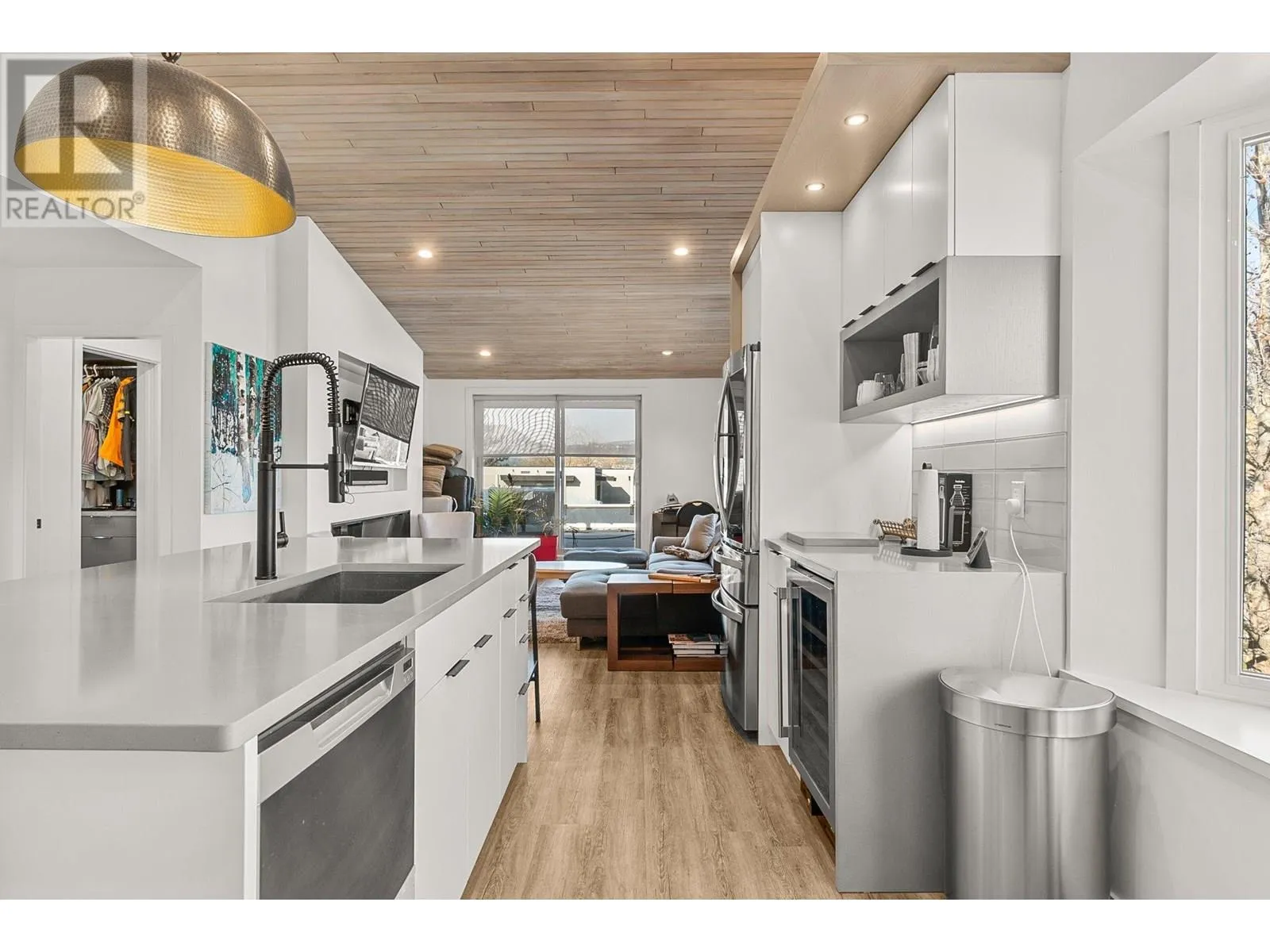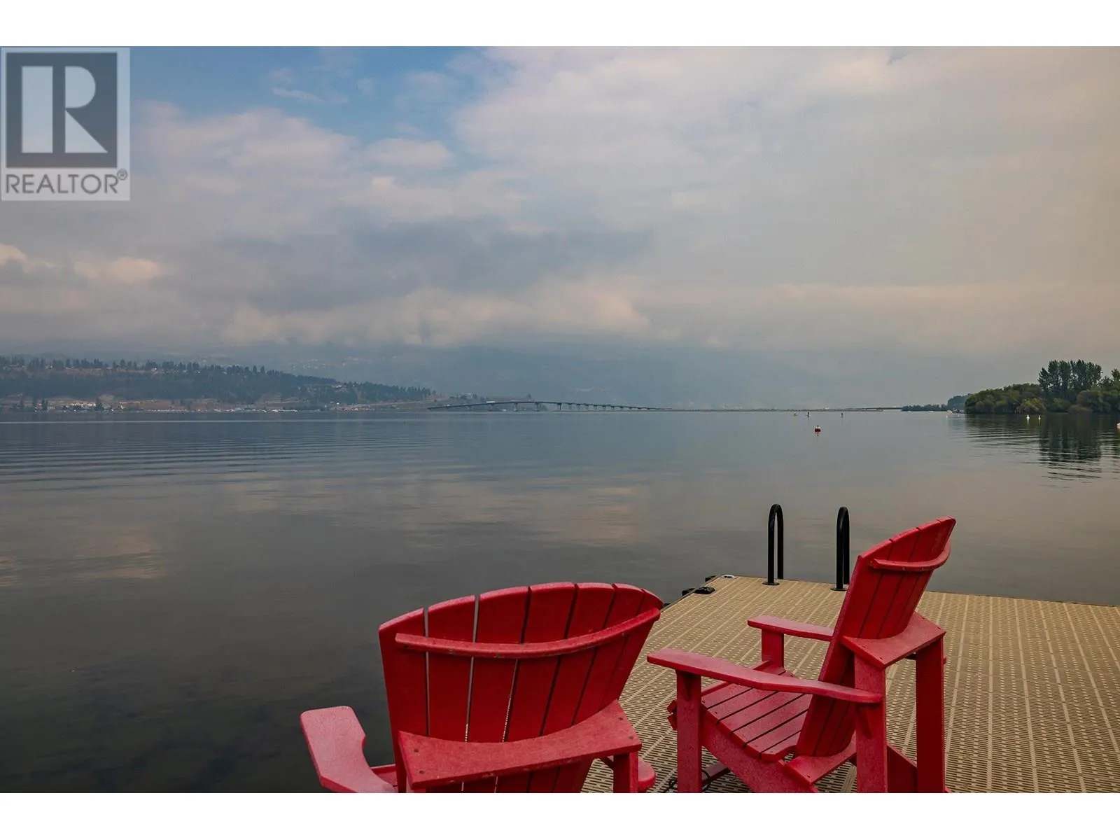 OPEN HOUSE, SUNDAY, NOVEMBER 9, 2025 1PM - 3PM HOSTED BY JENNIFER SCHWITZER, CANADA FLEX REALTY 250-258-3967. Welcome to the best kept secret on the waterfront in the heart of Pandosy Village area! Must sought after area and this complex is a hidden gem! Located on Lake Okanagan with 350 feet of beachfront this complex offers the finest waterfront experience while being affordable. This unit is completely renovated, open floor plan with 3 bedrooms that accommodates 8 sleeping comfortably, 2 full baths including a steam shower in the primary suite. Enjoy the most of summer living with the outdoor pool, hot tub, generous grass area and your own private boat slip with lift. Top floor unit with soaring vaulted cedar lined ceiling. A complete renovation in 2021 includes high end kitchen with quartz countertops, stainless steel appliances, wine fridge, induction stove, heated tile bathroom floors, electric fireplace...no details were overlooked. The attic provides for additional storage and accommodates all the mechanical units. Come take a look today and join the other 30 owners living the Okanagan dream!! (id:27476)
