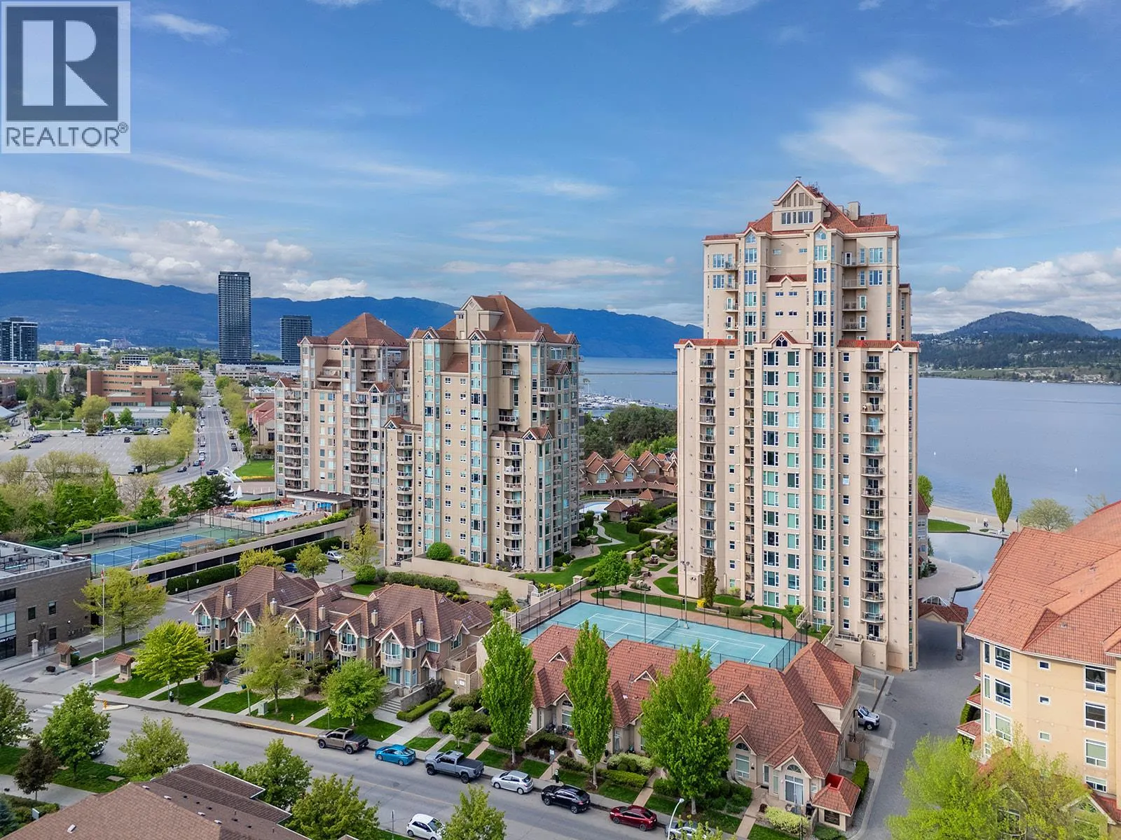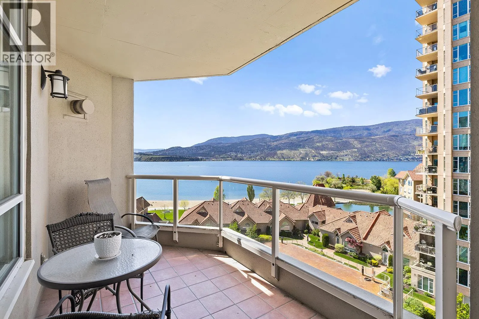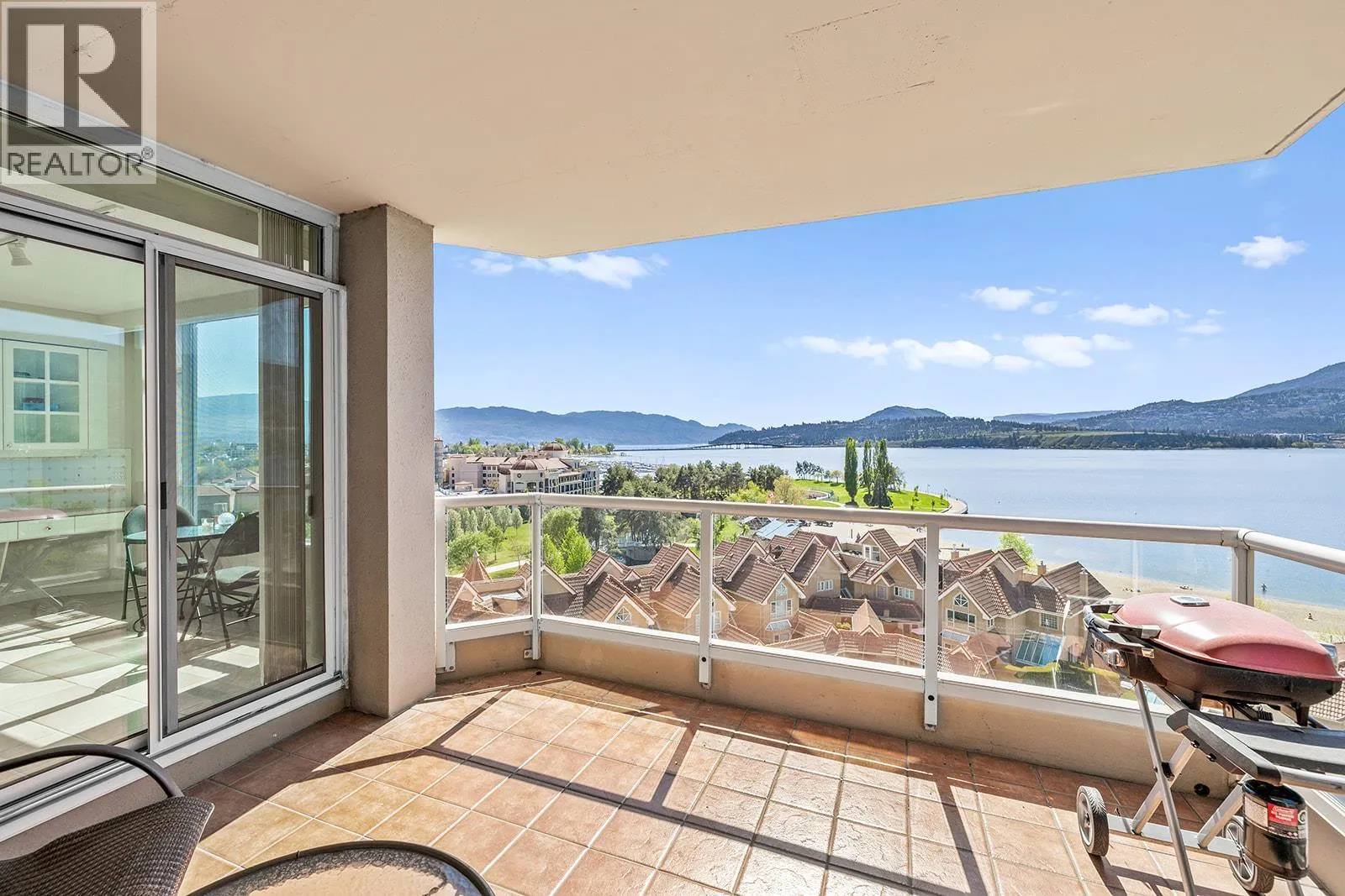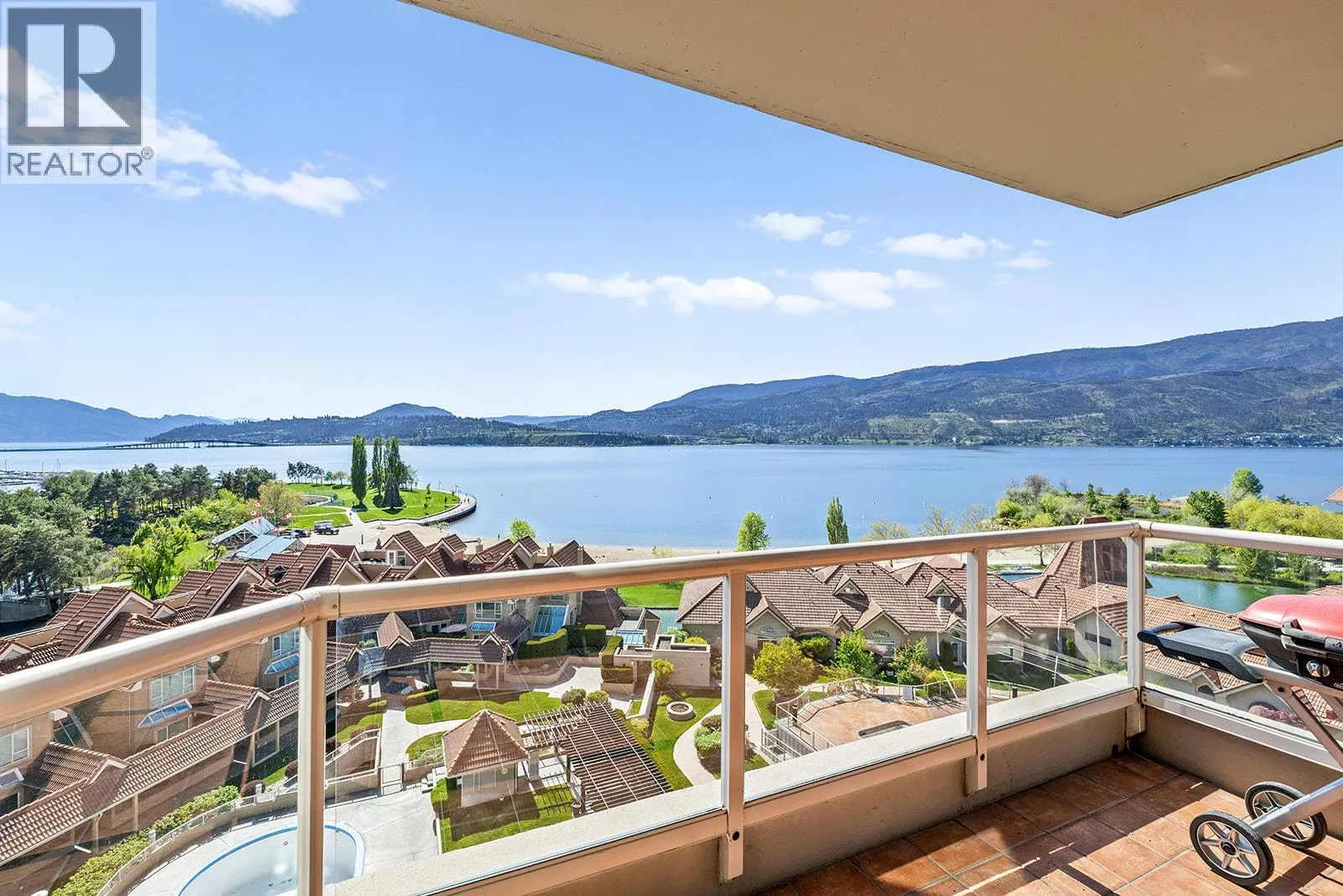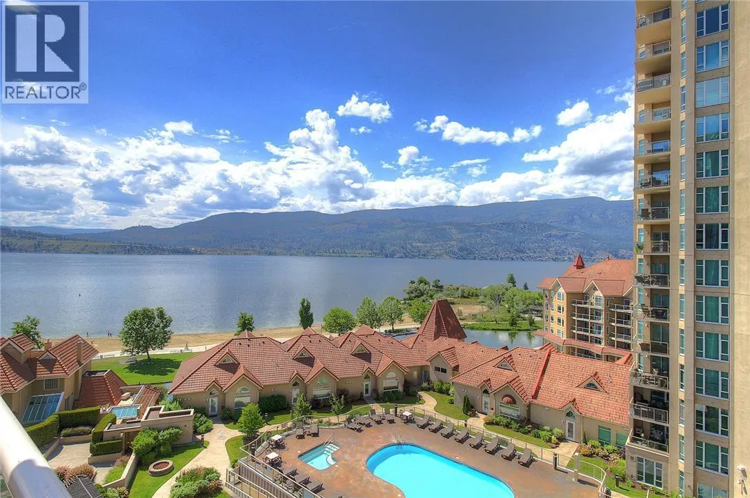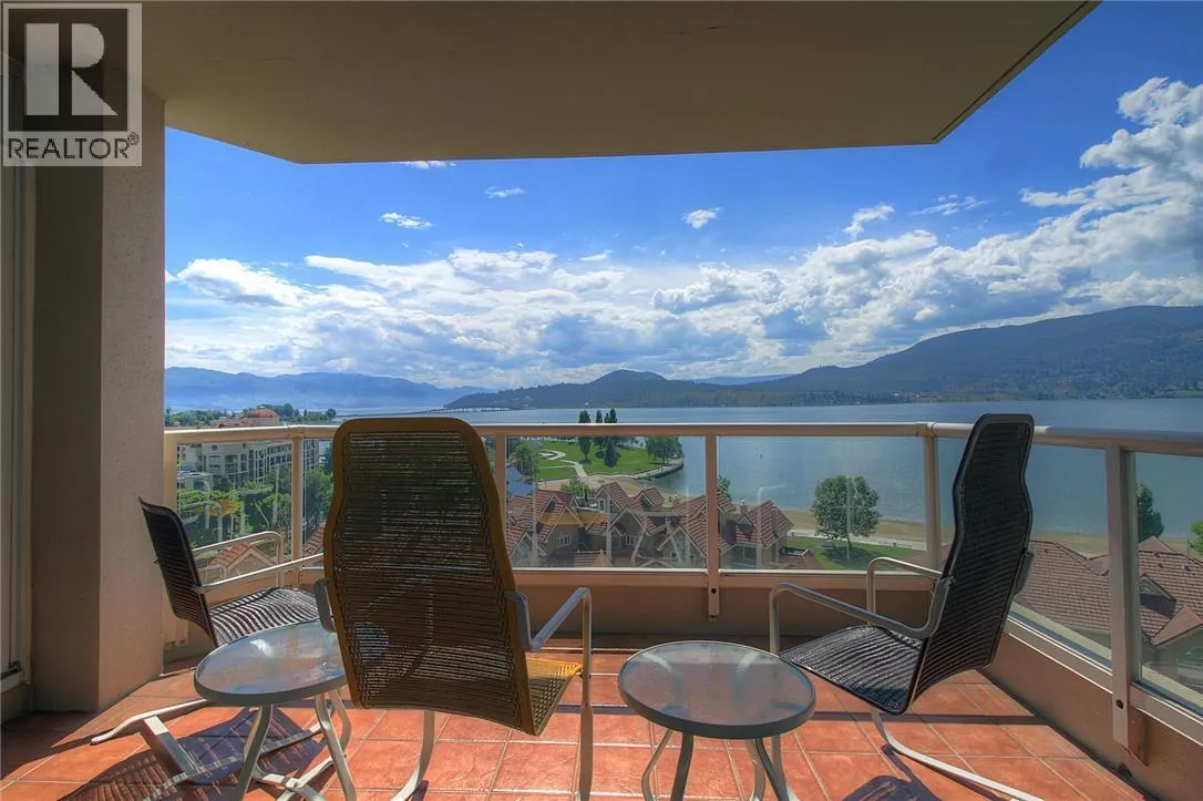 An incredible Opportunity to own one of these exceptionally rare units and with some updates substantially increase the value. â The panoramic views will leave you absolutely captivated and knowing no one will ever build in front of you will keep your investment secure. This spacious condo boasts over 1,400 sq. ft. of comfortable living space and includes TWO side-by-side parking stalls. Newer engineered hardwood floors flow throughout the main living areas, and enhance the open-concept design. The bright and airy living room showcases stunning vistas of Okanagan Lake, the bridge, and surrounding mountains, framed by expansive windows and patio doors that flood the space with natural light. A cozy gas fireplace adds charm for those cool winter evenings. The kitchen connects to a generous covered deck, perfect for enjoying morning coffee or evening sunsets overlooking the lake, city, and bridge. A large dining area between the kitchen and living room makes entertaining effortless. The primary suite also has a private deck with views, an ensuite with a soaker tub and separate shower, A dedicated laundry room with a sink and extra storage adds everyday convenience. The Lagoons offers an unmatched lifestyle with exceptional amenities, including indoor and outdoor pools, a sauna, hot tub, fully equipped fitness centre, secure bike storage, and even the potential for boat moorage on the canal. Located just from the beach, restaurants, shopping, the arena, and theatre. (id:27476)