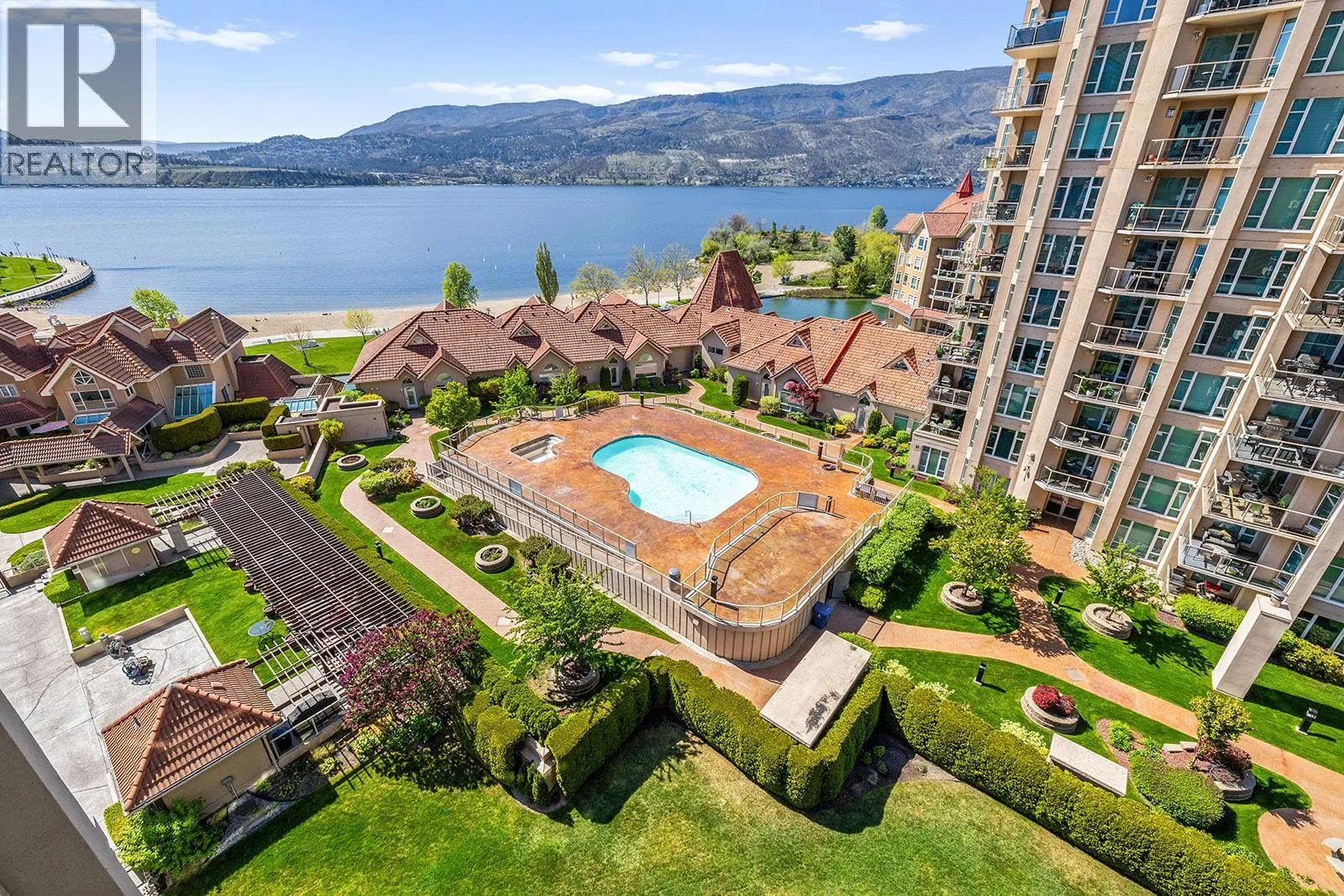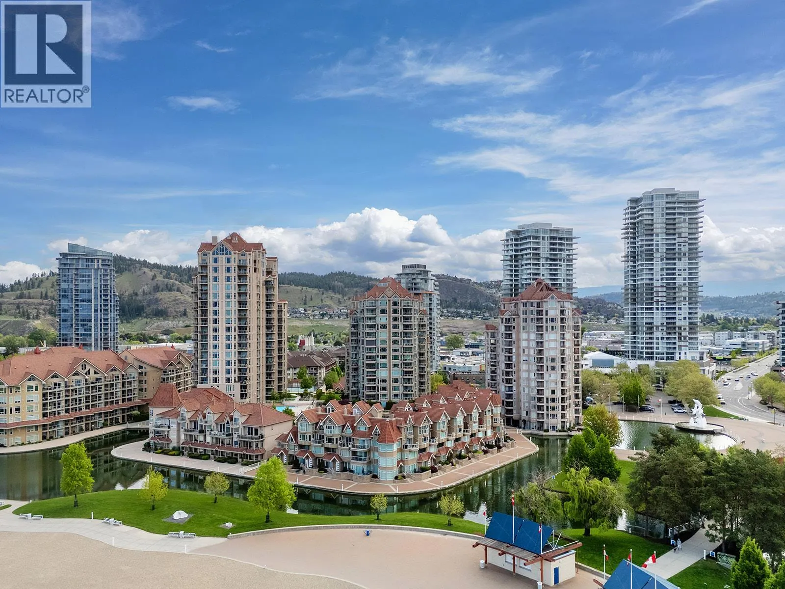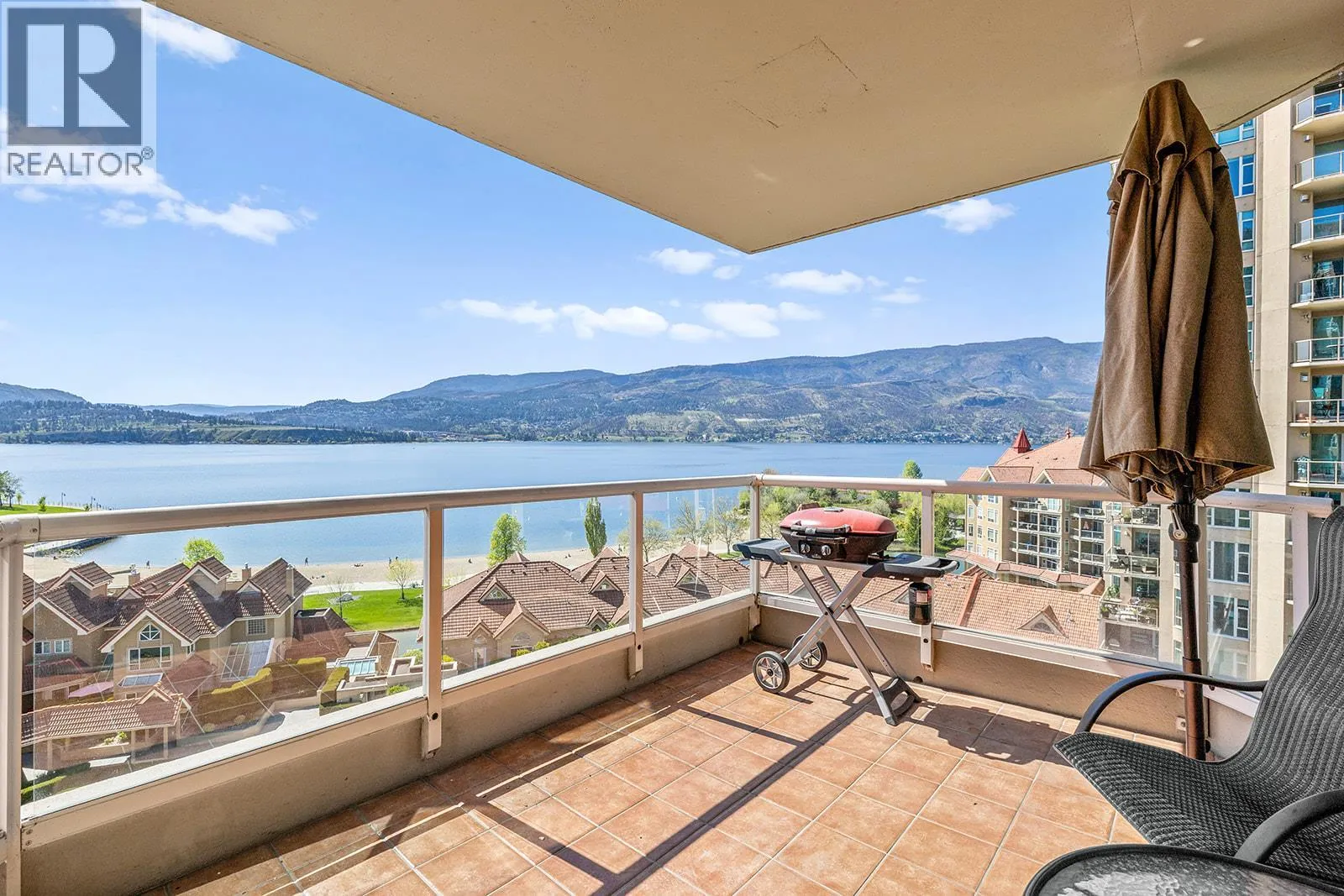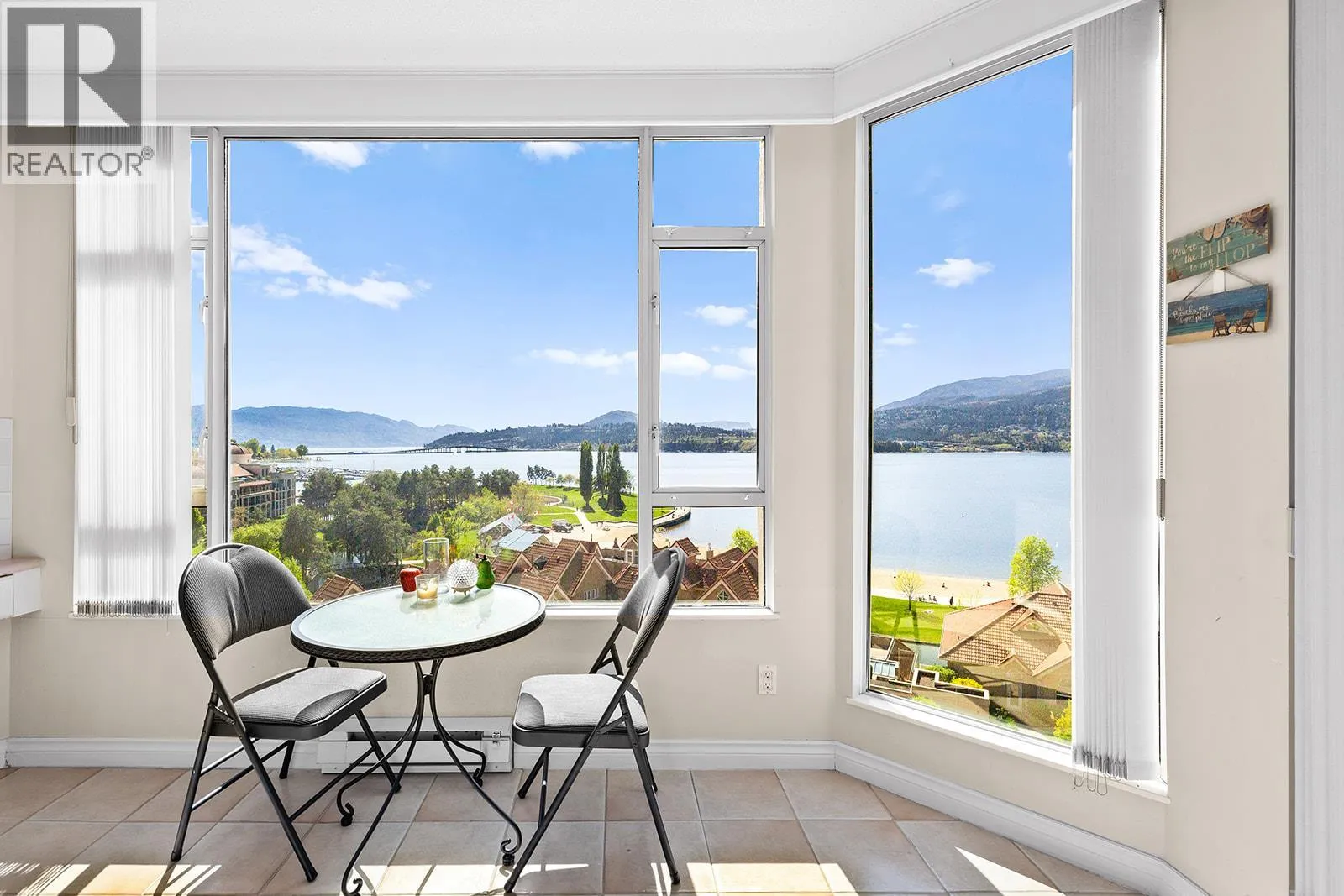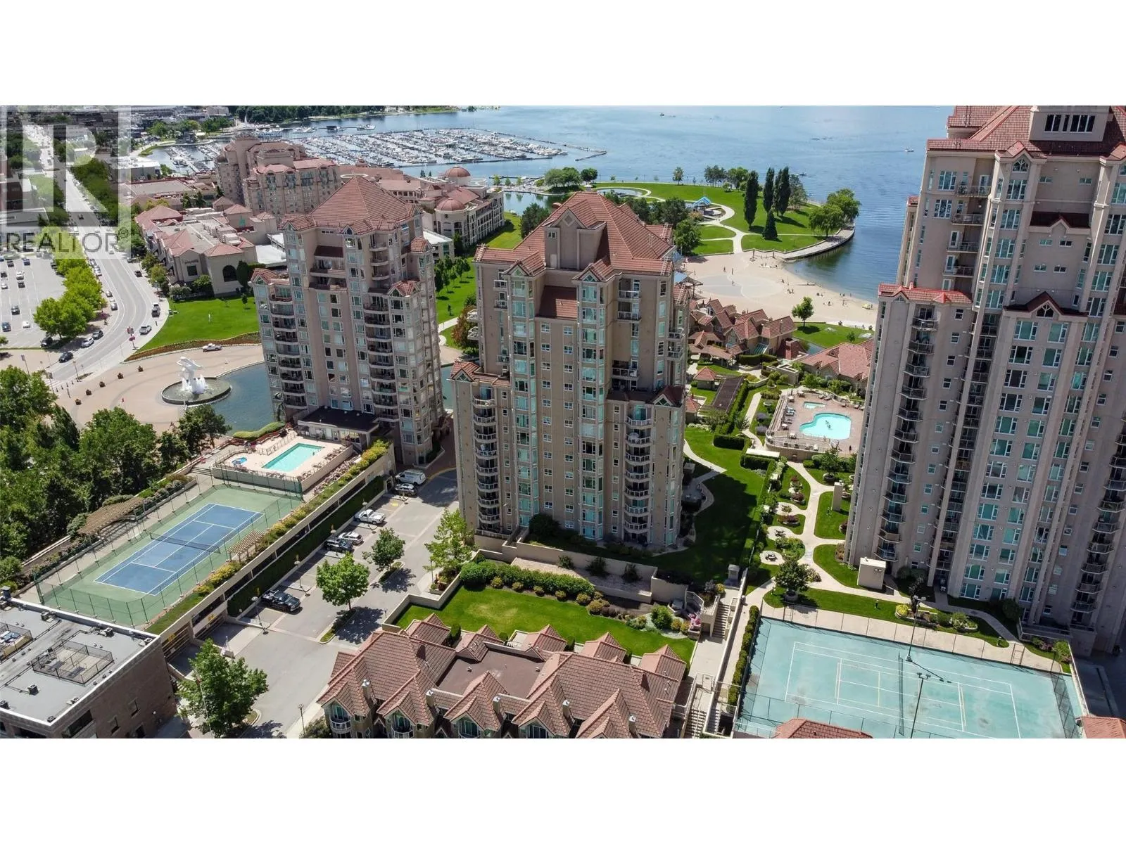 An incredible Opportunity to own one of these exceptionally rare units and with some updates substantially increase the value. â The panoramic views will leave you absolutely captivated and knowing no one will ever build in front of you will keep your investment secure. This spacious condo boasts over 1,400 sq. ft. of comfortable living space and includes TWO side-by-side parking stalls. Newer engineered hardwood floors flow throughout the main living areas, and enhance the open-concept design. The bright and airy living room showcases stunning vistas of Okanagan Lake, the bridge, and surrounding mountains, framed by expansive windows and patio doors that flood the space with natural light. A cozy gas fireplace adds charm for those cool winter evenings. The kitchen connects to a generous covered deck, perfect for enjoying morning coffee or evening sunsets overlooking the lake, city, and bridge. A large dining area between the kitchen and living room makes entertaining effortless. The primary suite also has a private deck with views, an ensuite with a soaker tub and separate shower, A dedicated laundry room with a sink and extra storage adds everyday convenience. The Lagoons offers an unmatched lifestyle with exceptional amenities, including indoor and outdoor pools, a sauna, hot tub, fully equipped fitness centre, secure bike storage, and even the potential for boat moorage on the canal. Located just from the beach, restaurants, shopping, the arena, and theatre. (id:27476)