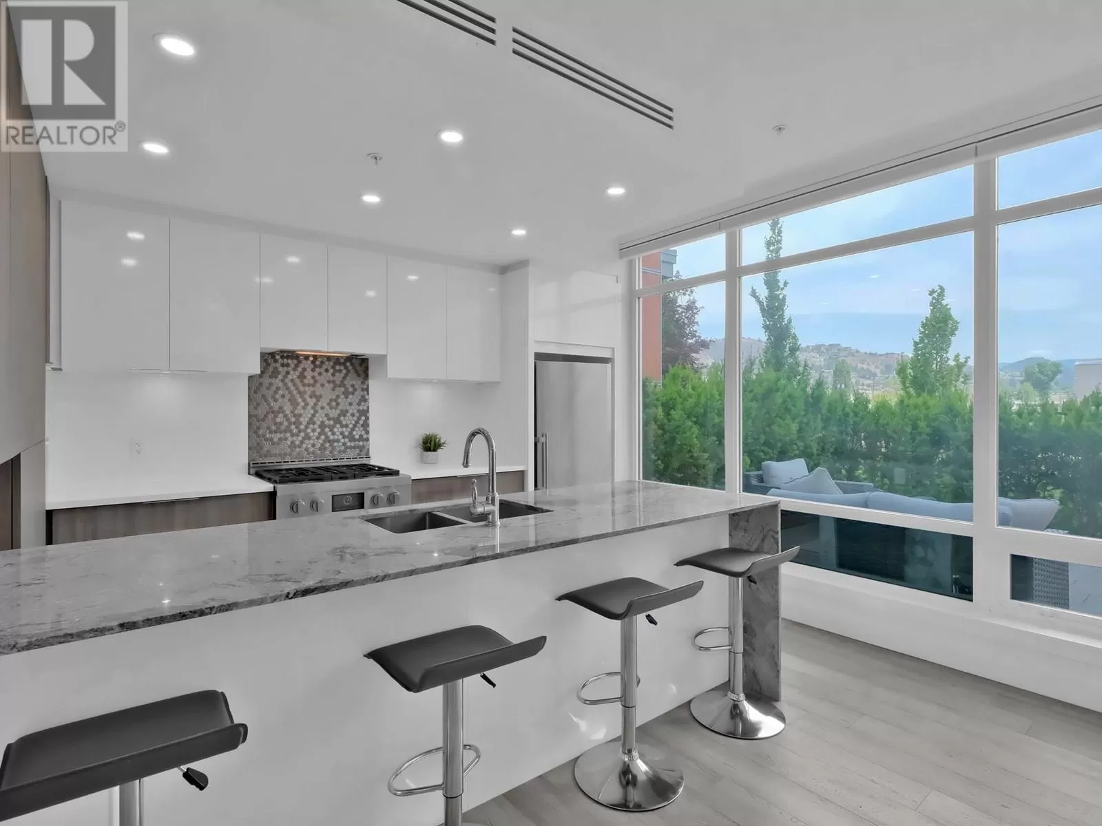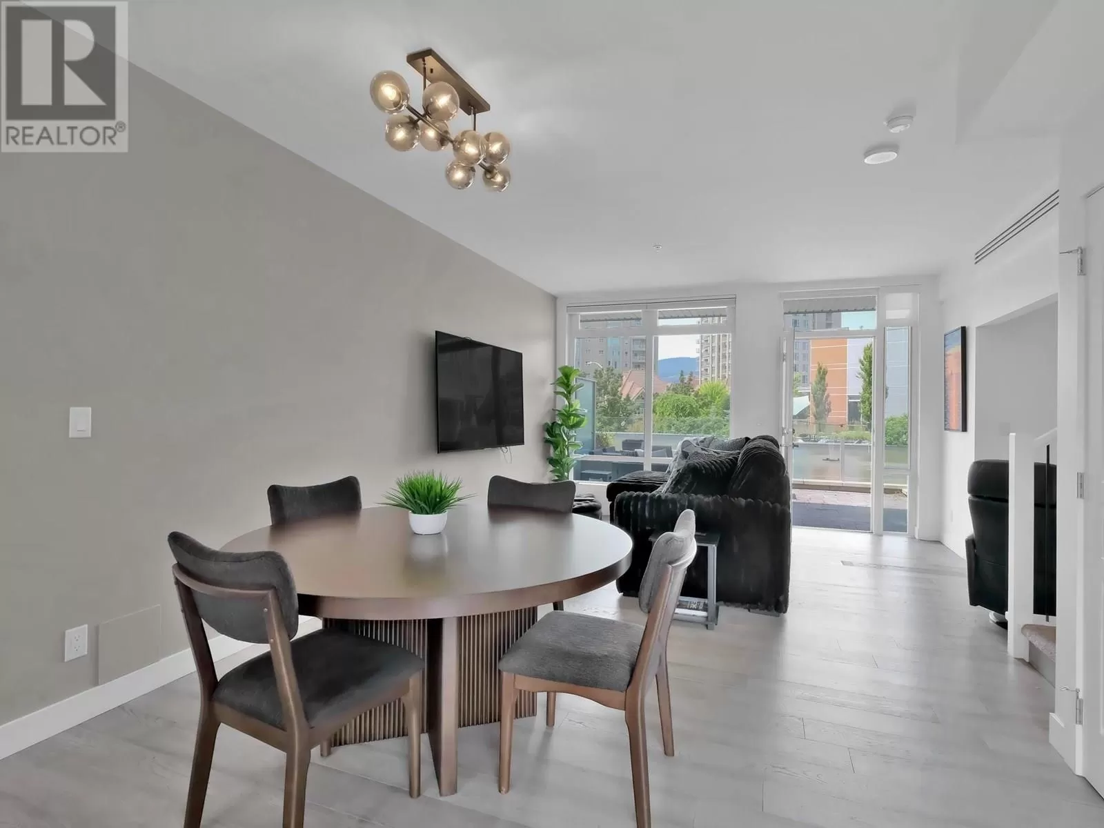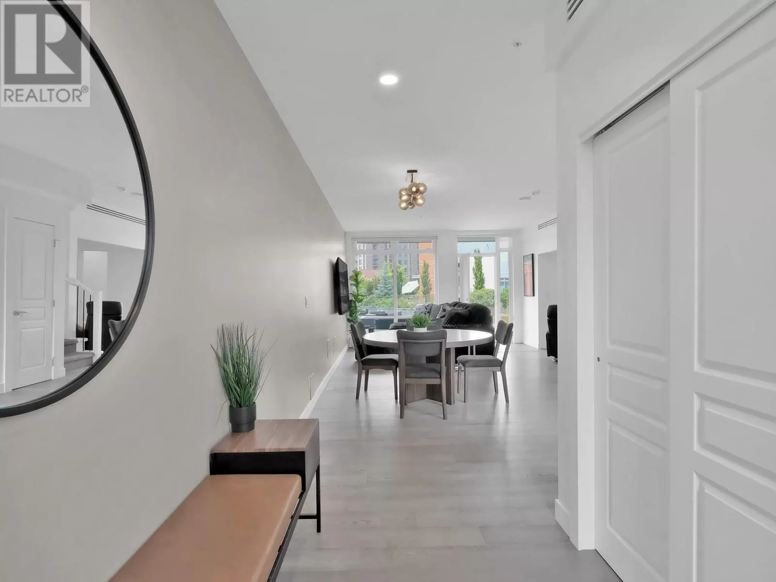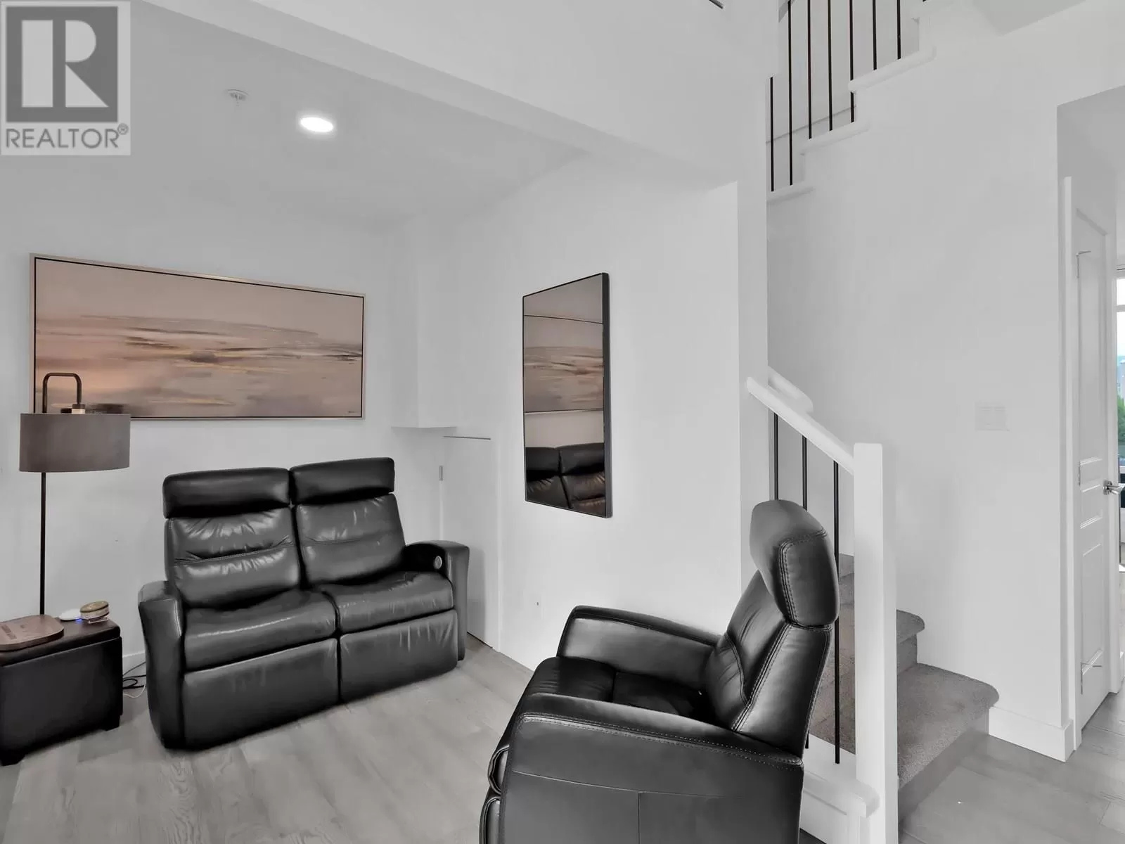 Stunning luxury townhouse in the heart of downtown, just steps from the lake and surrounded by top-tier amenities including the yacht club, coffee shops, restaurants, shopping, beaches, hiking trails, and a bird sanctuary. With a fabulous floor plan and high-end finishings throughout, this home is flooded with natural light. The gourmet chefâs kitchen boasts waterfall granite countertops, soft-close cabinetry, and a beverage center with bar fridge. The open-concept living and dining area extends to a private patio overlooking a tranquil water featureâperfect for BBQs and entertaining. Upstairs, the king-sized primary suite offers mountain views, a walk-in closet, and a spa-inspired ensuite with a soaker tub, walk-in glass shower, and double vanity. Two additional bedrooms, a full bathroom, and a convenient laundry area complete the upper level. This home offers the convenience of two parking stalls, one underground and one uncovered, along with being pet-friendly ( 2 pets with max of 50 lbs each). It's ideally situated in a highly sought-after, walkable downtown location, providing ideal urban living! (id:27476)