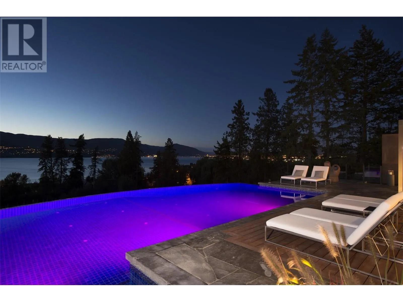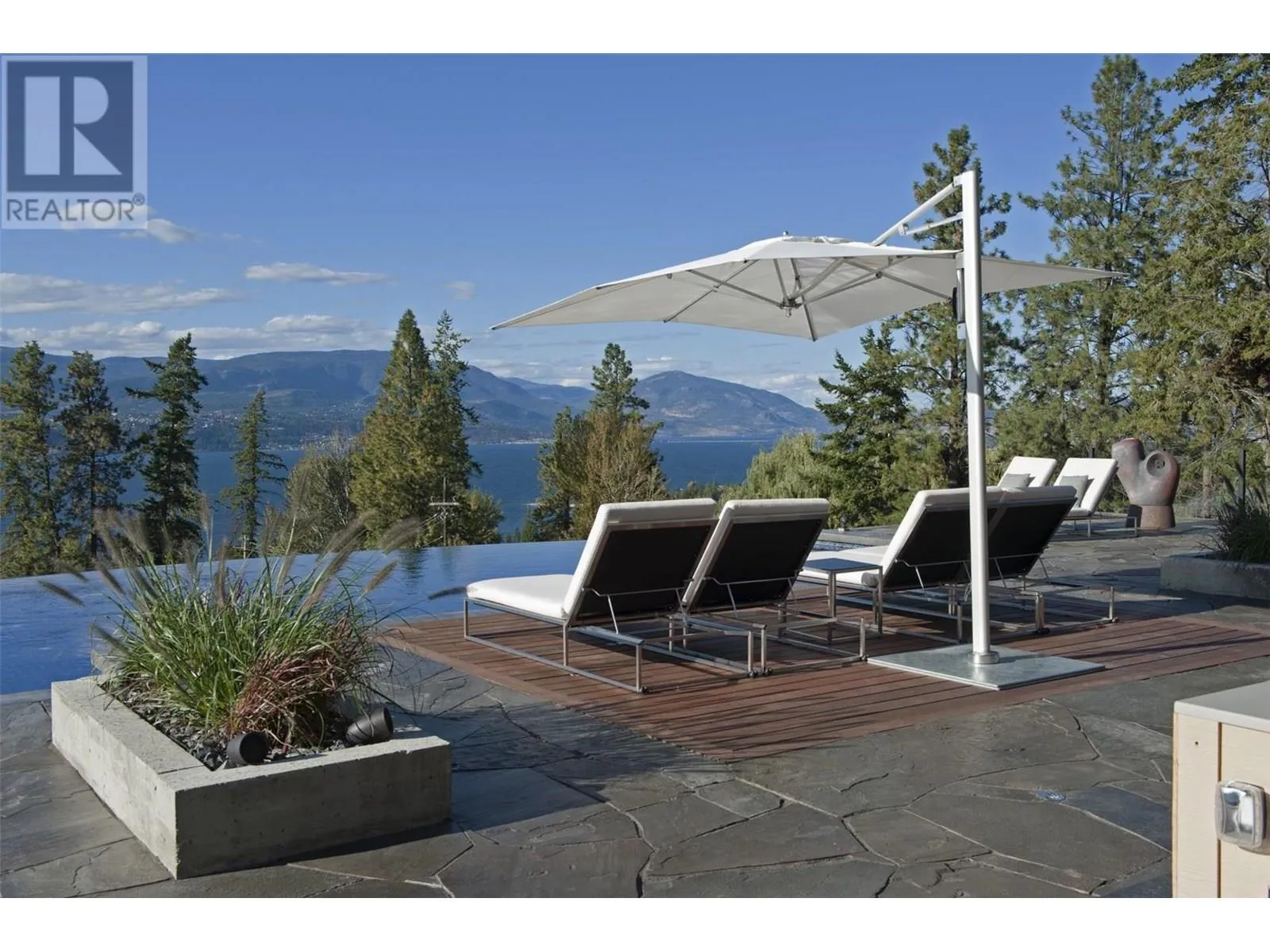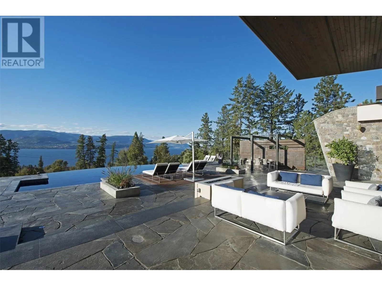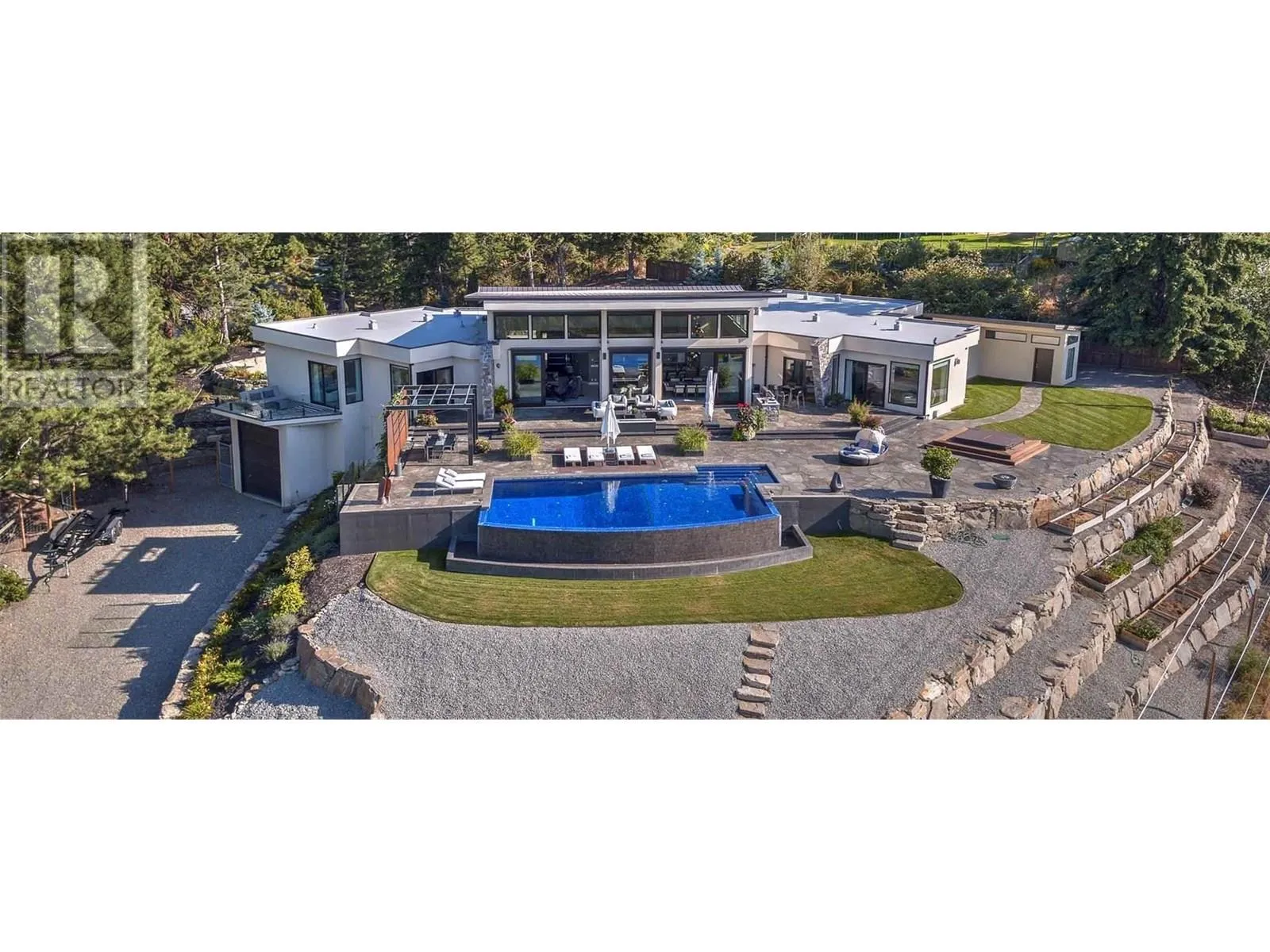 Private estate home set on 2.05 acres and perfectly positioned to capture the stunning lake, city and vineyard views. Enjoy an expansive flagstone patio with a spectacular negative edge saltwater infinity pool that creates a resort-like setting with room to lounge, entertain and take in the breathtaking views. Gated entry leads to heated triple garage & single garage plus RV garage. Upon entering the home youâll notice walls of glass showcase views of the pool, lake and beyond. Soaring ceiling height w/floor to ceiling windows & sliding wall system create a seamless extension to the outdoors with the open concept great room, dining & kitchen. Kitchen features oversized granite island, professional appliances, custom fixtures & cabinetry. Generous sized lake view primary bedroom framed in windows w/ linear gas fireplace & full ensuite with frameless glass shower, his/her sinks and soaker tub. Contemporary style home is over 5500 square feet with 4 bedrooms & 6 baths. Lower level boasts wine room, media room and games room. New pool, patio, pergola & outdoor living space completed in the summer 2015. The home blends exterior with interior living superbly. Located a short stroll to adjacent Summerhill Winery and minutes to the lake, hiking, dining, boutiques and schools. (id:27476)
