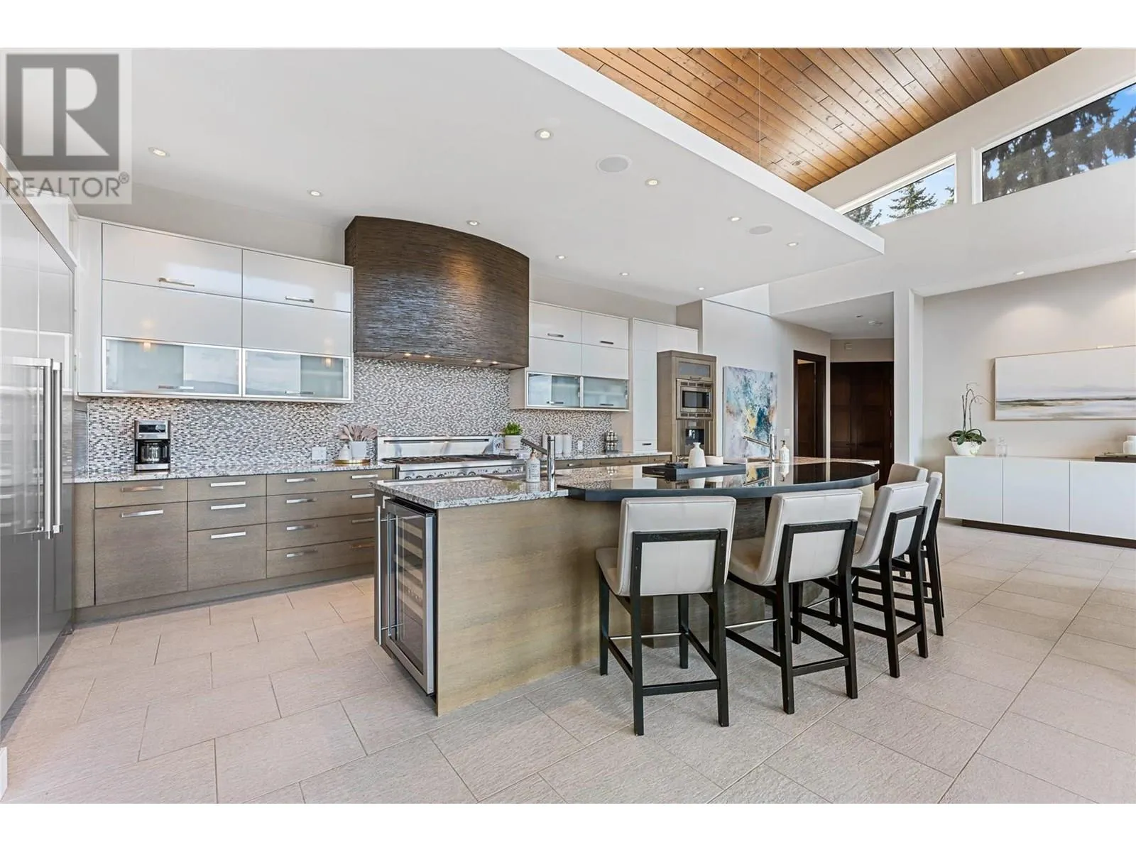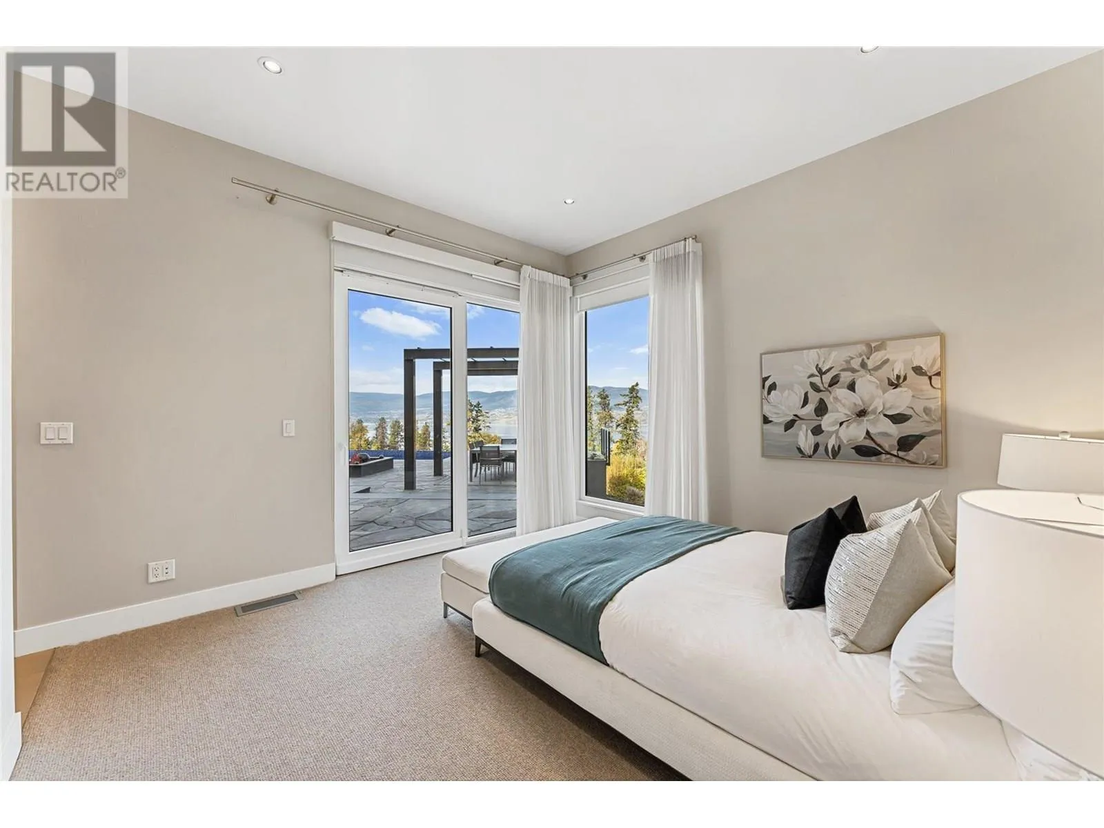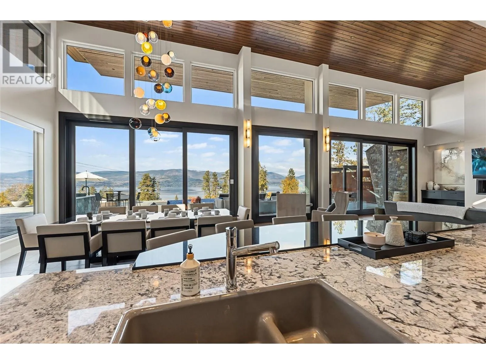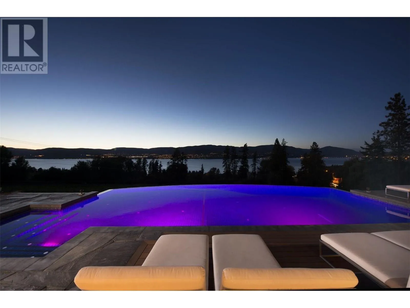 Private estate home set on 2.05 acres and perfectly positioned to capture the stunning lake, city and vineyard views. Enjoy an expansive flagstone patio with a spectacular negative edge saltwater infinity pool that creates a resort-like setting with room to lounge, entertain and take in the breathtaking views. Gated entry leads to heated triple garage & single garage plus RV garage. Upon entering the home youâll notice walls of glass showcase views of the pool, lake and beyond. Soaring ceiling height w/floor to ceiling windows & sliding wall system create a seamless extension to the outdoors with the open concept great room, dining & kitchen. Kitchen features oversized granite island, professional appliances, custom fixtures & cabinetry. Generous sized lake view primary bedroom framed in windows w/ linear gas fireplace & full ensuite with frameless glass shower, his/her sinks and soaker tub. Contemporary style home is over 5500 square feet with 4 bedrooms & 6 baths. Lower level boasts wine room, media room and games room. New pool, patio, pergola & outdoor living space completed in the summer 2015. The home blends exterior with interior living superbly. Located a short stroll to adjacent Summerhill Winery and minutes to the lake, hiking, dining, boutiques and schools. (id:27476)