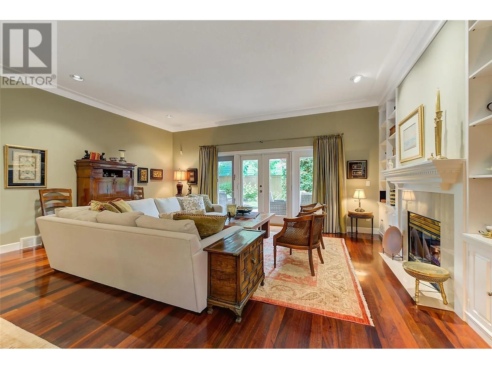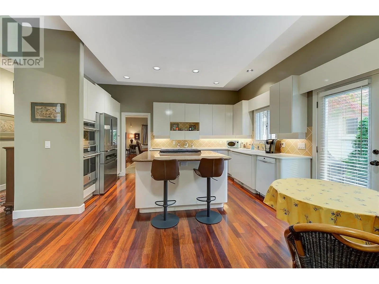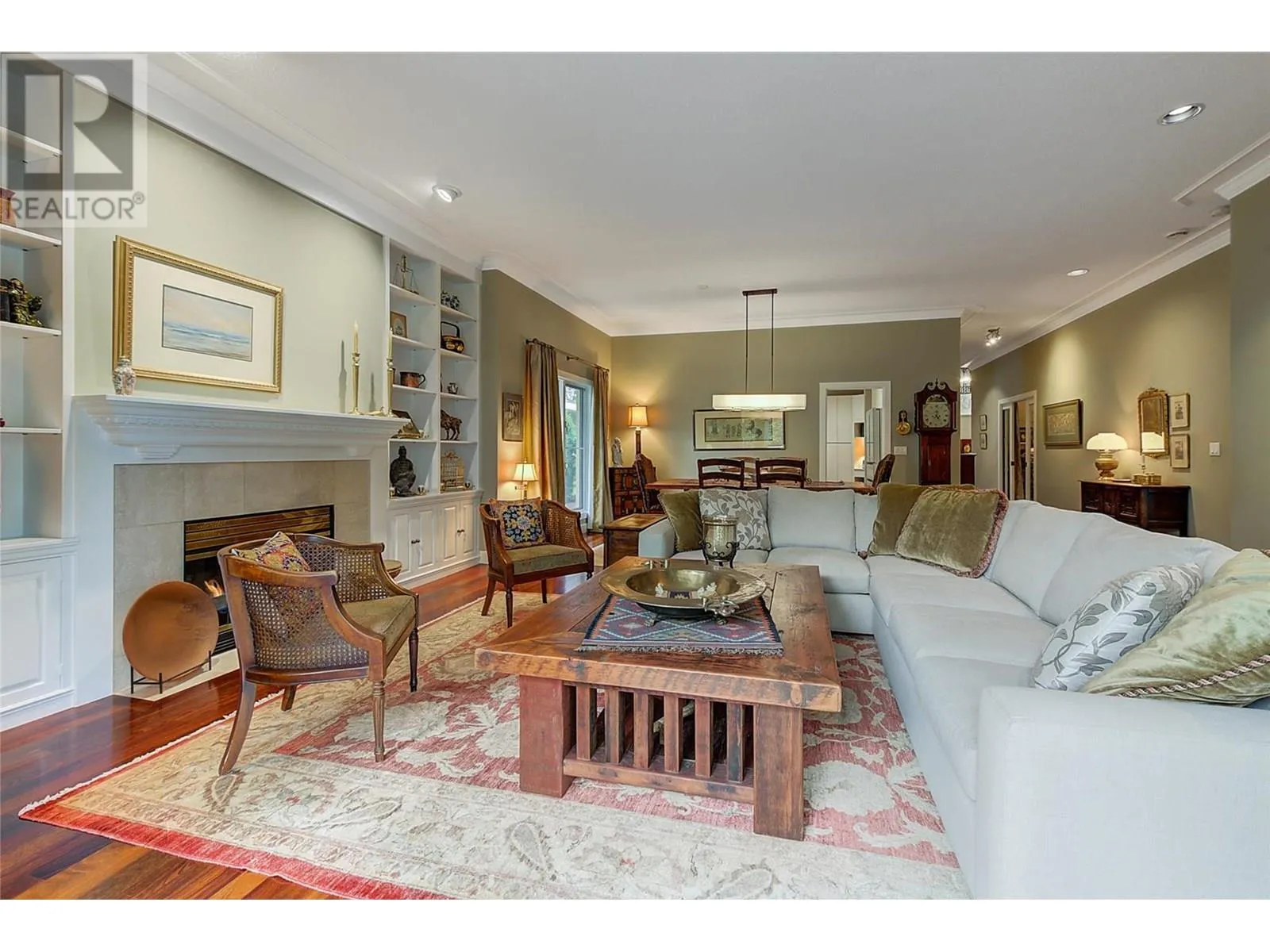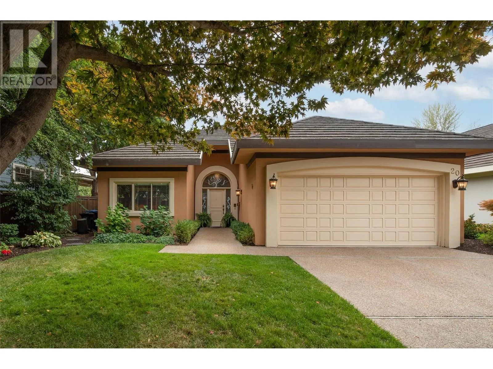 Luxurious One-Level Home in Gated Waterfront Community. Discover the perfect blend of comfort and convenience in this stunning one-level home located in an exclusive gated community. This residence offers easy access to the lake with your own private boat slip and lift. Enjoy tranquil living with waterfront pool beautifully landscaped surroundings. Residents of Le Chateau can also enjoy resort-style amenities on site including an outdoor pool, hot tub & private dock. Upon entry you're greeted by high ceilings, and rich cherry hardwood floors leading to the kitchen and the main living area. The chefâs kitchen features brand-new stainless-steel appliances. Centre island offers a gas range. Off the kitchen is an open, main living area with custom built-ins surrounding the gas fireplace. The primary suite is a gorgeous sanctuary with private access to the backyard and a recently renovated primary ensuite. The ensuite is finished with wood cabinetry, & granite counters for a luxurious feel. Enjoy unwinding in the soaker tub or expansive glass steam shower with a bench and speakers. One additional bedroom and den. In the backyard youâre surrounded by mature landscaping and a trellis bordering the patio. A water feature & outdoor lighting have been added. The two-car garage has been finished with epoxy flooring, and custom cabinetry. Incredible location within walking distance to beaches, cafes, restaurants and boutiques, and only a 5 minute drive to downtown Kelowna. (id:27476)