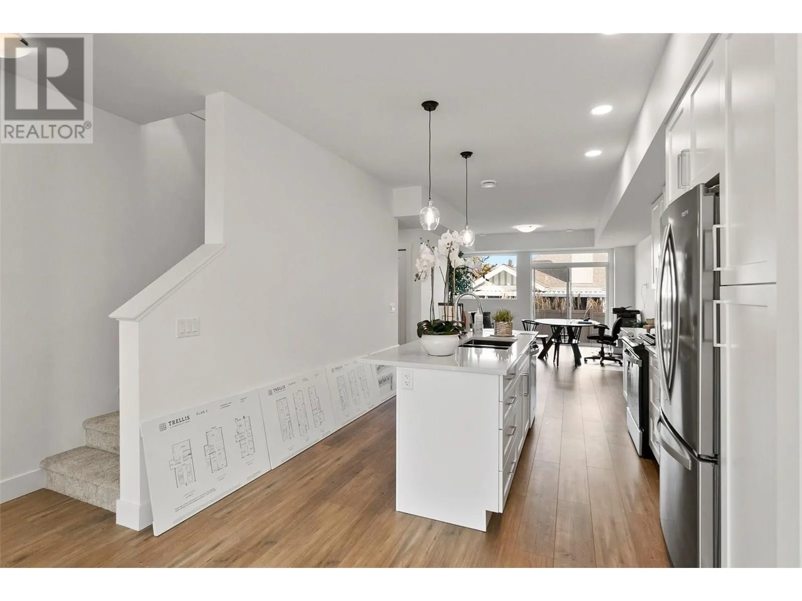 Welcome to Trellis, a modern townhome community perfectly positioned in the heart of Glenmore. The bright, open-concept main floor is designed with everyday family living in mind, featuring stylish touches like a Whirlpool appliance package, quartz countertops, a sleek ceramic tile backsplash, expansive windows, and soaring 9-foot ceilings. A sound-insulated party wall adds extra privacy, while a convenient powder room completes this level. Upstairs, the primary suite offers a walk-in closet and a beautifully finished ensuite, joined by two additional bedrooms, a full bathroom, and a dedicated laundry area. But the real showstopper is on the top floor, your very own private rooftop patio, perfect for hosting BBQs, entertaining friends, or simply soaking in the breathtaking valley views. Located just minutes from downtown Kelowna with parks, highly rated schools, and every amenity at your doorstep, Trellis is the perfect place to call home. Book your showing today! (id:27476)