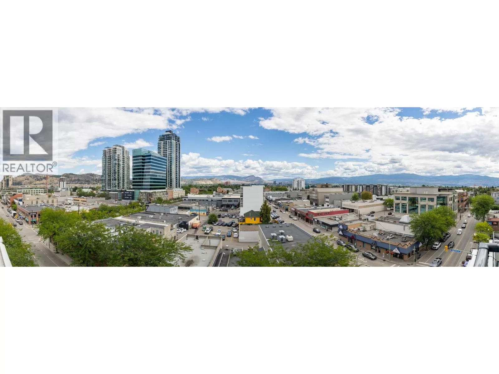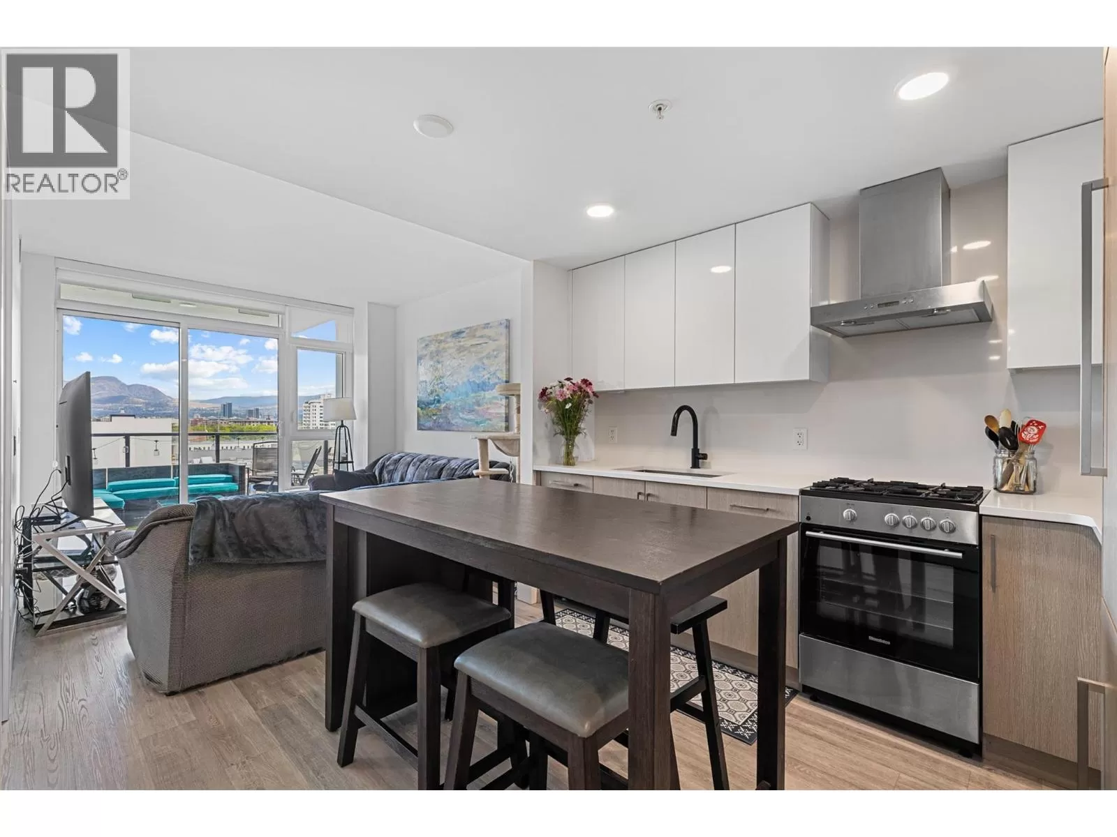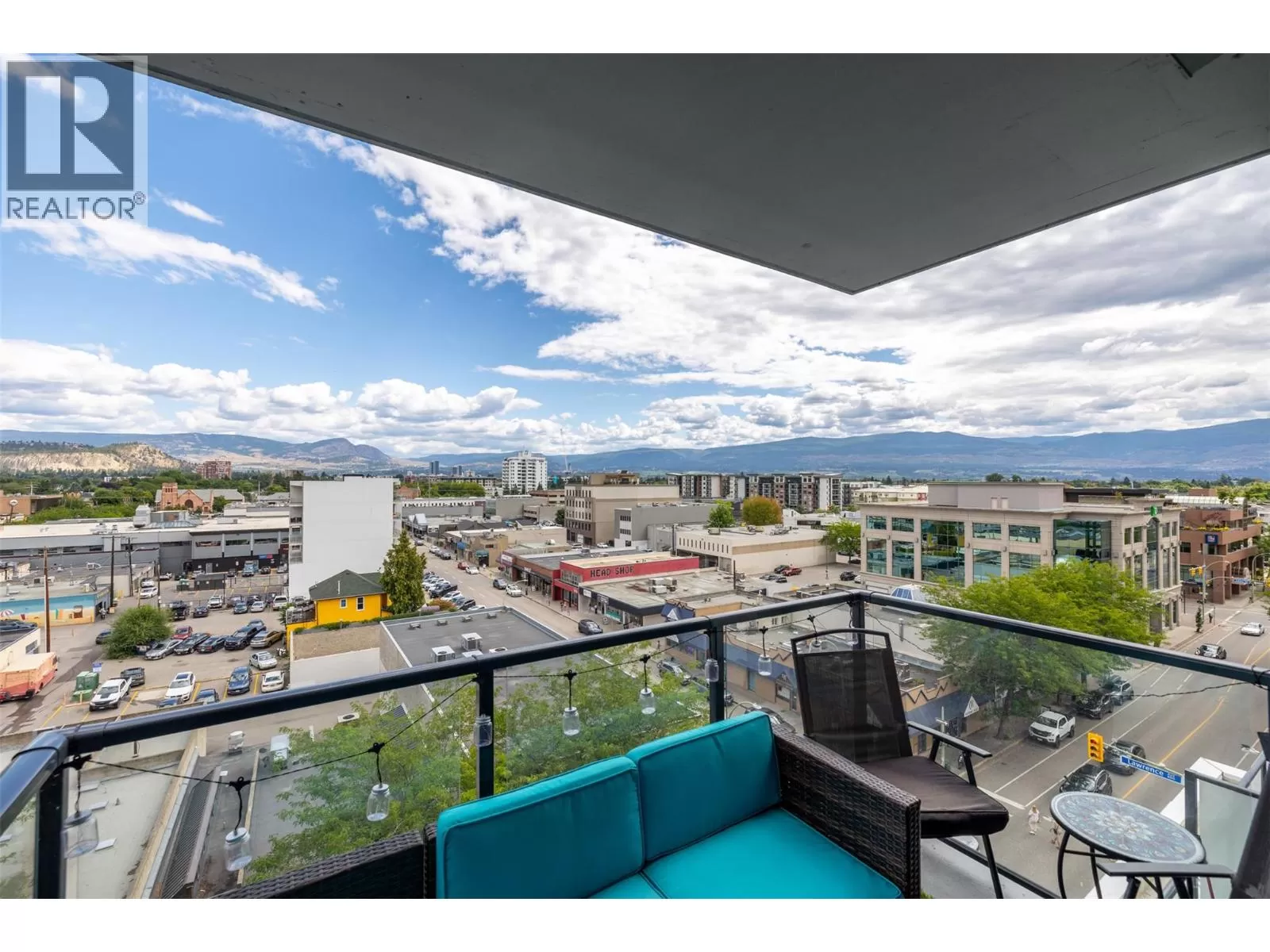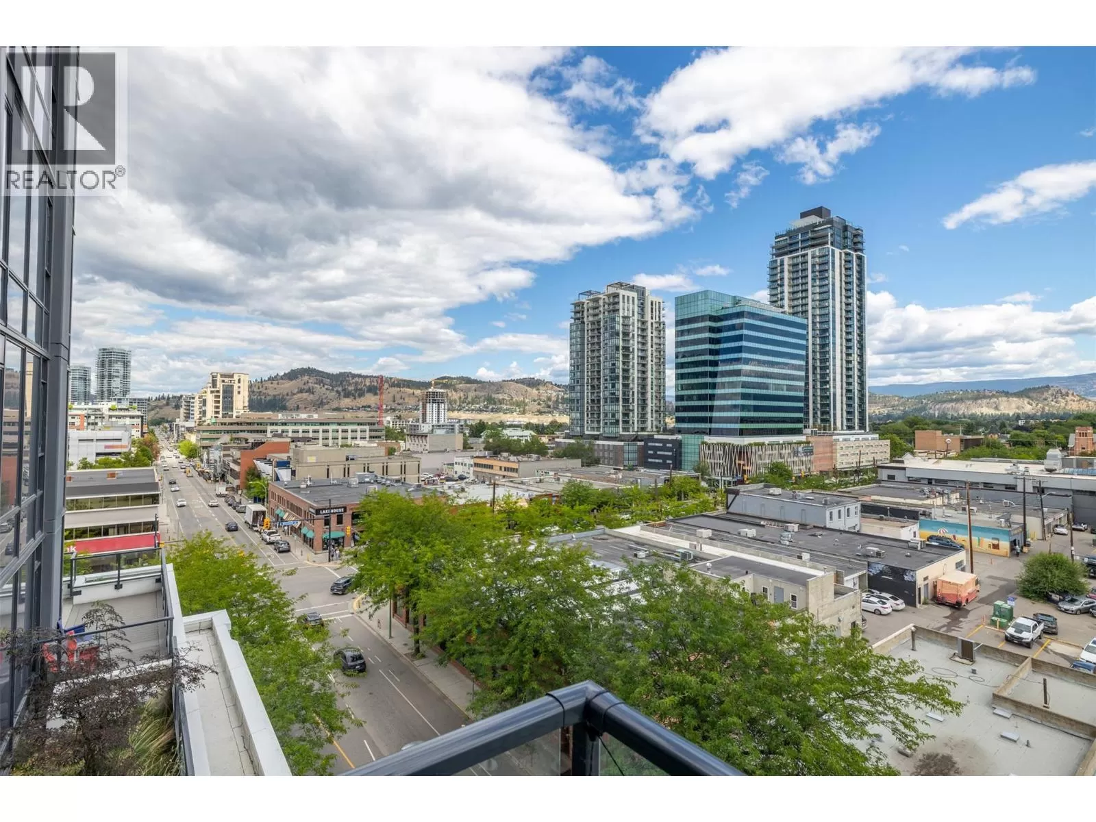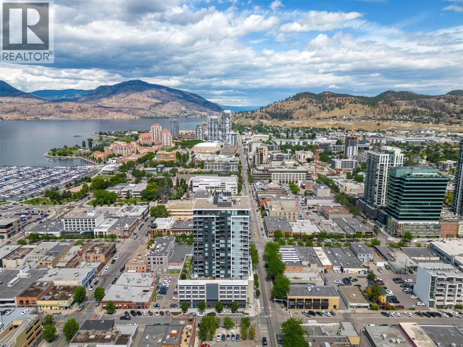 Extraordinary value at ELLA, Kelownaâs most central downtown luxury condo building. This bright East facing one bedroom and den home offers lovely city and mountain views from the 7th floor. Finishings by Award-winning interior design i3 Design Group include quartz countertops throughout the home, soft vinyl plank flooring, surround ceramic tile in the bathroom and under cabinet lighting in the kitchen. Cook gourmet meals on your gas range with quartz backsplash and enjoy the sleek and designer aesthetic of the integrated paneled refrigerator. Located on the corner of Ellis street & Lawrence Ave, this home comes with 1 parking stall in the secure parkade plus 1 secure storage locker. Electric vehicle charging stations are available for ELLA residentsâ exclusive use. The building boasts a bike & pet washing station, resident bike storage & guest suite for residentâs visitors. This home offers an in-suite washer & dryer along with ample storage and closet space to make this a functional and comfortable condo. This is the perfect home for affordable downtown living or the savvy investor looking for great value. (id:27476)