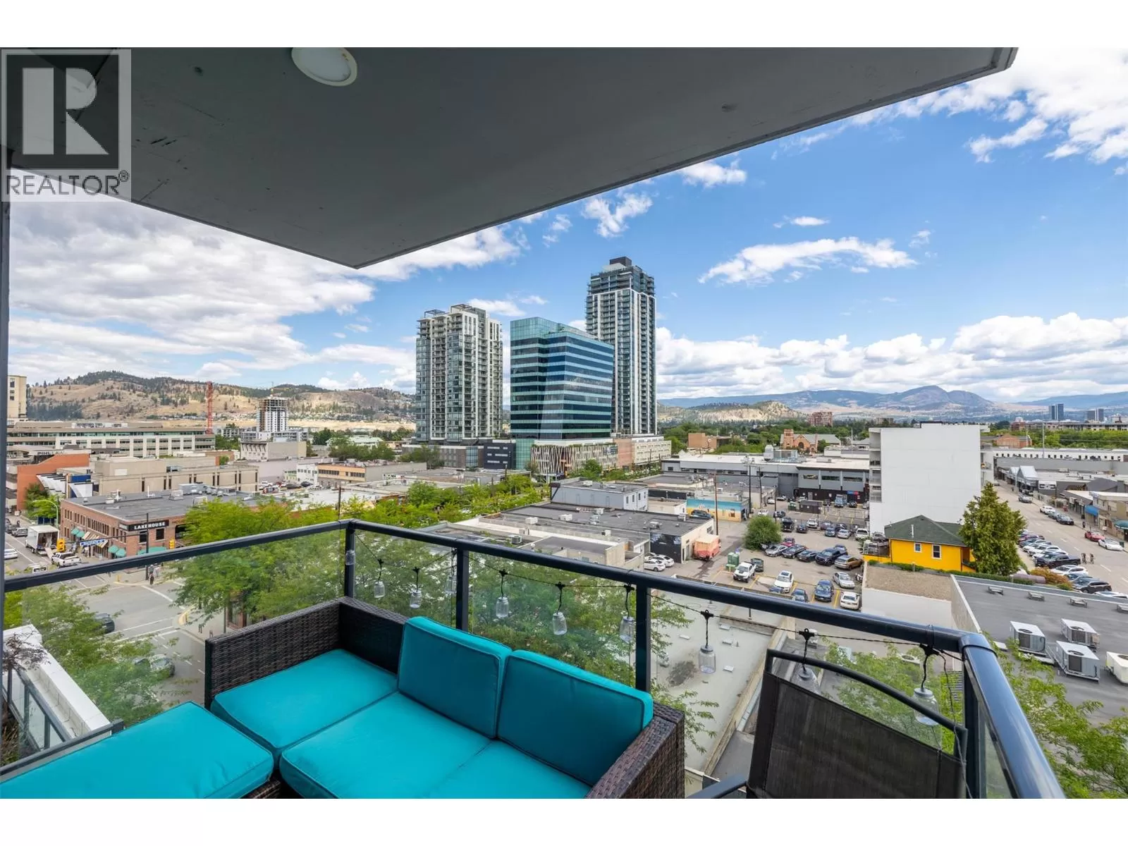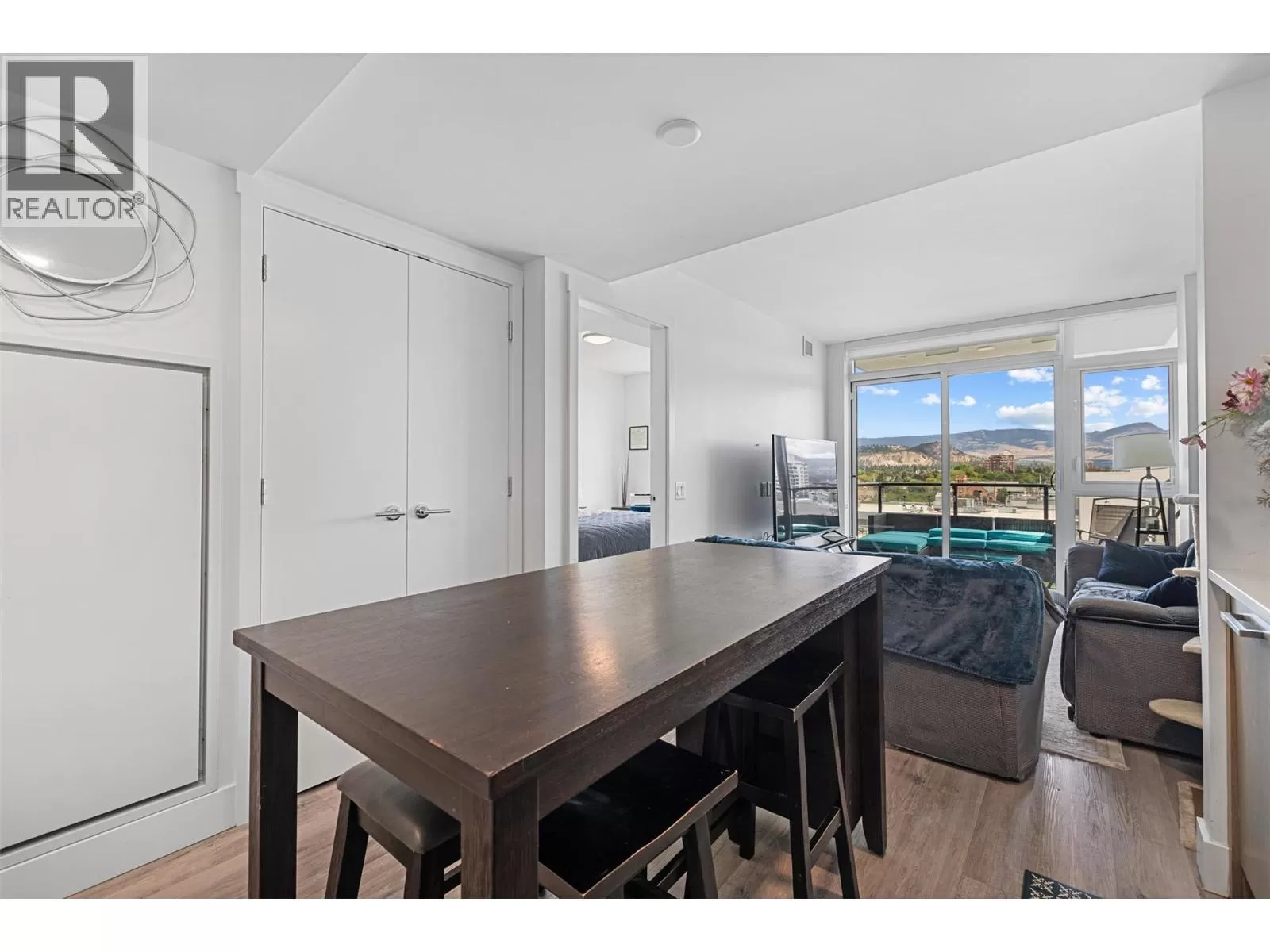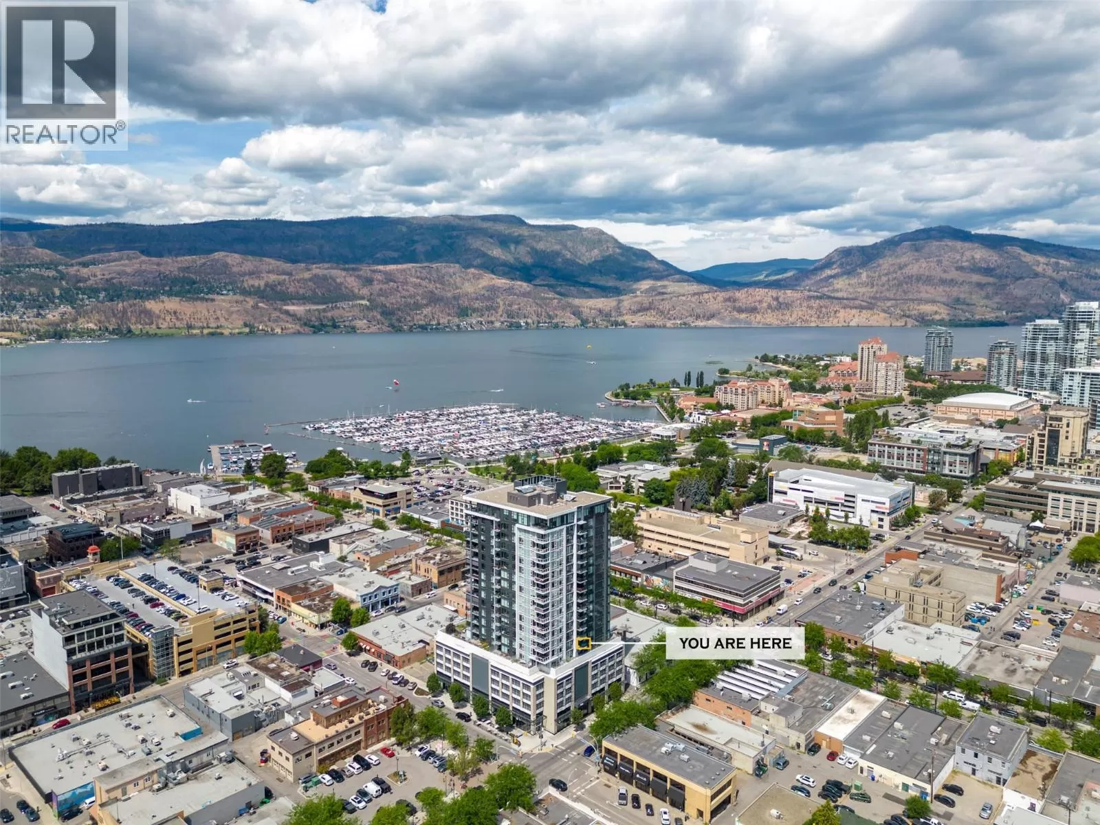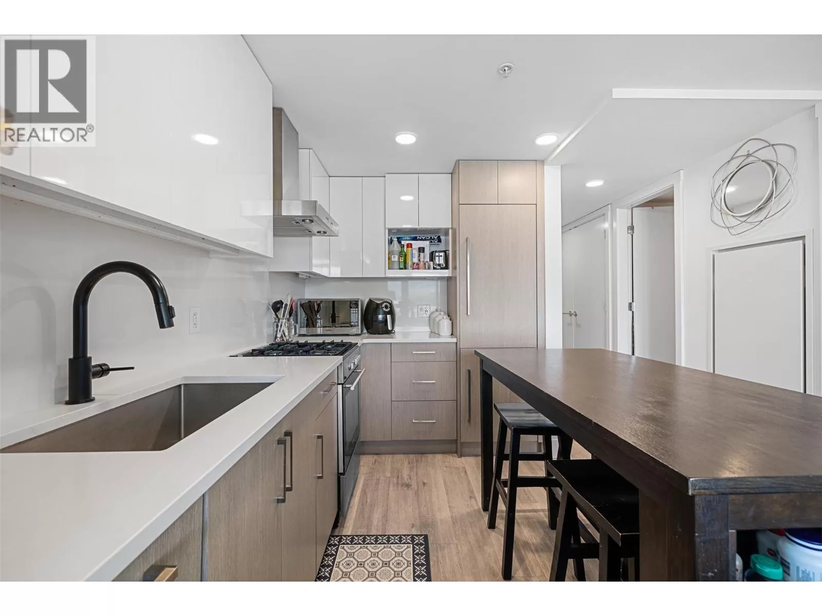 Extraordinary value at ELLA, Kelownaâs most central downtown luxury condo building. This bright East facing one bedroom and den home offers lovely city and mountain views from the 7th floor. Finishings by Award-winning interior design i3 Design Group include quartz countertops throughout the home, soft vinyl plank flooring, surround ceramic tile in the bathroom and under cabinet lighting in the kitchen. Cook gourmet meals on your gas range with quartz backsplash and enjoy the sleek and designer aesthetic of the integrated paneled refrigerator. Located on the corner of Ellis street & Lawrence Ave, this home comes with 1 parking stall in the secure parkade plus 1 secure storage locker. Electric vehicle charging stations are available for ELLA residentsâ exclusive use. The building boasts a bike & pet washing station, resident bike storage & guest suite for residentâs visitors. This home offers an in-suite washer & dryer along with ample storage and closet space to make this a functional and comfortable condo. This is the perfect home for affordable downtown living or the savvy investor looking for great value. (id:27476)