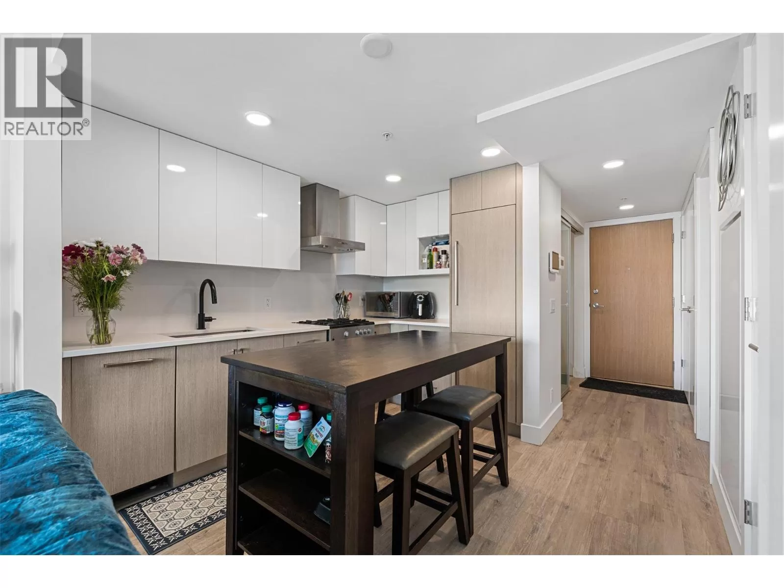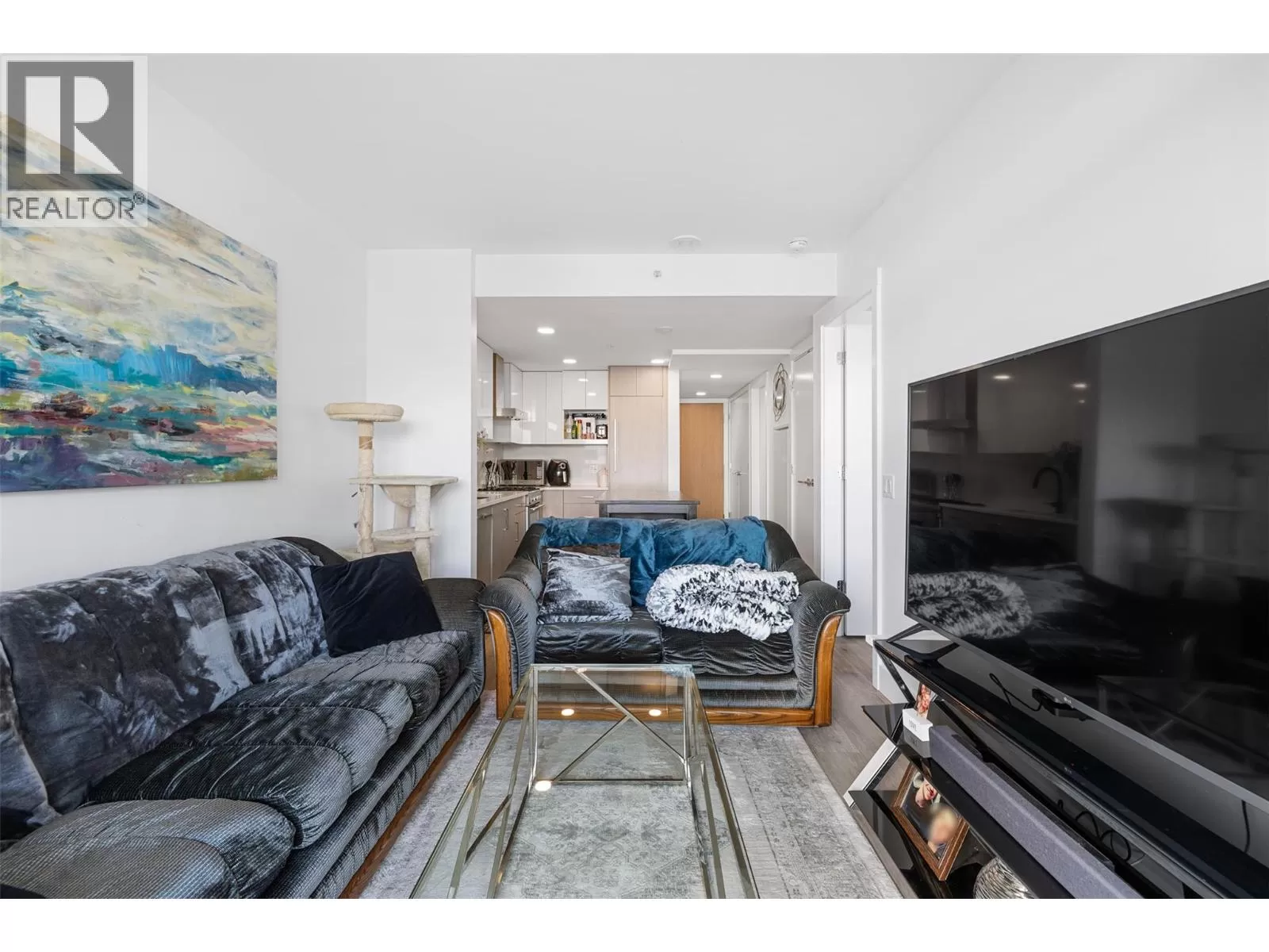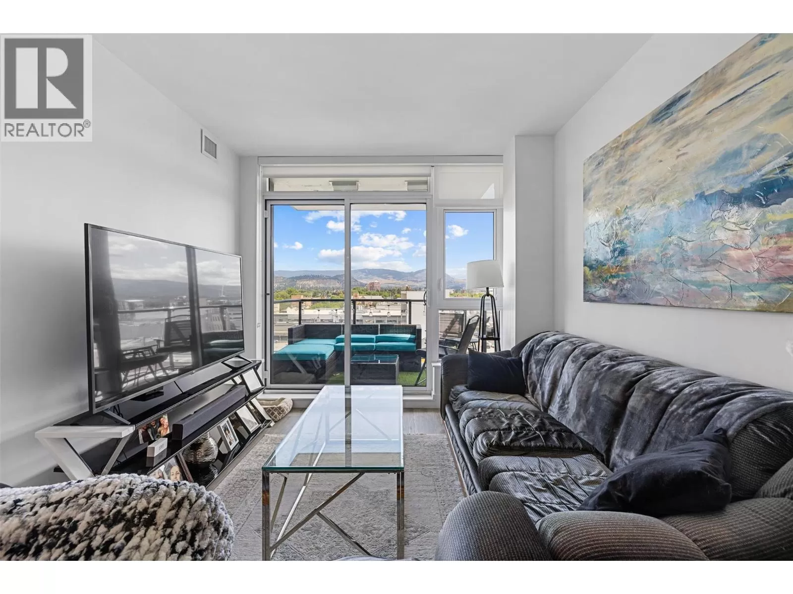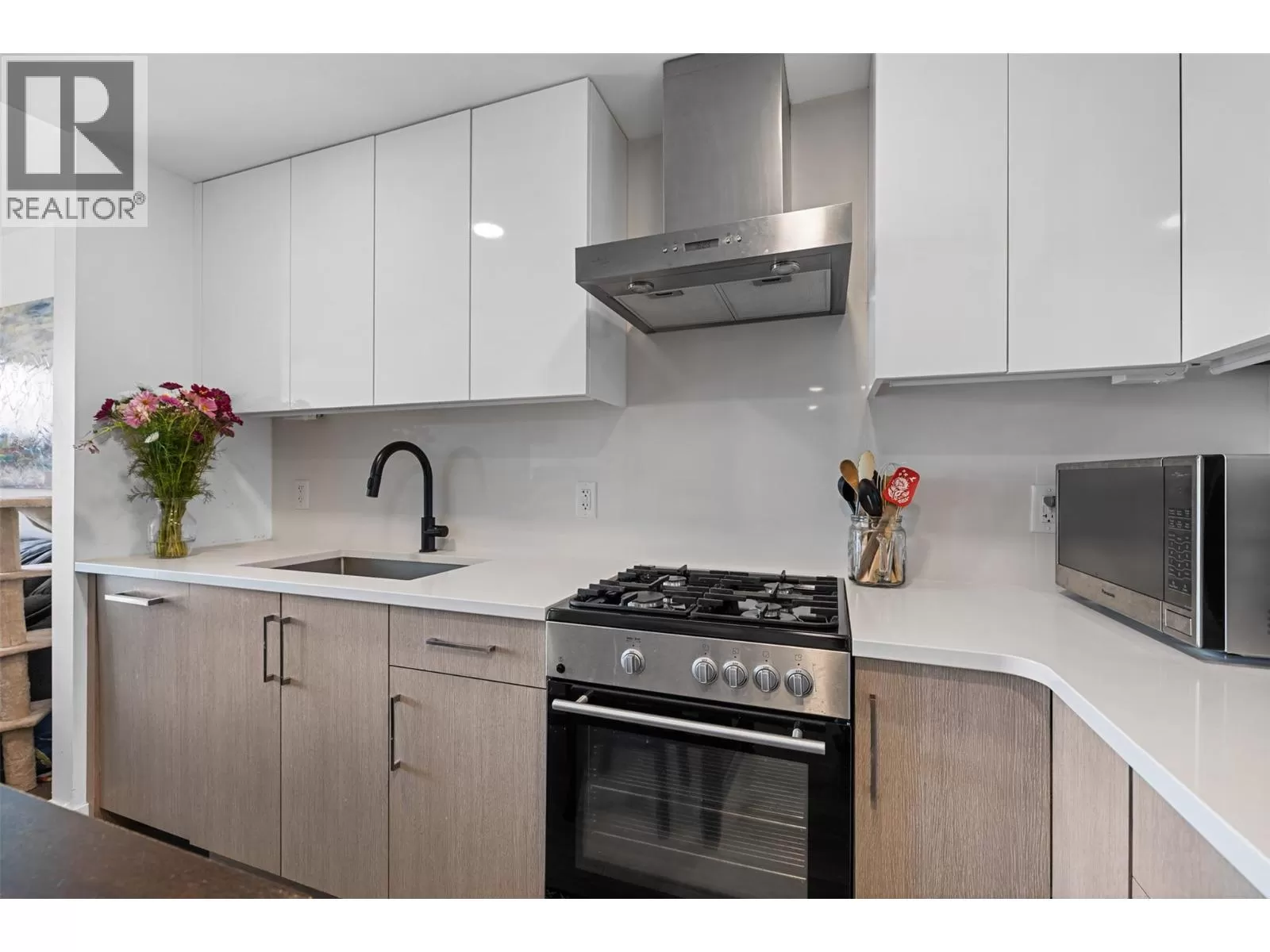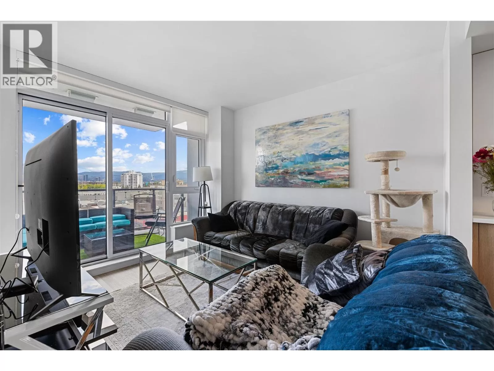 Extraordinary value at ELLA, Kelownaâs most central downtown luxury condo building. This bright East facing one bedroom and den home offers lovely city and mountain views from the 7th floor. Finishings by Award-winning interior design i3 Design Group include quartz countertops throughout the home, soft vinyl plank flooring, surround ceramic tile in the bathroom and under cabinet lighting in the kitchen. Cook gourmet meals on your gas range with quartz backsplash and enjoy the sleek and designer aesthetic of the integrated paneled refrigerator. Located on the corner of Ellis street & Lawrence Ave, this home comes with 1 parking stall in the secure parkade plus 1 secure storage locker. Electric vehicle charging stations are available for ELLA residentsâ exclusive use. The building boasts a bike & pet washing station, resident bike storage & guest suite for residentâs visitors. This home offers an in-suite washer & dryer along with ample storage and closet space to make this a functional and comfortable condo. This is the perfect home for affordable downtown living or the savvy investor looking for great value. (id:27476)