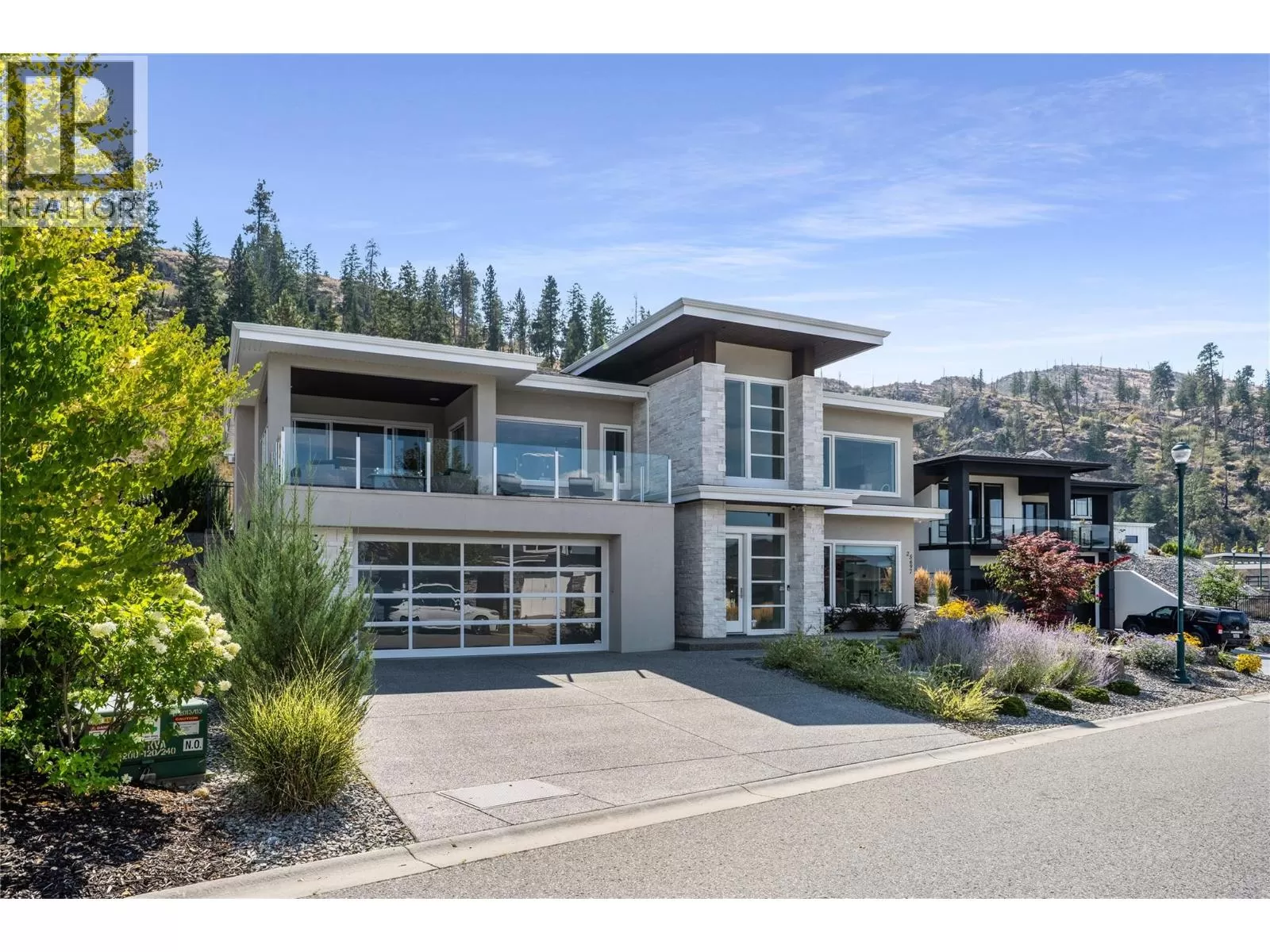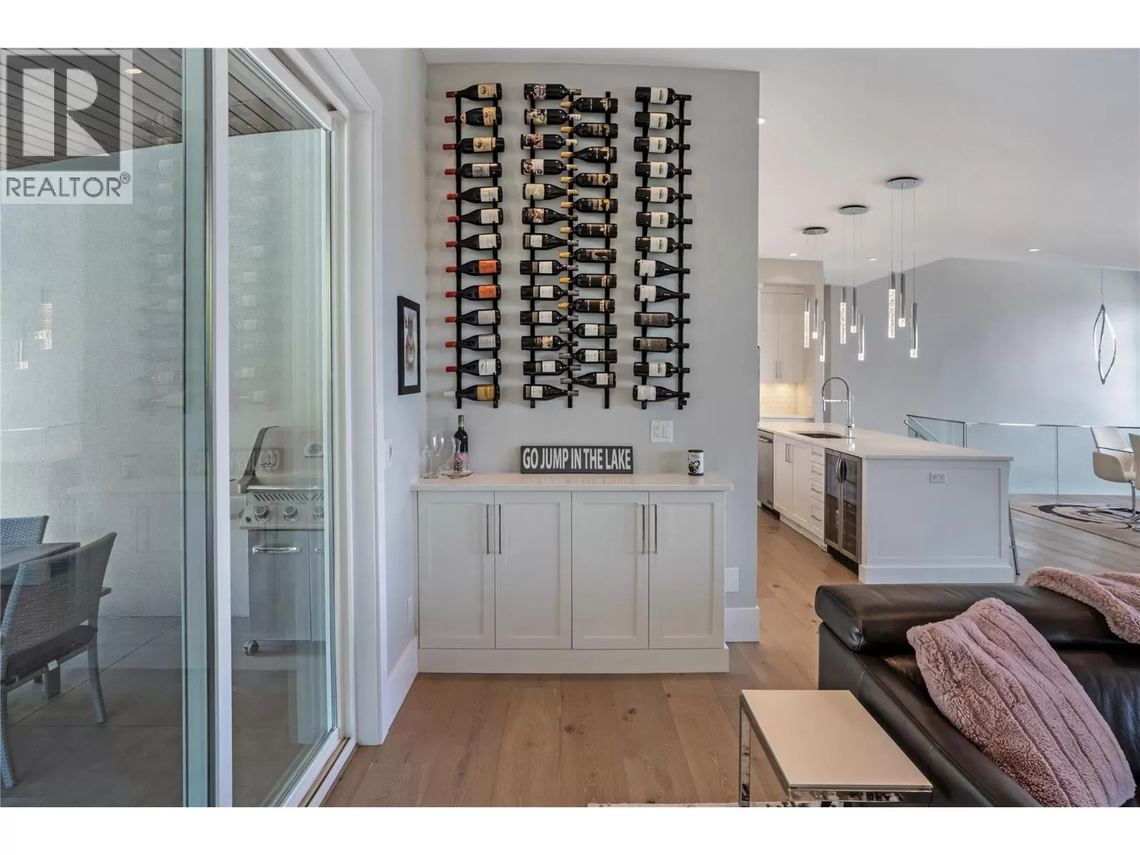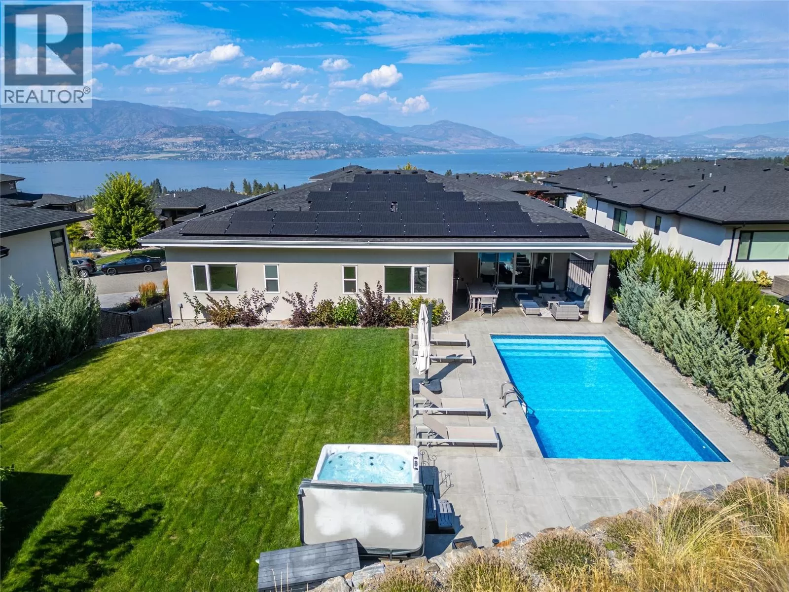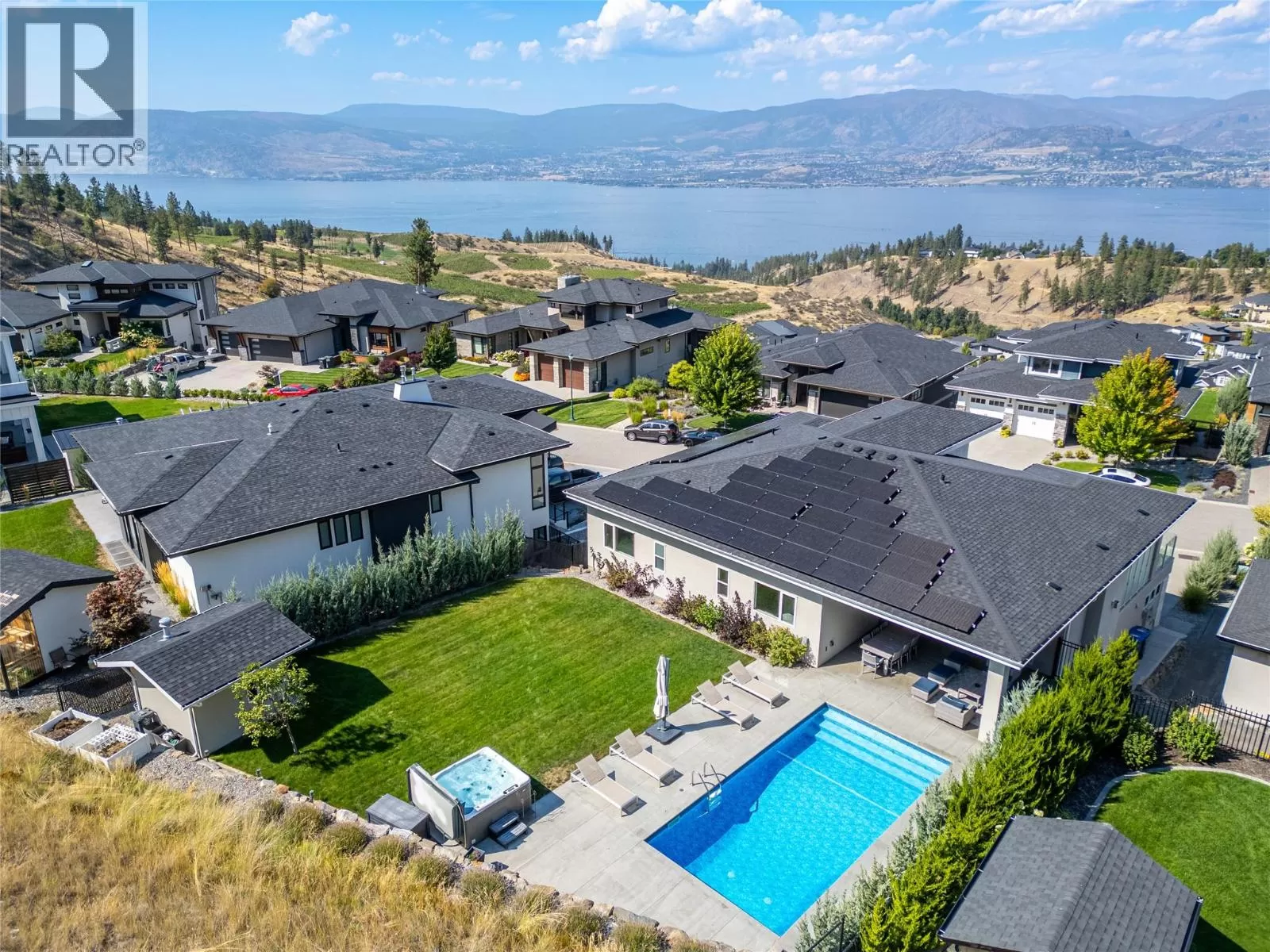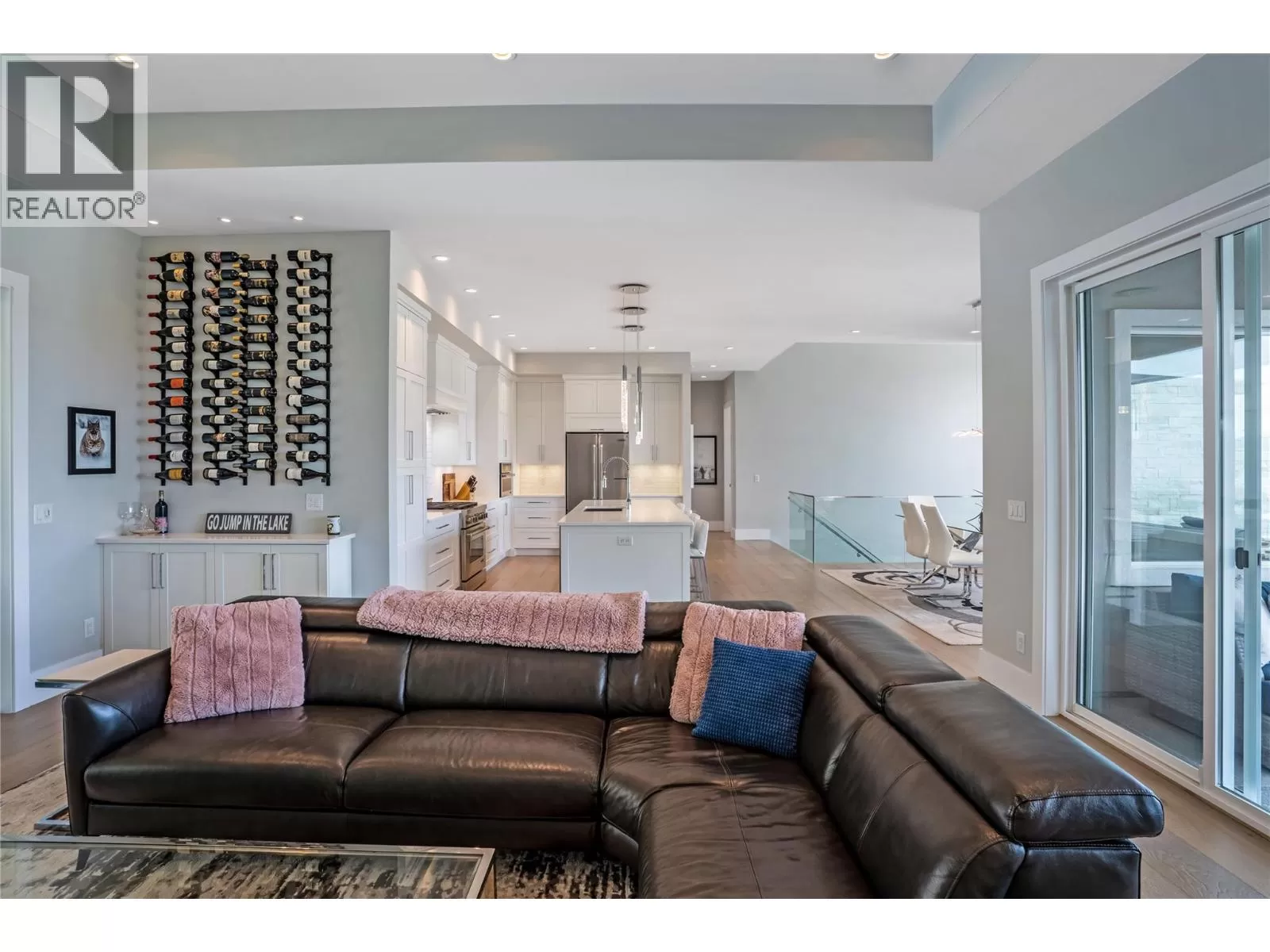 Discover custom-built luxury in this stunning 5-bedroom, 5-bath home featuring a bright, legal 1-bedroom ground-level suite. This high-efficiency smart home boasts soaring vaulted ceilings, a dramatic floating staircase, and rich wide plank wood floors. The open-concept main floor centers around a chefâs kitchen with quartz countertops, custom cabinetry, and a hidden walk-in butlerâs pantry. Flow effortlessly into the spacious dining and living areas warmed by a gas fireplace, then step out onto the front deck to enjoy Okanagan Lake and mountain views. The private backyard is an entertainerâs dream with a heated saltwater pool, hot tub, and ample space to relax or host gatherings. The main-level master suite offers a spa-like retreat with a soaker tub, glass-enclosed shower, and double floating vanity with undermount lighting. Two additional bedrooms share a stylish Jack & Jill bath, with one bedroom featuring a queen Murphy bedâideal for guests or a home office. A large laundry room with abundant counters and cabinetry enhances daily functionality. The lower level features a generous rec room with an electric fireplace, wet bar, guest bedroom, and full bath. The oversized three-car garage easily fits a boat, a car, and plenty of toys. Exceptional millwork, designer fixtures, and quality finishes elevate every room. Enjoy close proximity to top schools, parks, dining, and Okanaganâs renowned wineries. Luxury, comfort, and thoughtful design converge in this remarkable home. (id:27476)